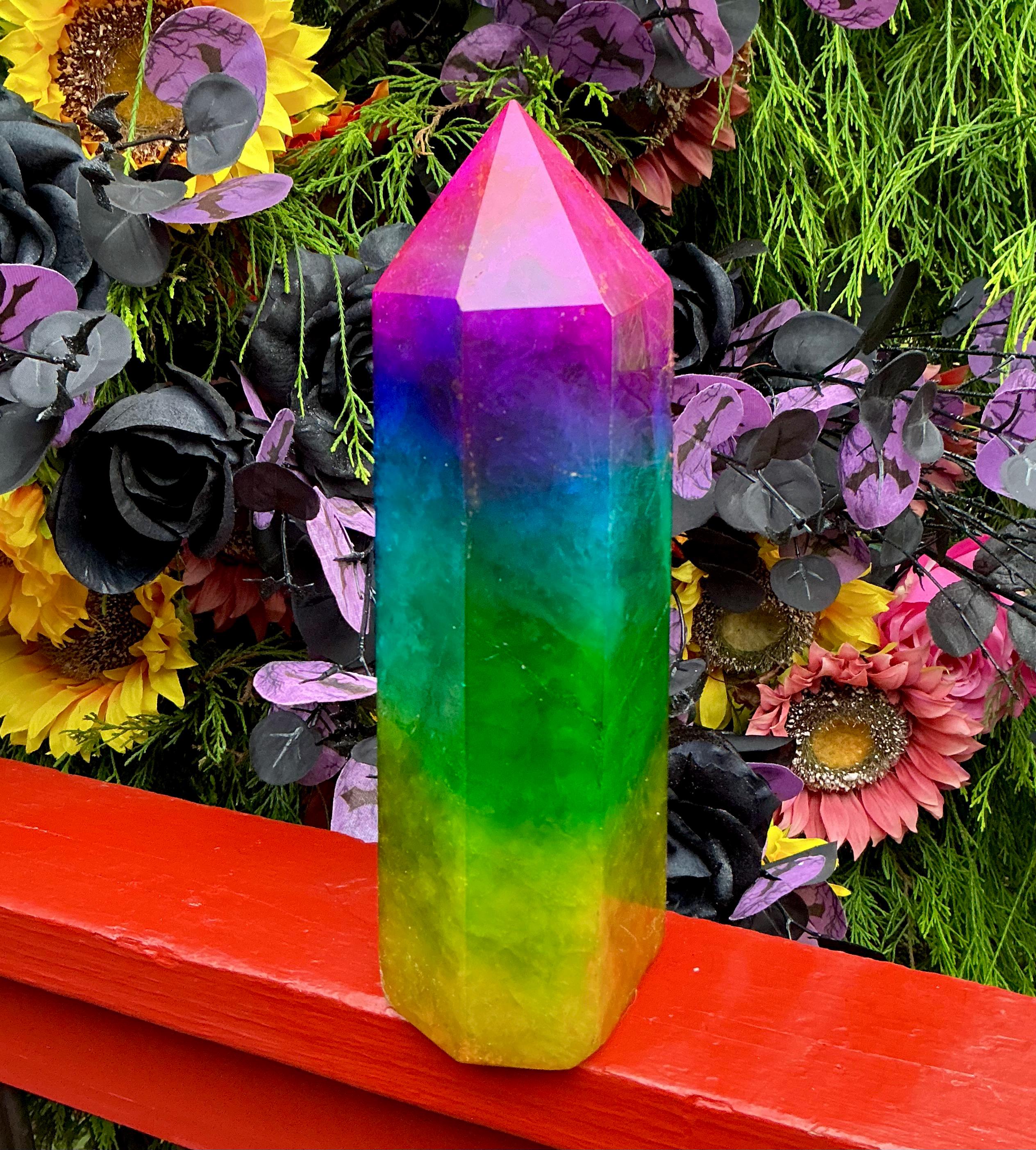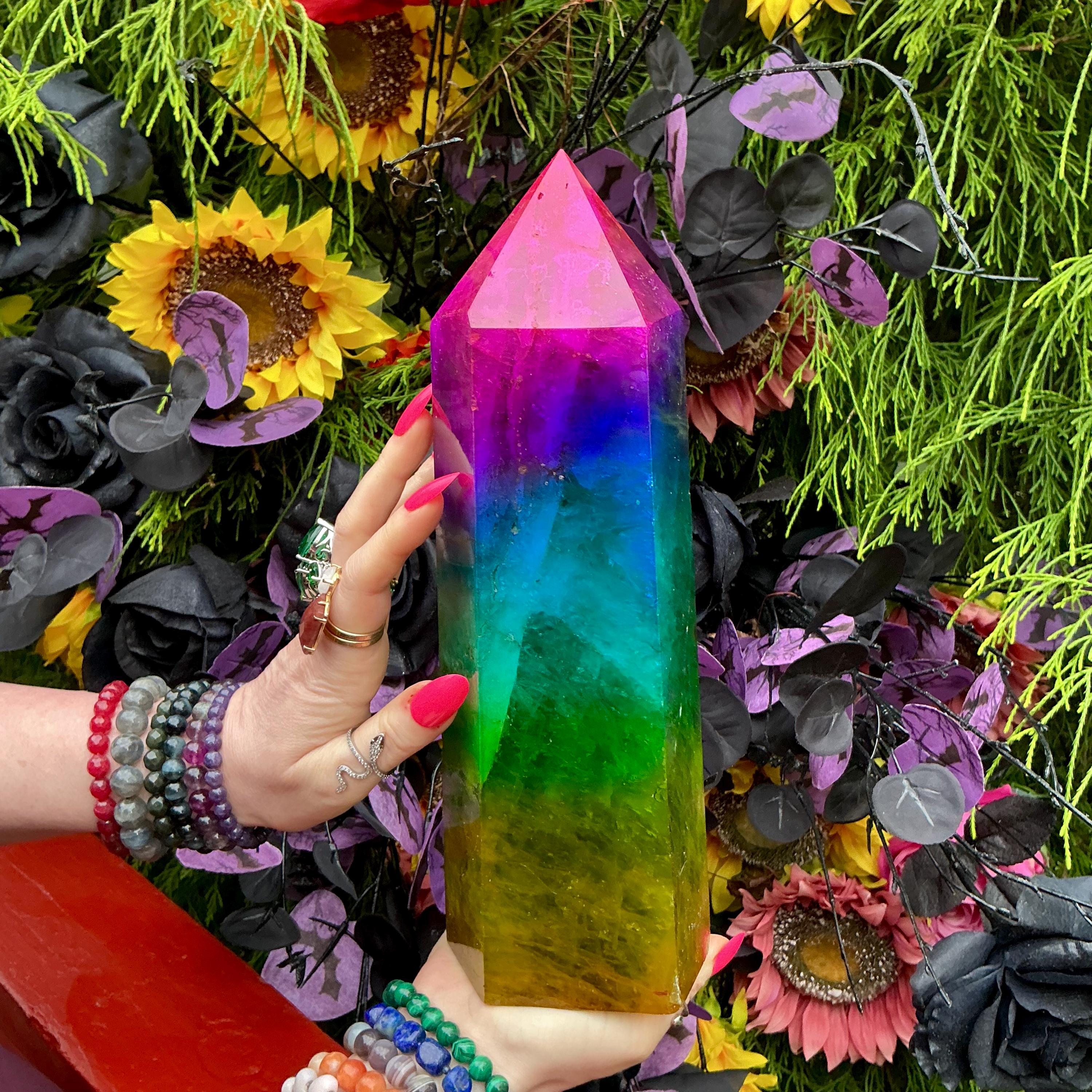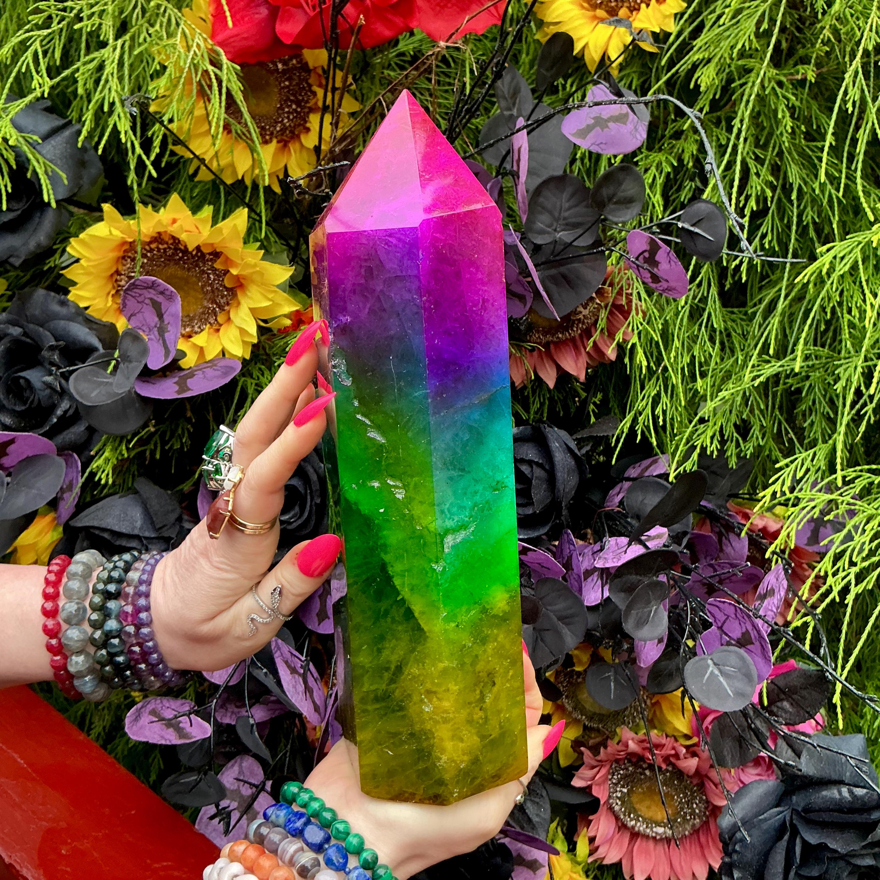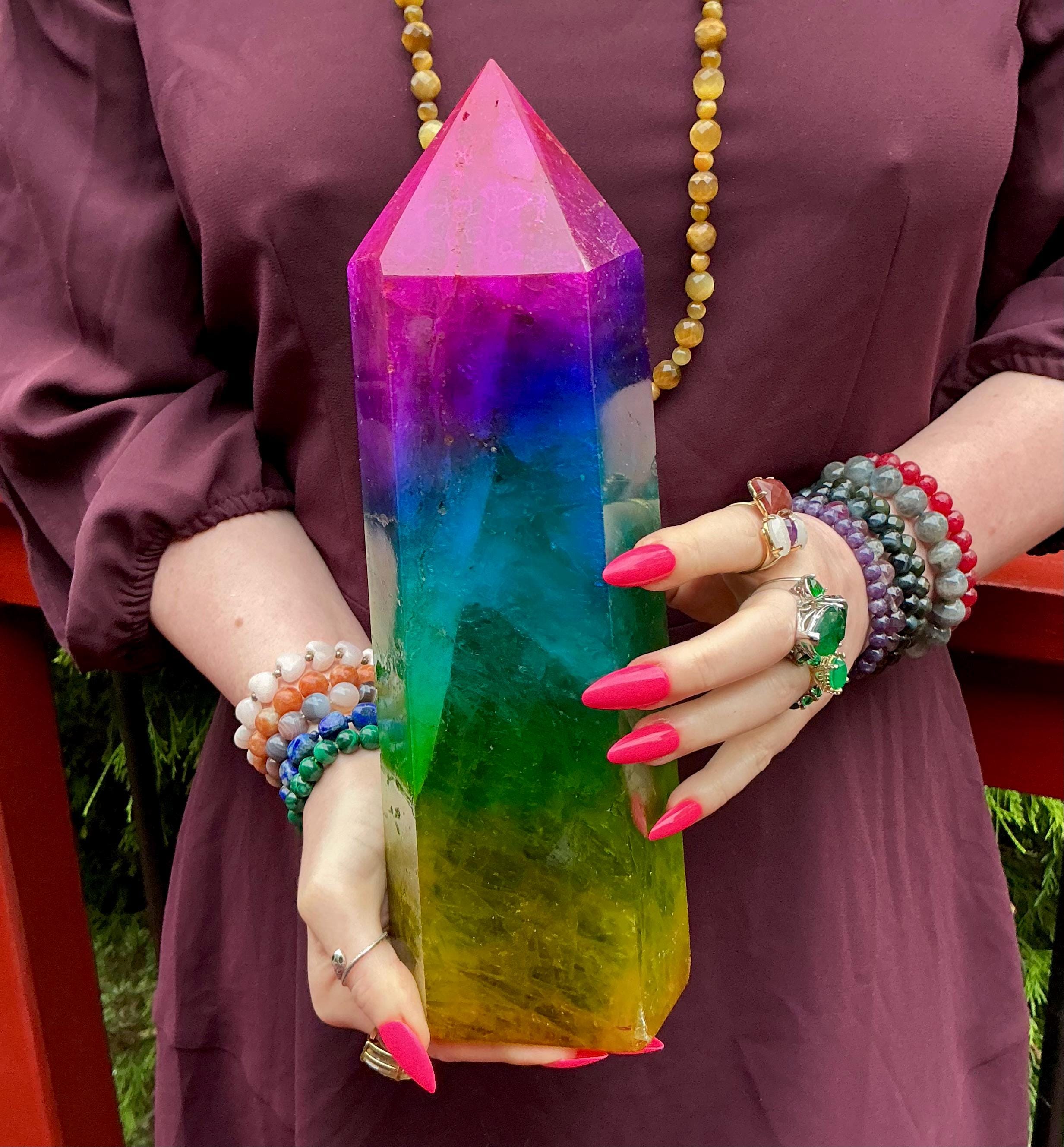 Rainbow Aura Fluorite Crystal Generator ~ 9 lb. 11 oz.~ 10" Tall Tower ~ Colorful Pink Blue Green Yellow Color ~ Fast & Free Shipping U.S.A.