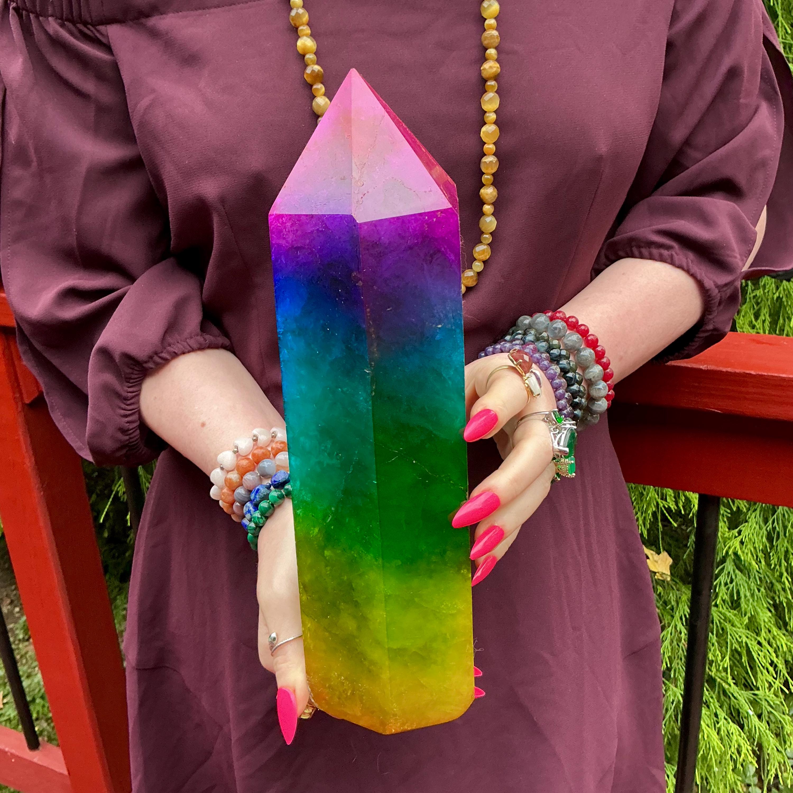 This massive, Vivid Hot Pink, Blue, Green, Yellow Rainbow Aura Crystal Fluorite has major wow factor!
