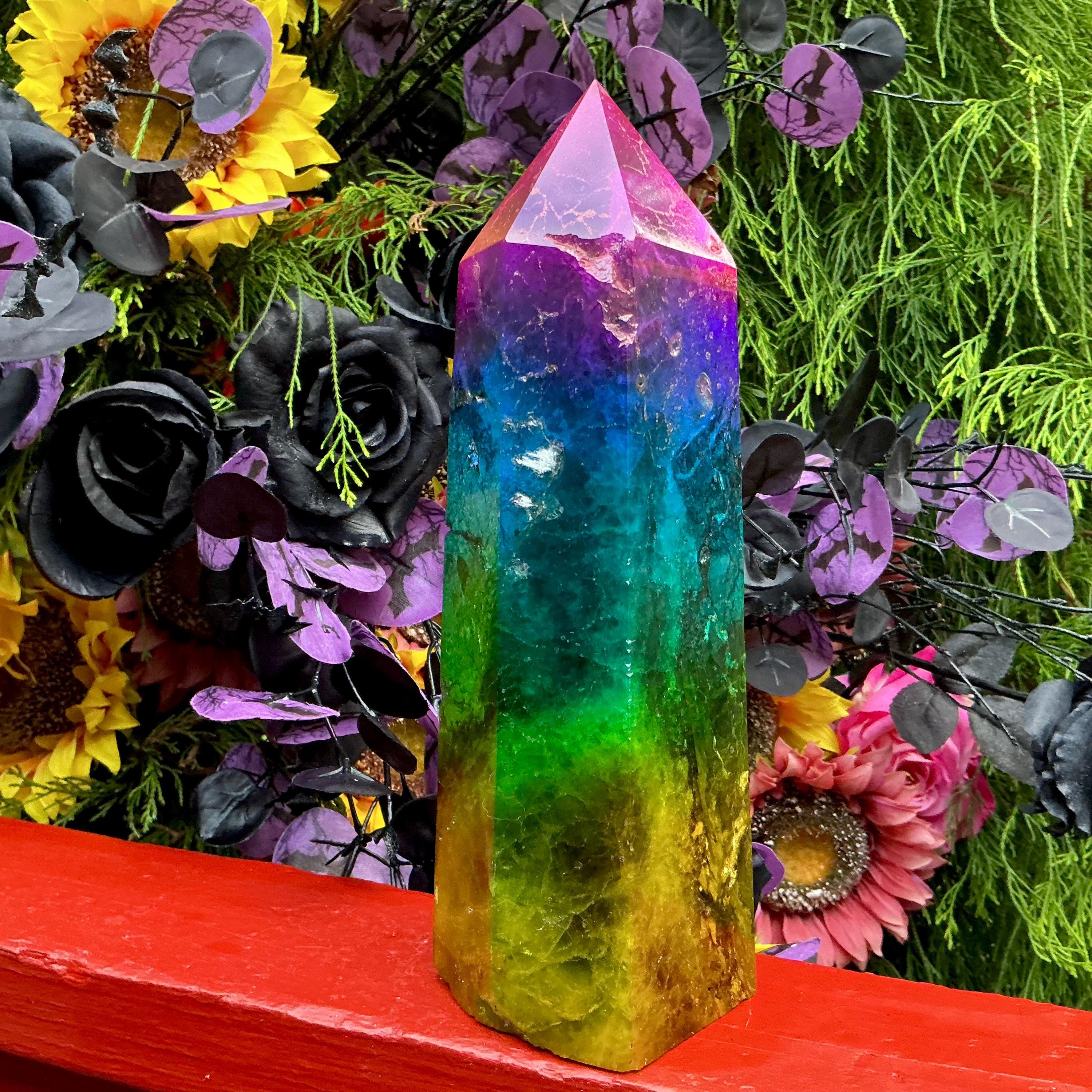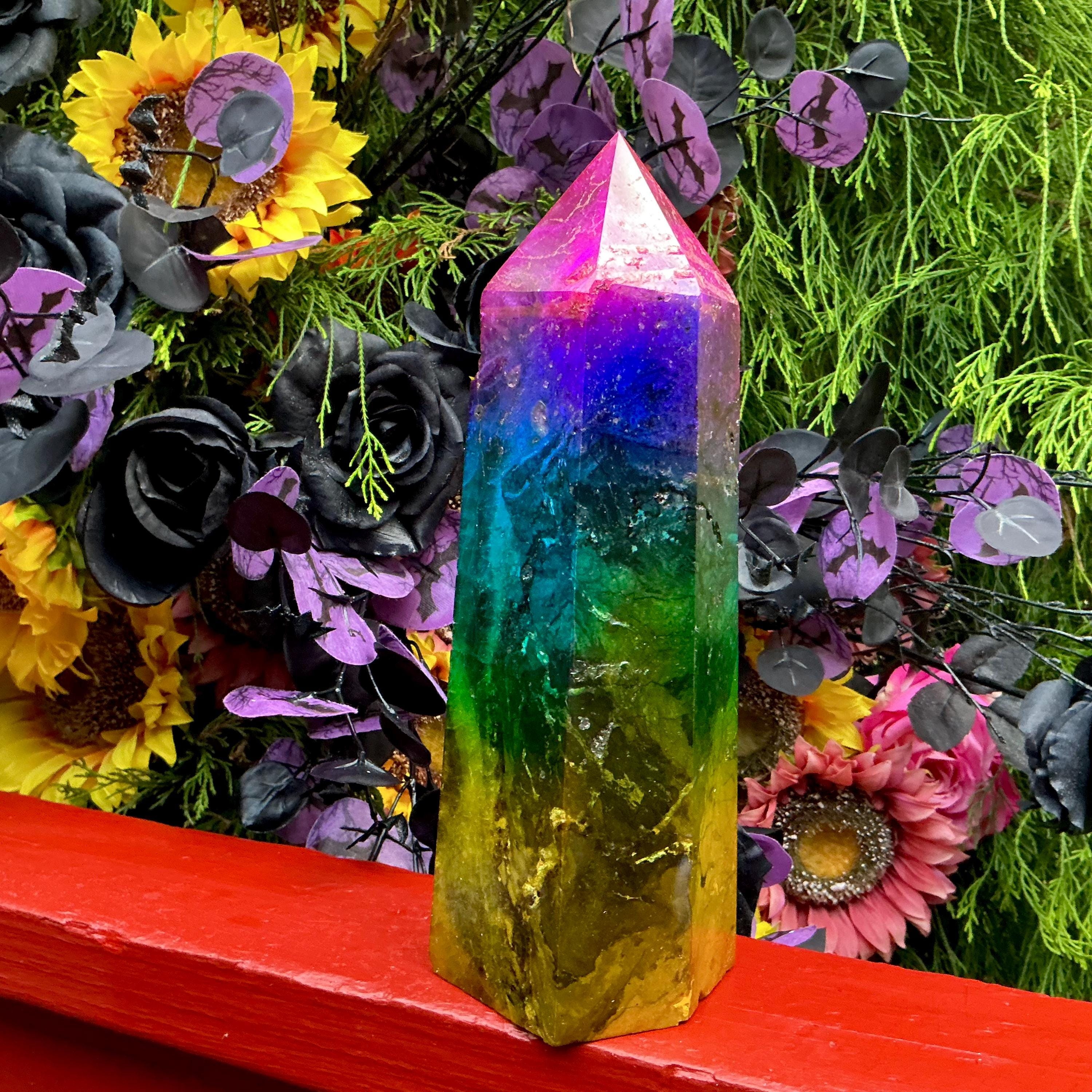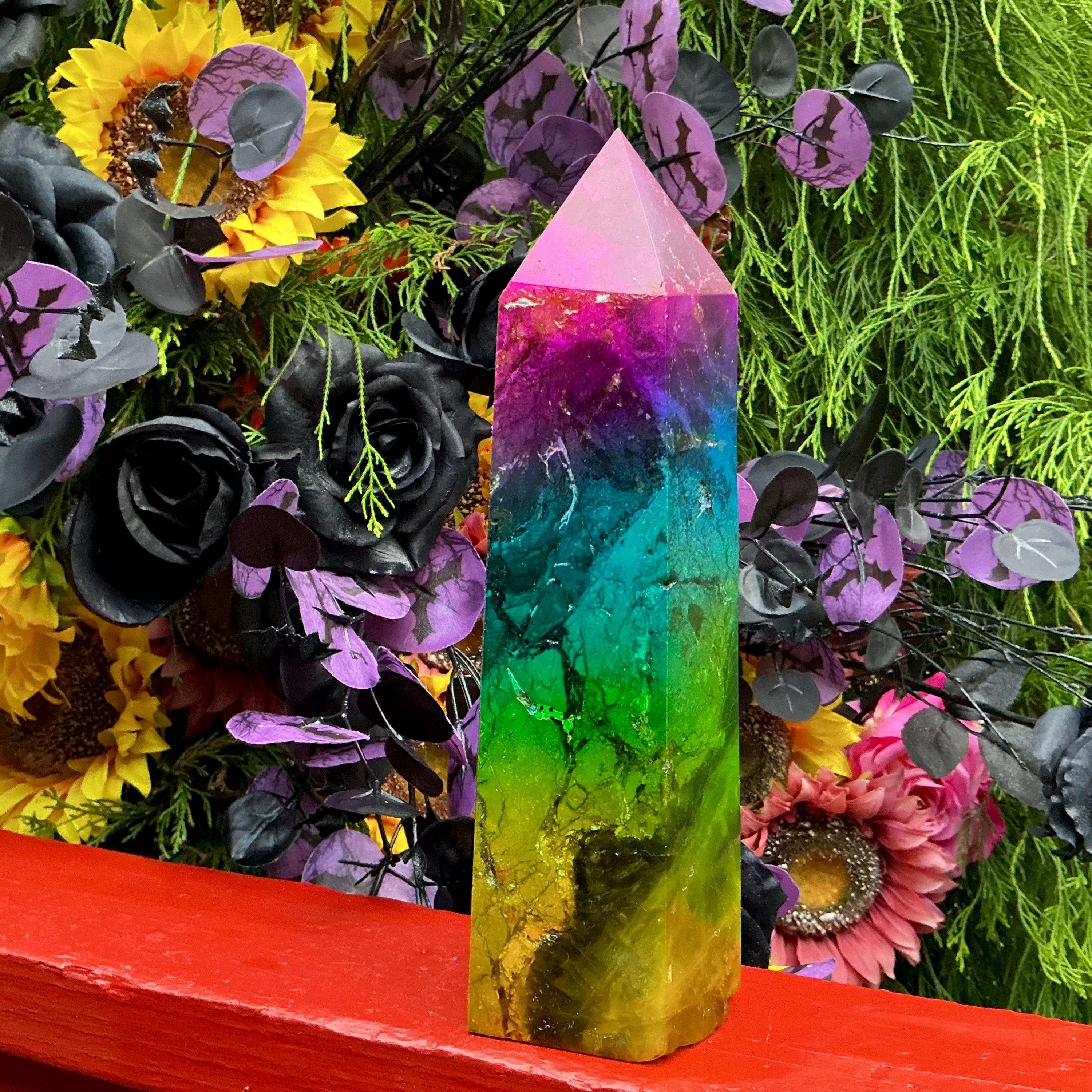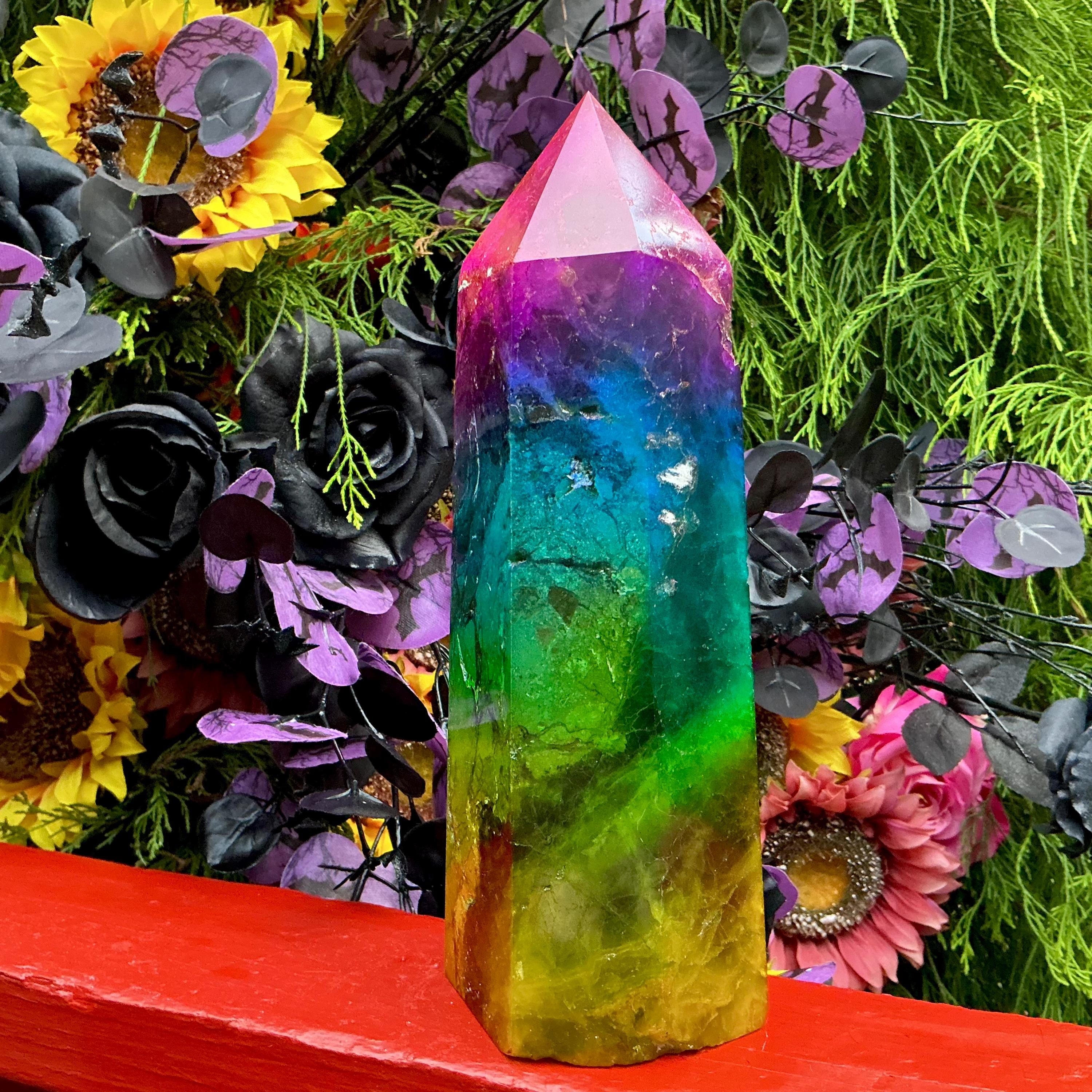 Rainbow Aura Fluorite Crystal Generator ~ 6 lb. 8 oz.~ 10" Tall Tower ~ Colorful Pink Blue Green Yellow Color ~ Fast & Free Shipping U.S.A.