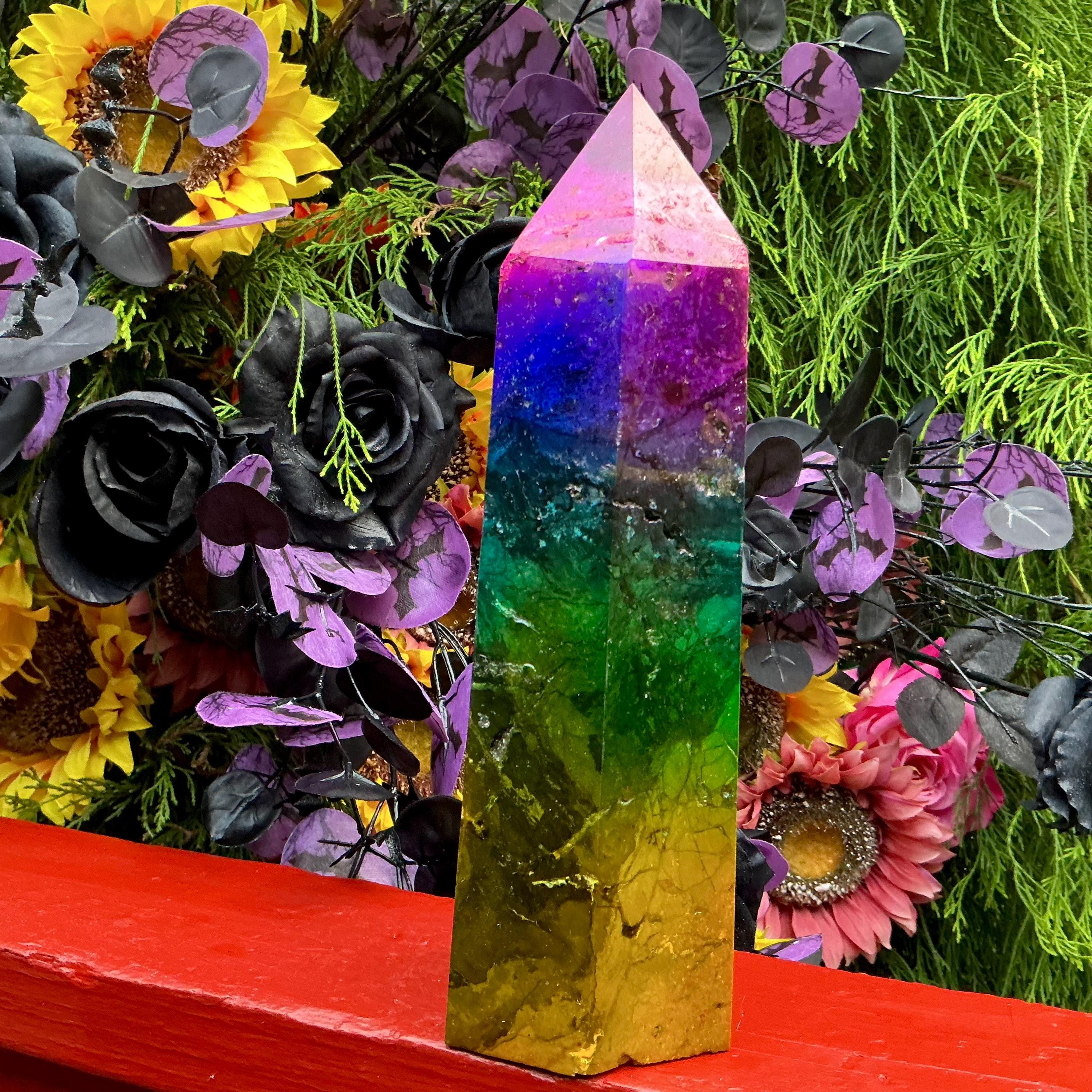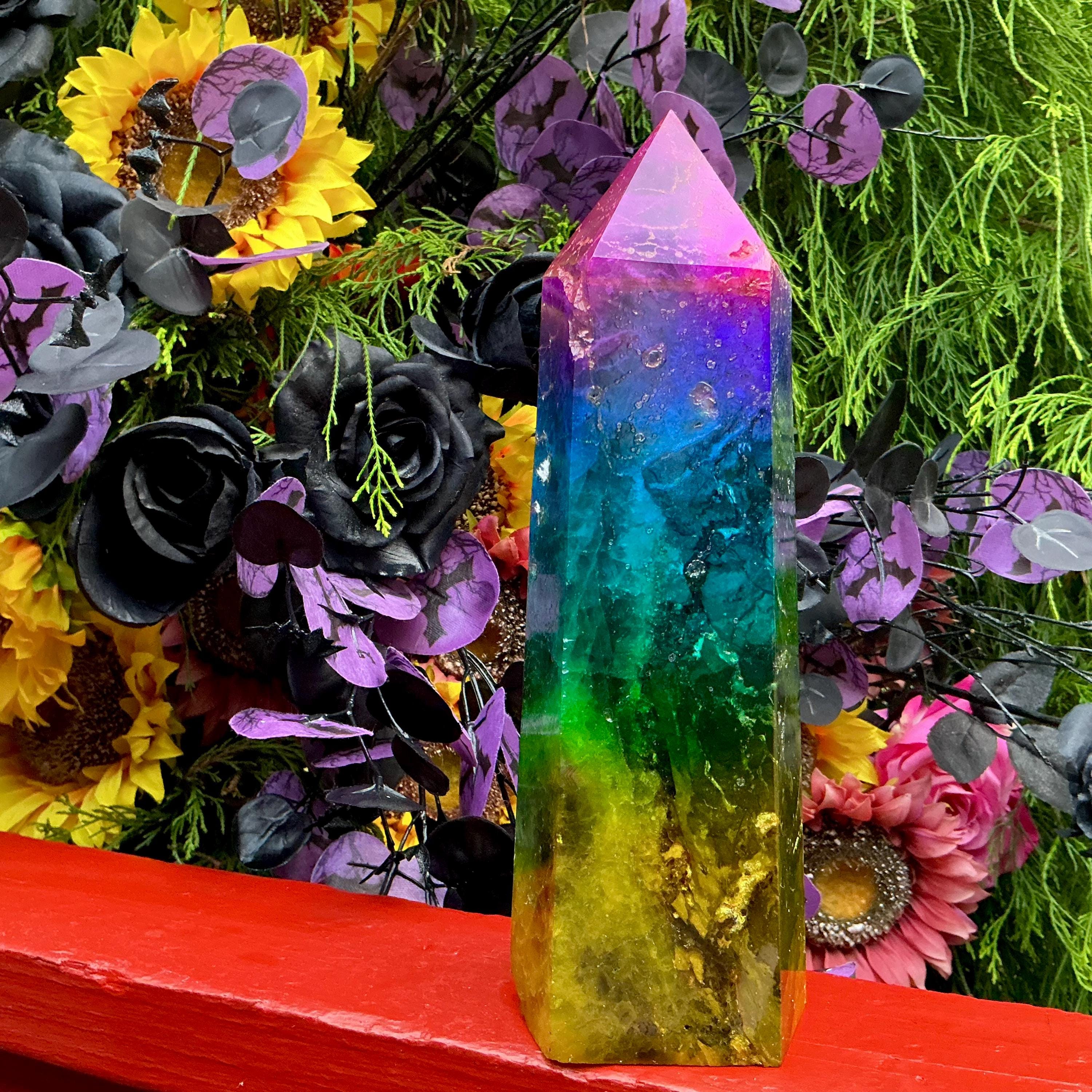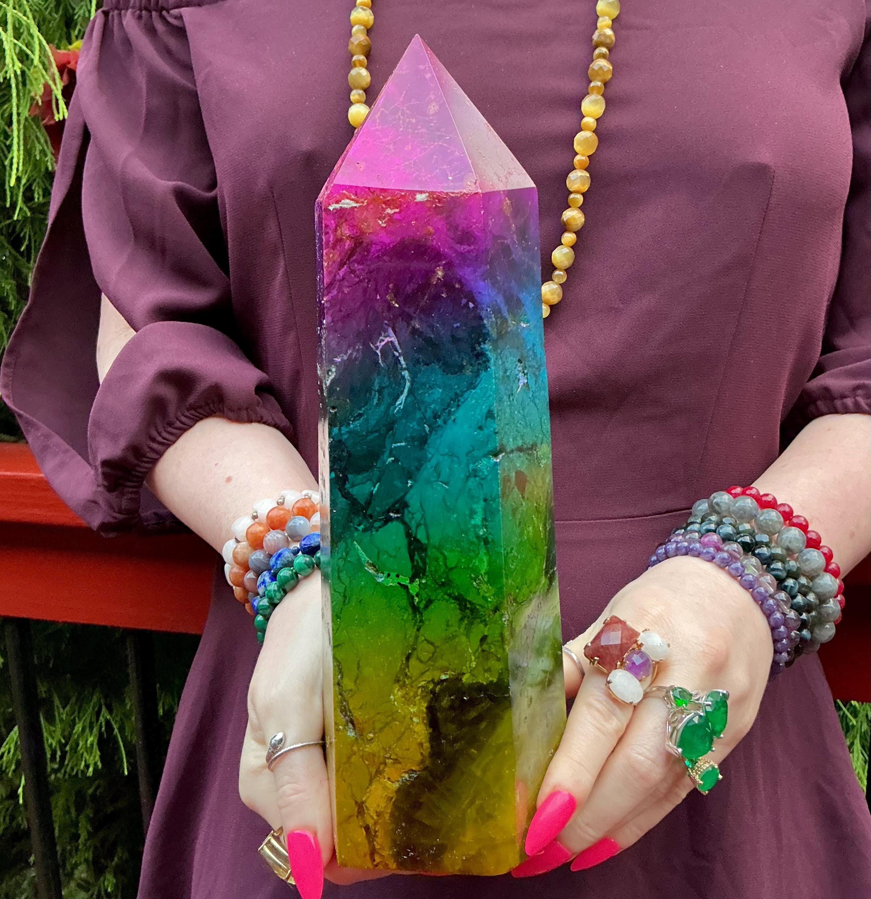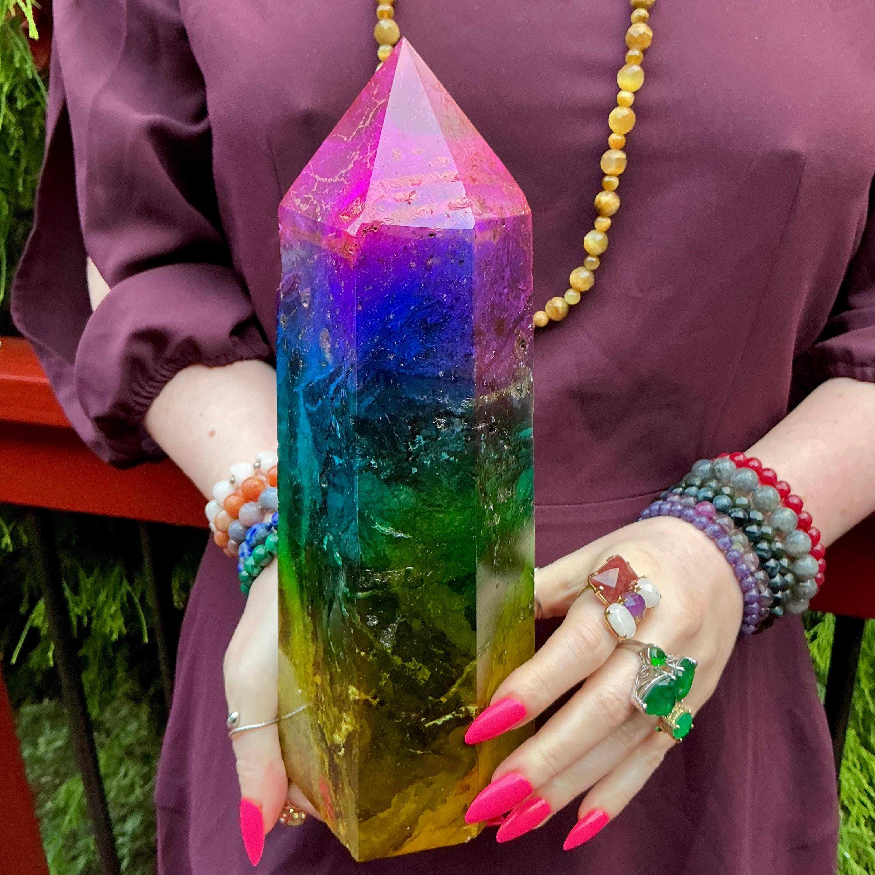 Rainbow Aura Fluorite Crystal Generator ~ 6 lb. 8 oz.~ 10" Tall Tower ~ Colorful Pink Blue Green Yellow Color ~ Fast & Free Shipping U.S.A.