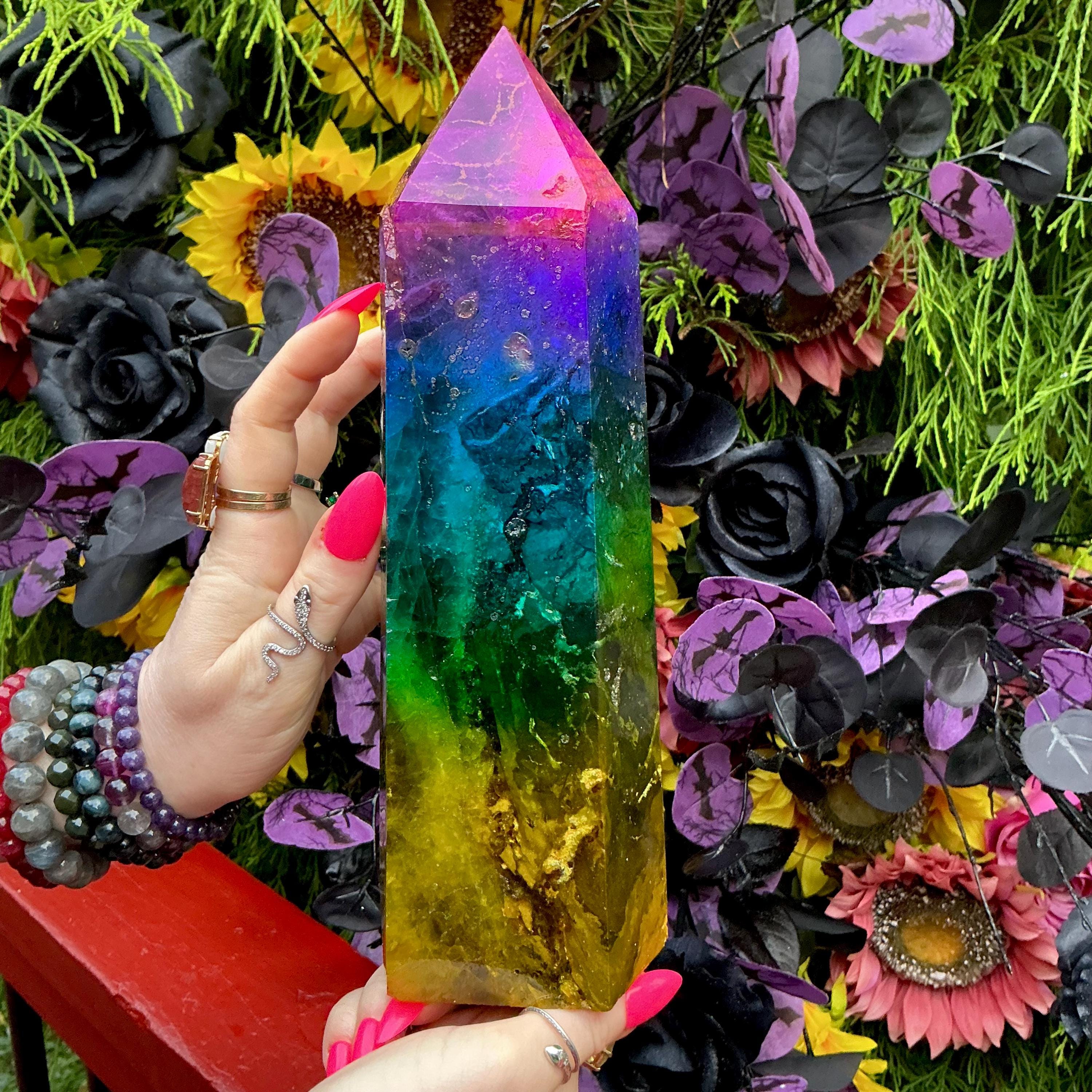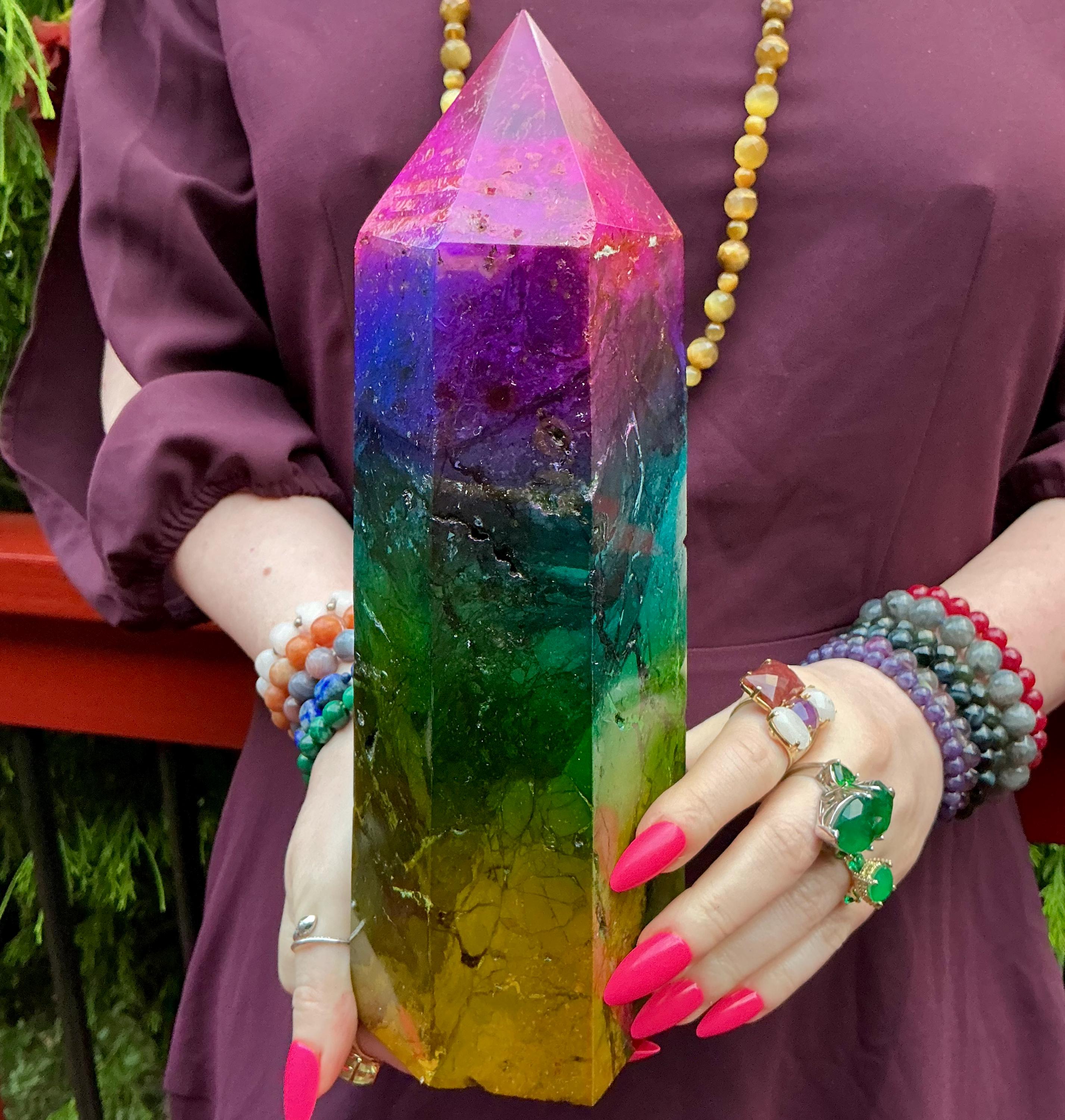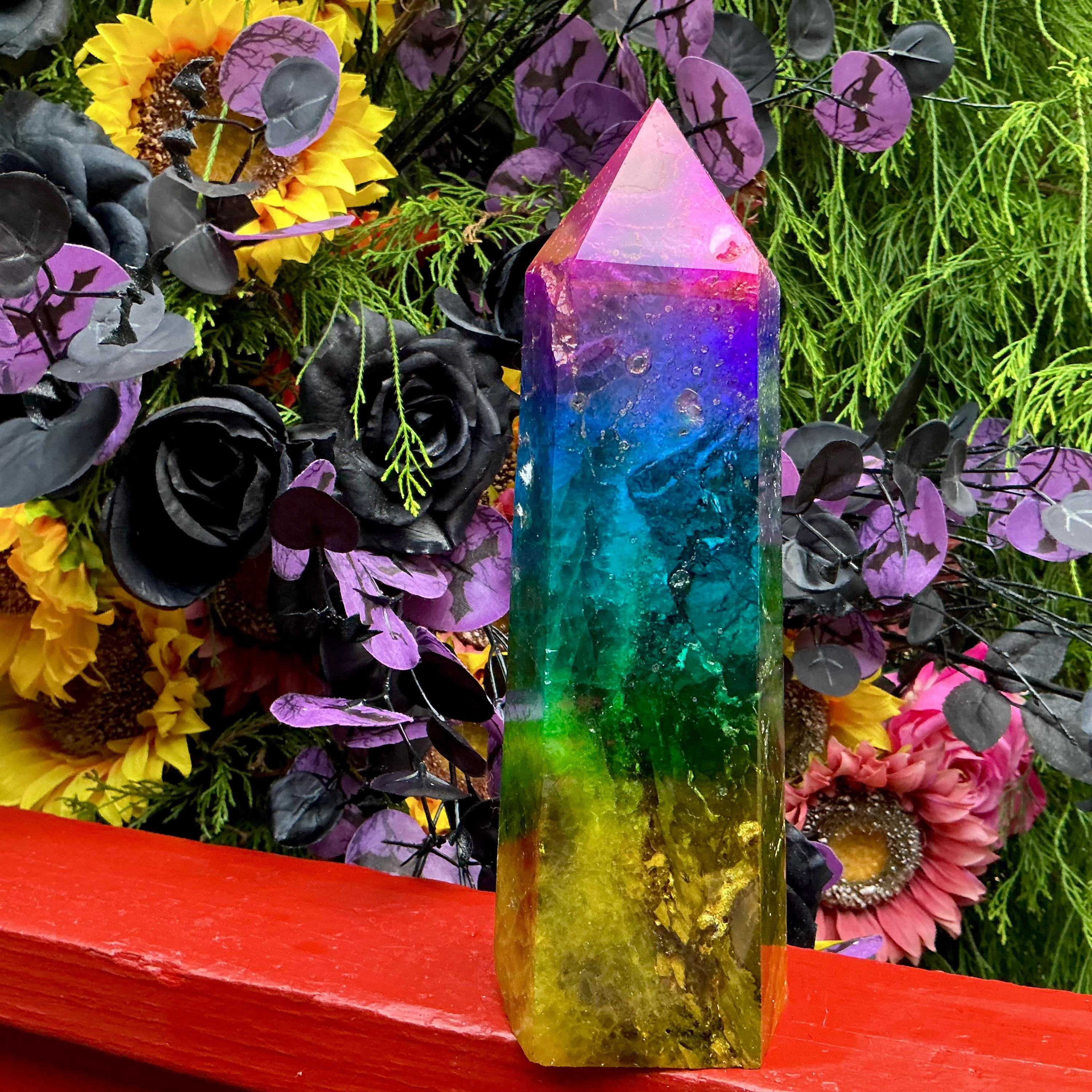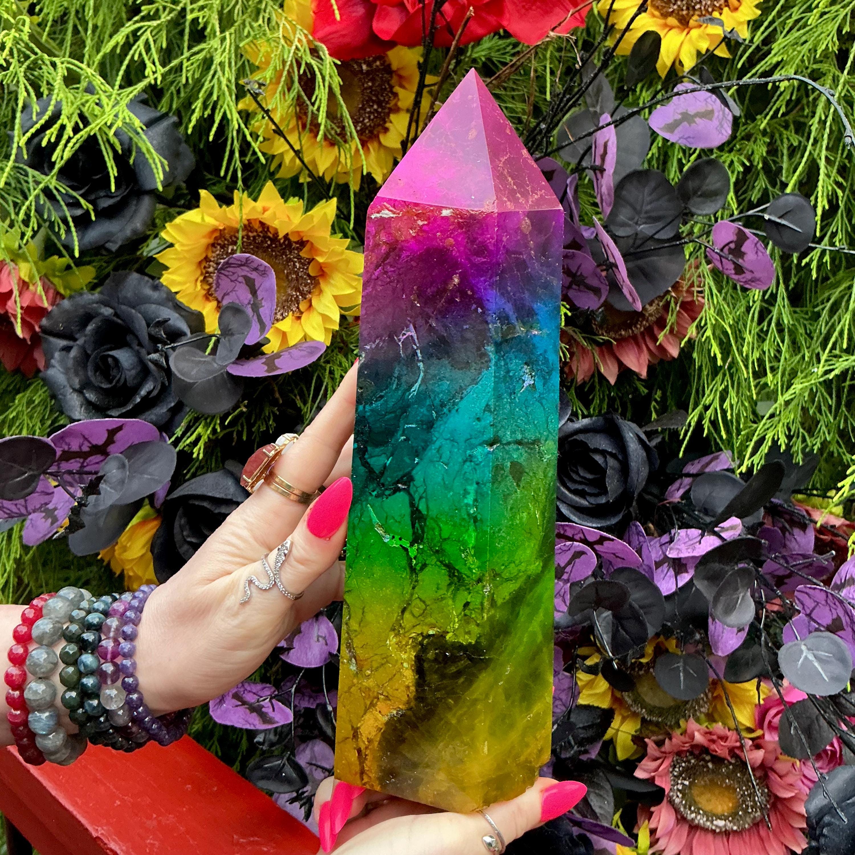 Rainbow Aura Fluorite Crystal Generator ~ 6 lb. 8 oz.~ 10" Tall Tower ~ Colorful Pink Blue Green Yellow Color ~ Fast & Free Shipping U.S.A.