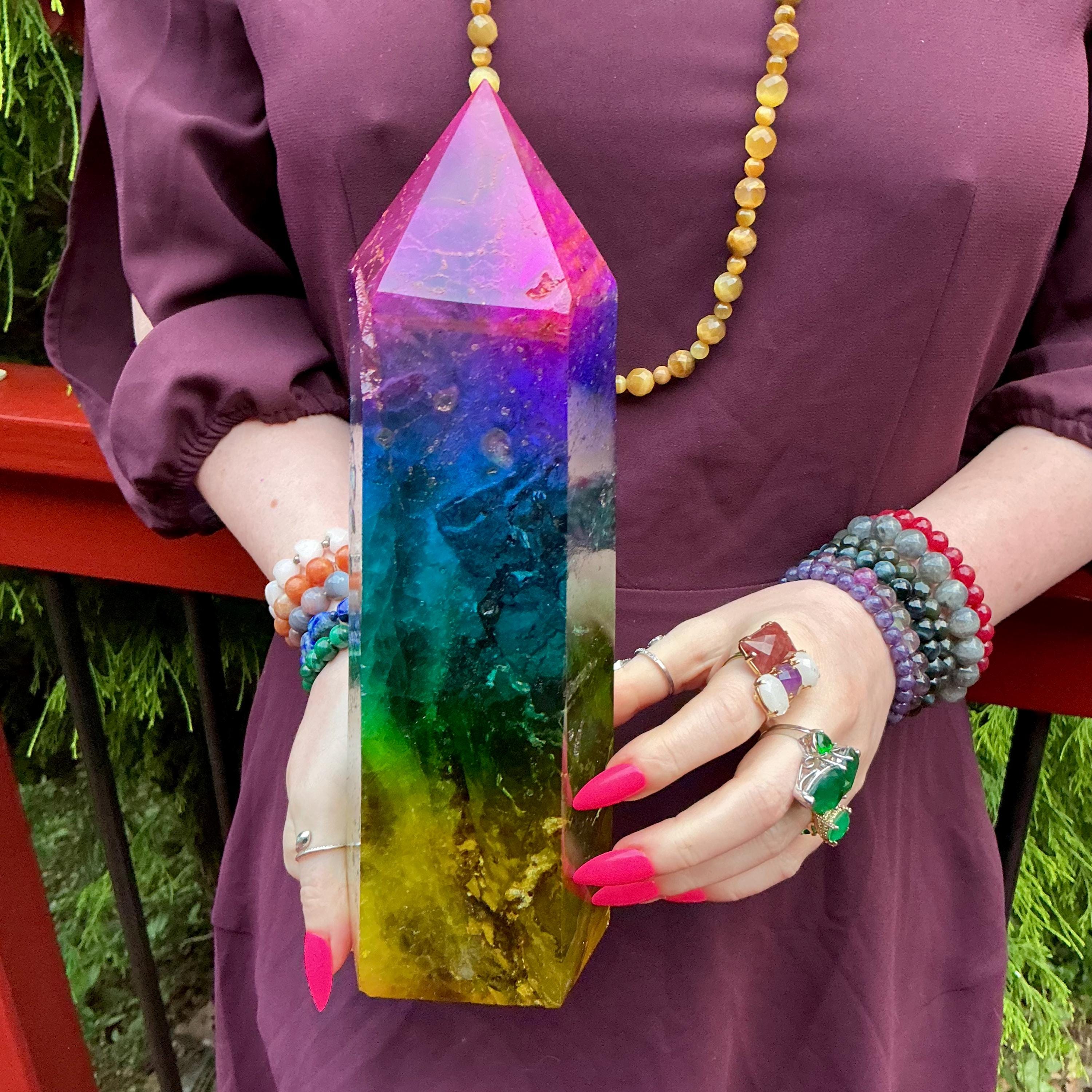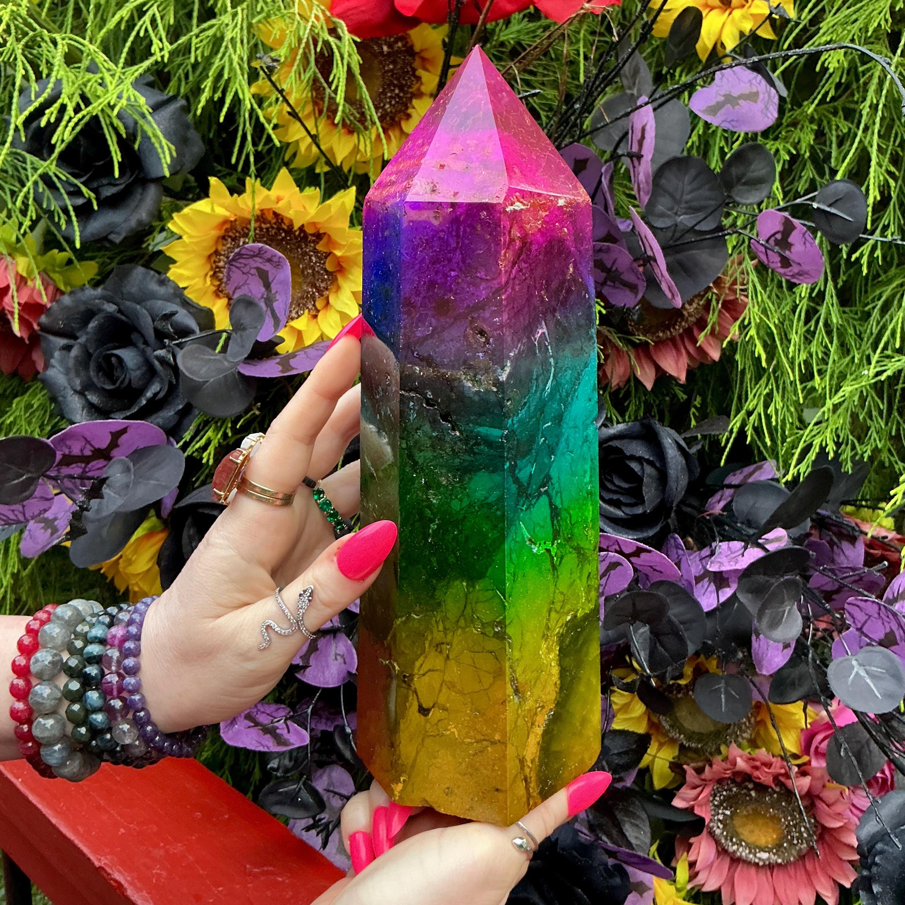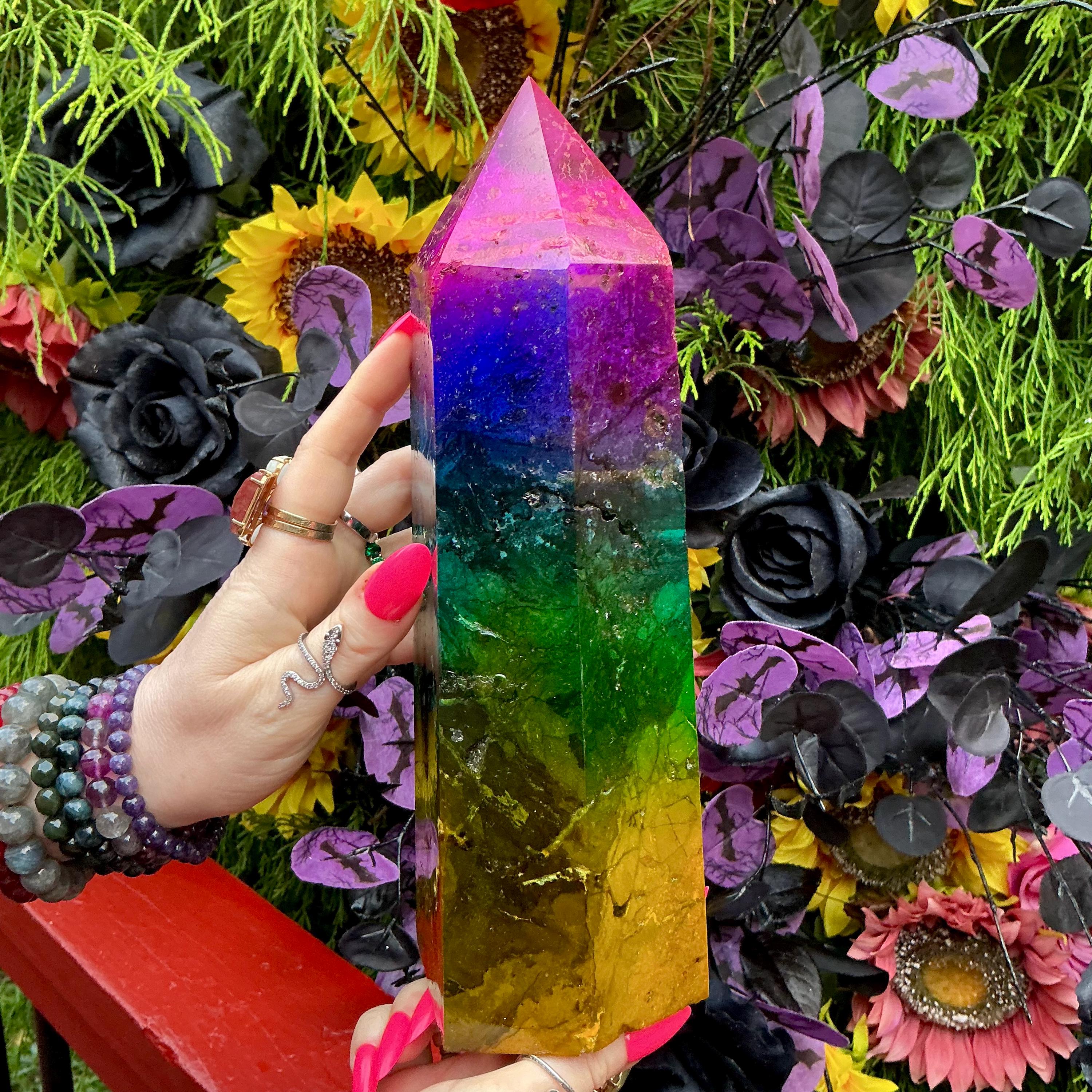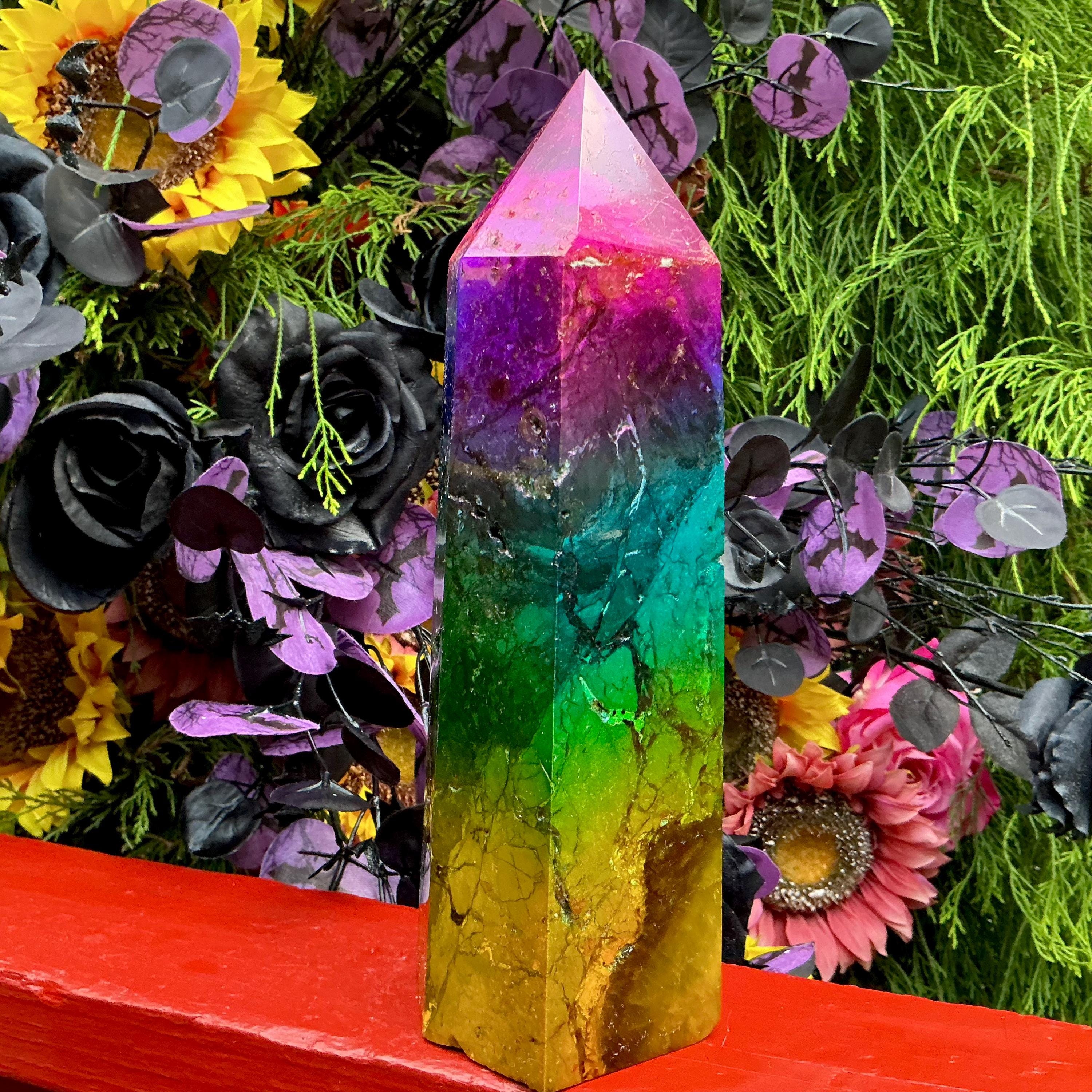 Rainbow Aura Fluorite Crystal Generator ~ 6 lb. 8 oz.~ 10" Tall Tower ~ Colorful Pink Blue Green Yellow Color ~ Fast & Free Shipping U.S.A.
