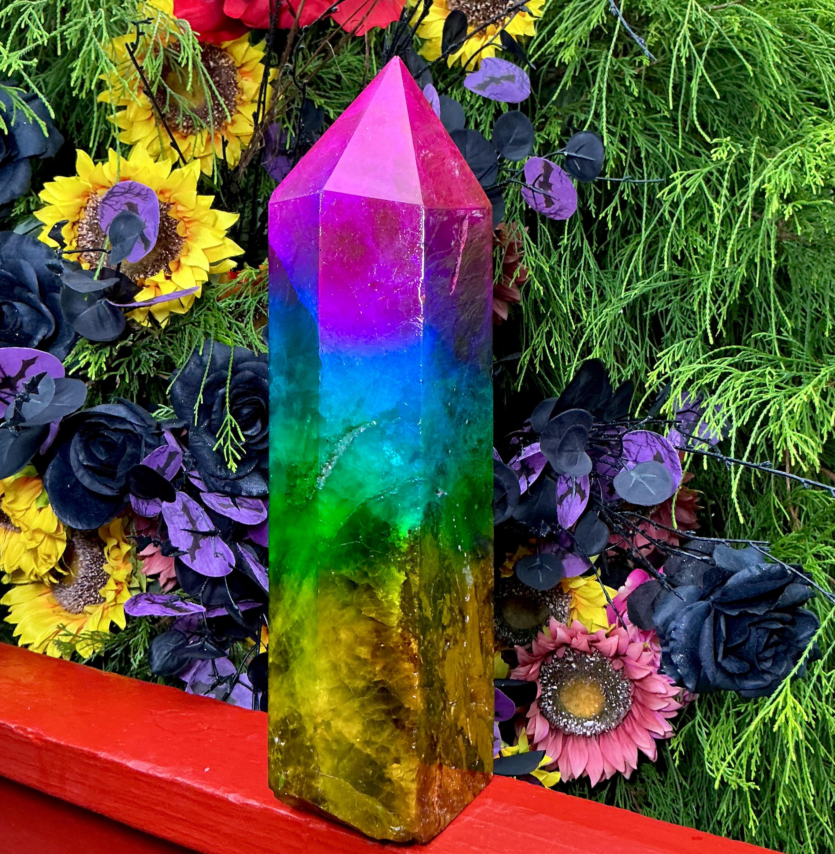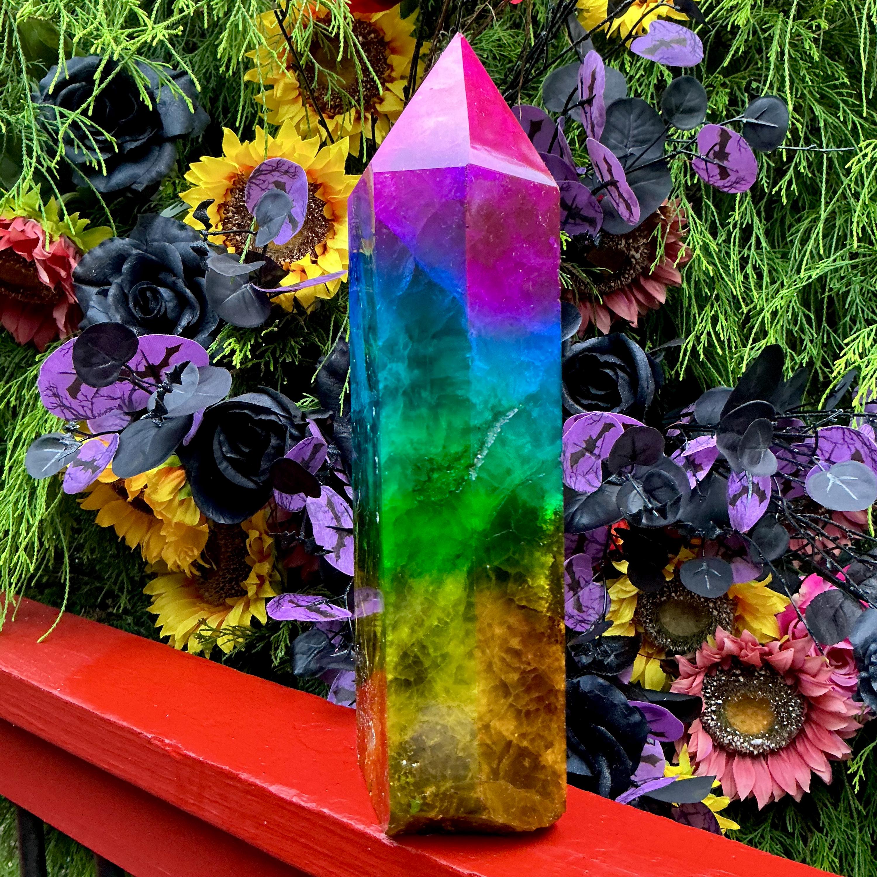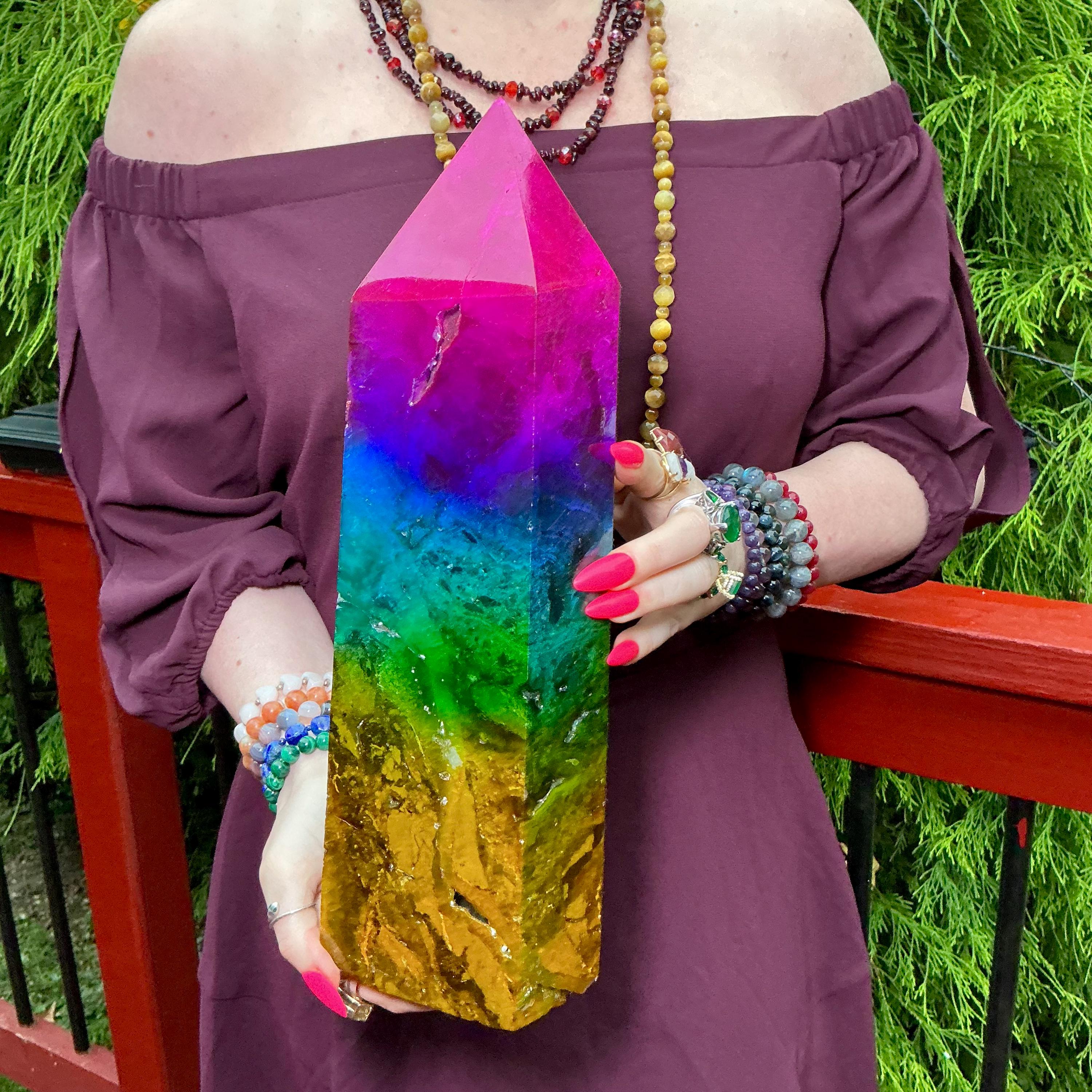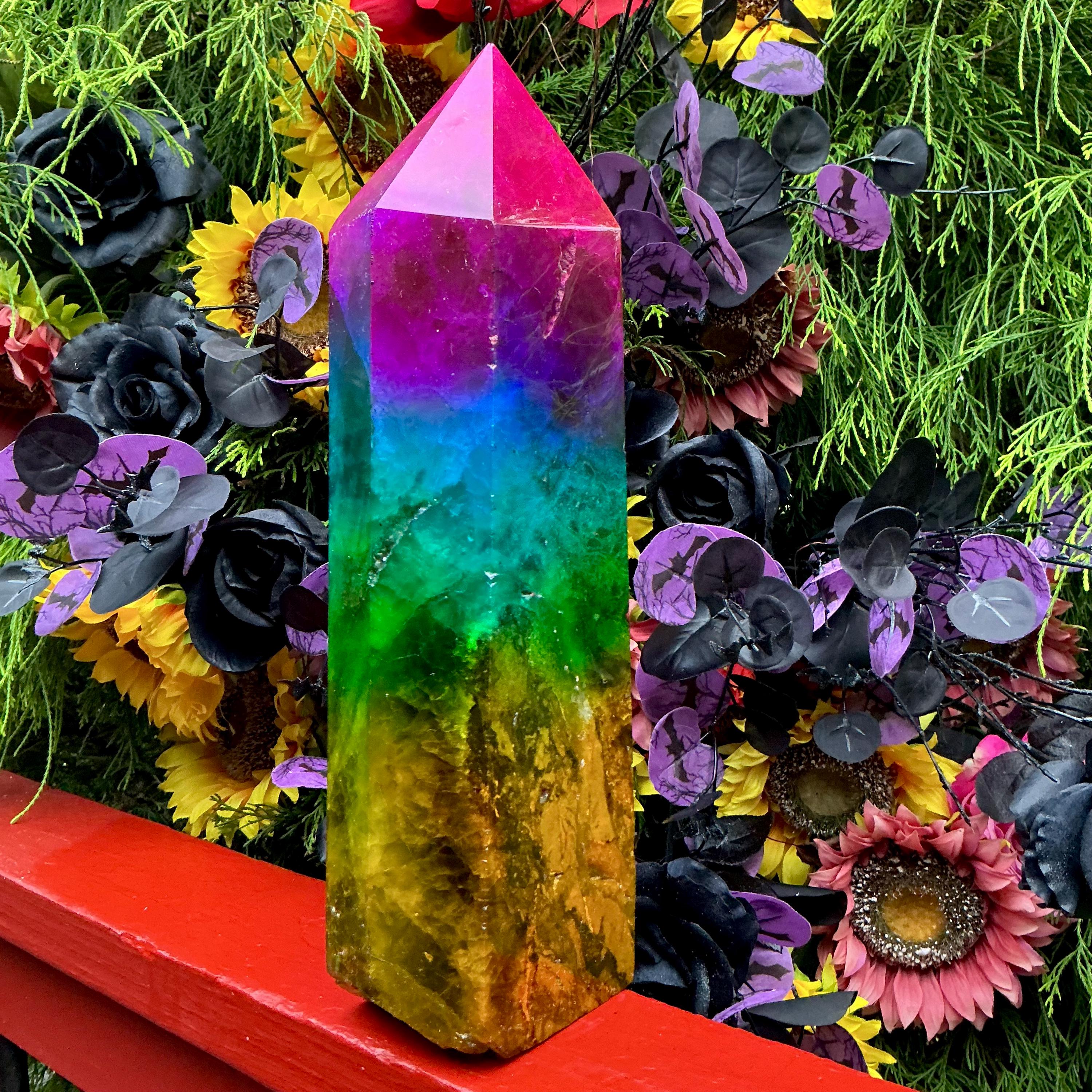 Rainbow Aura Fluorite Crystal Generator ~ 15 lb. ~ 14" Tall Tower ~ Colorful Pink Blue Green Yellow Color ~ Fast & Free Shipping, U.S.A.