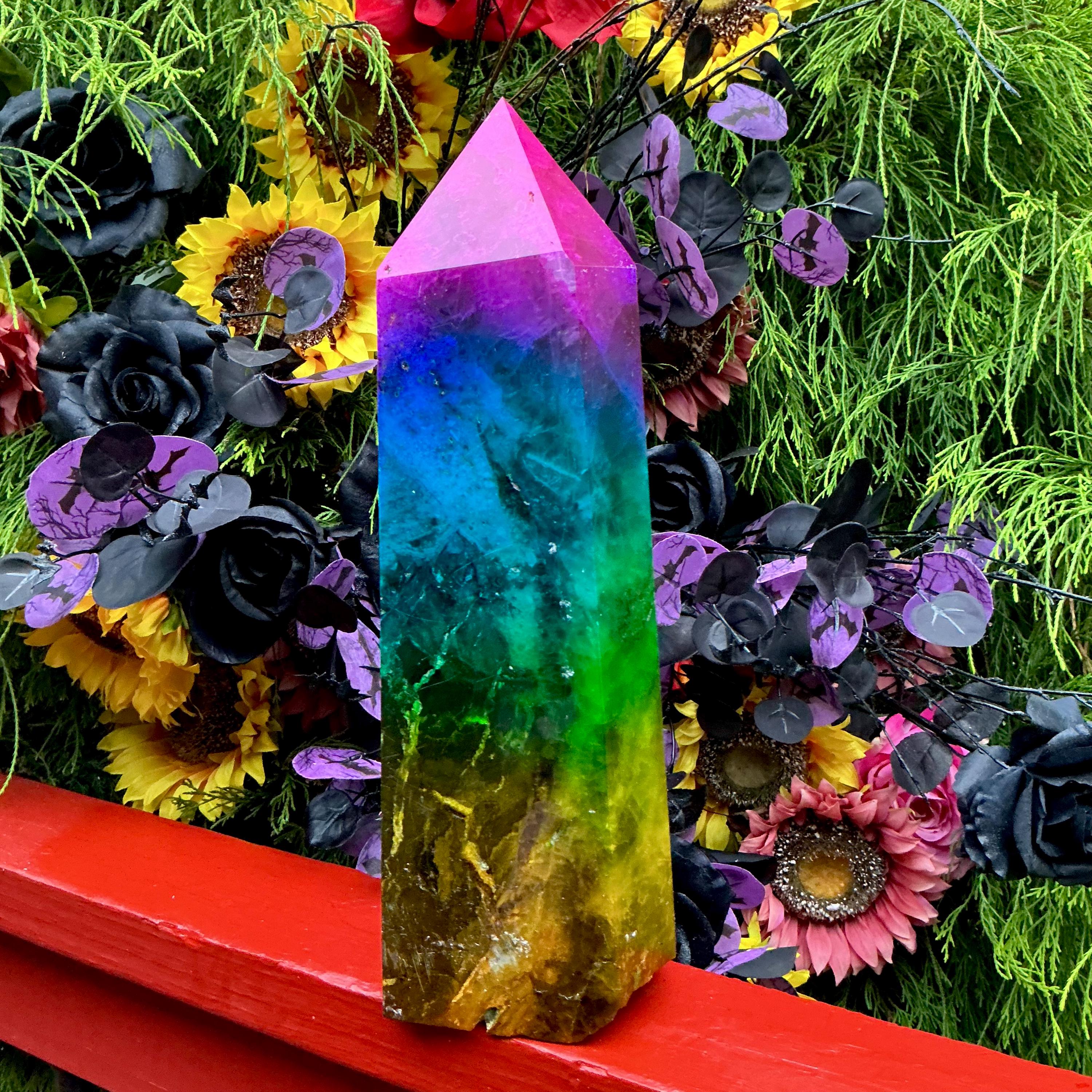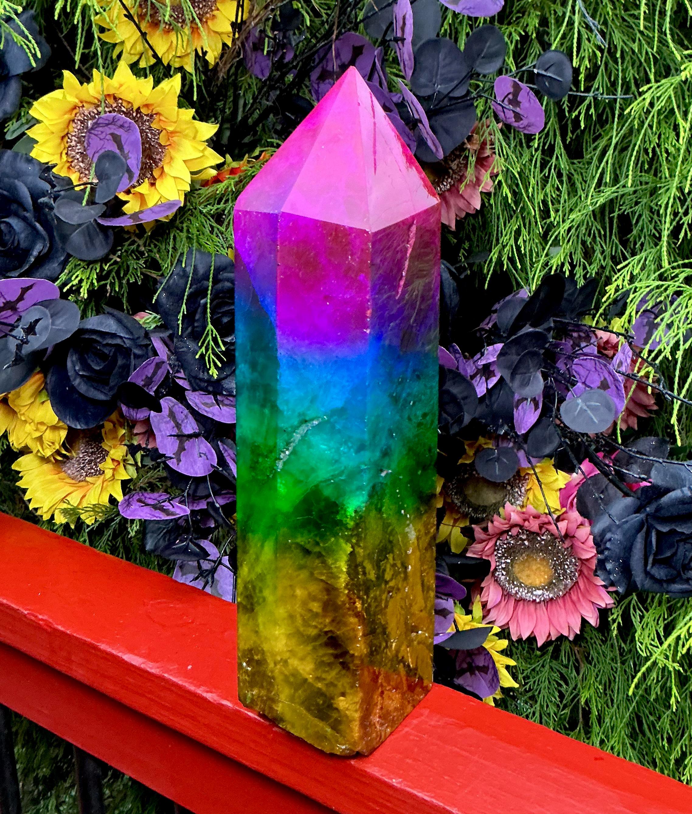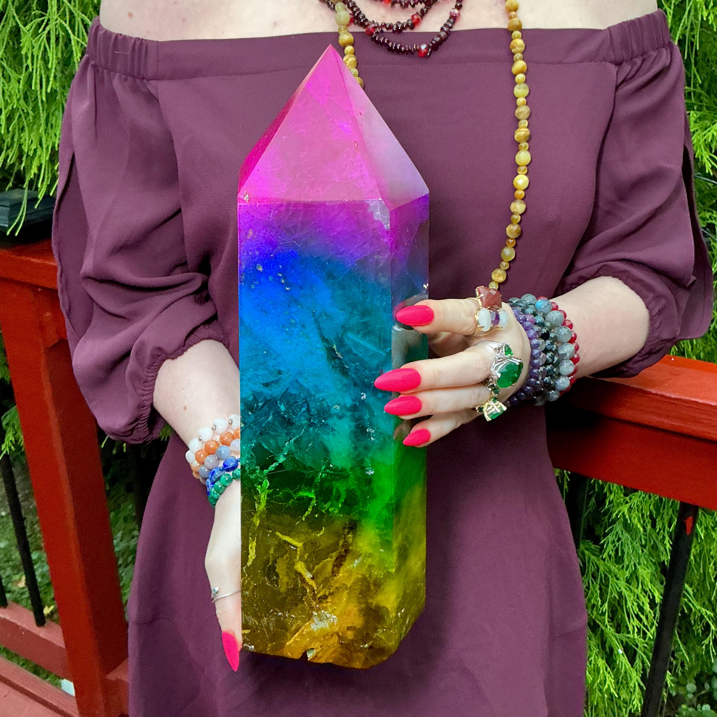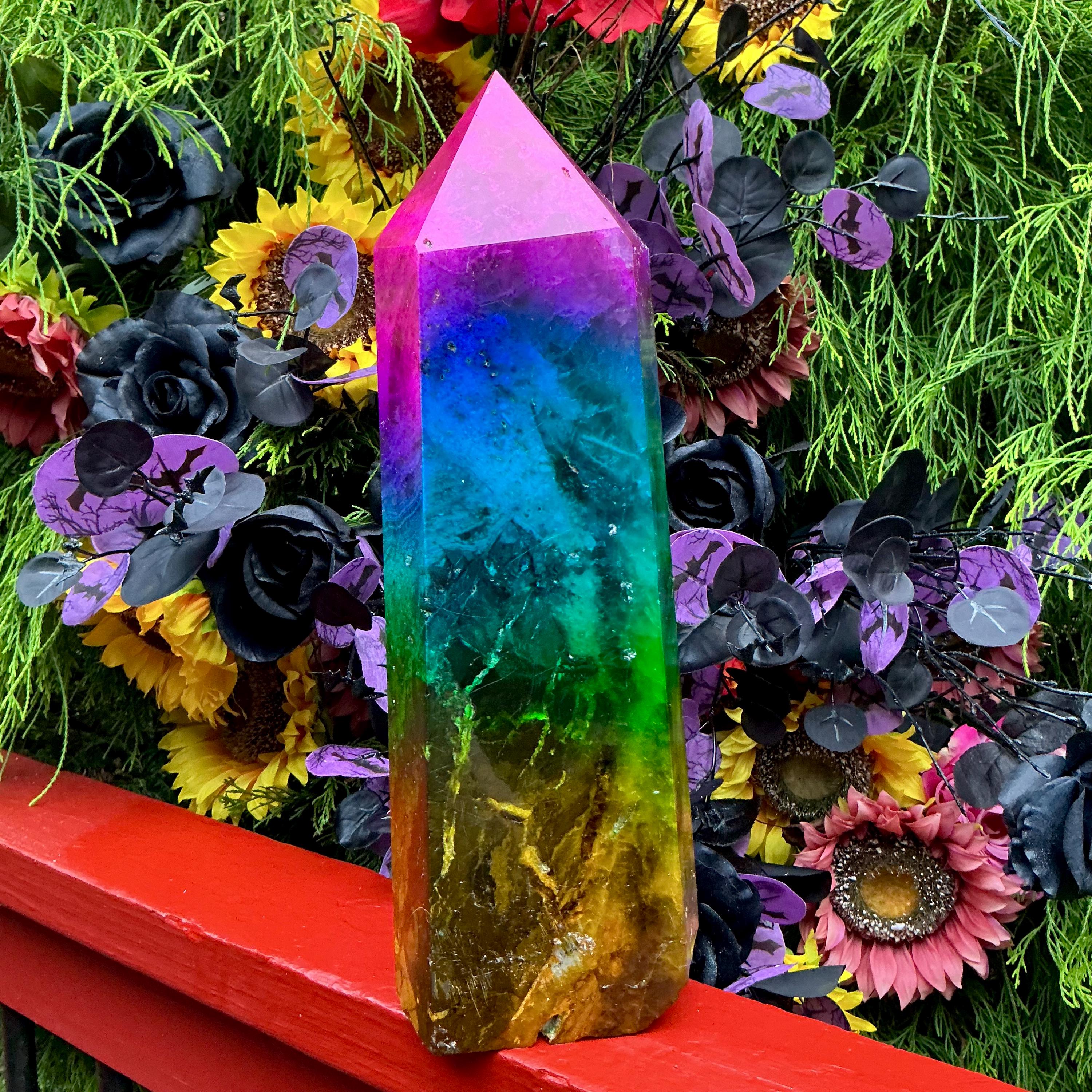 Rainbow Aura Fluorite Crystal Generator ~ 15 lb. ~ 14" Tall Tower ~ Colorful Pink Blue Green Yellow Color ~ Fast & Free Shipping, U.S.A.
