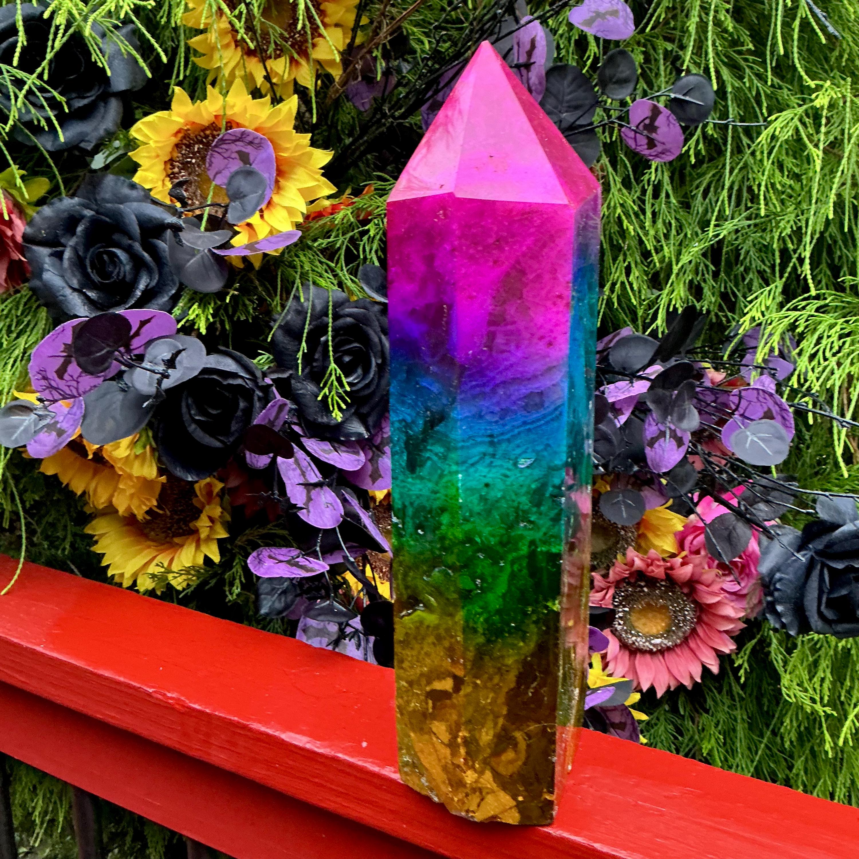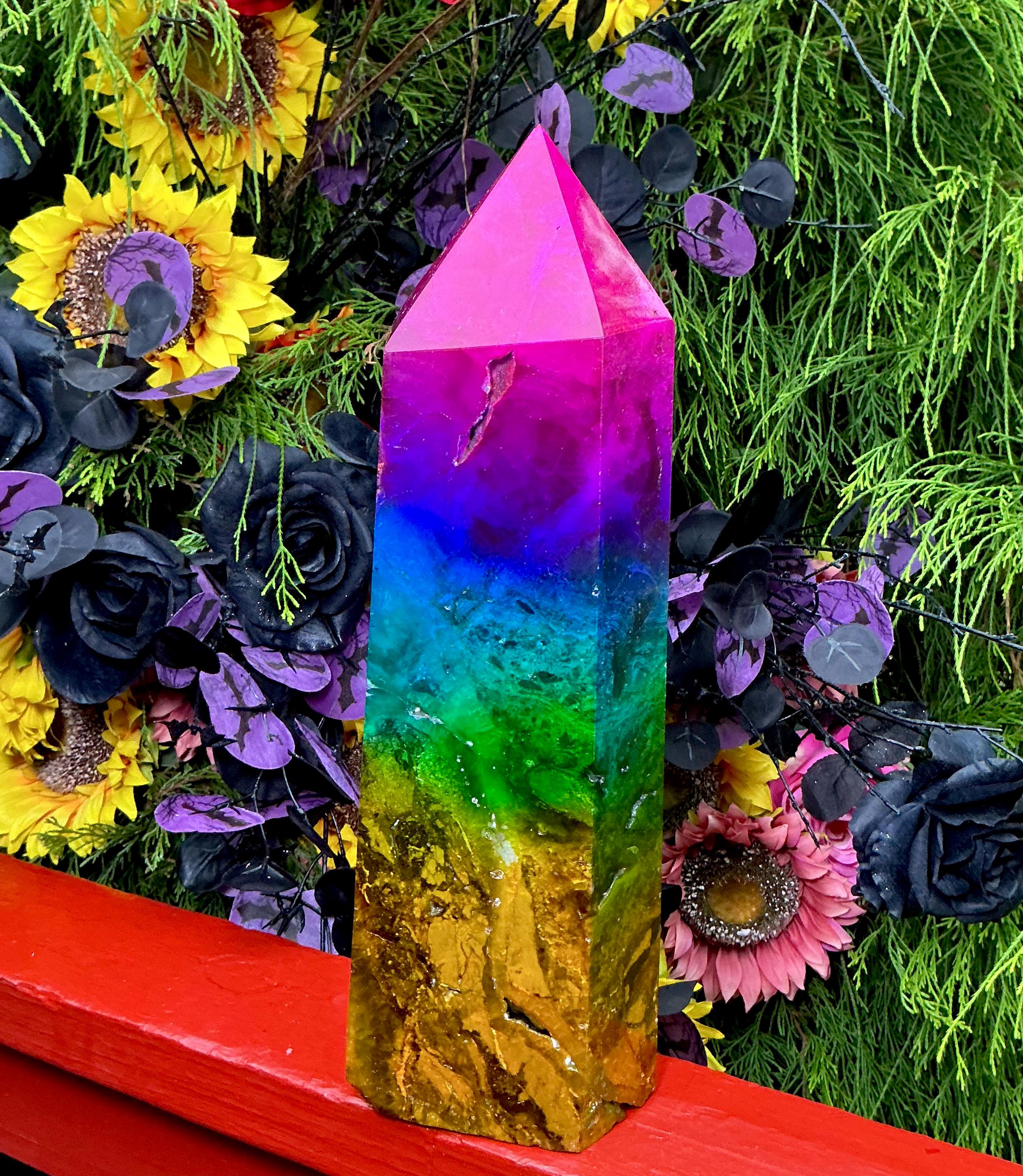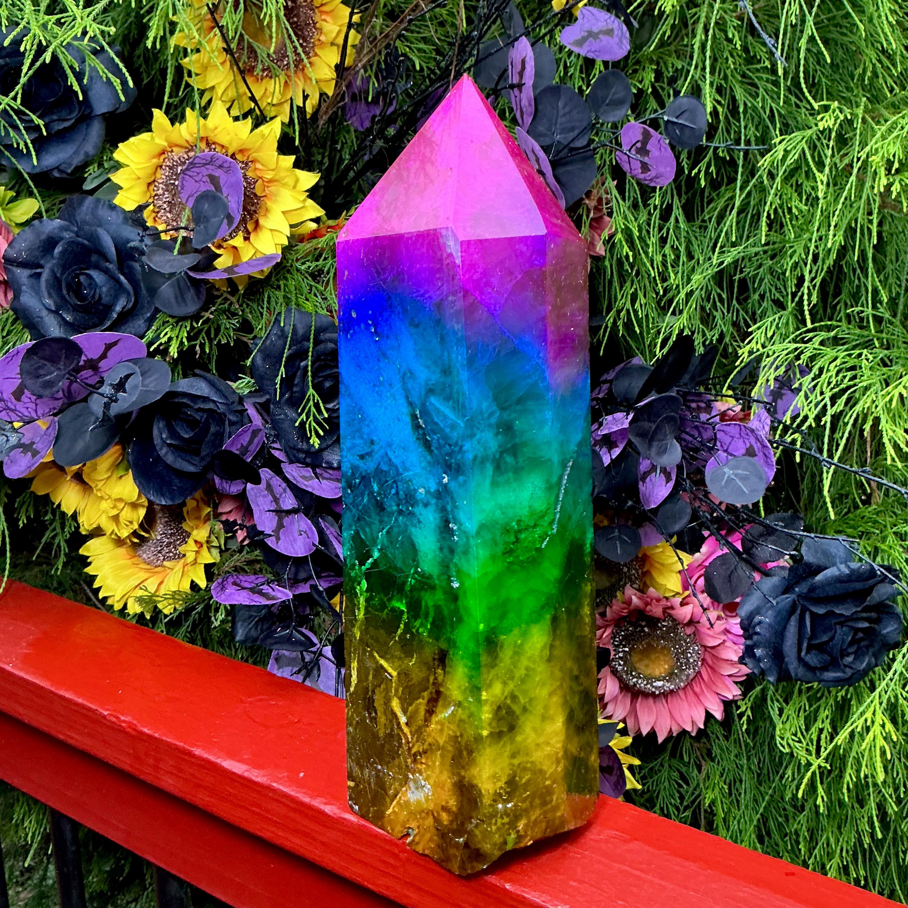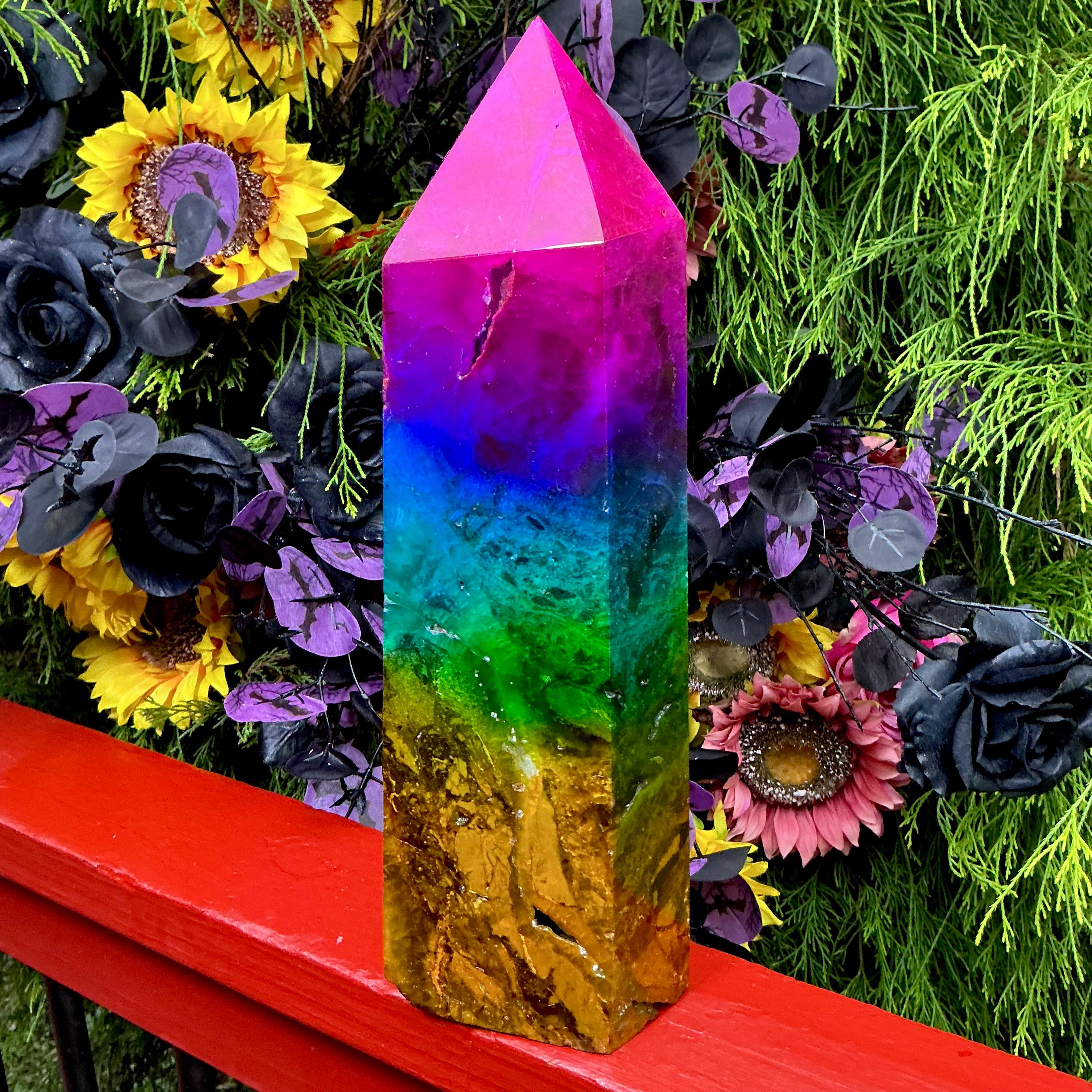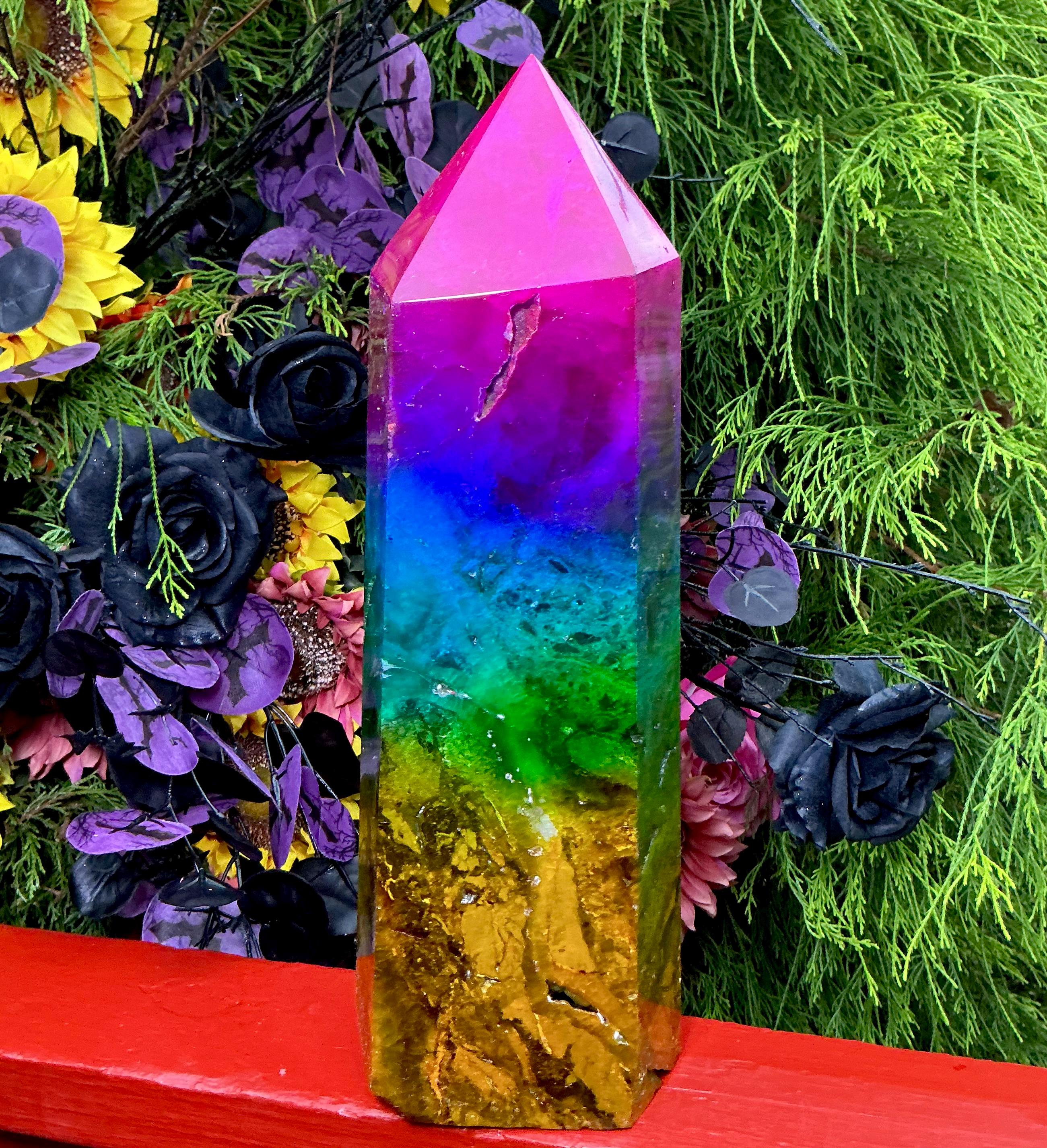 Rainbow Aura Fluorite Crystal Generator ~ 15 lb. ~ 14" Tall Tower ~ Colorful Pink Blue Green Yellow Color ~ Fast & Free Shipping, U.S.A.