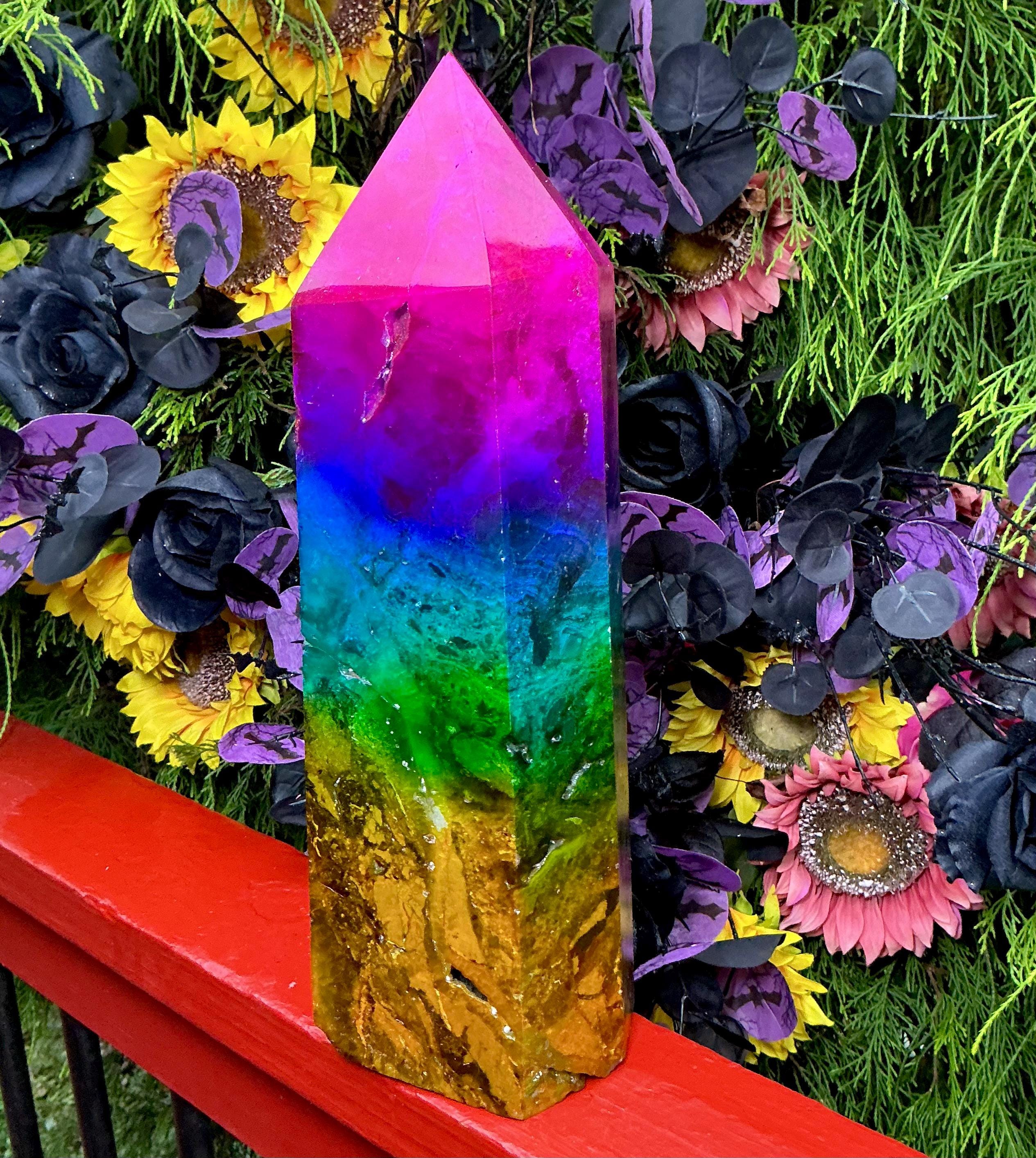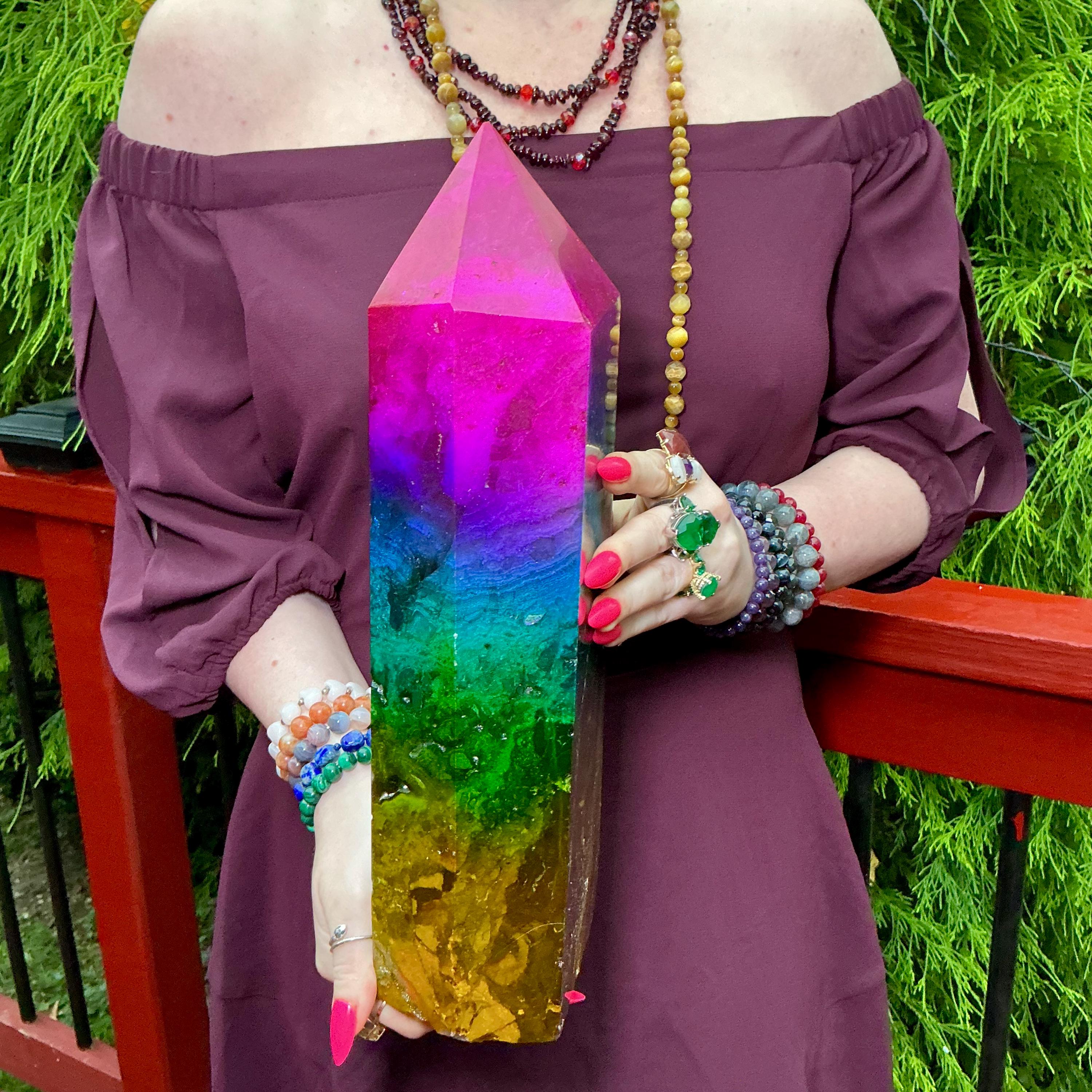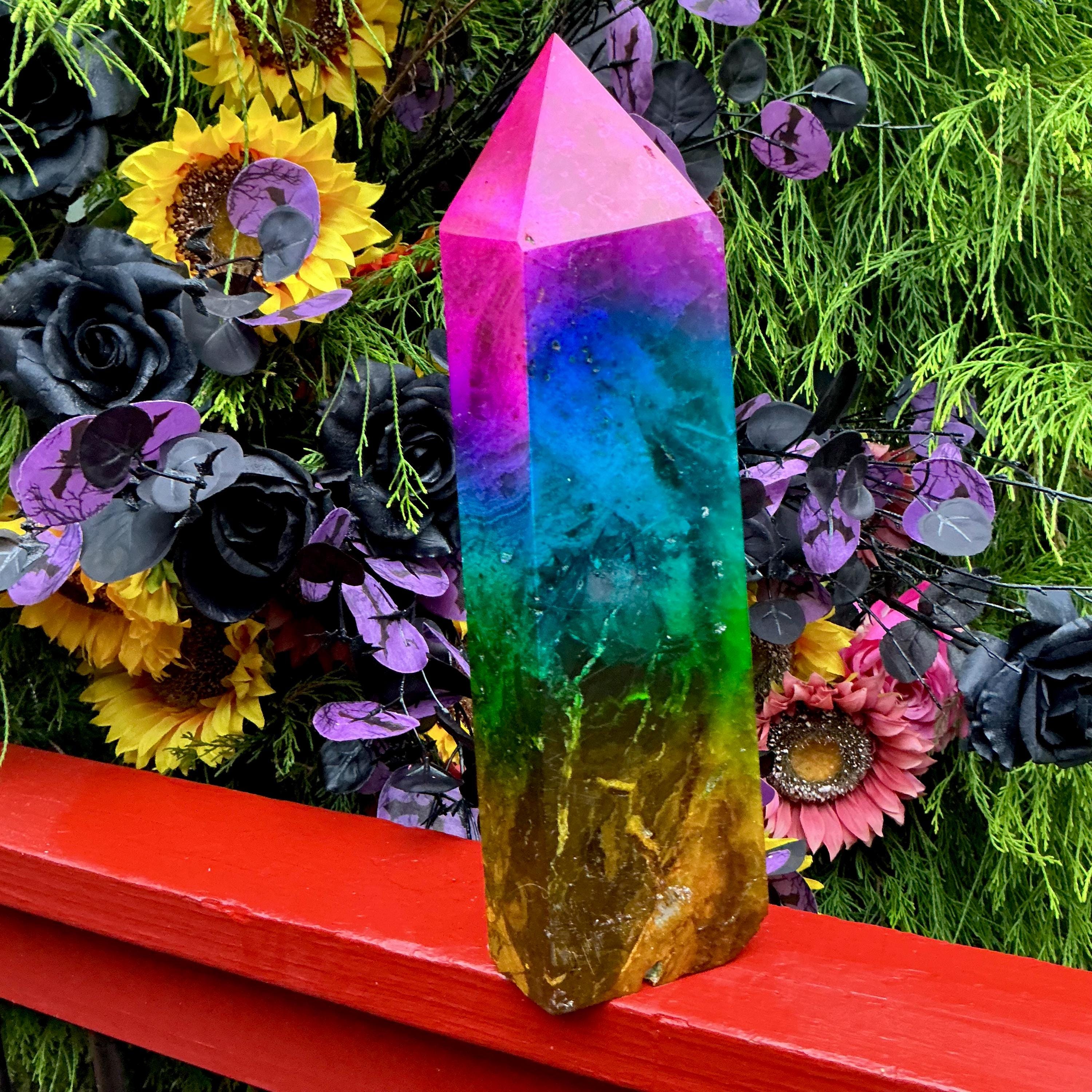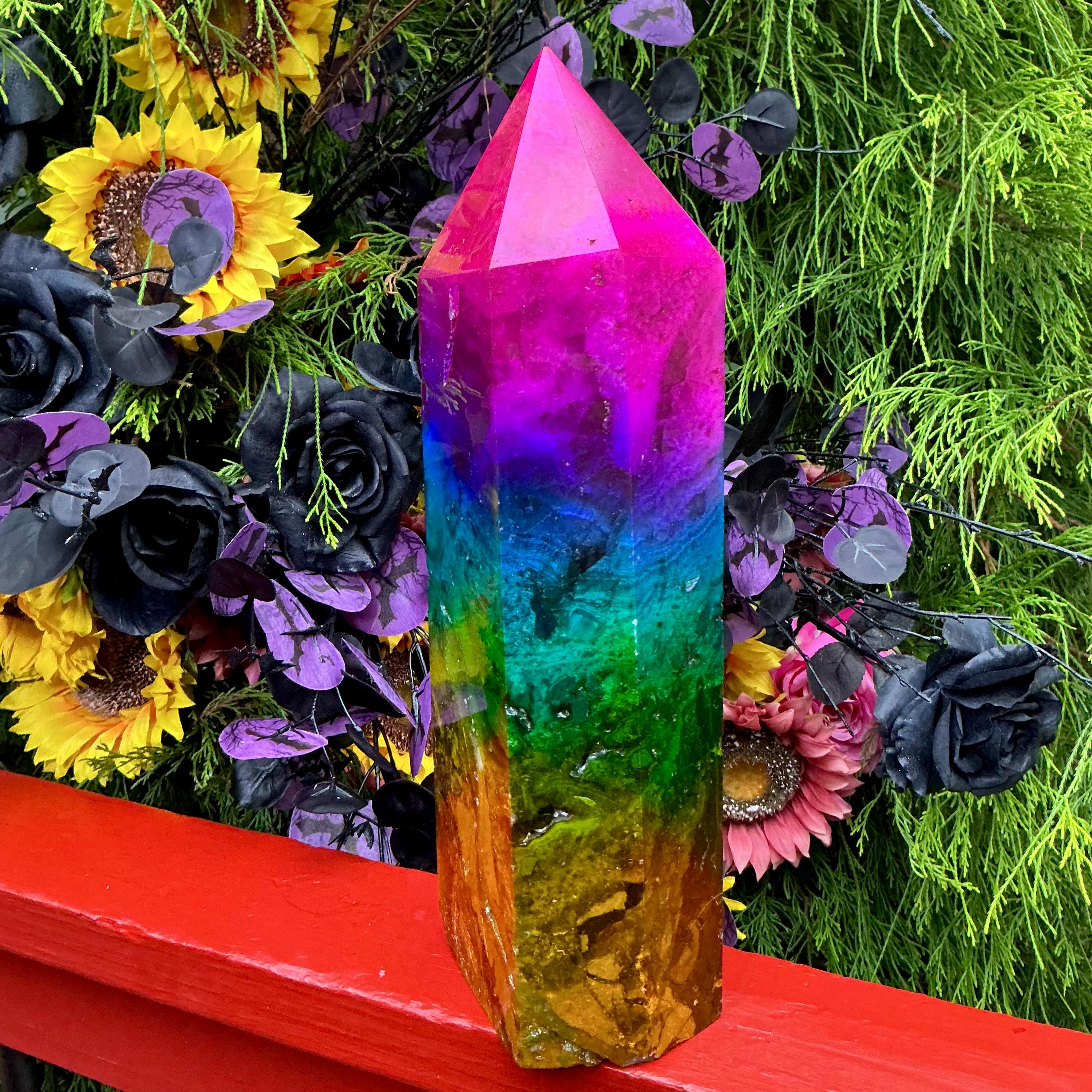 Rainbow Aura Fluorite Crystal Generator ~ 15 lb. ~ 14" Tall Tower ~ Colorful Pink Blue Green Yellow Color ~ Fast & Free Shipping, U.S.A.