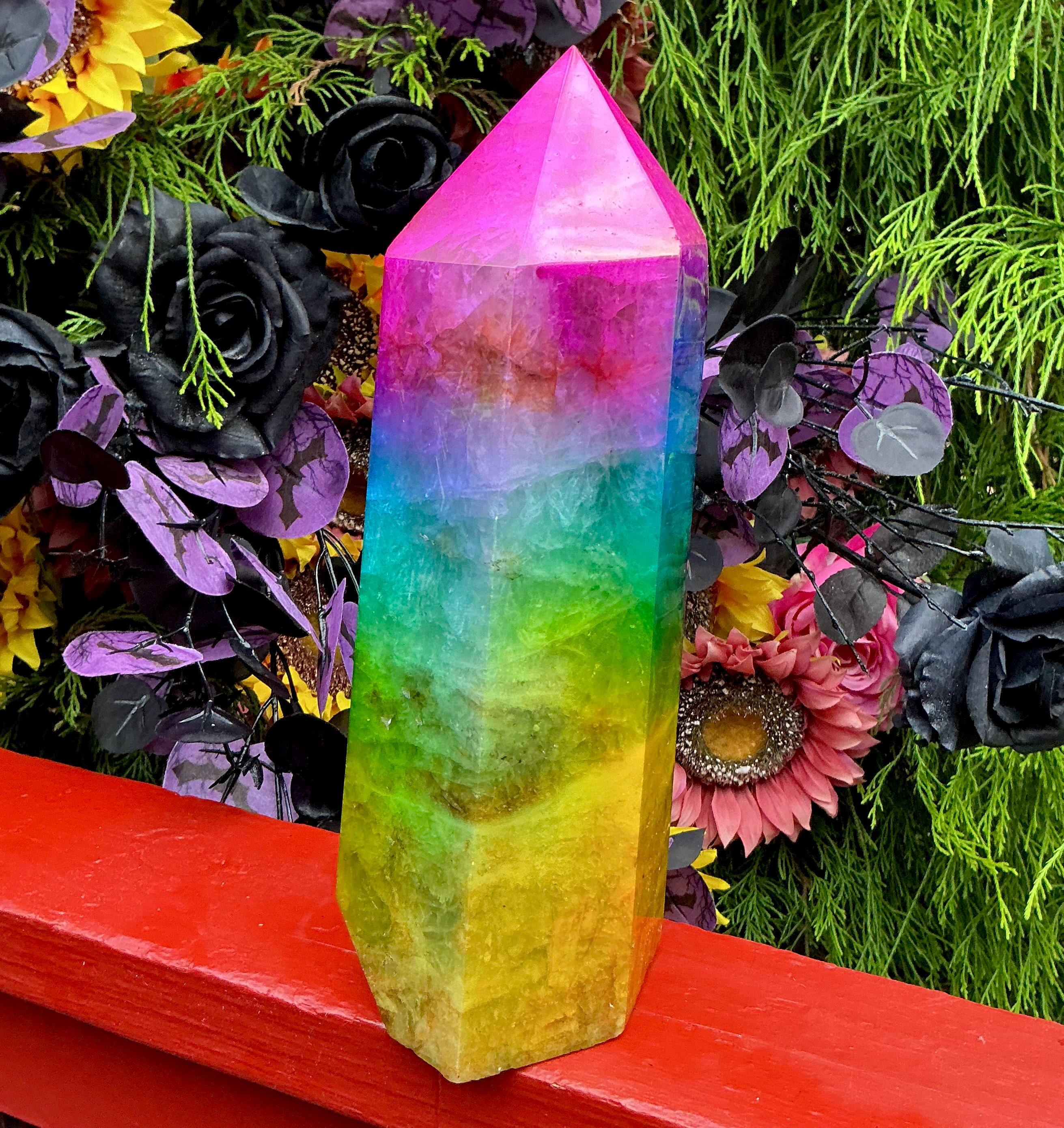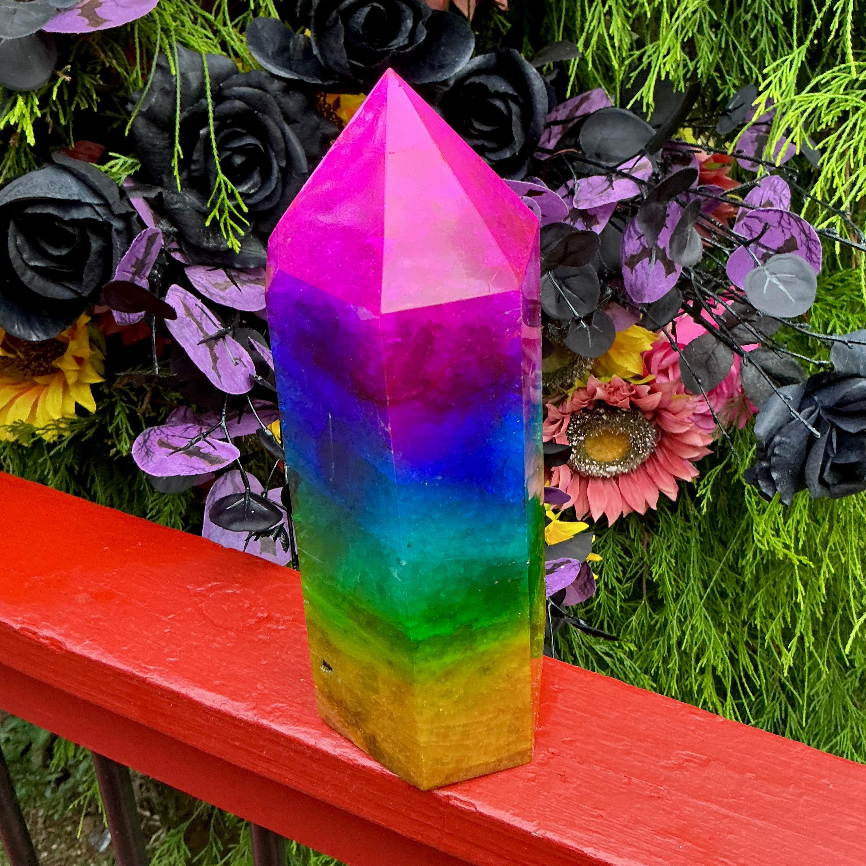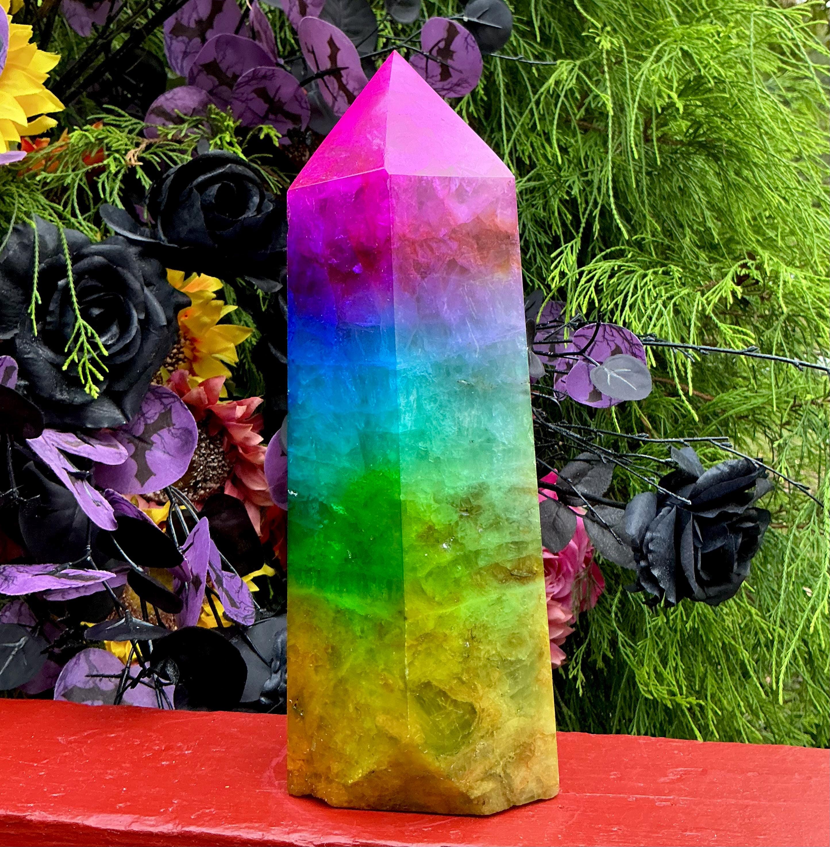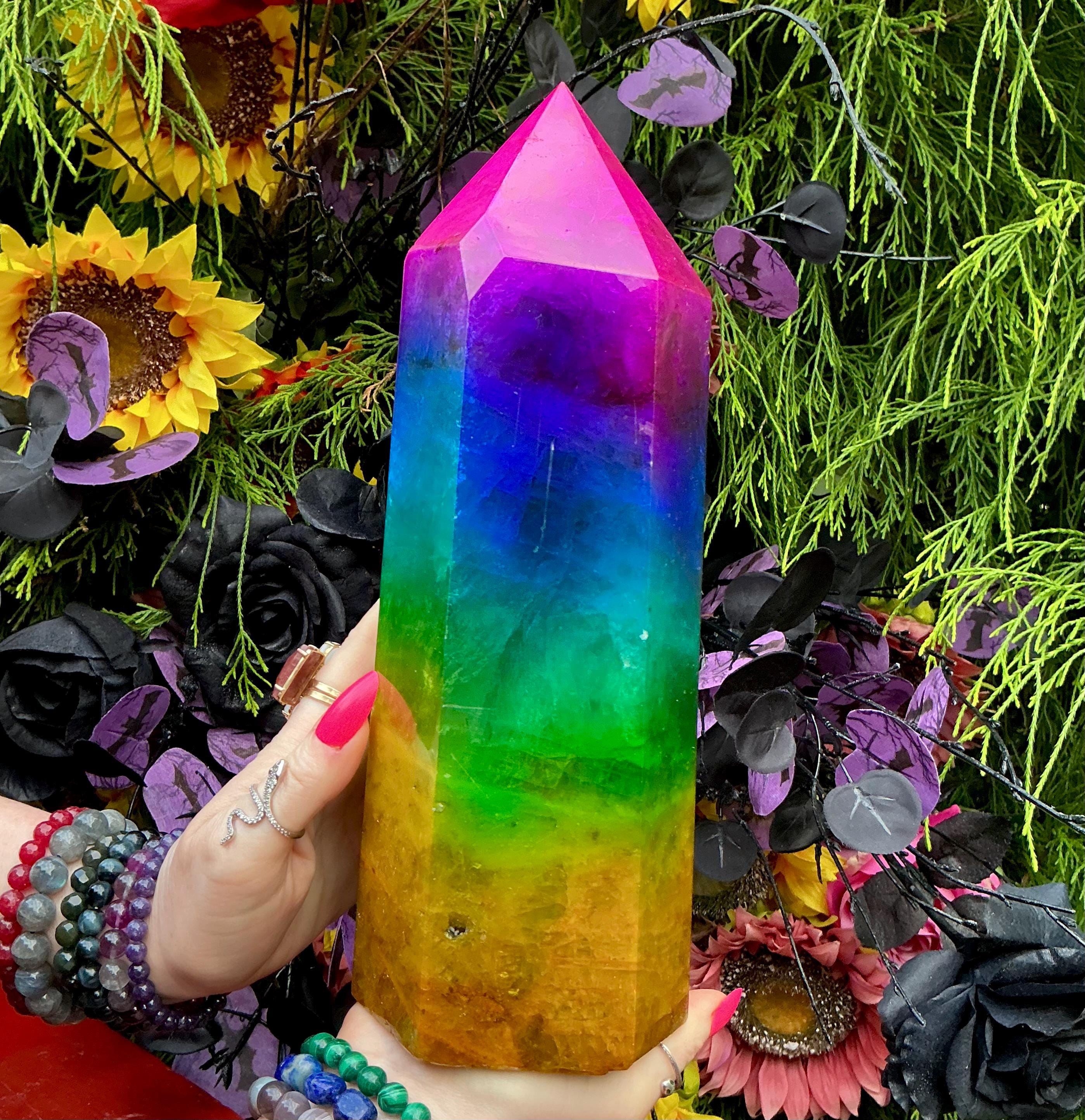 Rainbow Aura Fluorite Crystal Generator ~ 10 lb. ~ 10" Tall Tower ~ Colorful Pink Blue Green Yellow Color ~ Fast & Free Shipping, U.S.A.