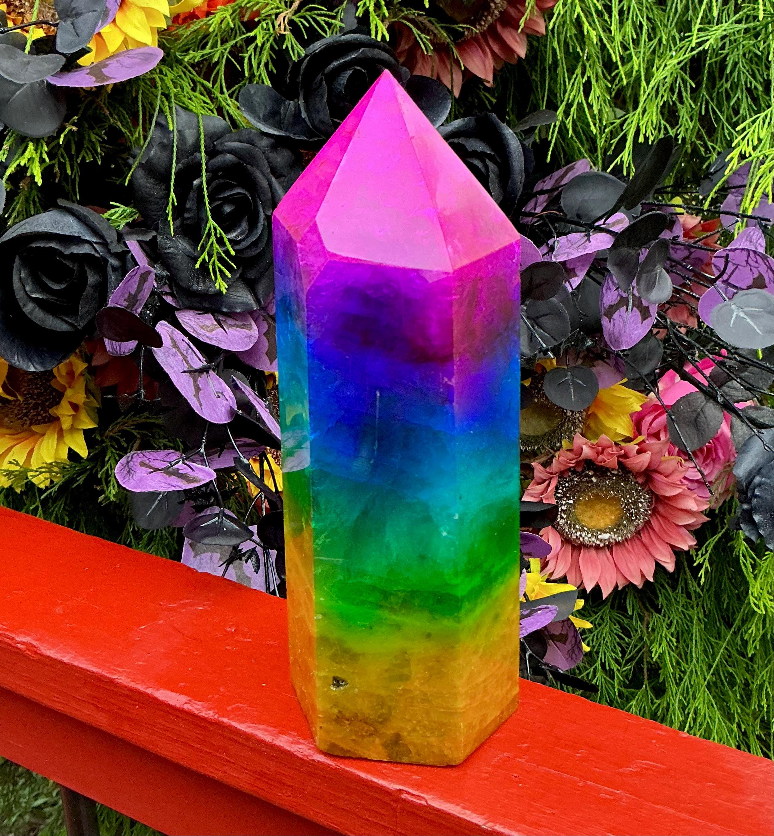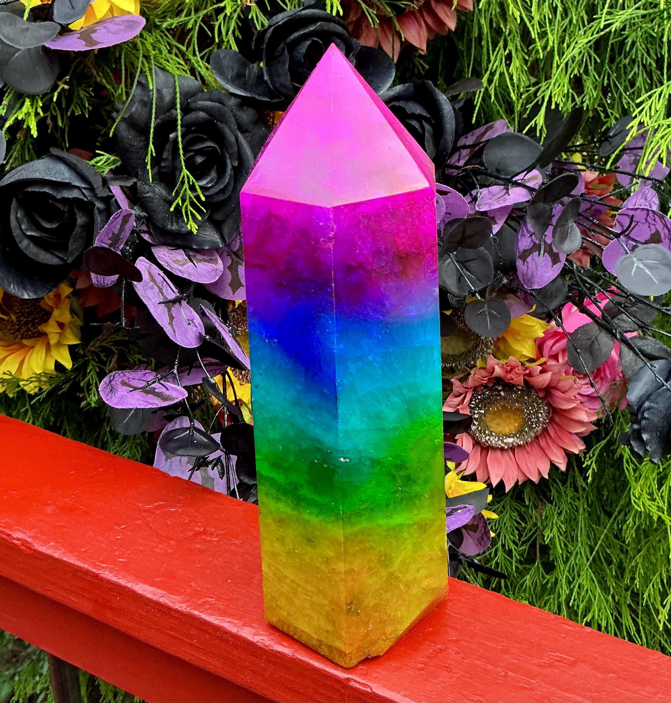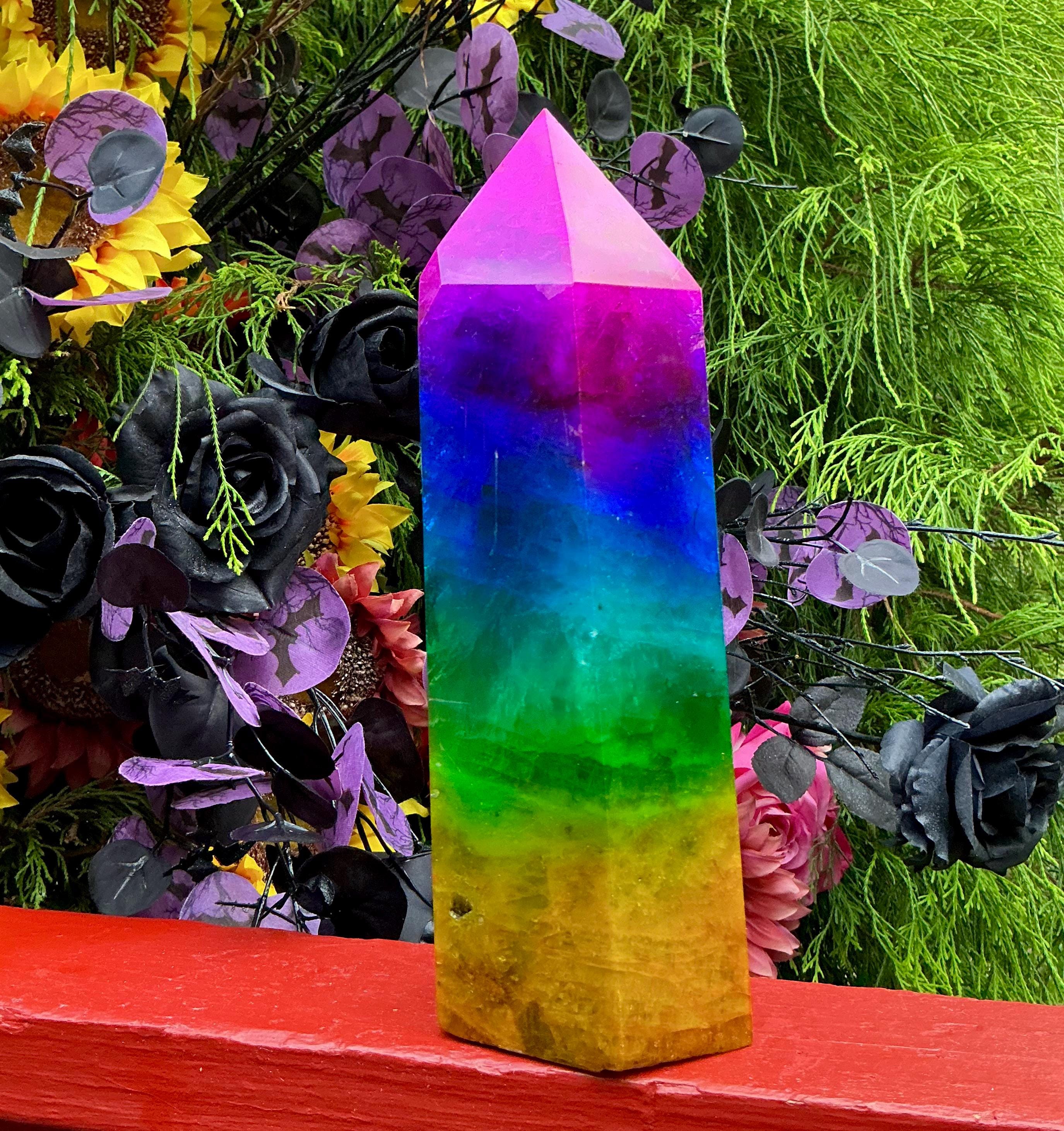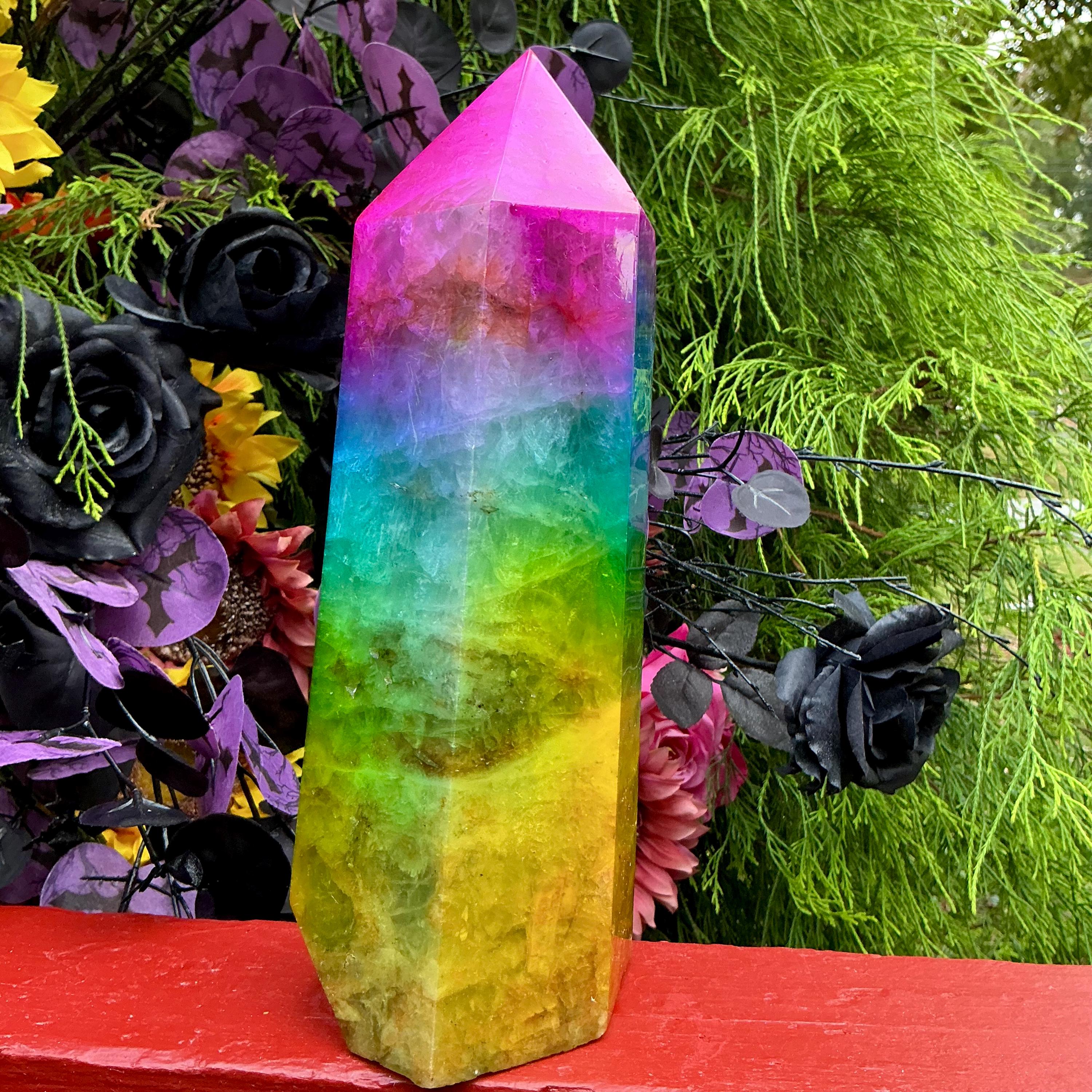 Rainbow Aura Fluorite Crystal Generator ~ 10 lb. ~ 10" Tall Tower ~ Colorful Pink Blue Green Yellow Color ~ Fast & Free Shipping, U.S.A.