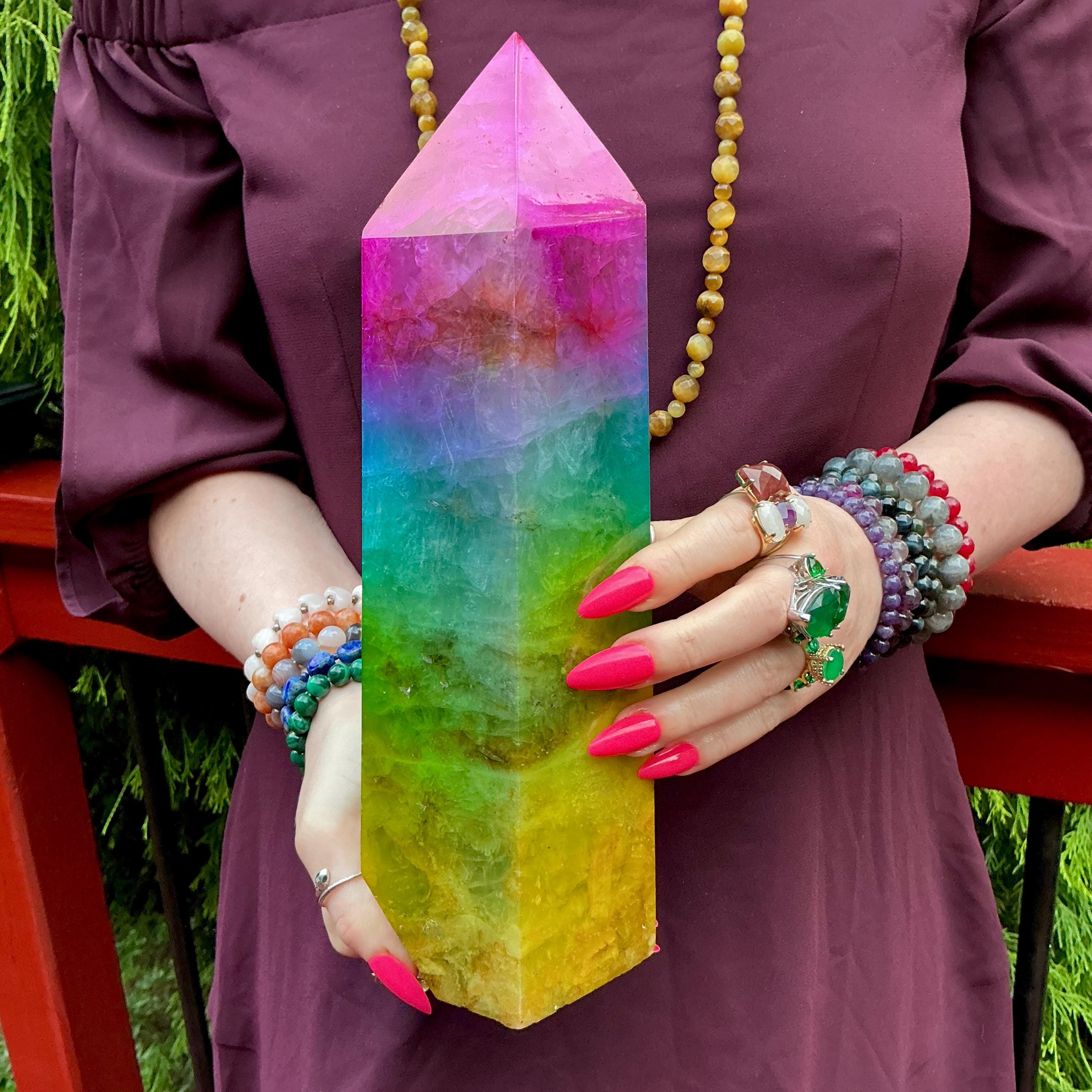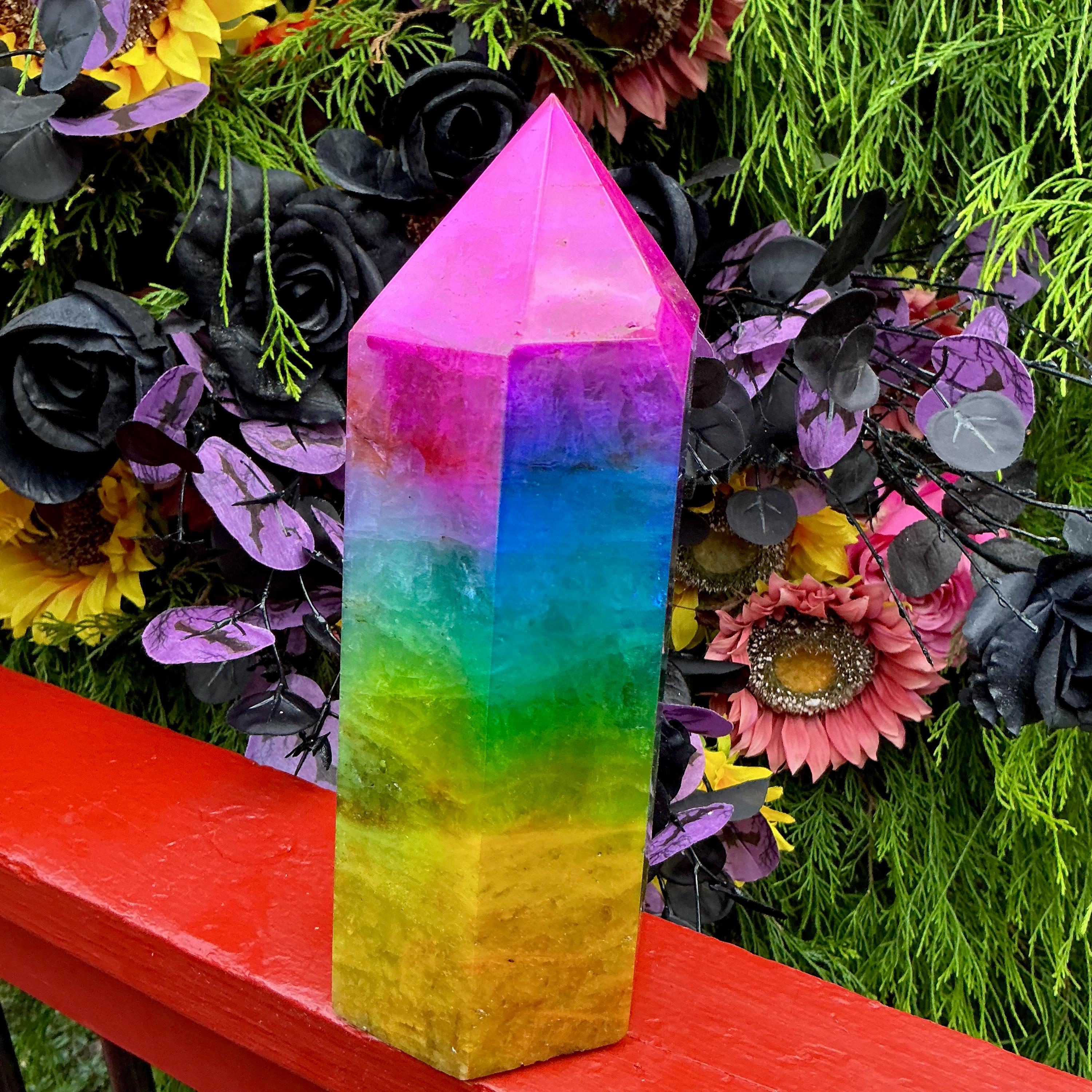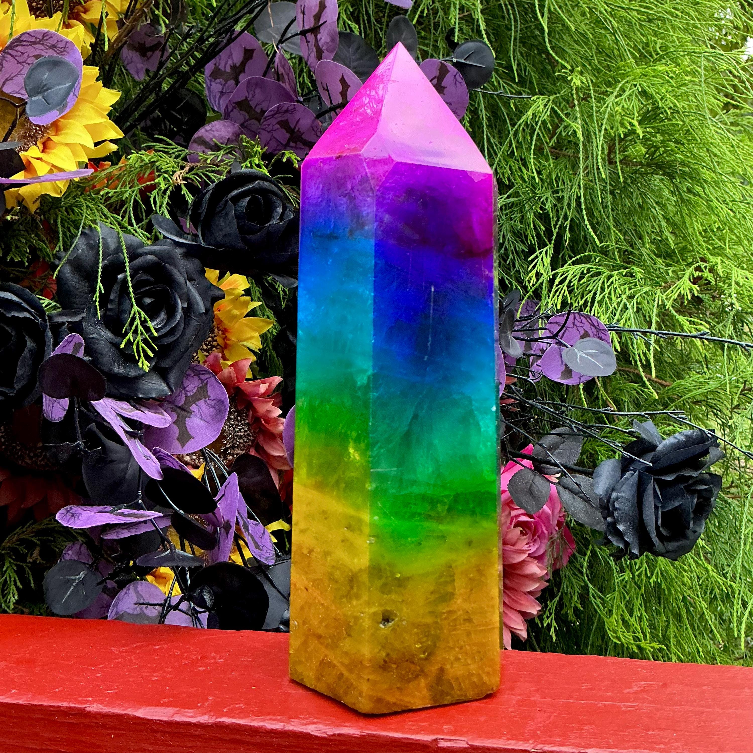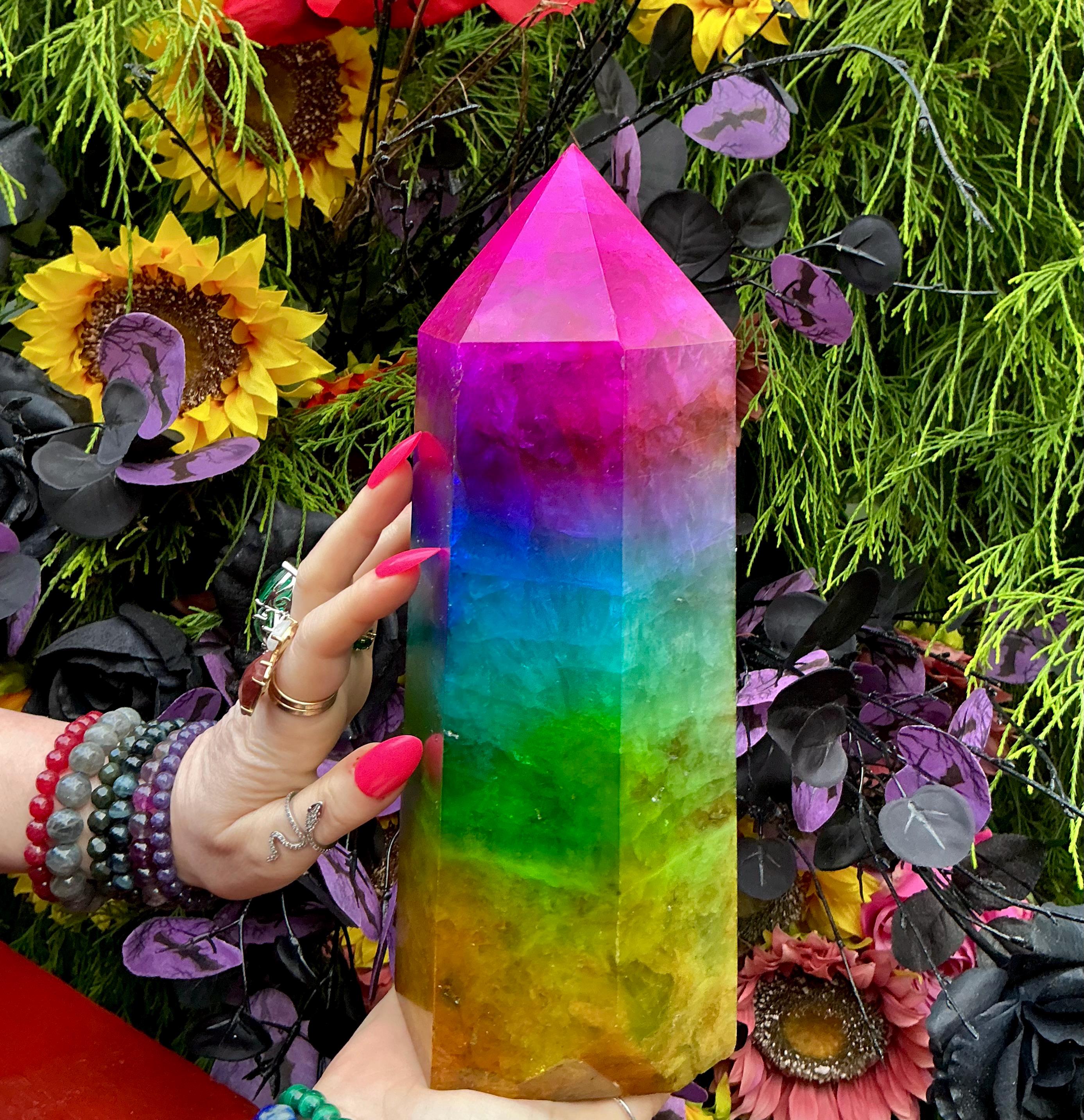 Rainbow Aura Fluorite Crystal Generator ~ 10 lb. ~ 10" Tall Tower ~ Colorful Pink Blue Green Yellow Color ~ Fast & Free Shipping, U.S.A.