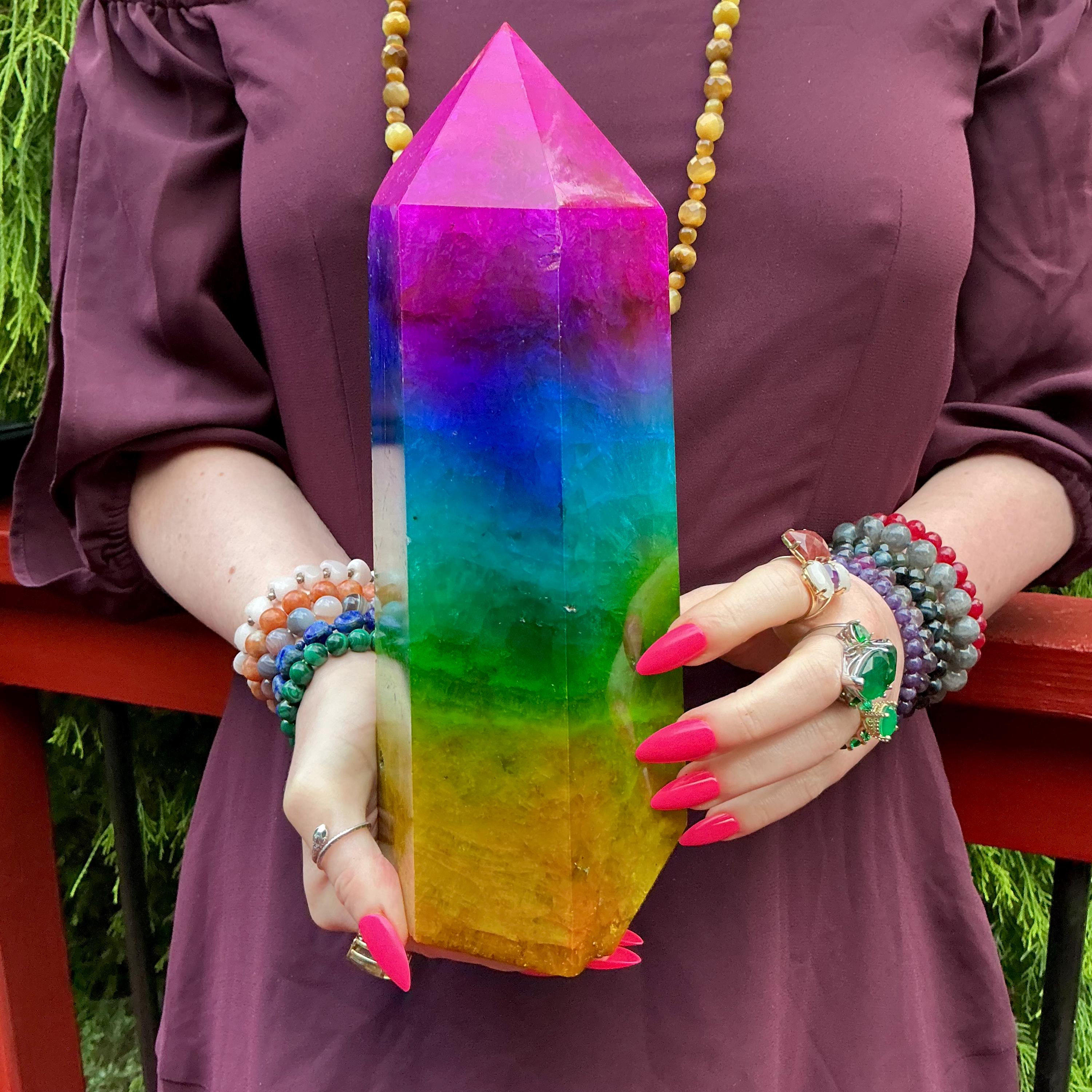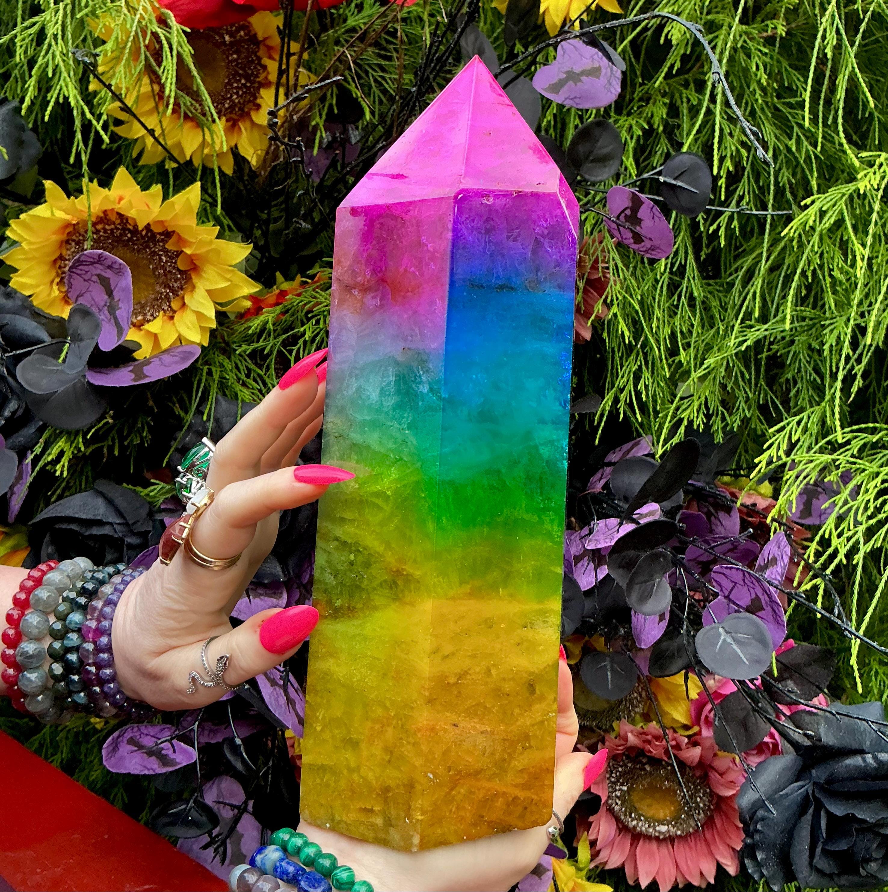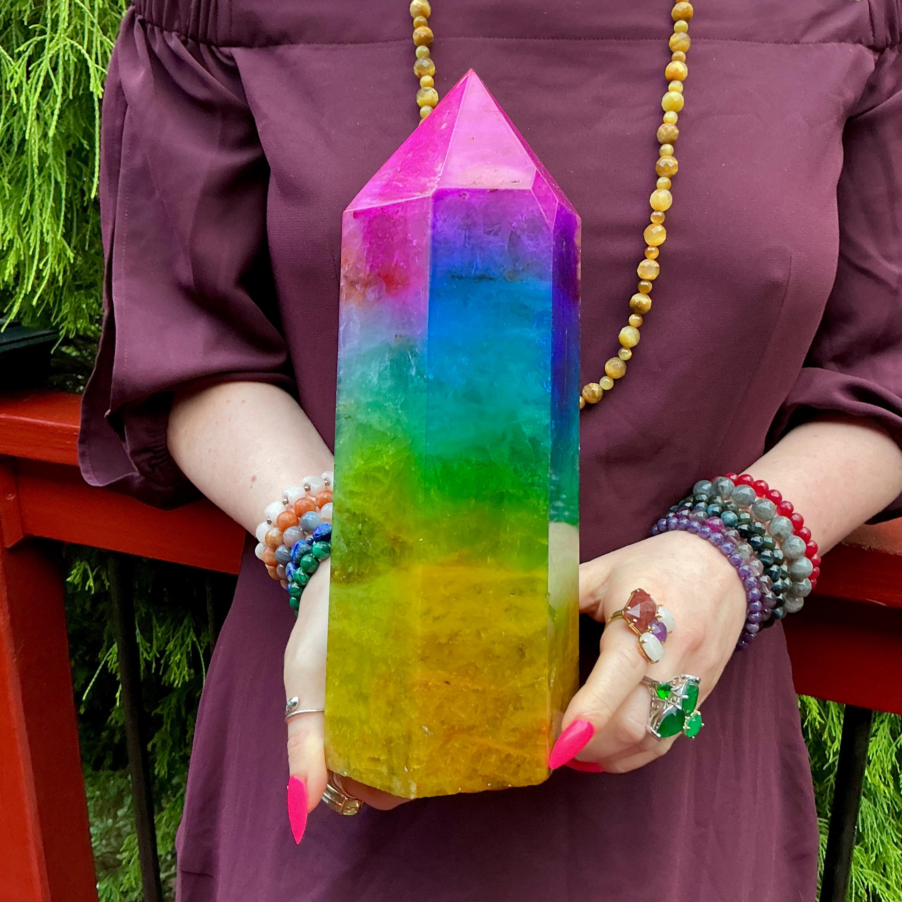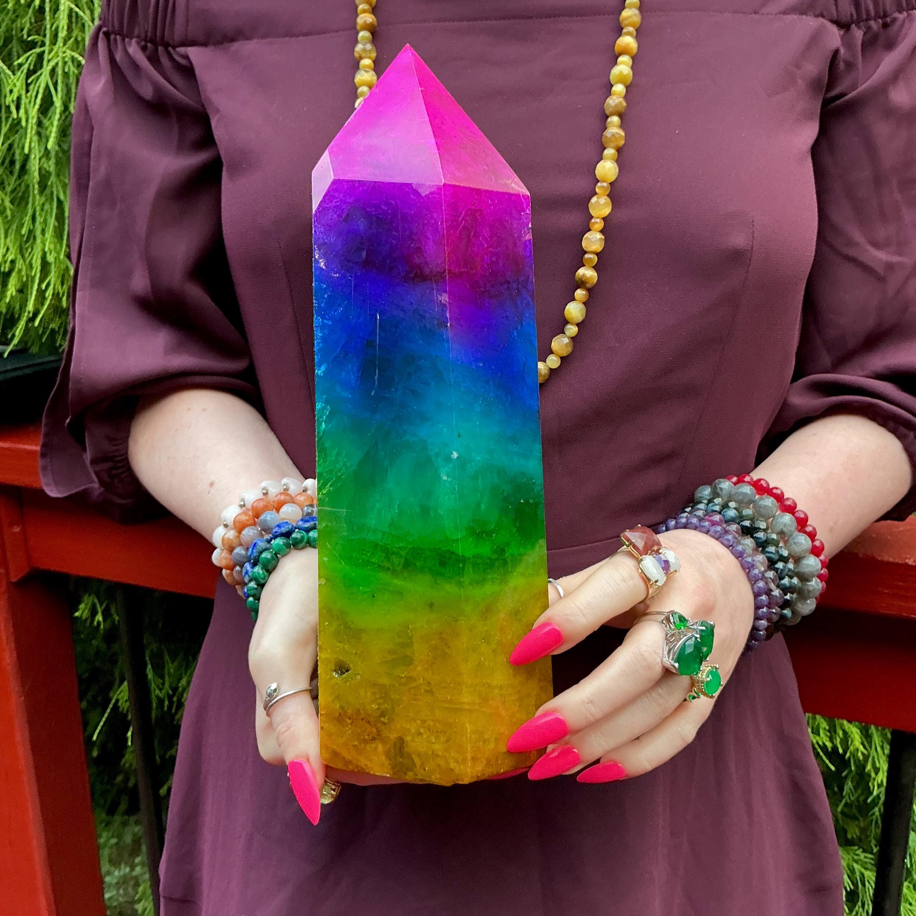 Rainbow Aura Fluorite Crystal Generator ~ 10 lb. ~ 10" Tall Tower ~ Colorful Pink Blue Green Yellow Color ~ Fast & Free Shipping, U.S.A.