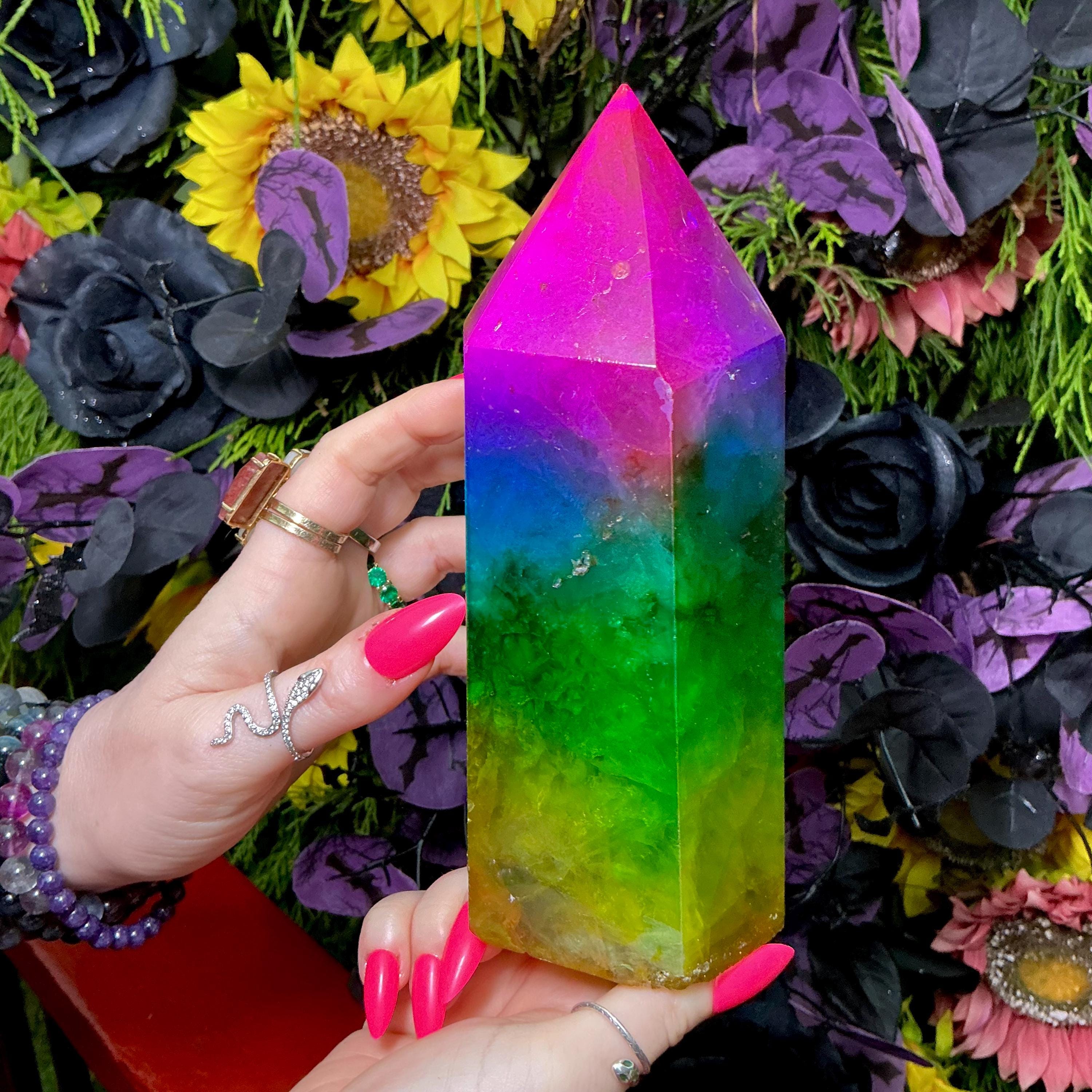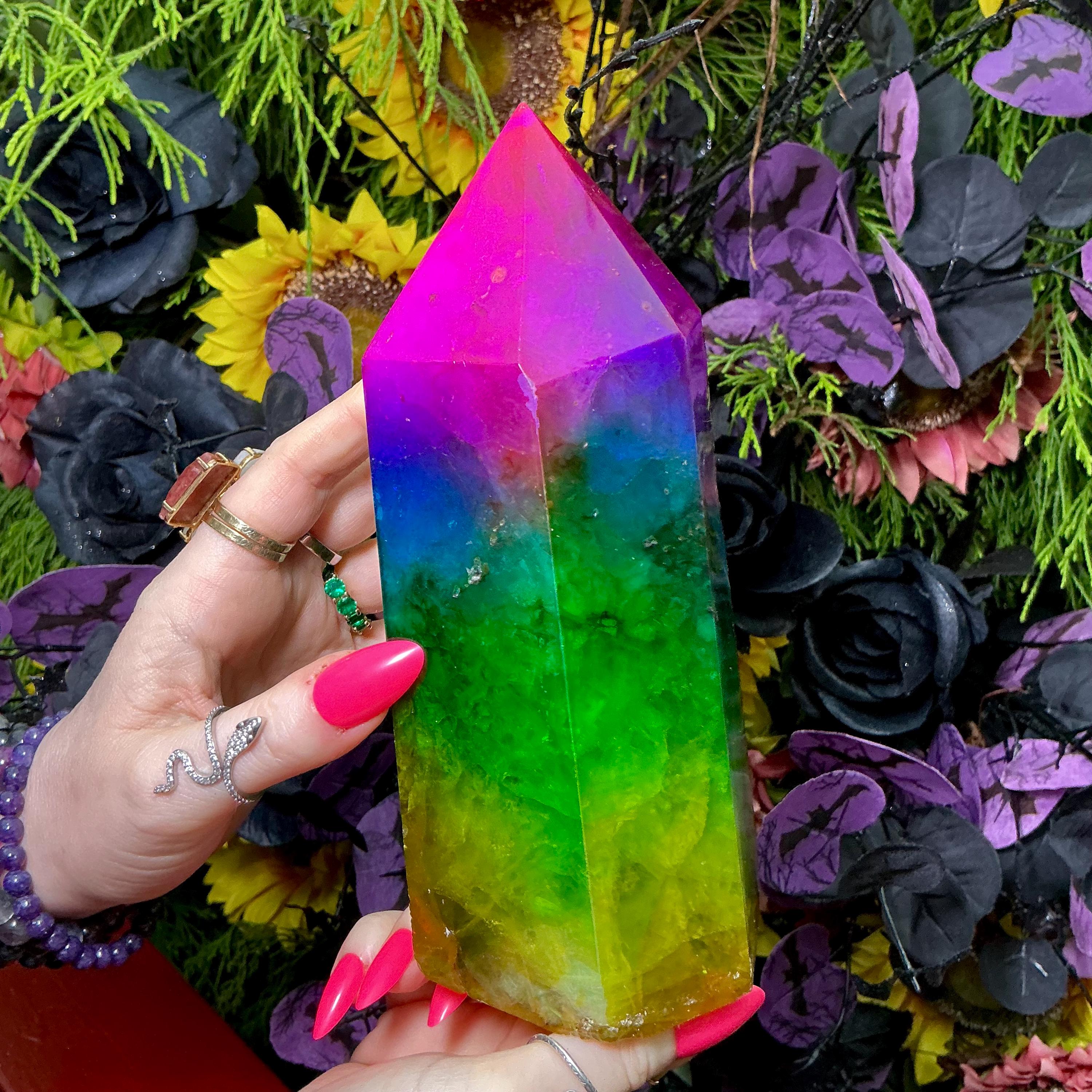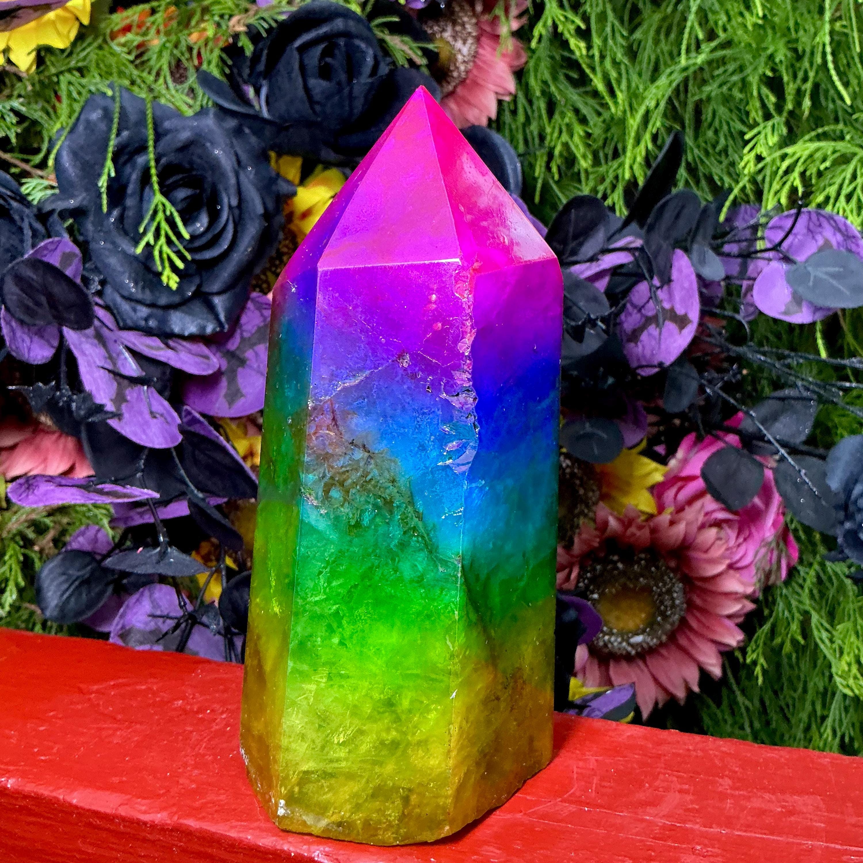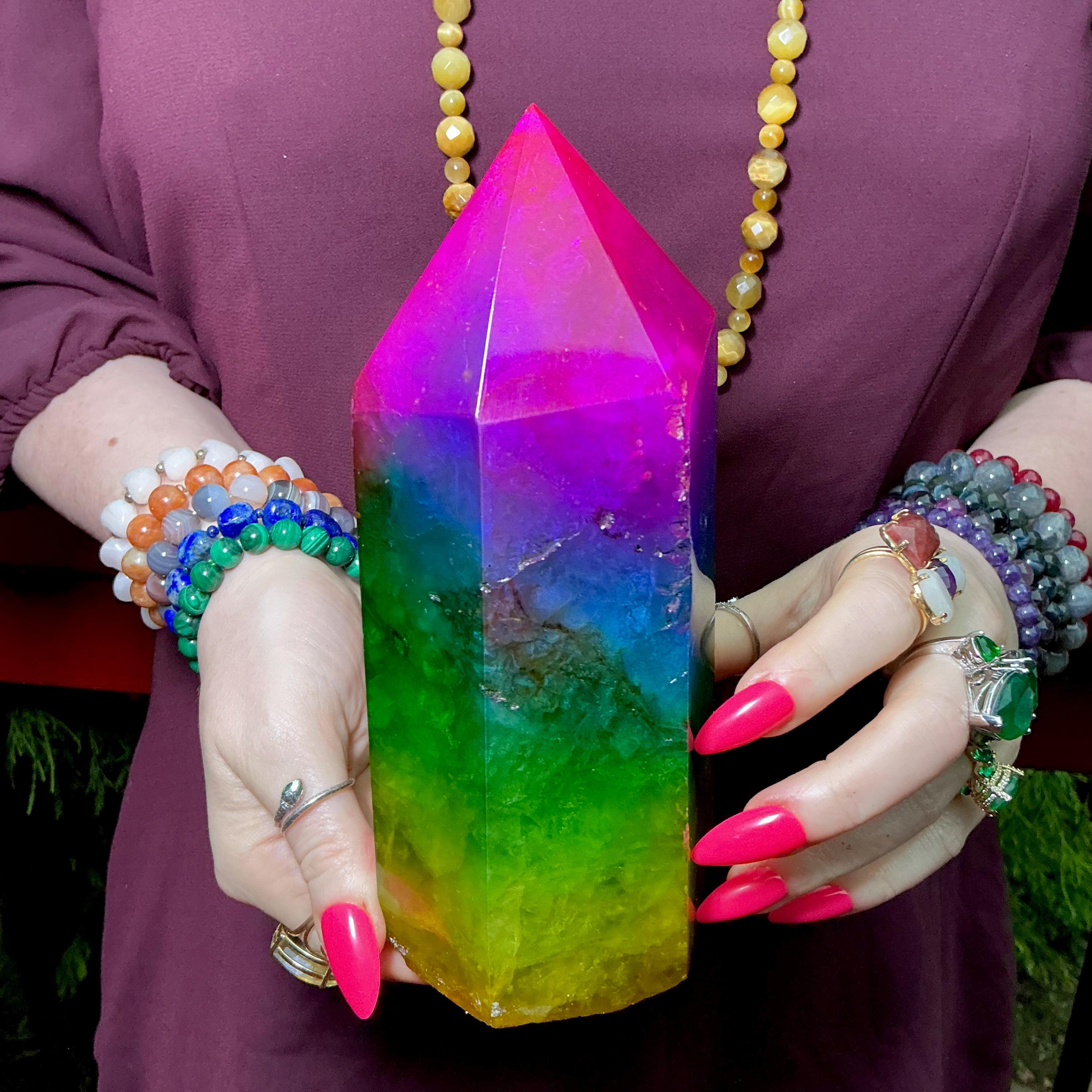 Rainbow Aura Fluorite Crystal Generator ~ 4 lb. 6 oz.~ 7 1/2" Tall Tower ~ Colorful Pink Blue Green Yellow Color ~ Fast Free Shipping U.S.A.