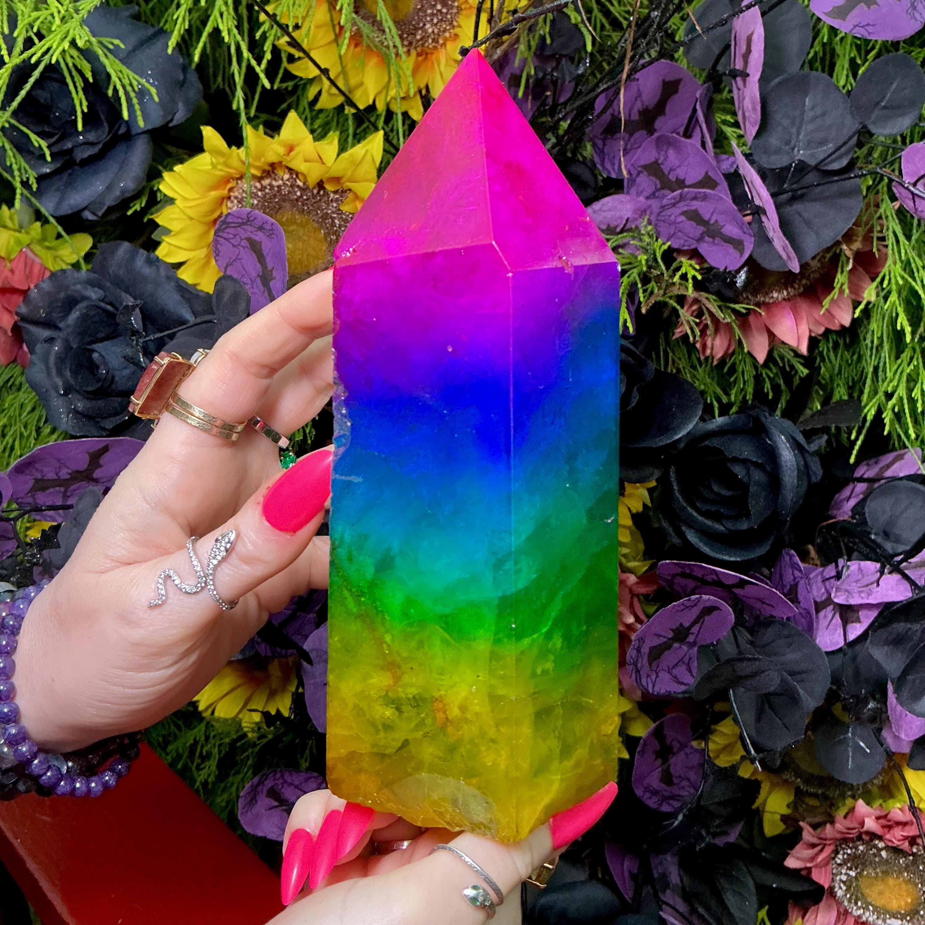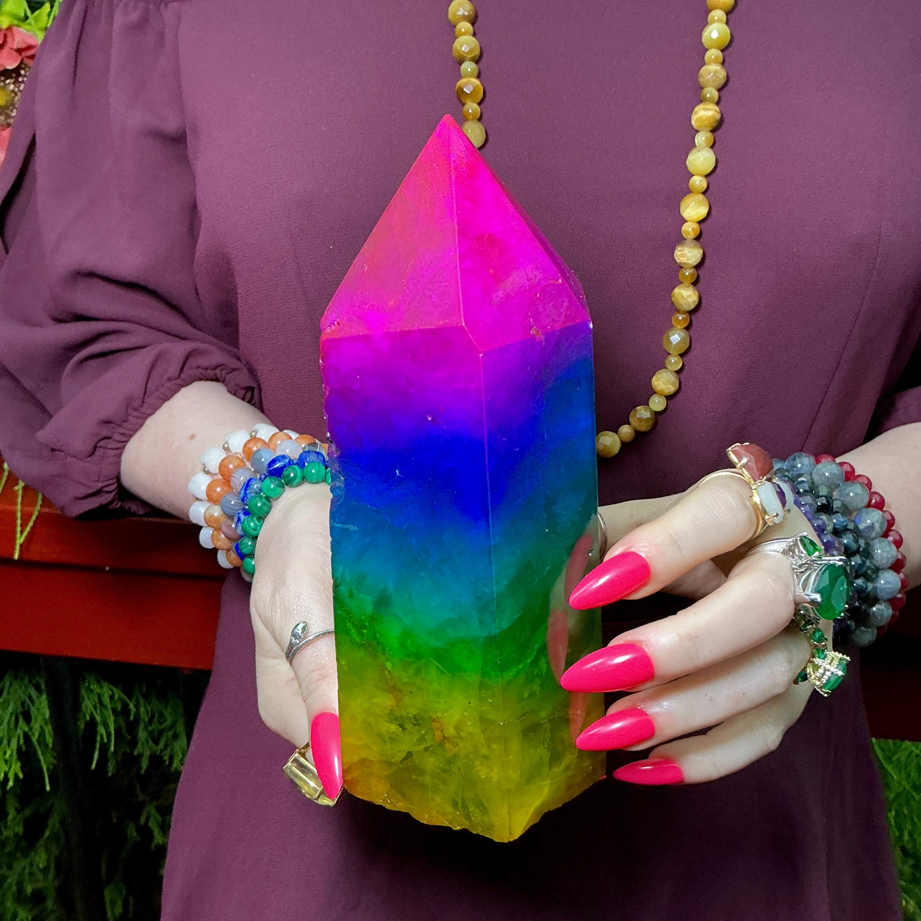 This massive, Vivid Hot Pink, Blue, Green, Yellow Rainbow Aura Crystal Fluorite has major wow factor!