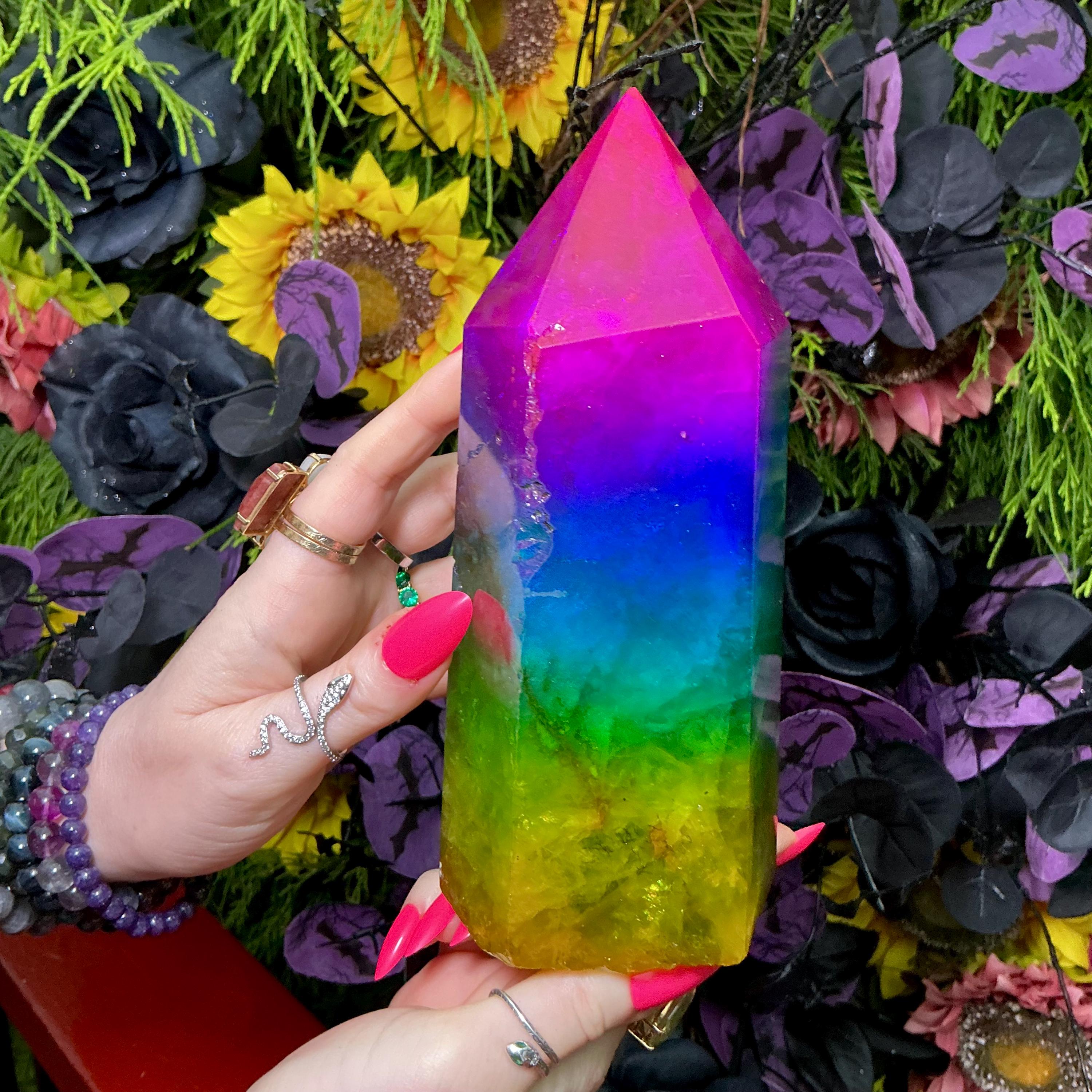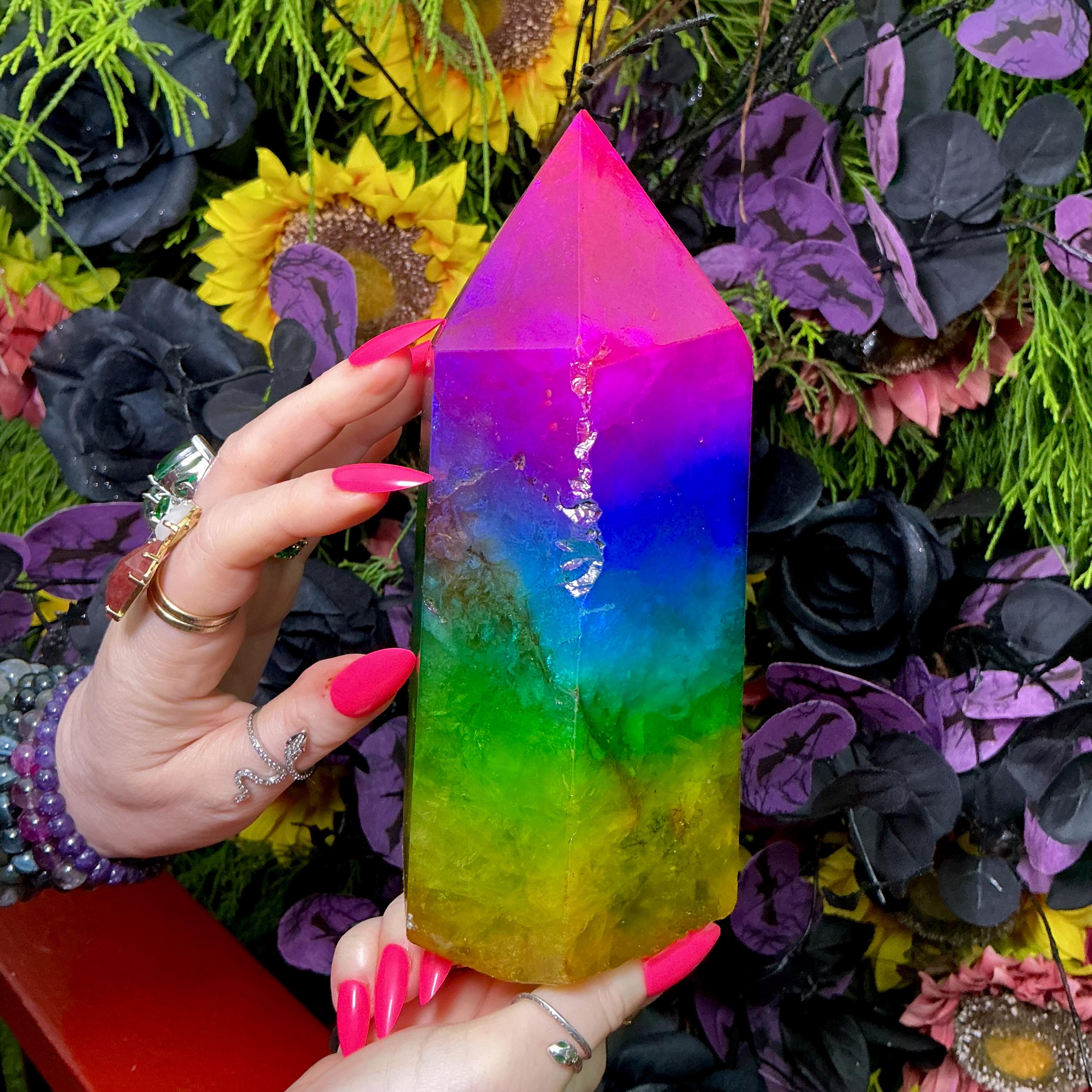 You will love the large size of this Rainbow Aura Fluorite Crystal Generator with a touch of an industrial flair, so beautiful and cool.
