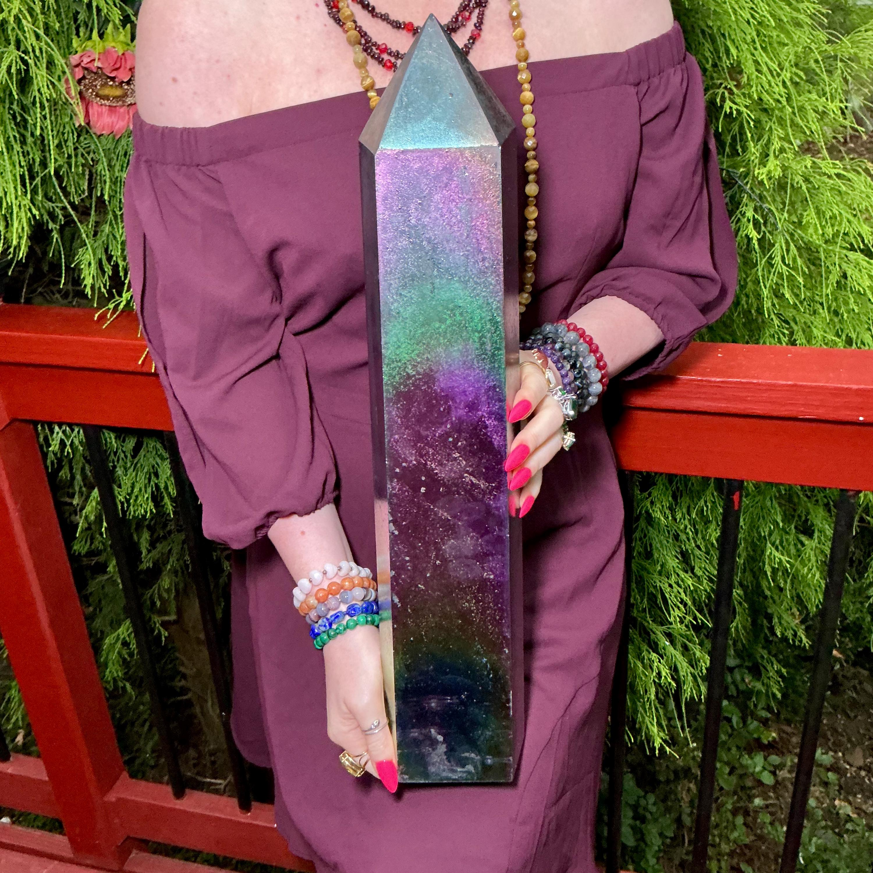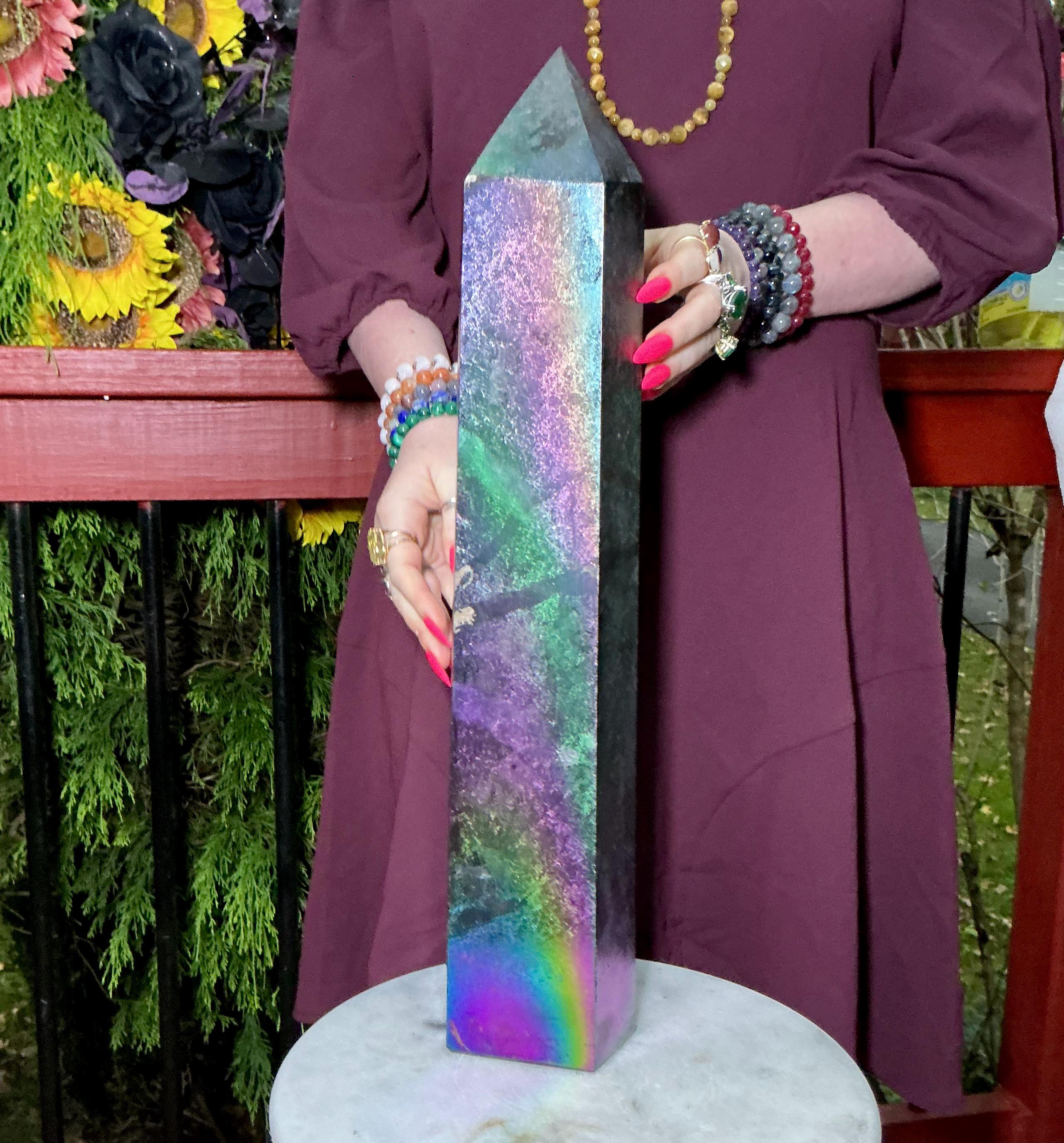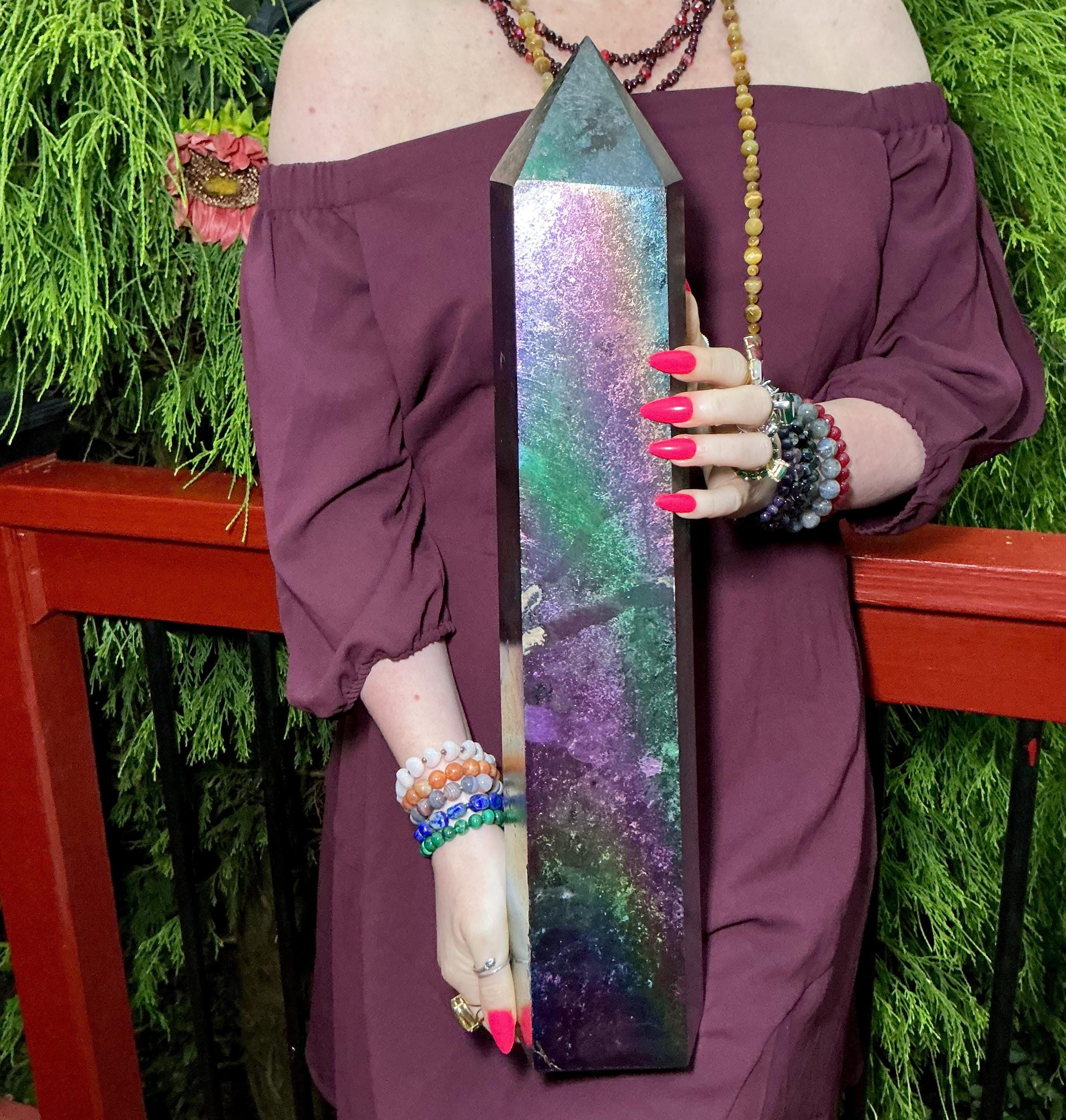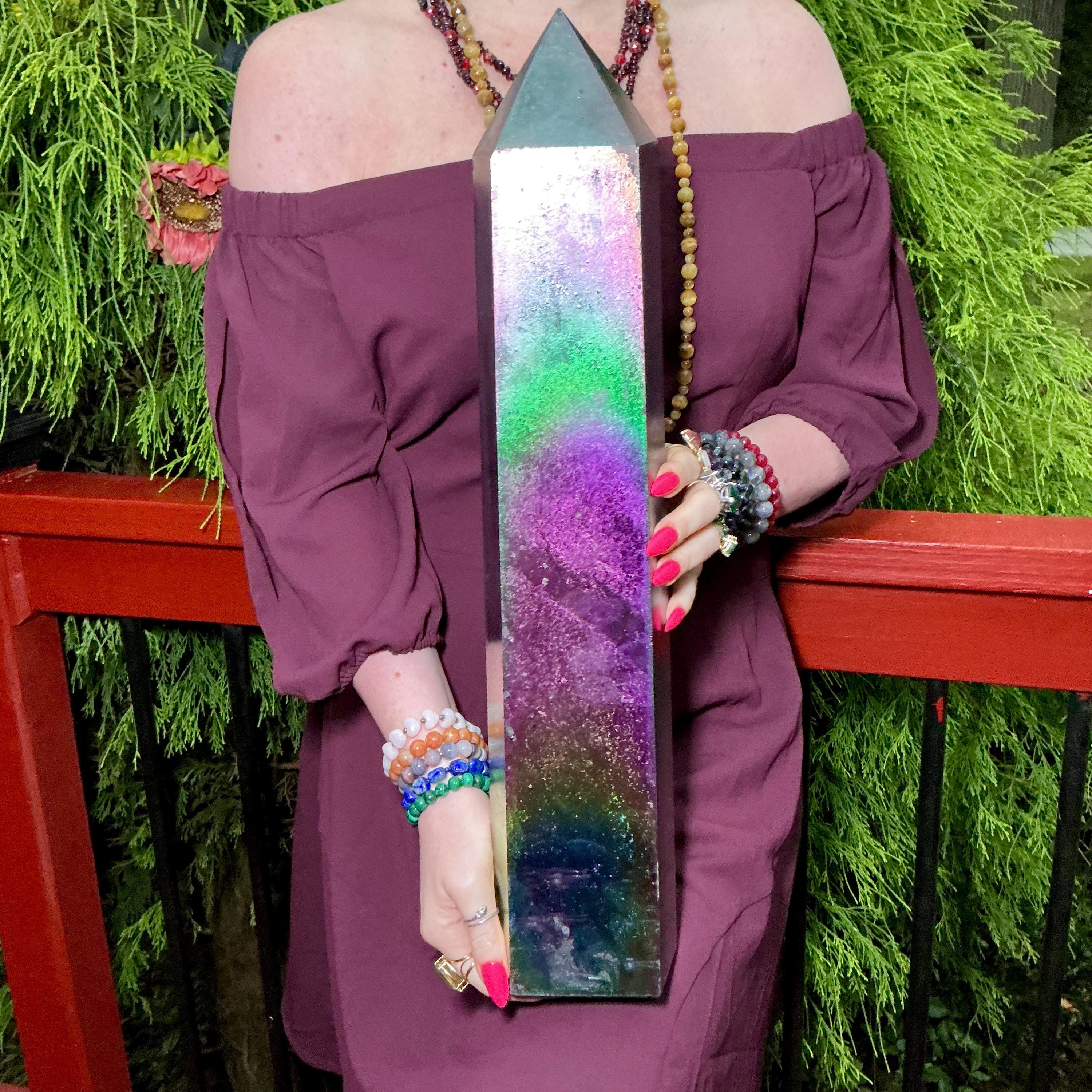 Aura Shungite Crystal Generator ~ Large 25 Lb. ~ 21" Tall Tower ~ Rainbow Colors ~ Pink, Blue, Green, Yellow ~ Fast & Free Shipping from USA