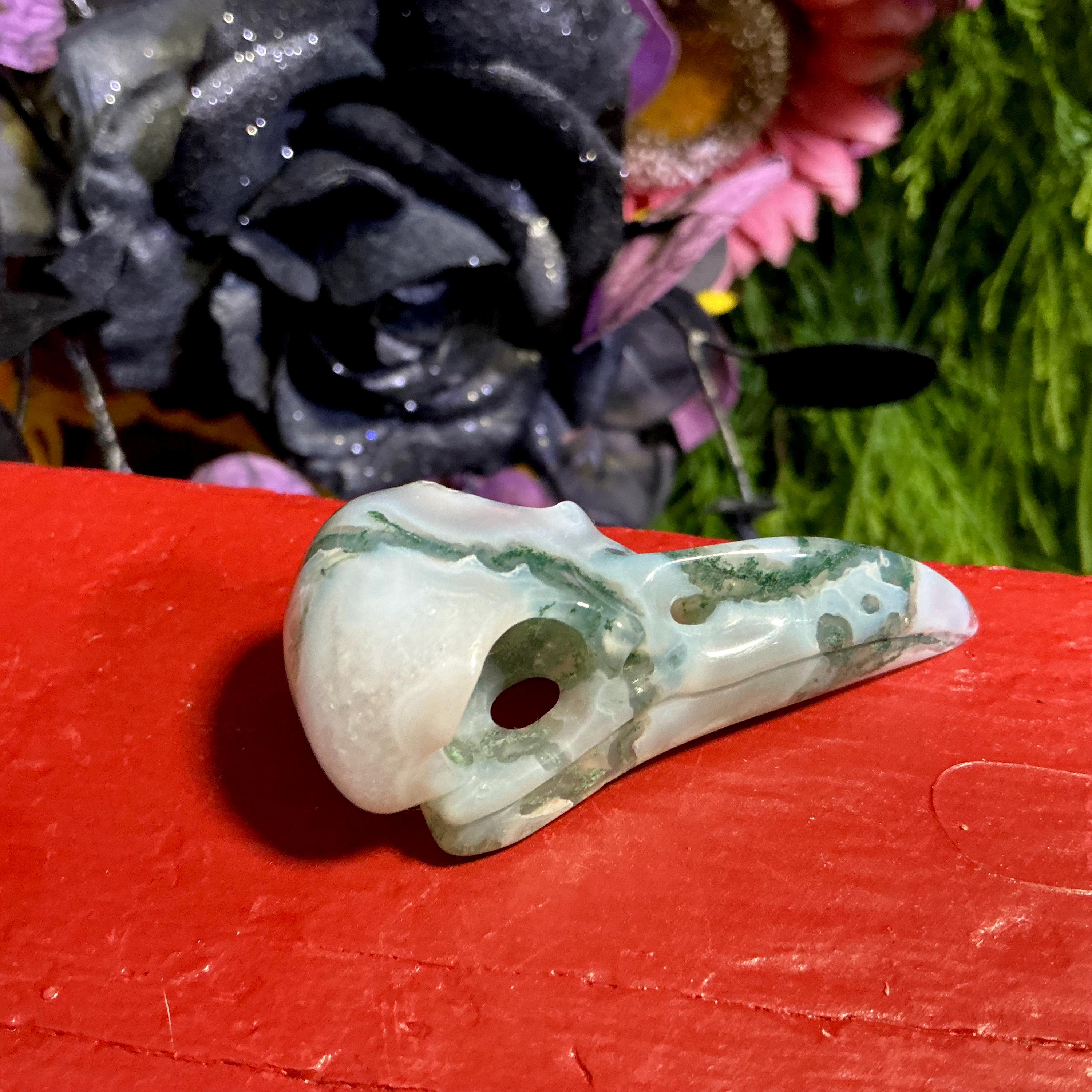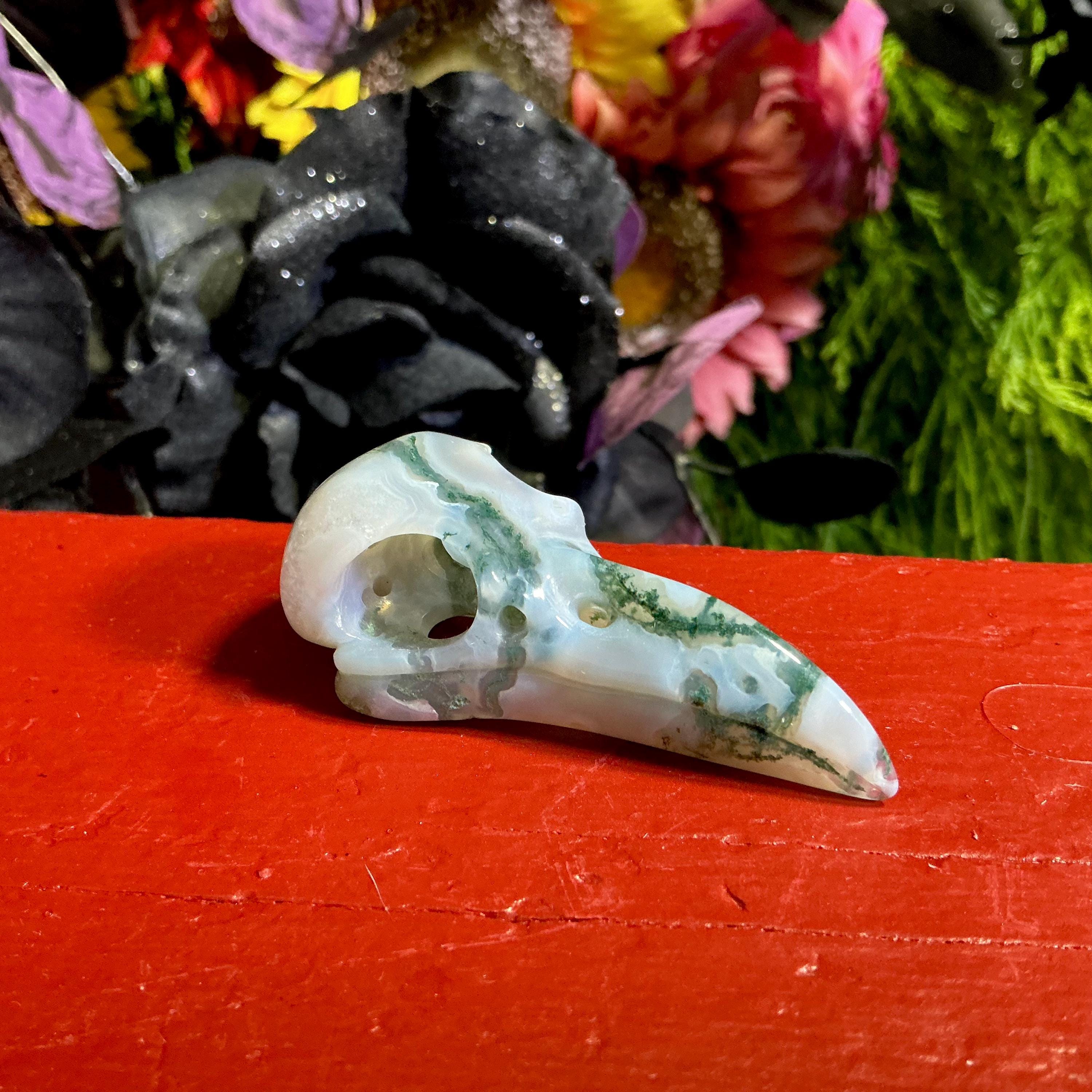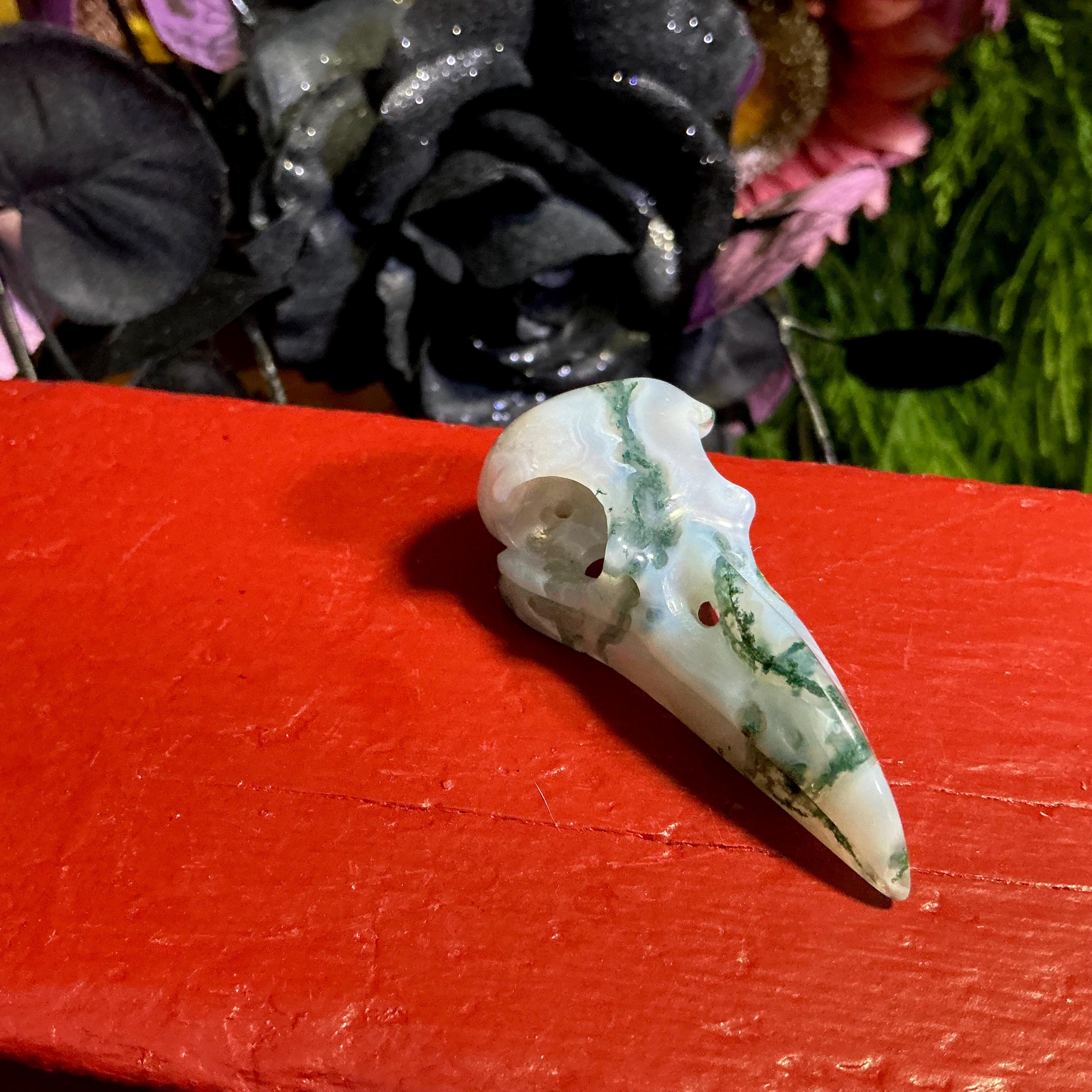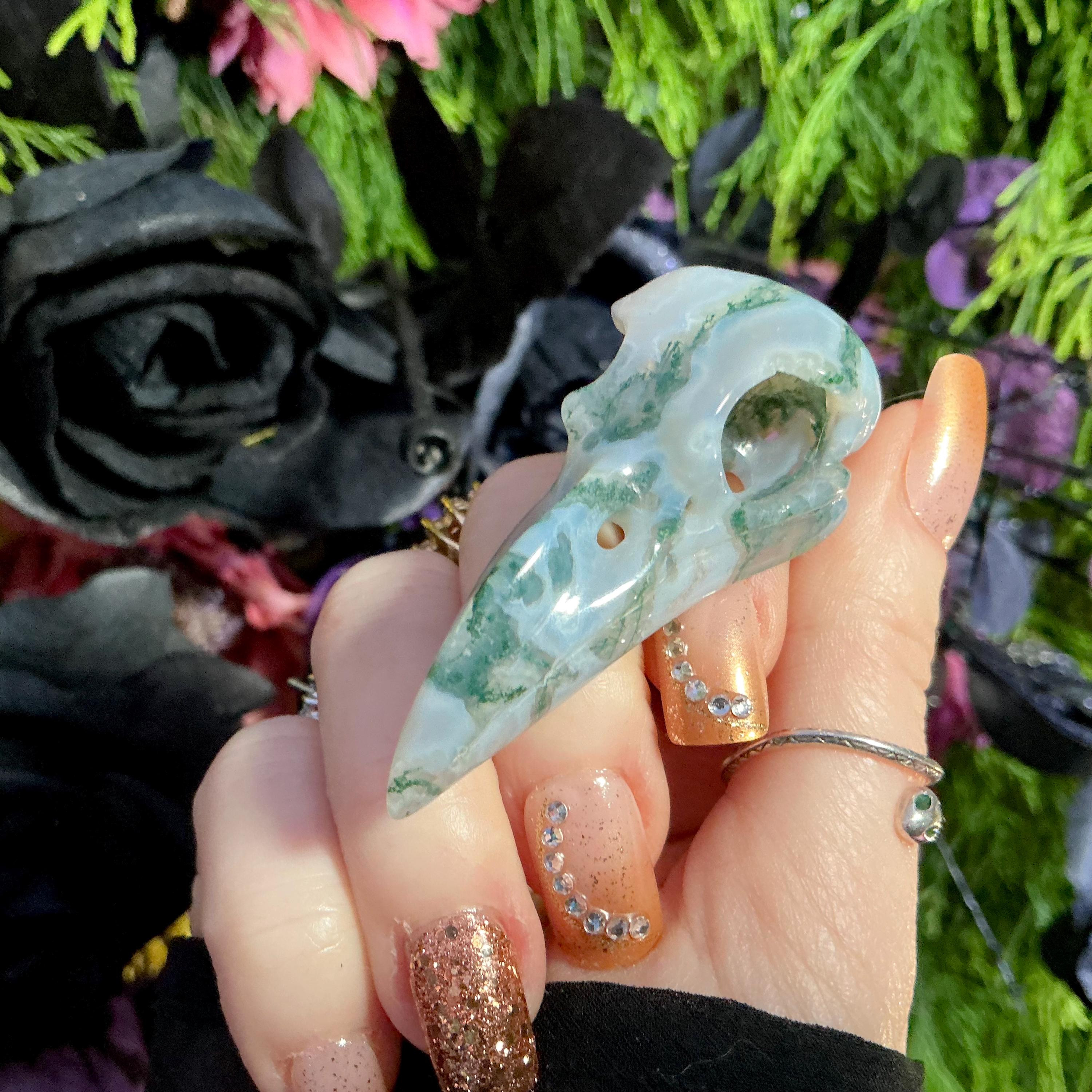 Moss Agate Raven Skull Carving Large ~ 2" Long ~ Pendant Necklace ~ Hand Carved One-of-a-Kind Sculpture ~ Natural Crystal ~ Goth Bird