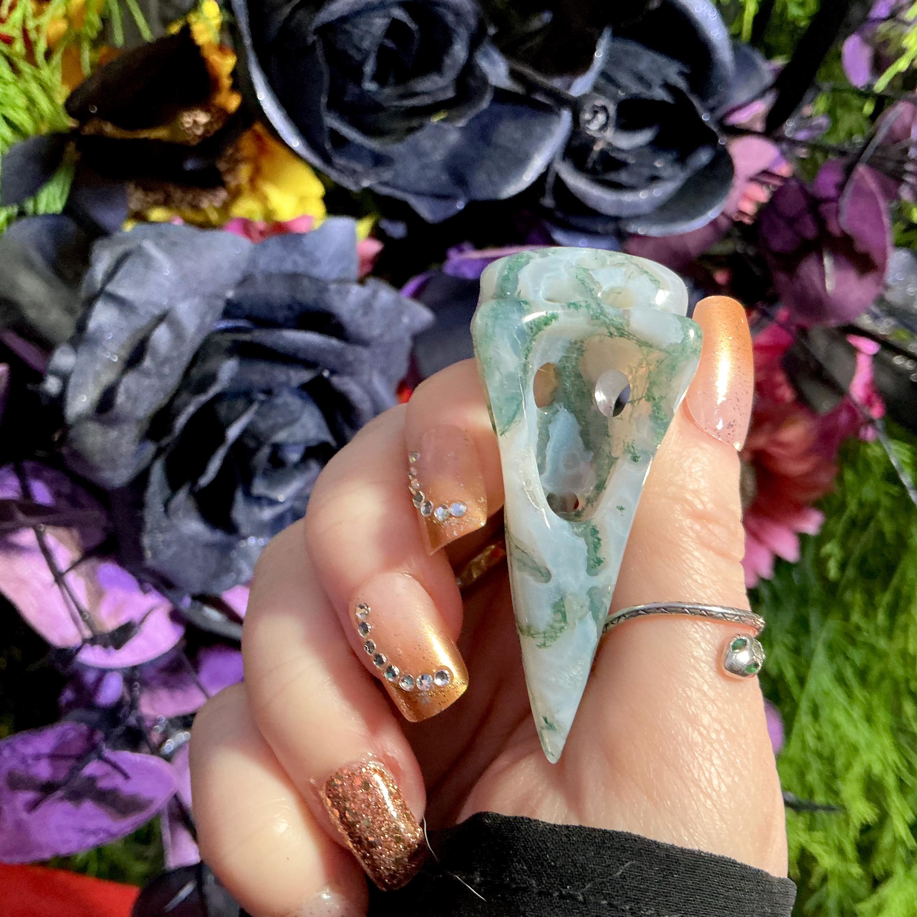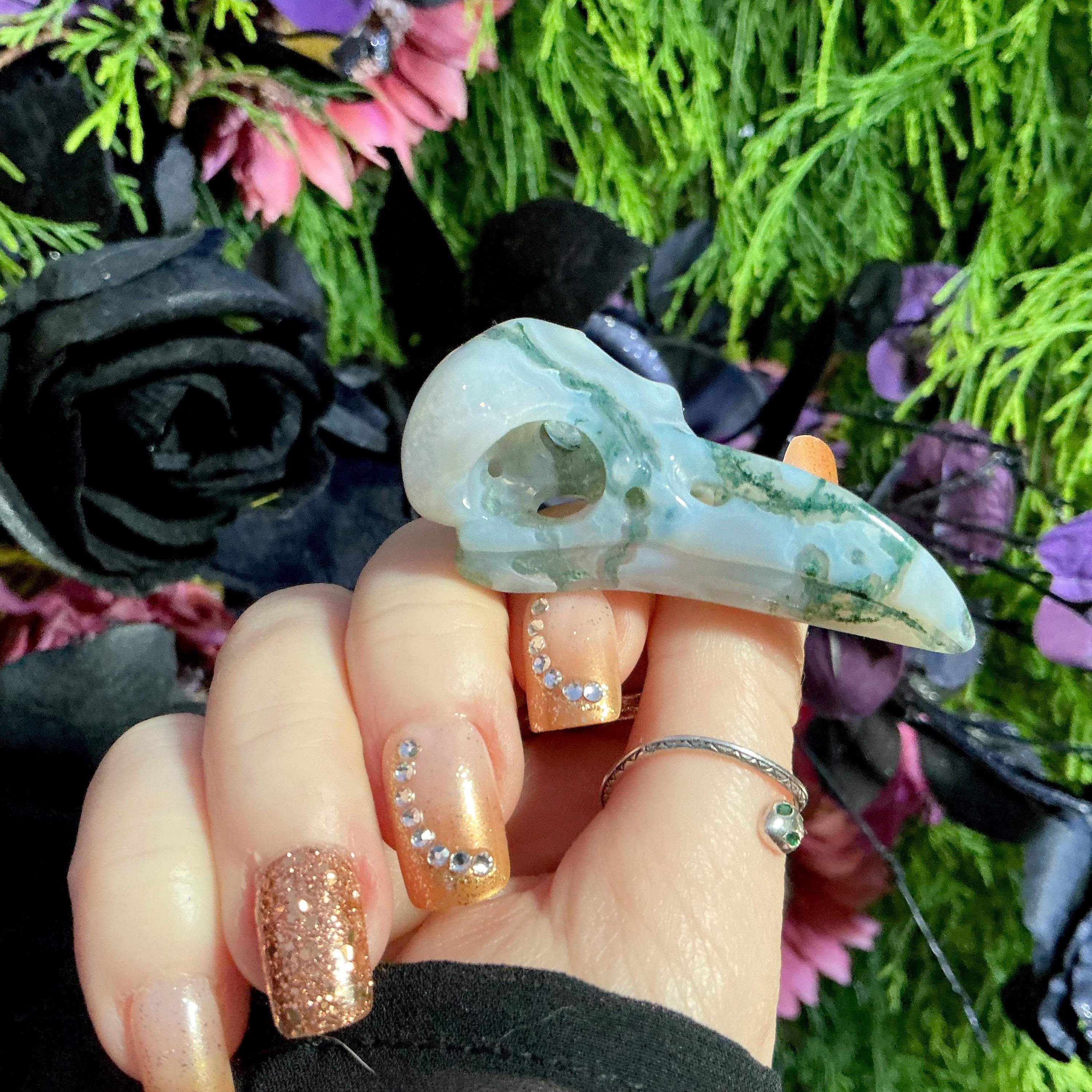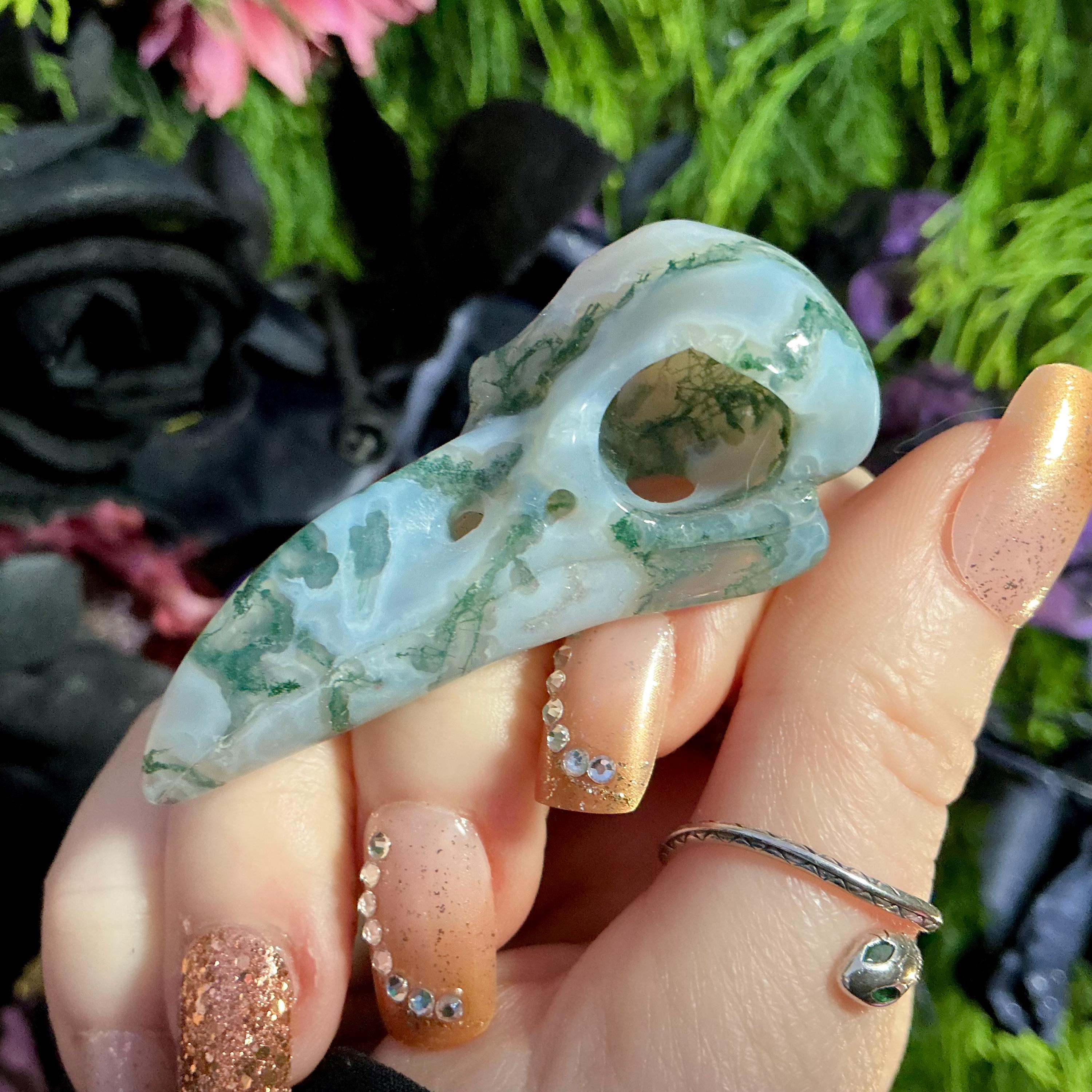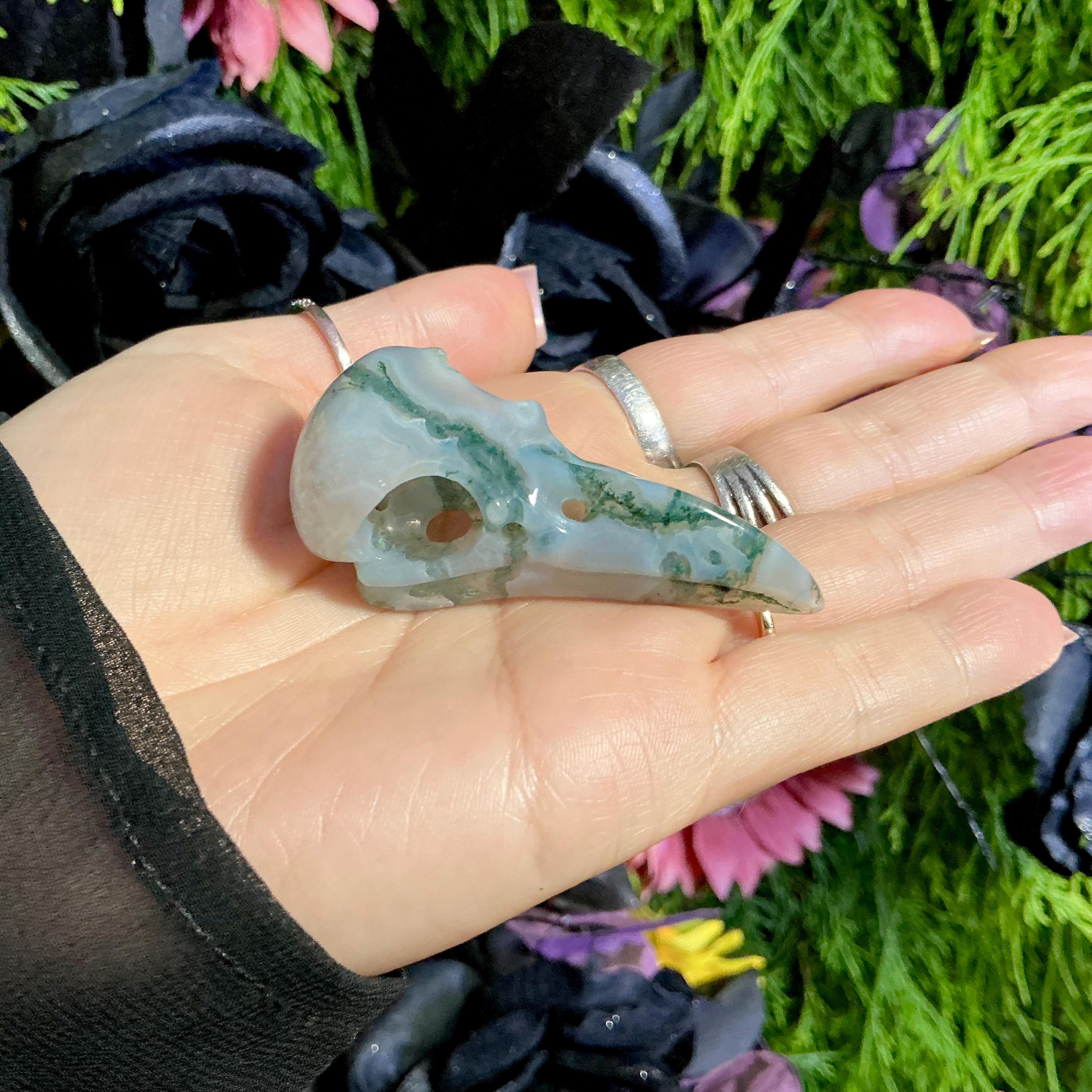 Moss Agate Raven Skull Carving Large ~ 2" Long ~ Pendant Necklace ~ Hand Carved One-of-a-Kind Sculpture ~ Natural Crystal ~ Goth Bird