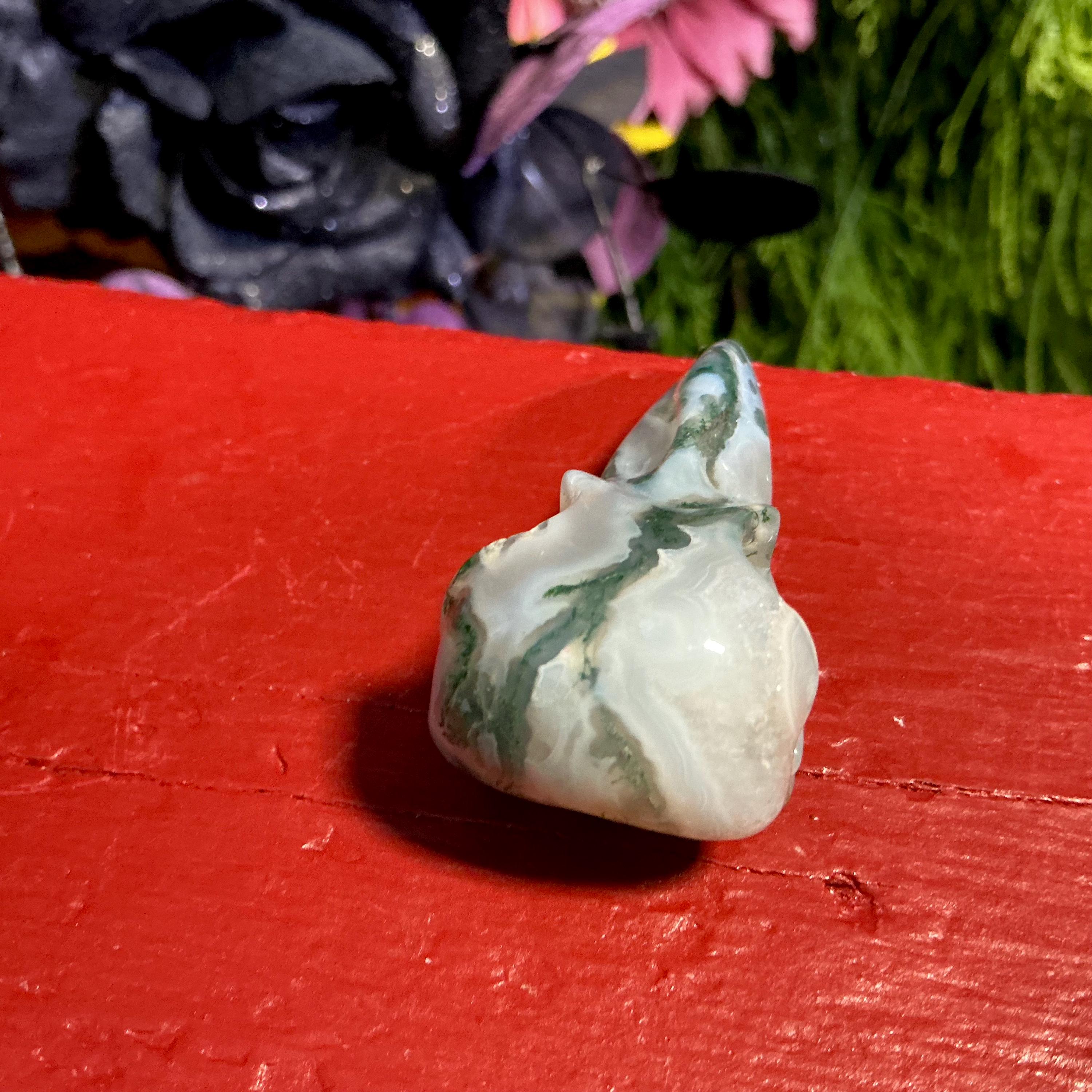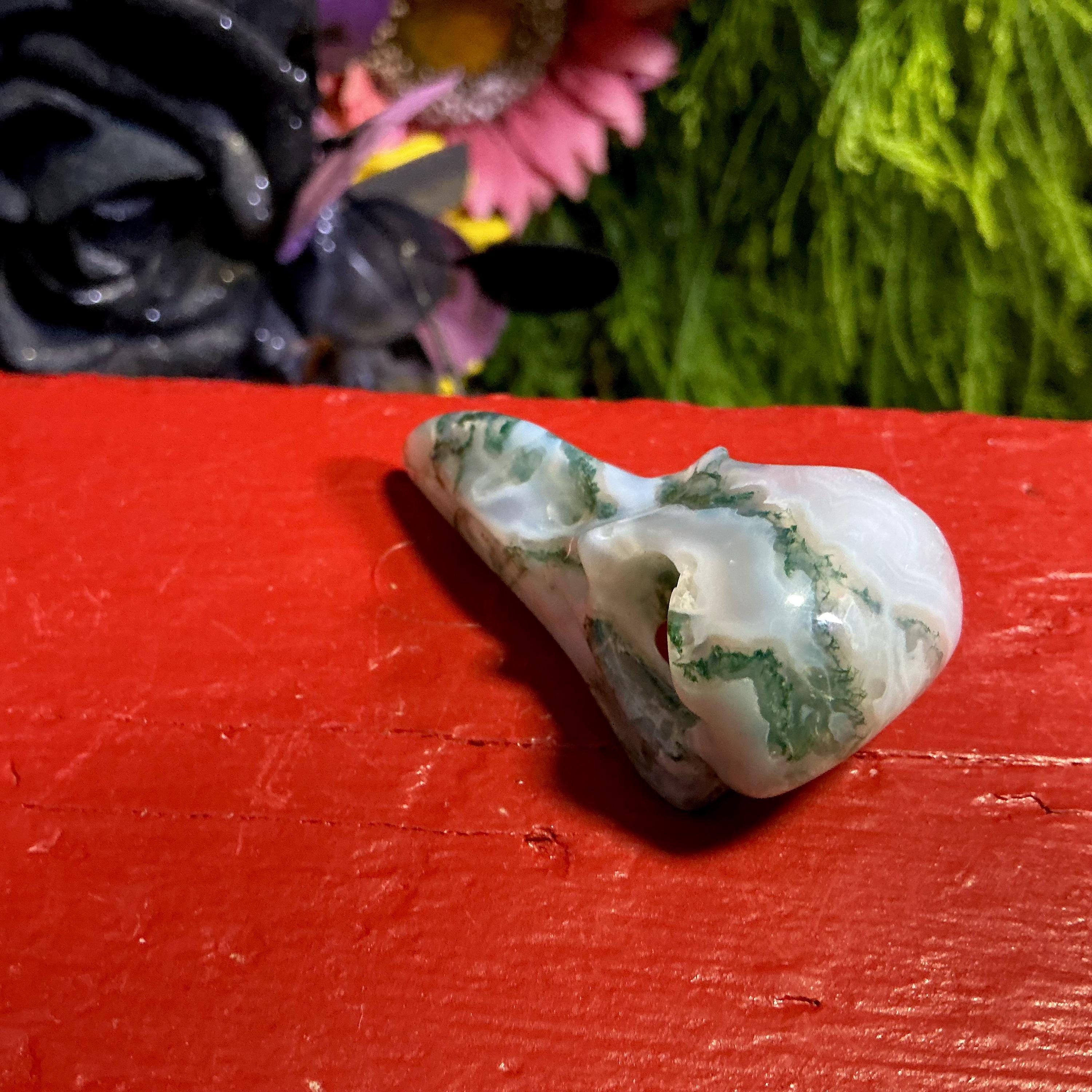 This Moss Green Agate Raven skull sparkles and shines with ancient sparkling crystal inclusions deep within that give you a look into this crystals soul making it a one-of-a-kind skull.