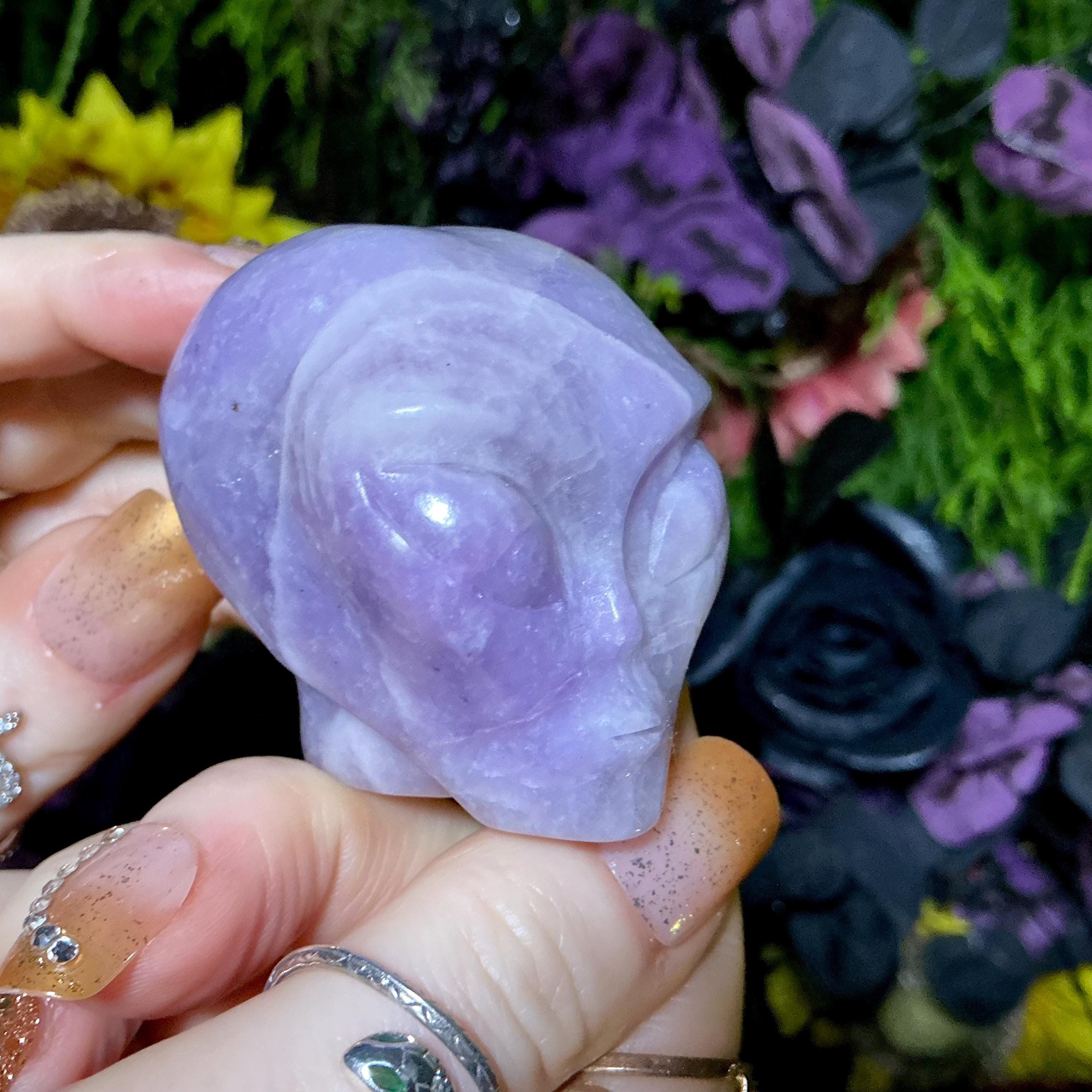 This beautiful Lepidolite Alien skull is a self-standing making it perfect for you display or your altar.