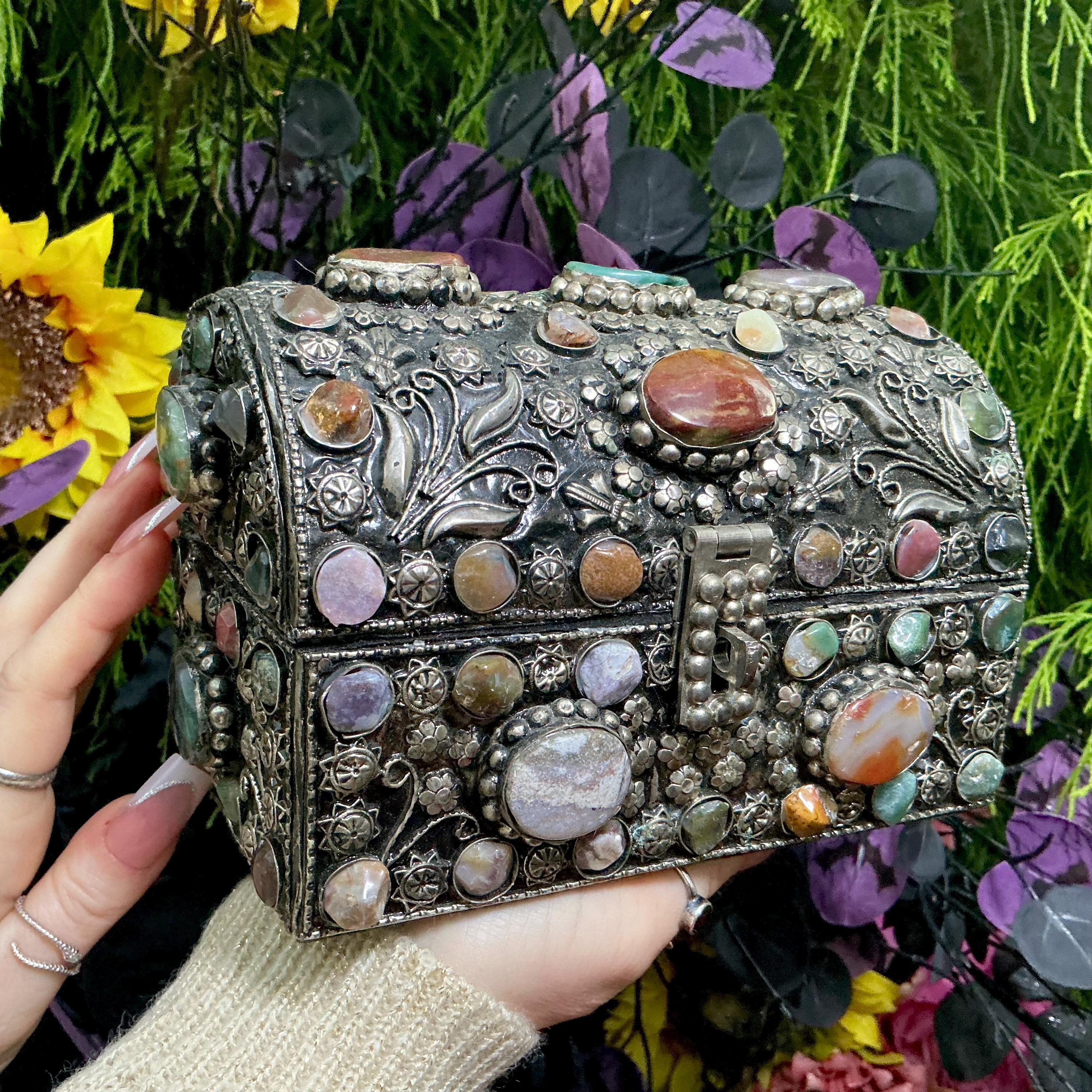 The Vintage Moroccan jewelry box is inlaid with semi-precious agate stones and covered with silvered metal filigree.