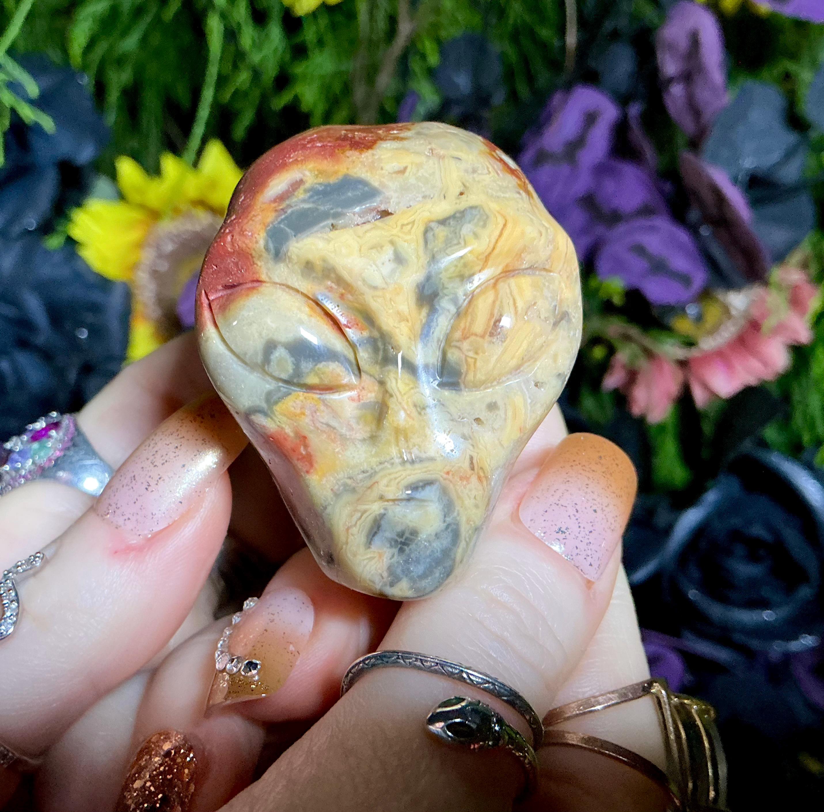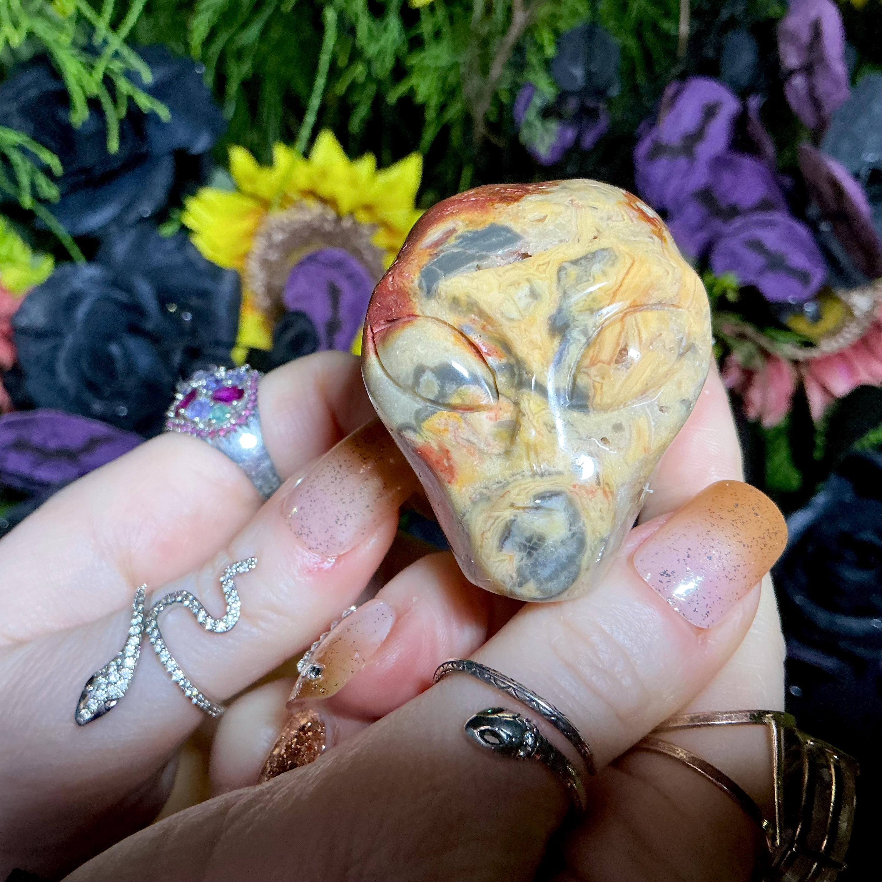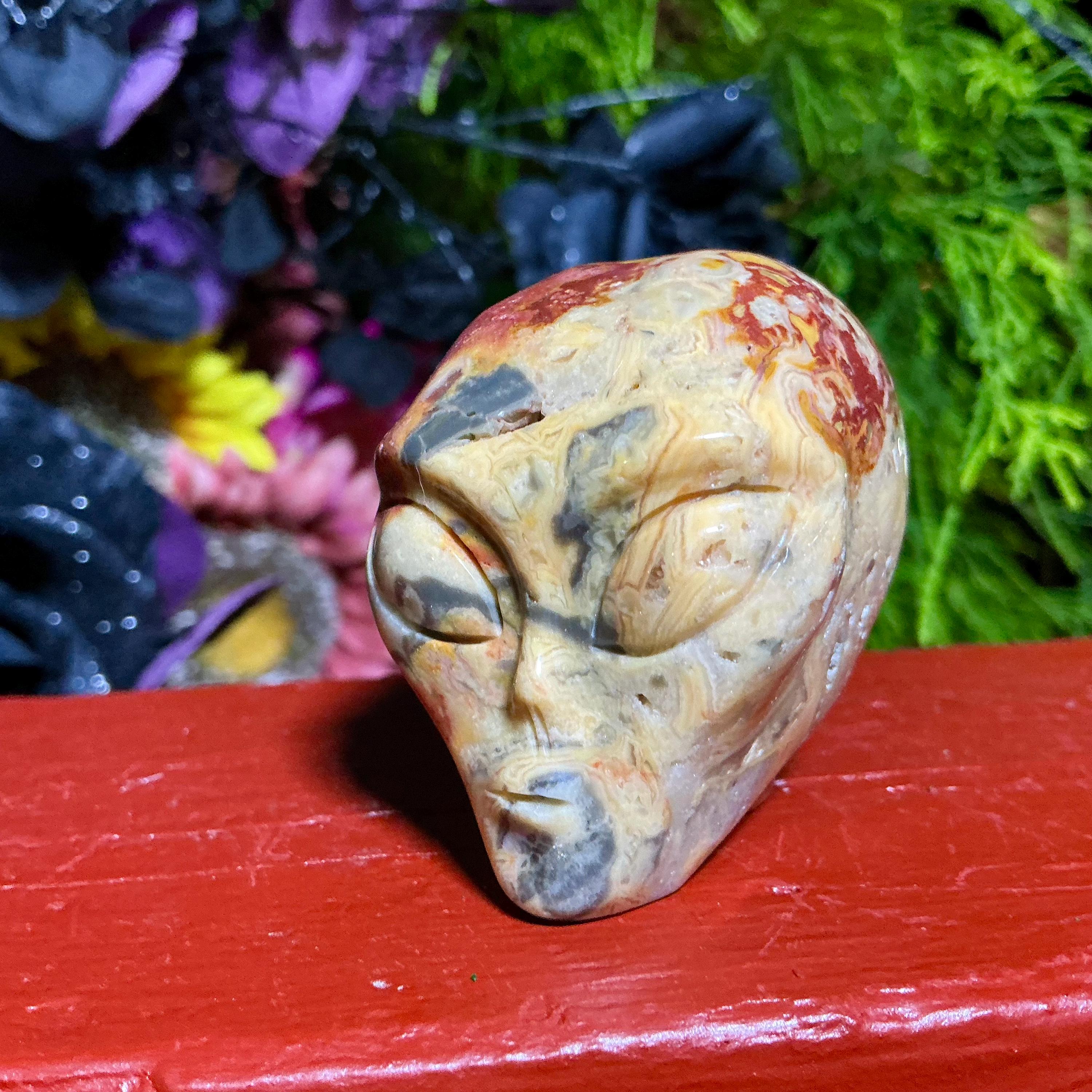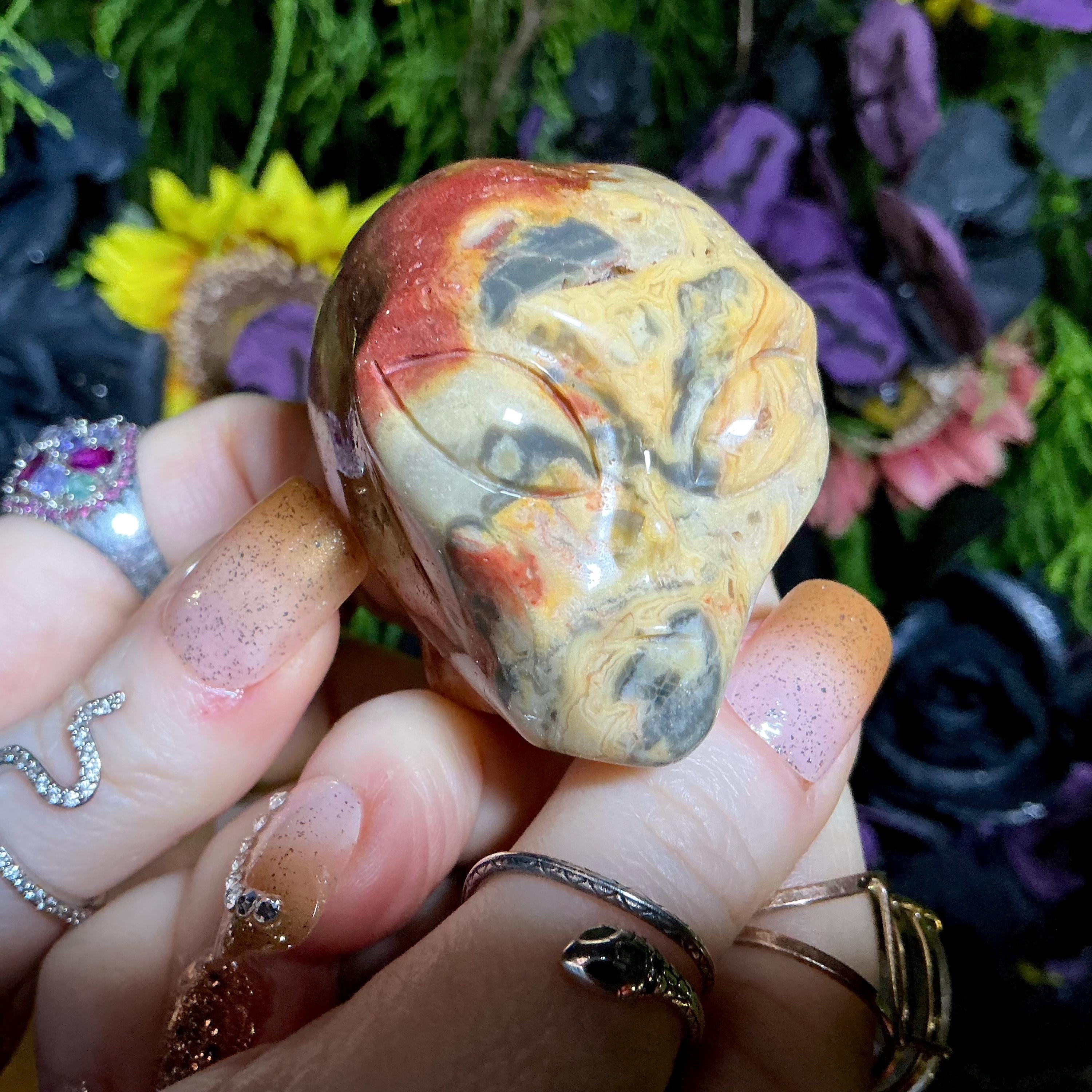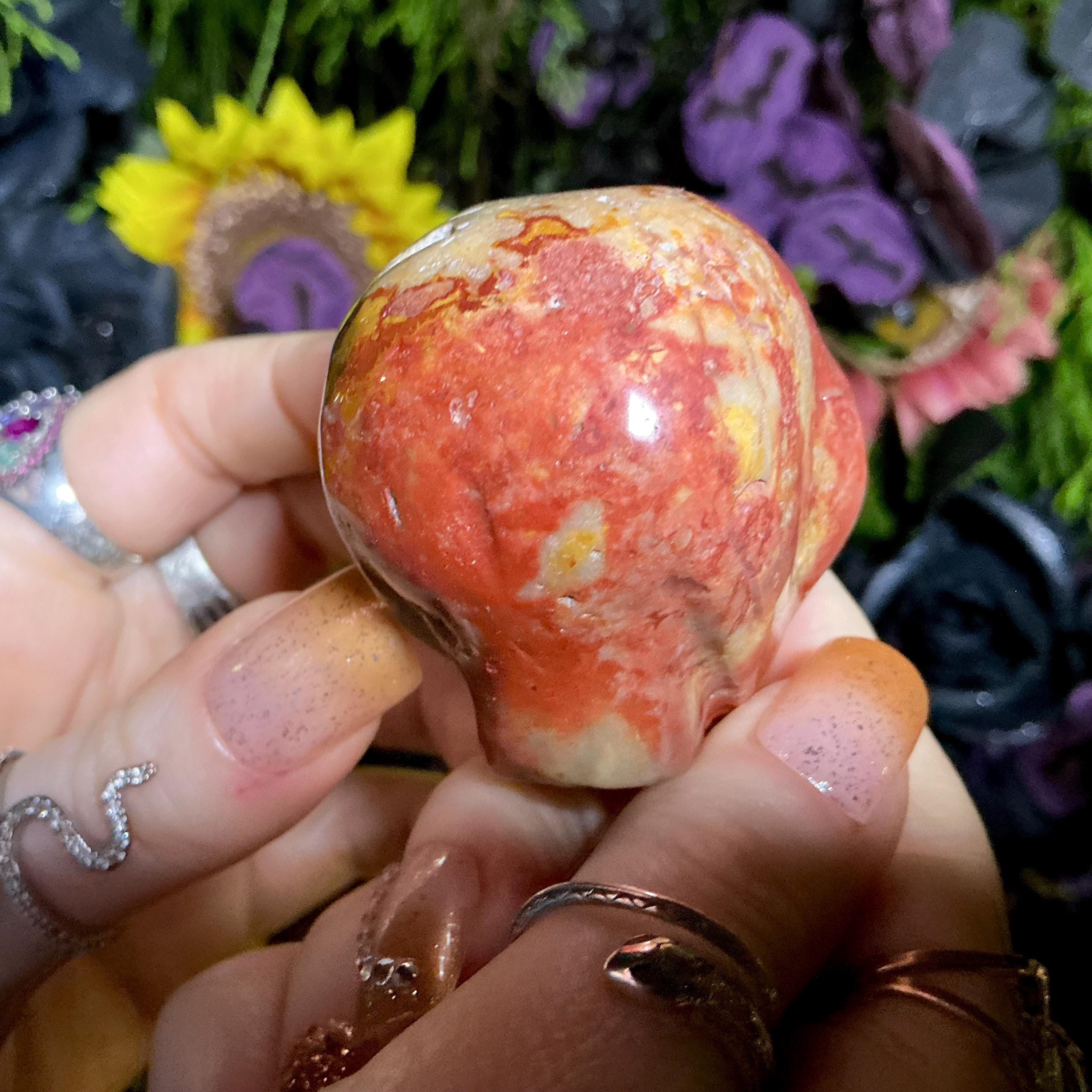 This beautiful red and yellow Crazy Lace Agate Mini Skull is a self-standing making it perfect for you display or your altar.