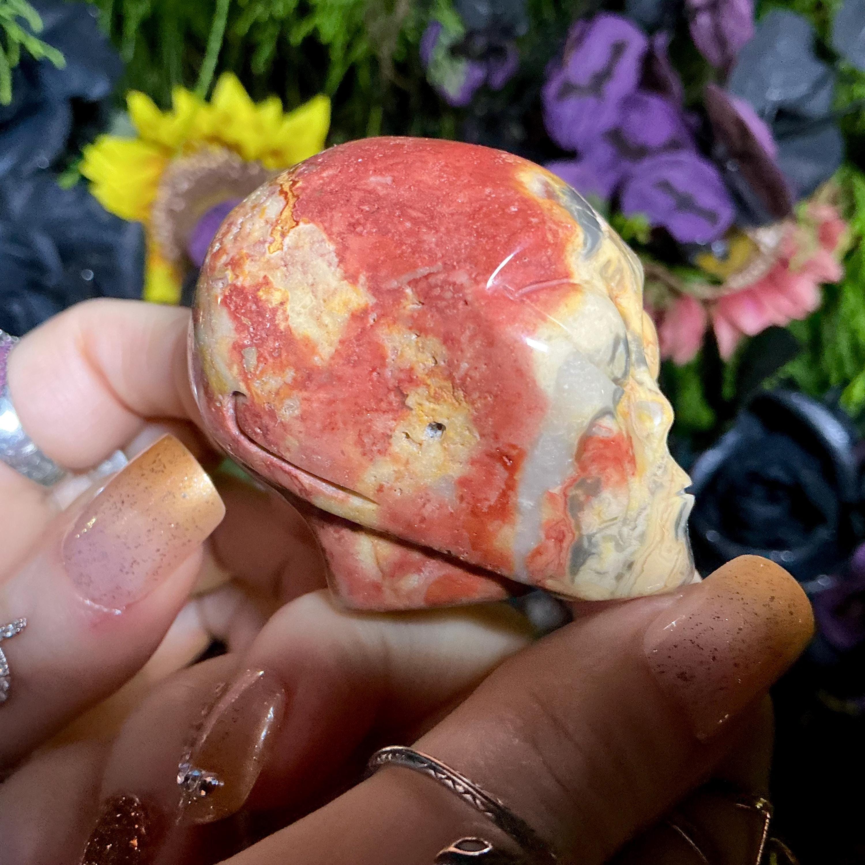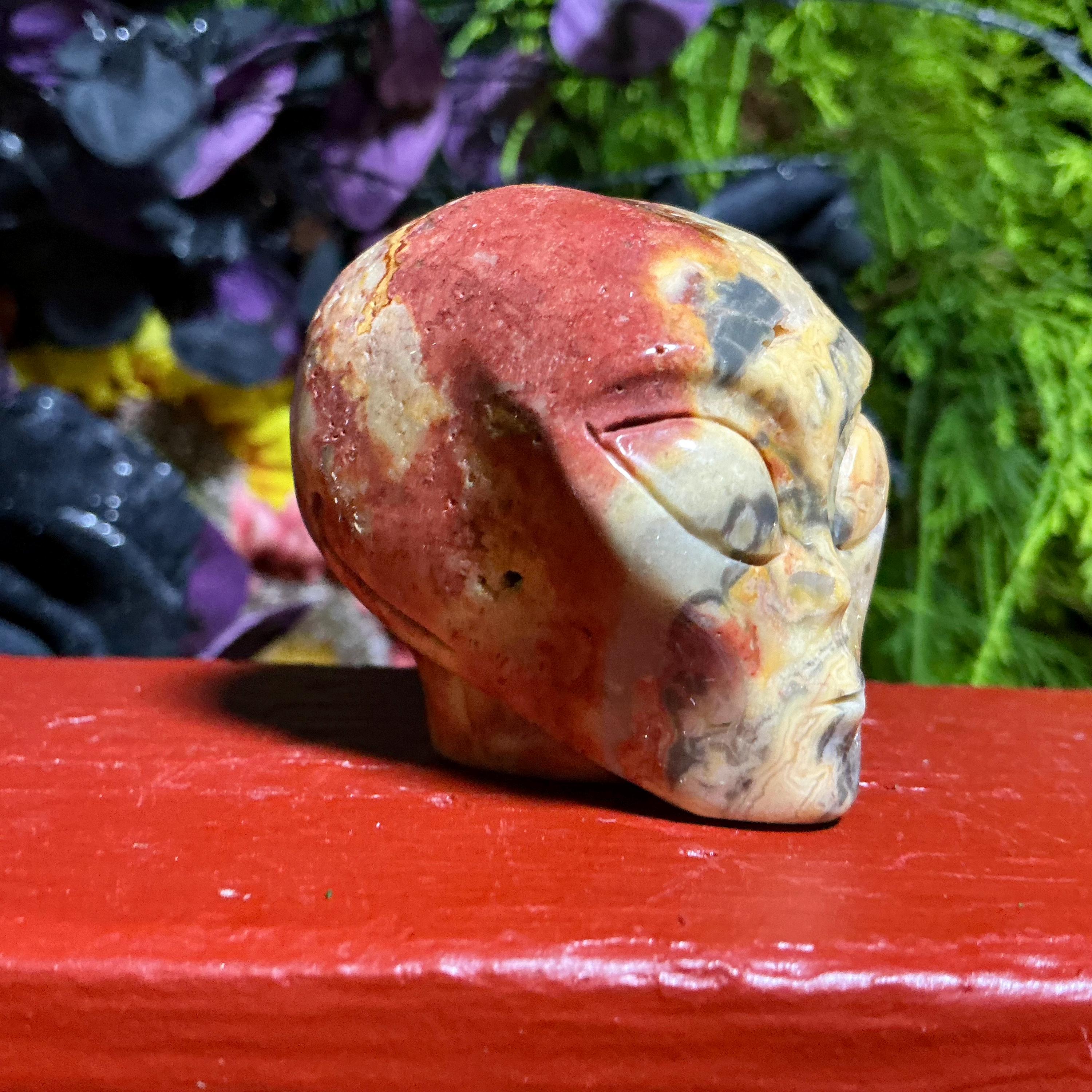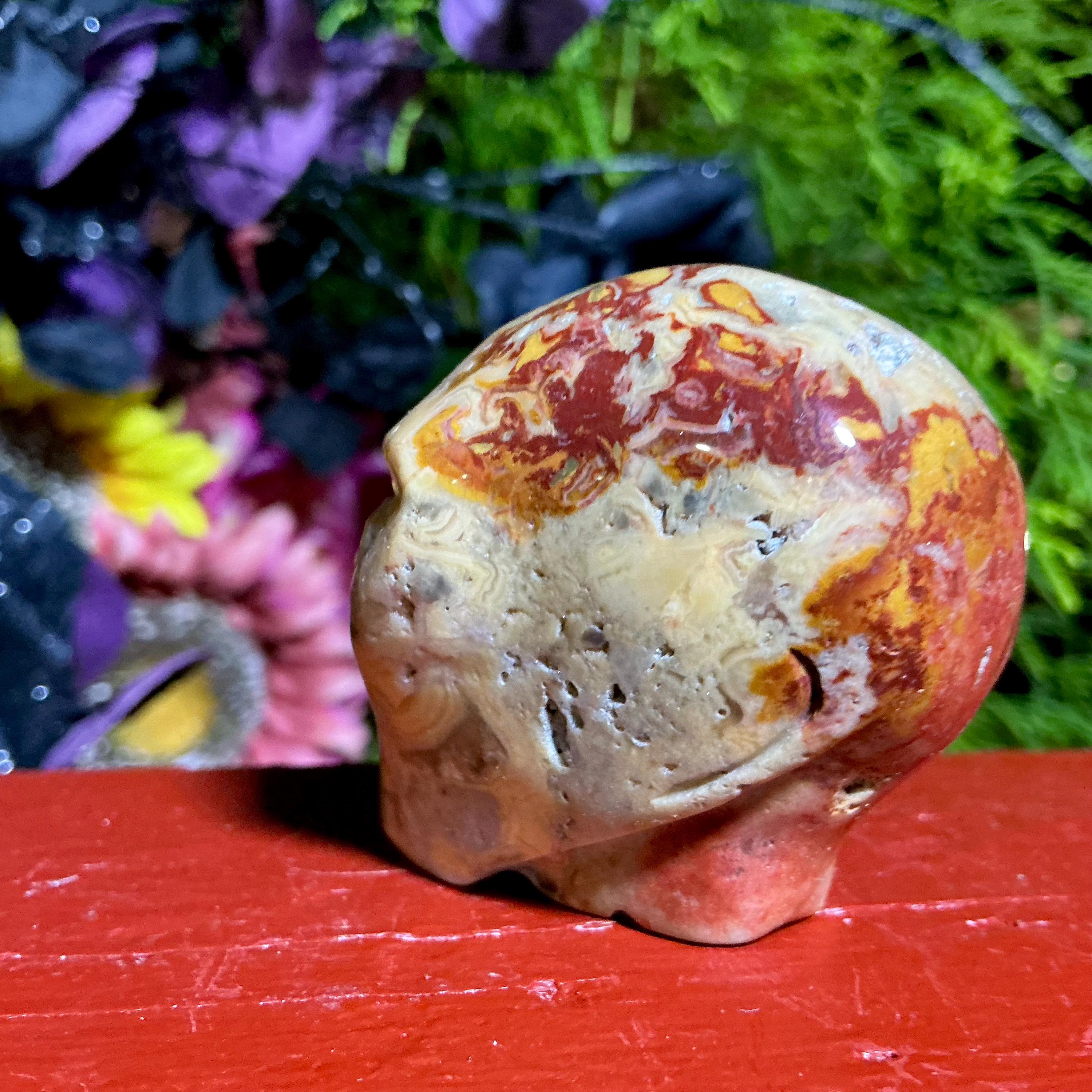 This is such a gorgeous red and yellow Crazy Lace Agate Mini Skull crystal scull.