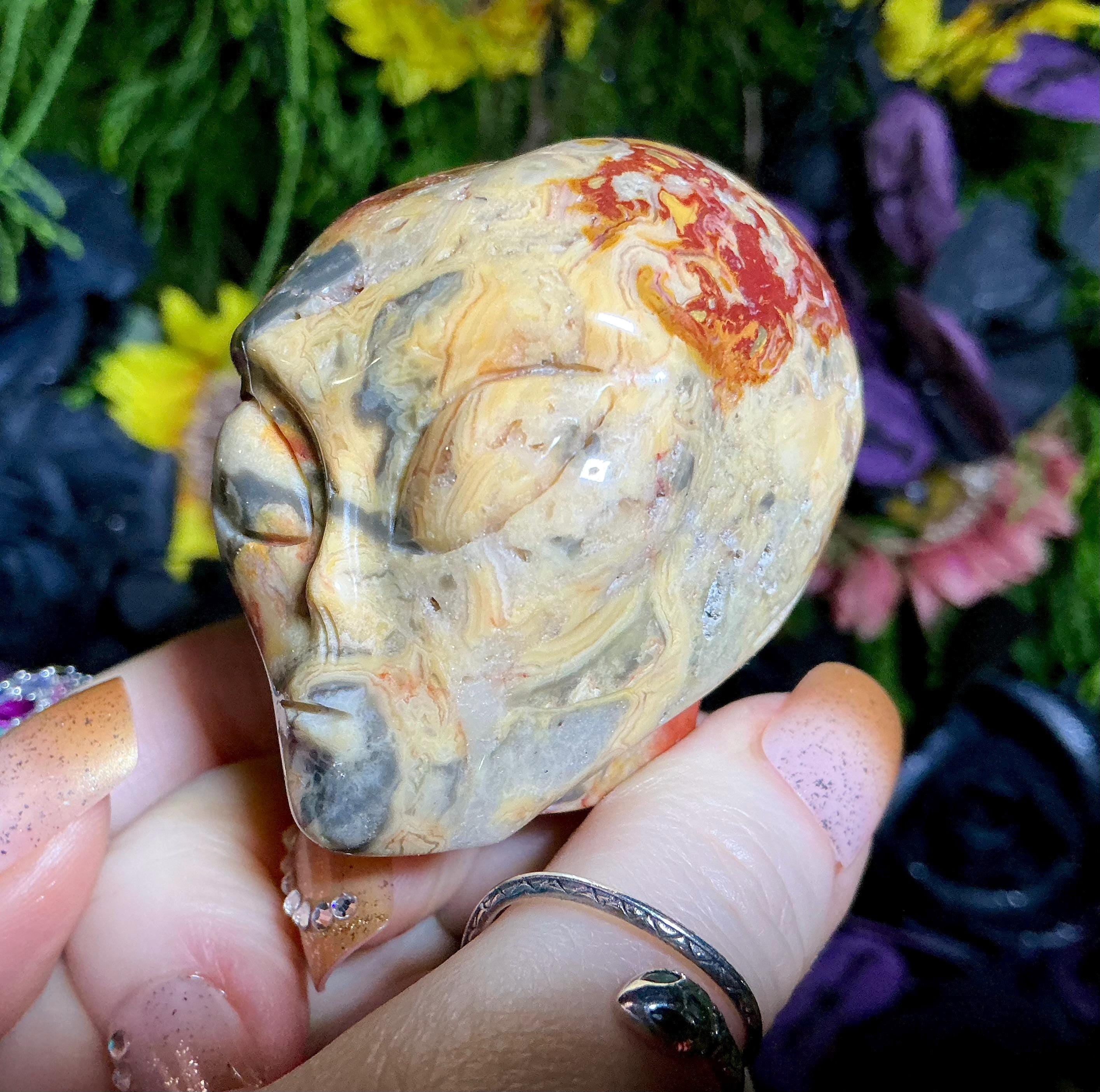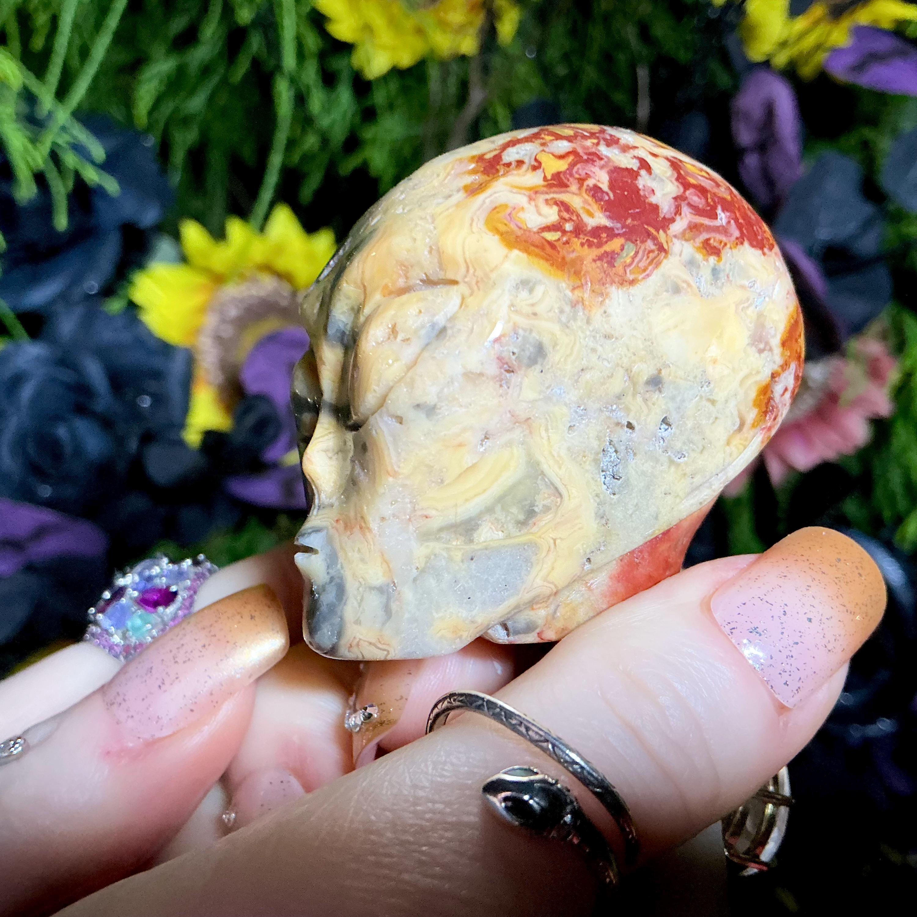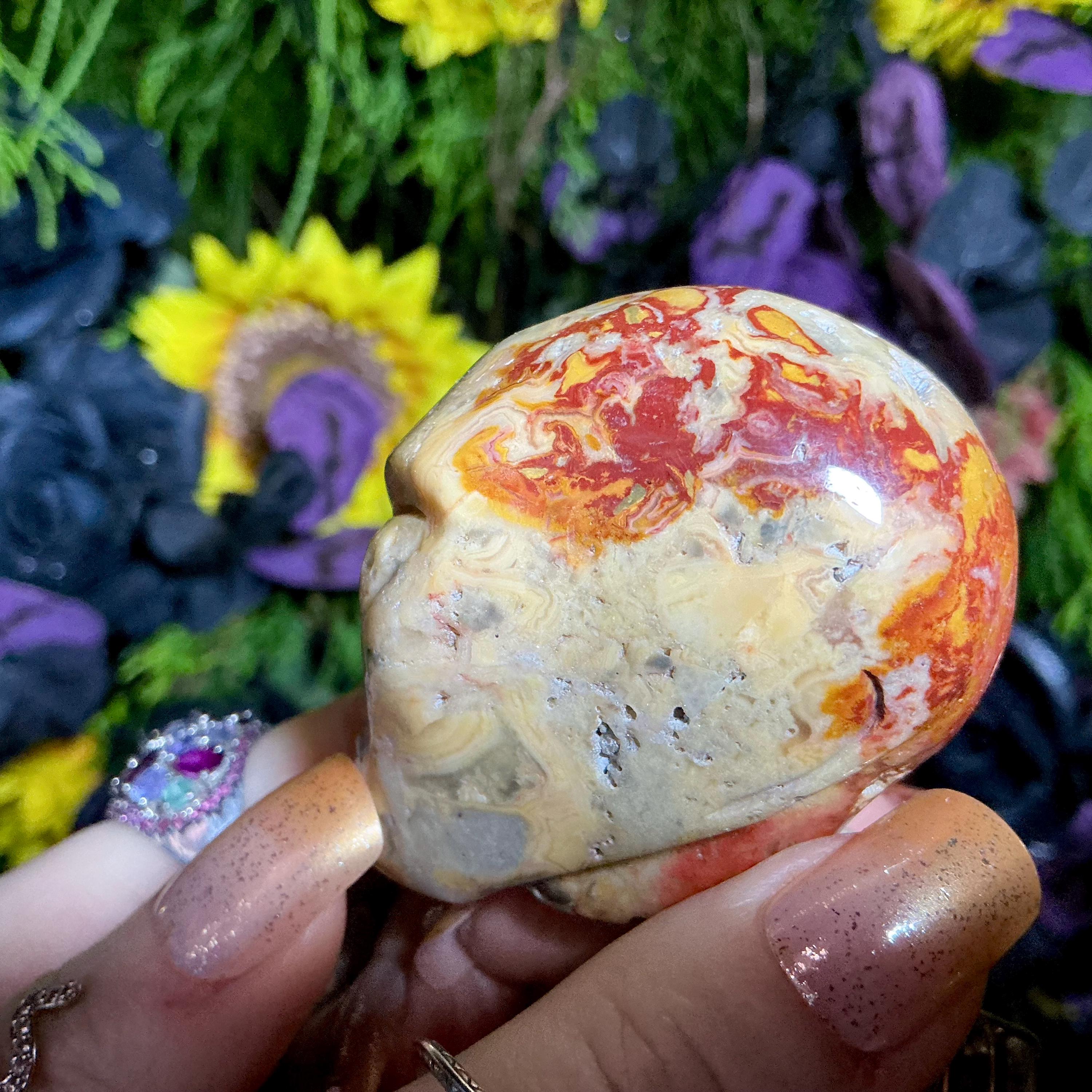 This is such a gorgeous red and yellow Crazy Lace Agate Mini Skull crystal scull.