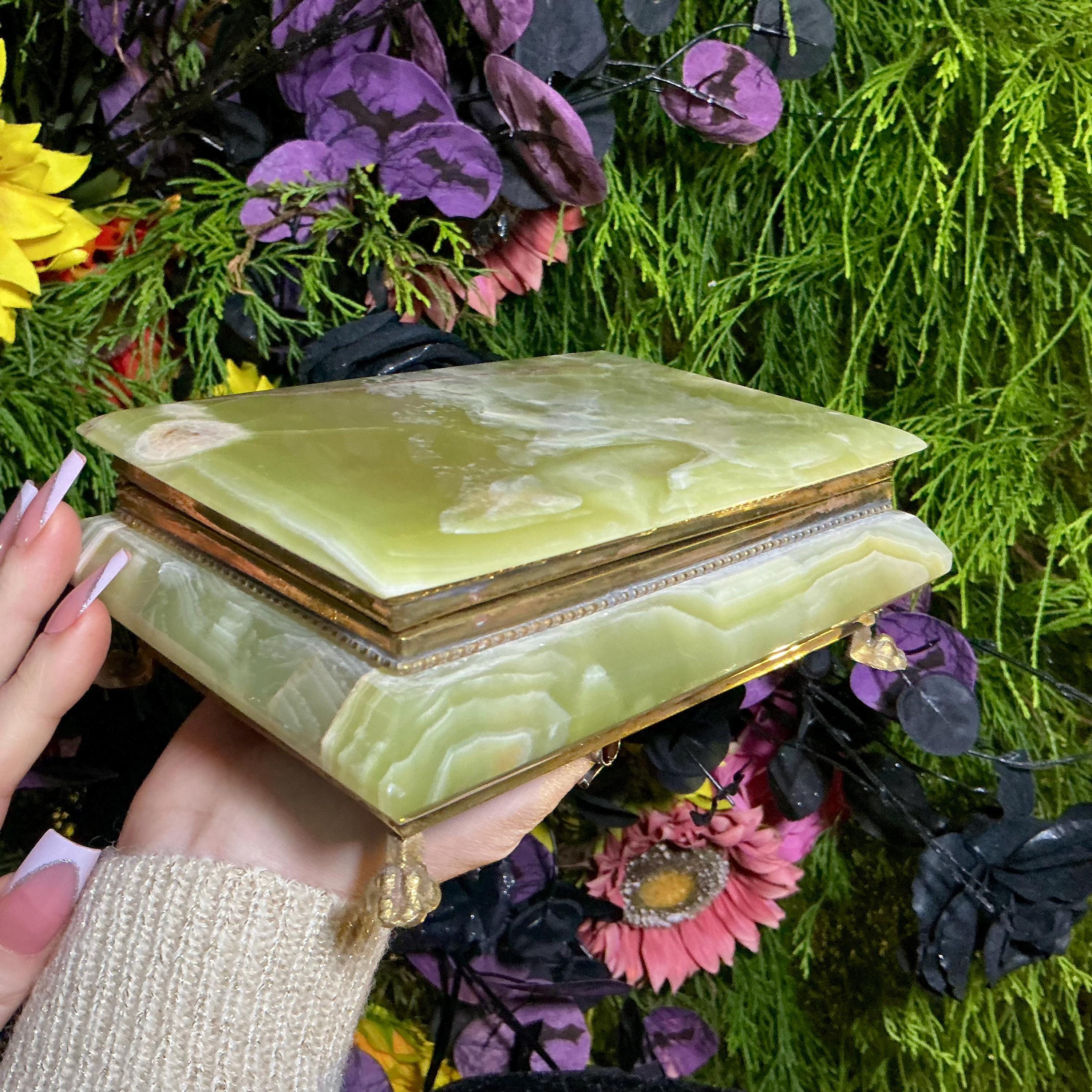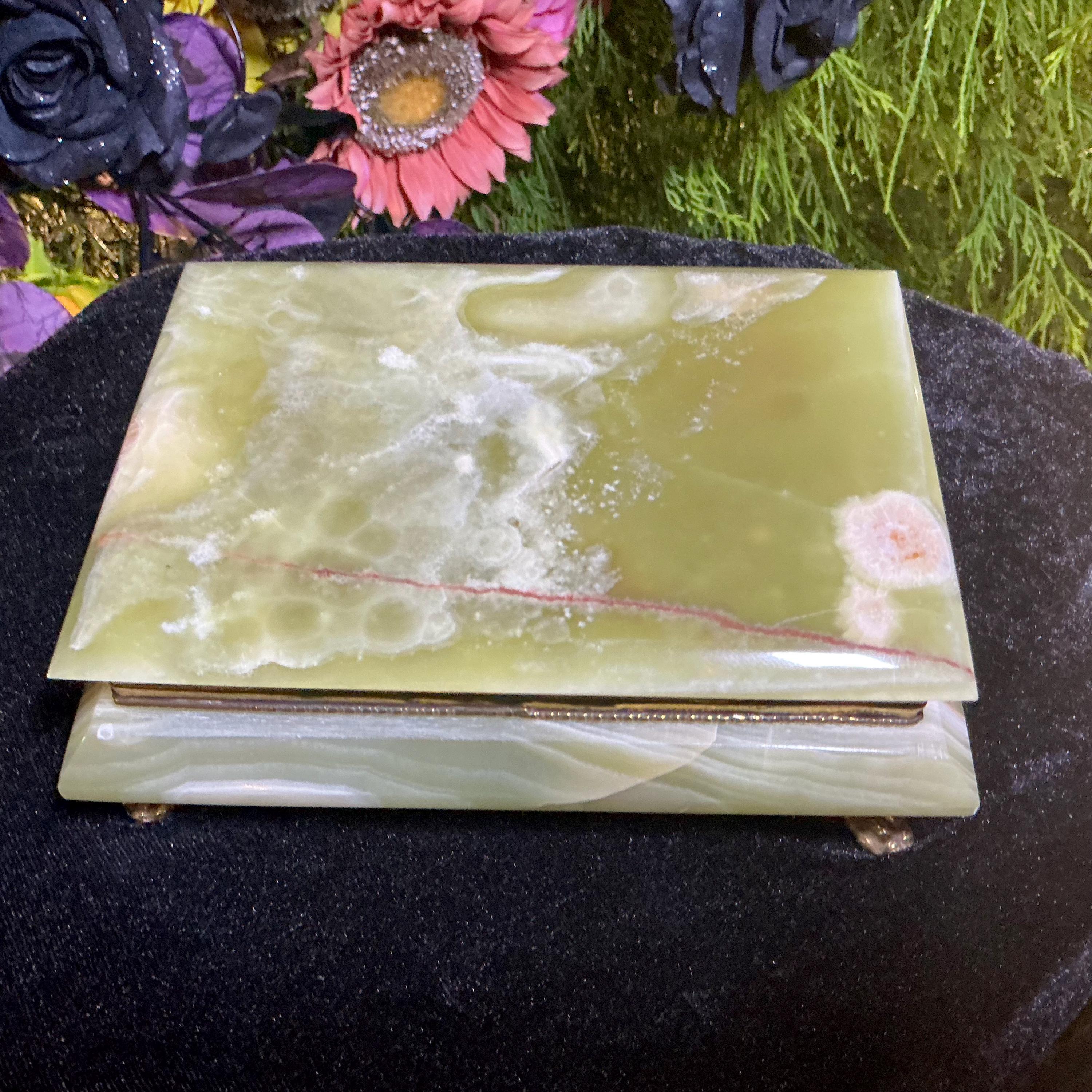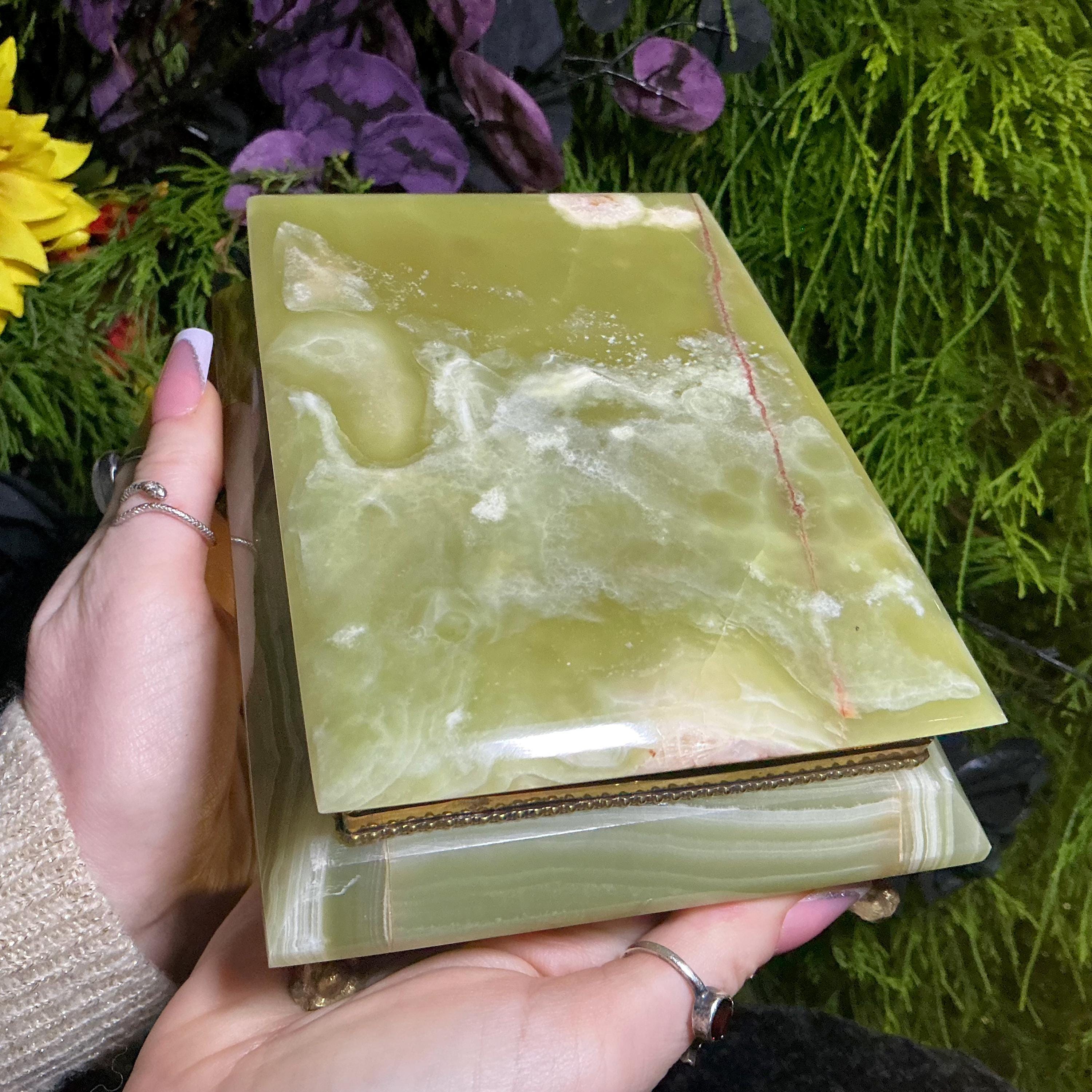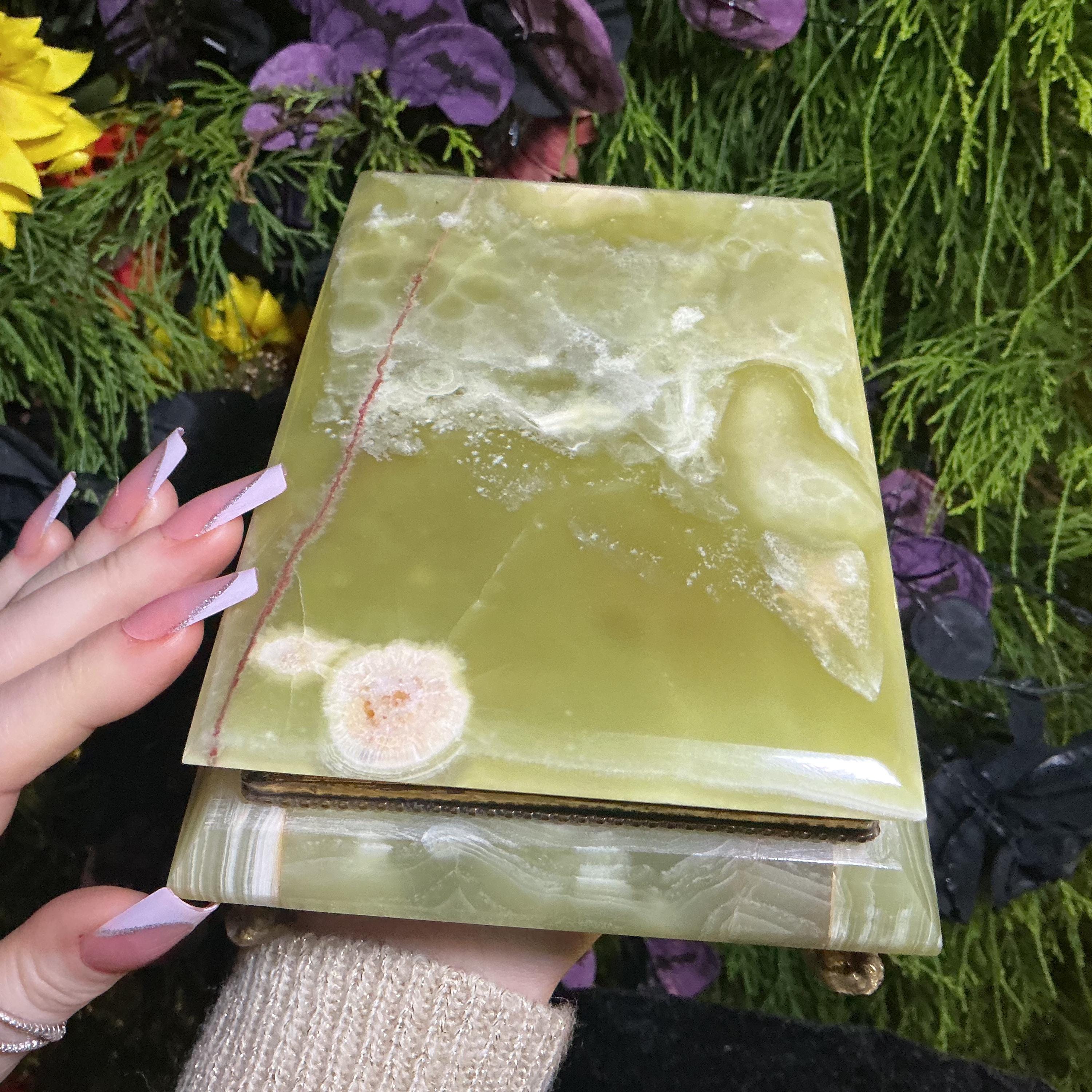 It is loaded with Swirling green, white, yellow & golden-brown pattern's swirling throughout making this a one-of-a-kind treasure box.