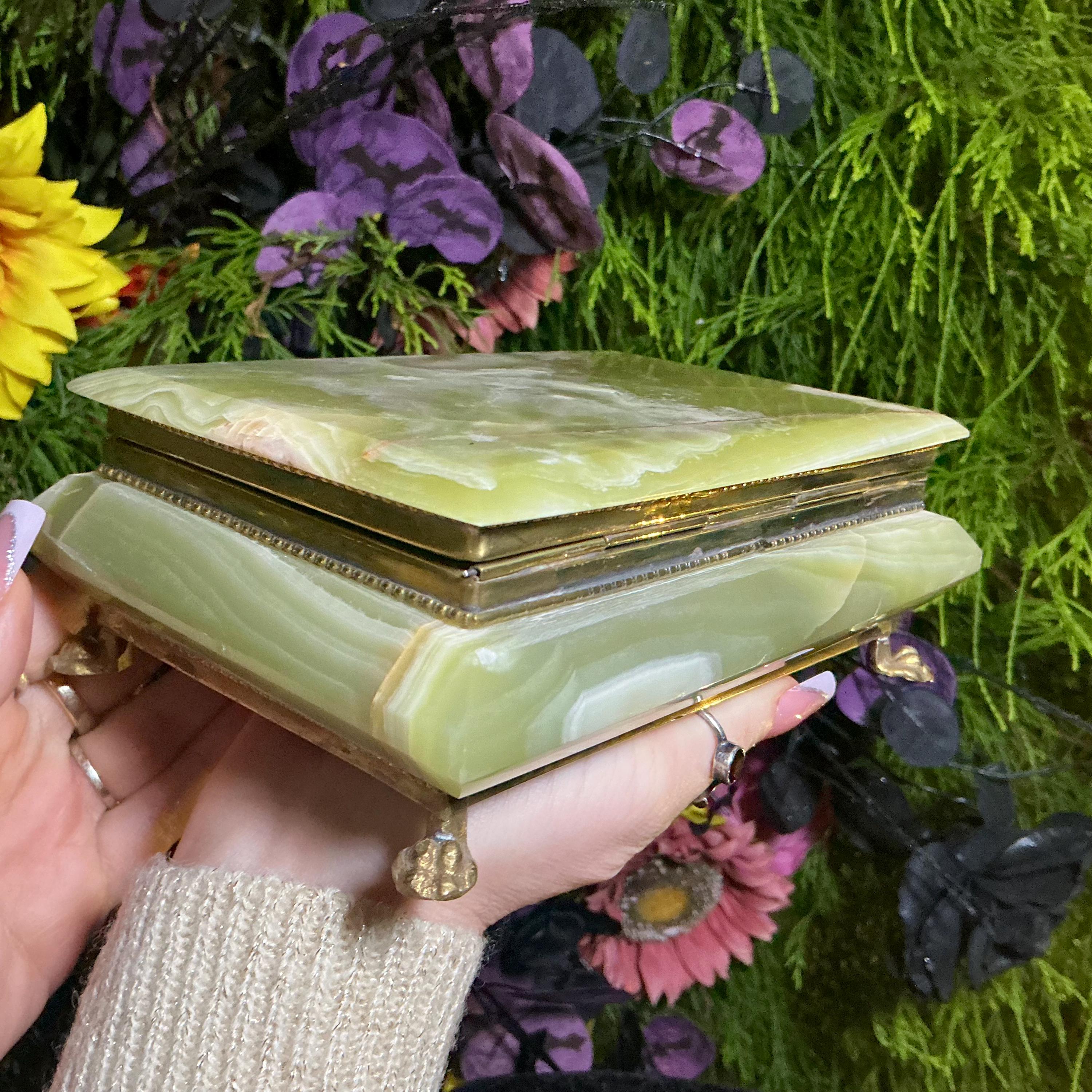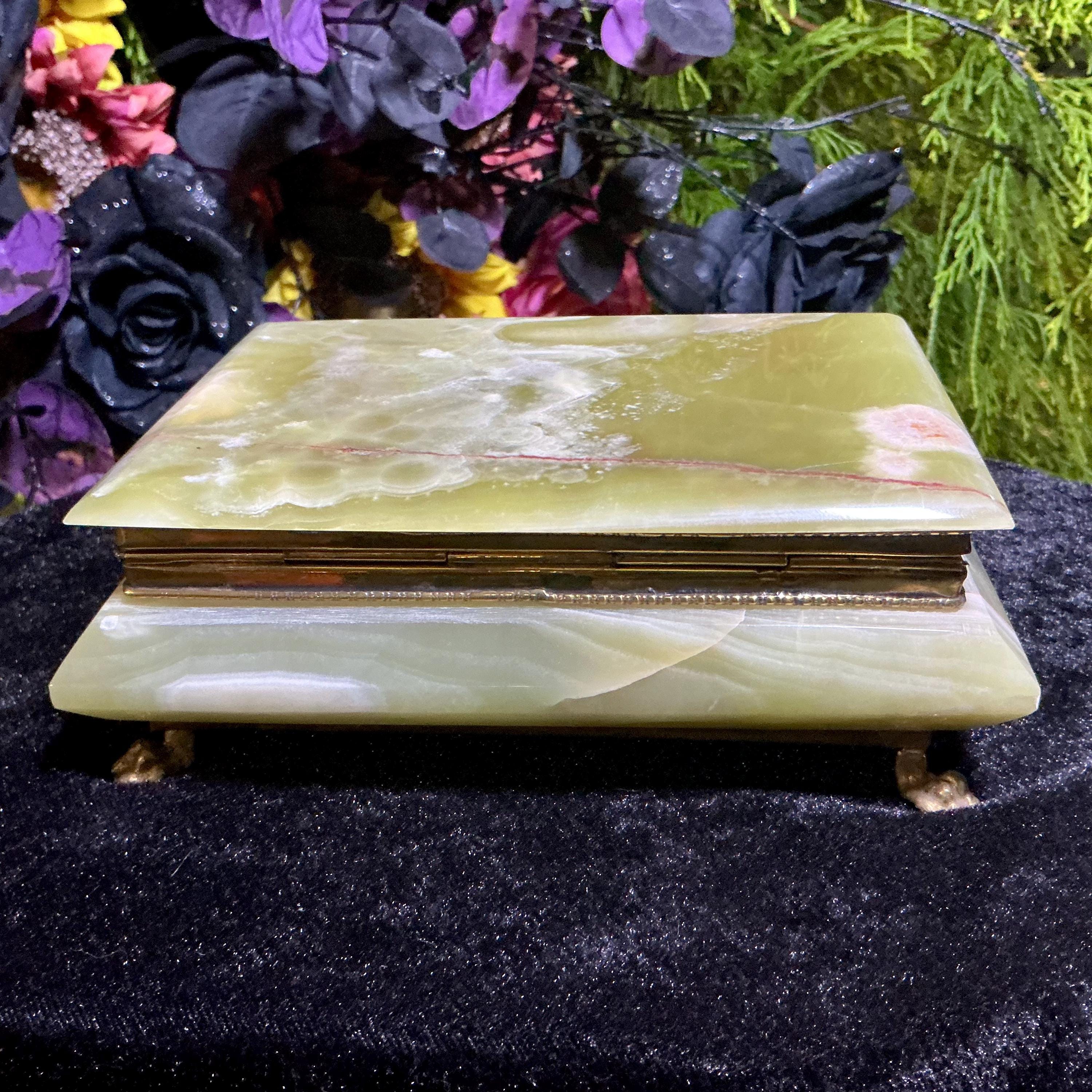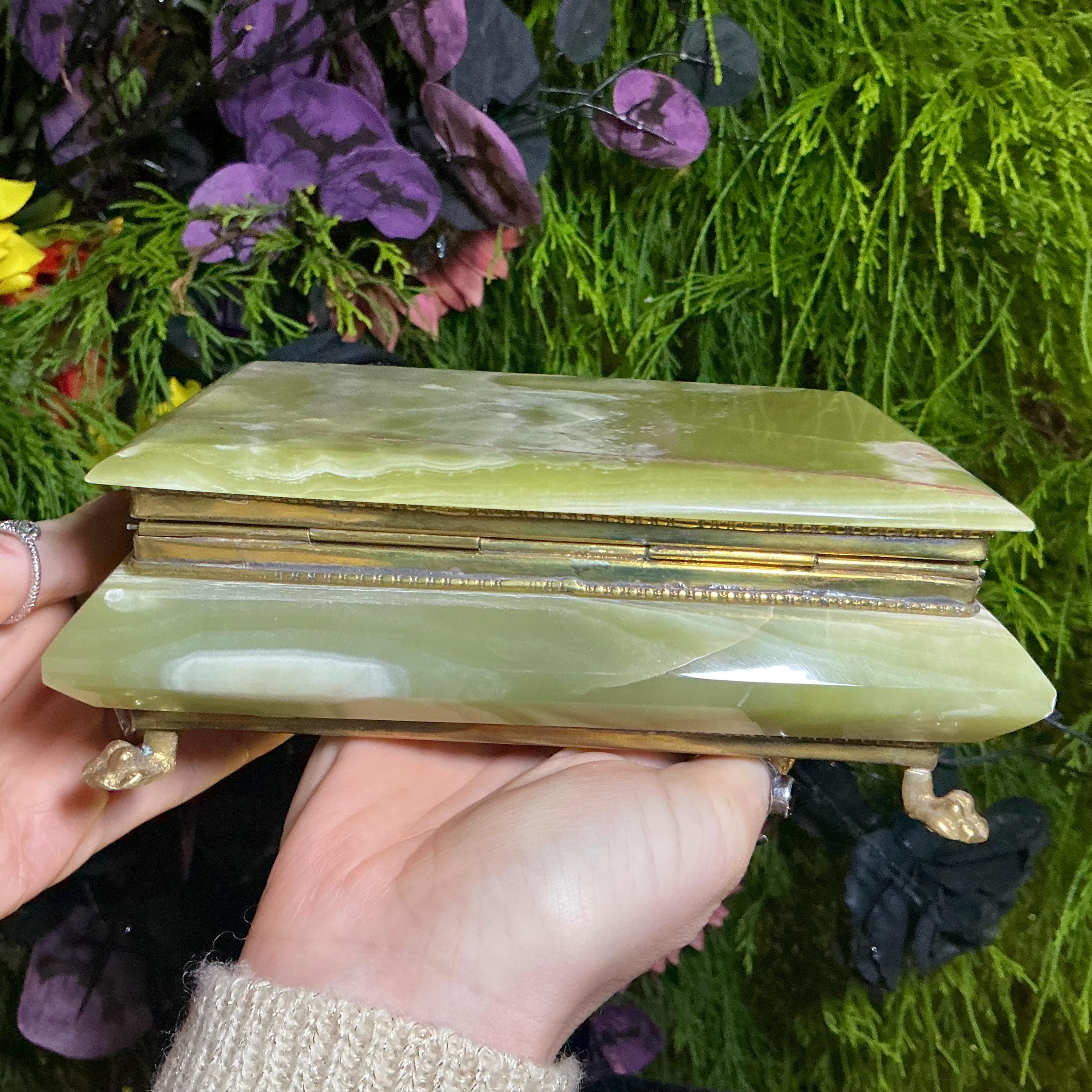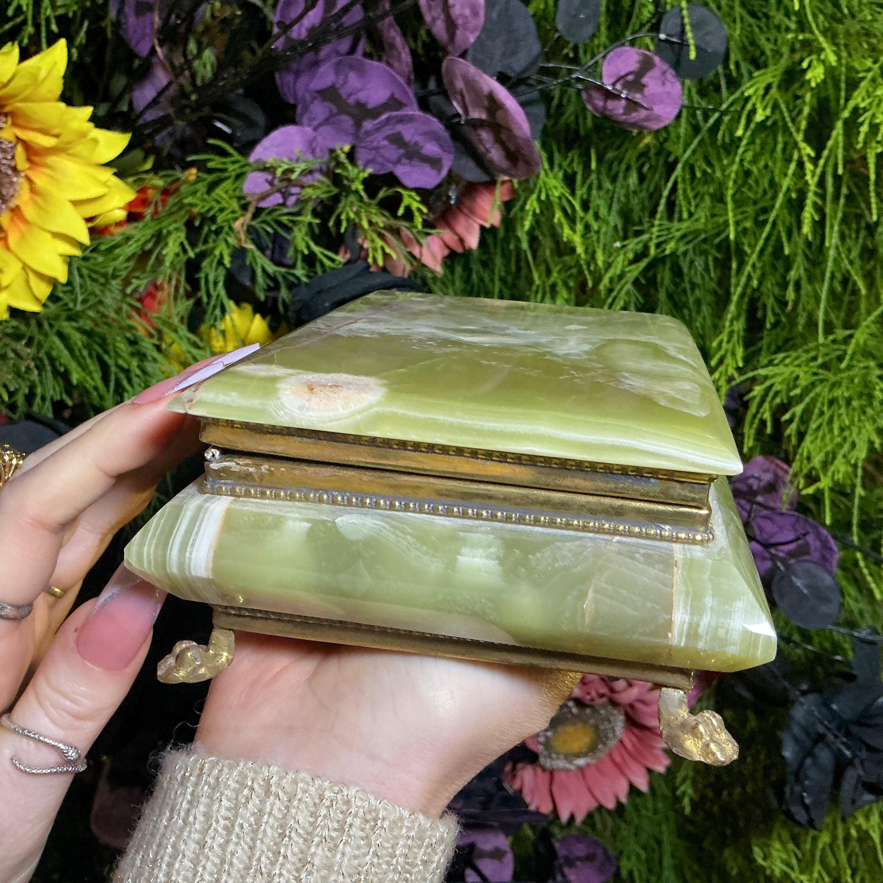 It is loaded with Swirling green, white, yellow & golden-brown pattern's swirling throughout making this a one-of-a-kind treasure box.