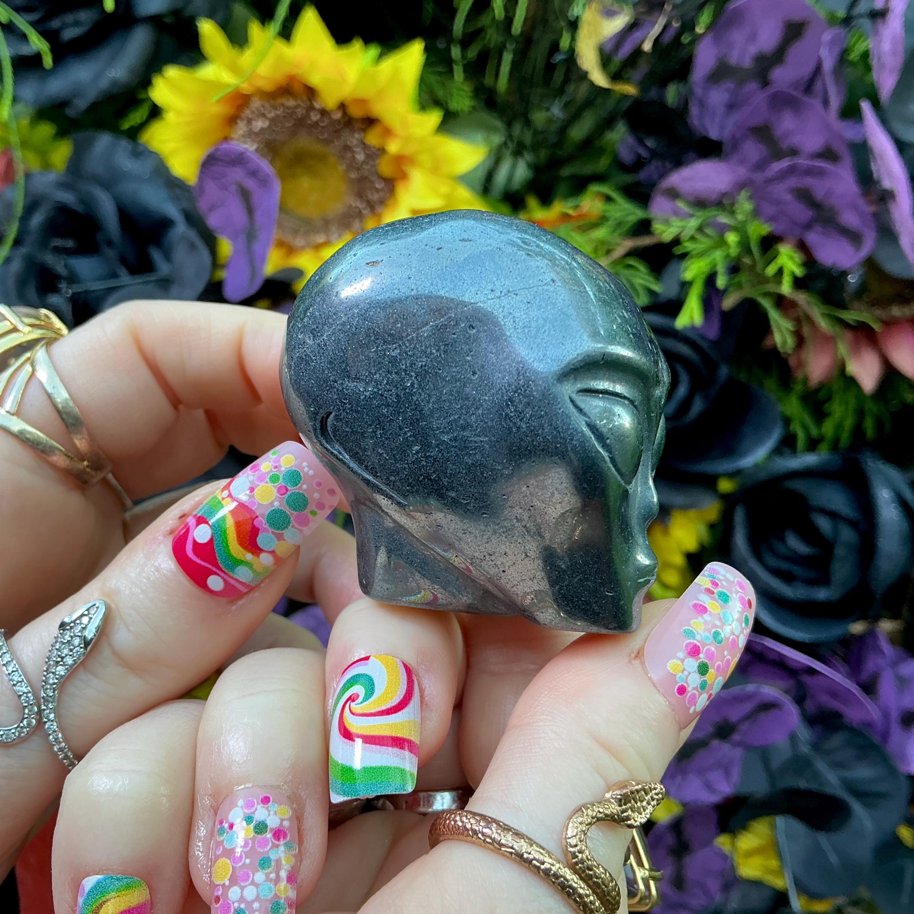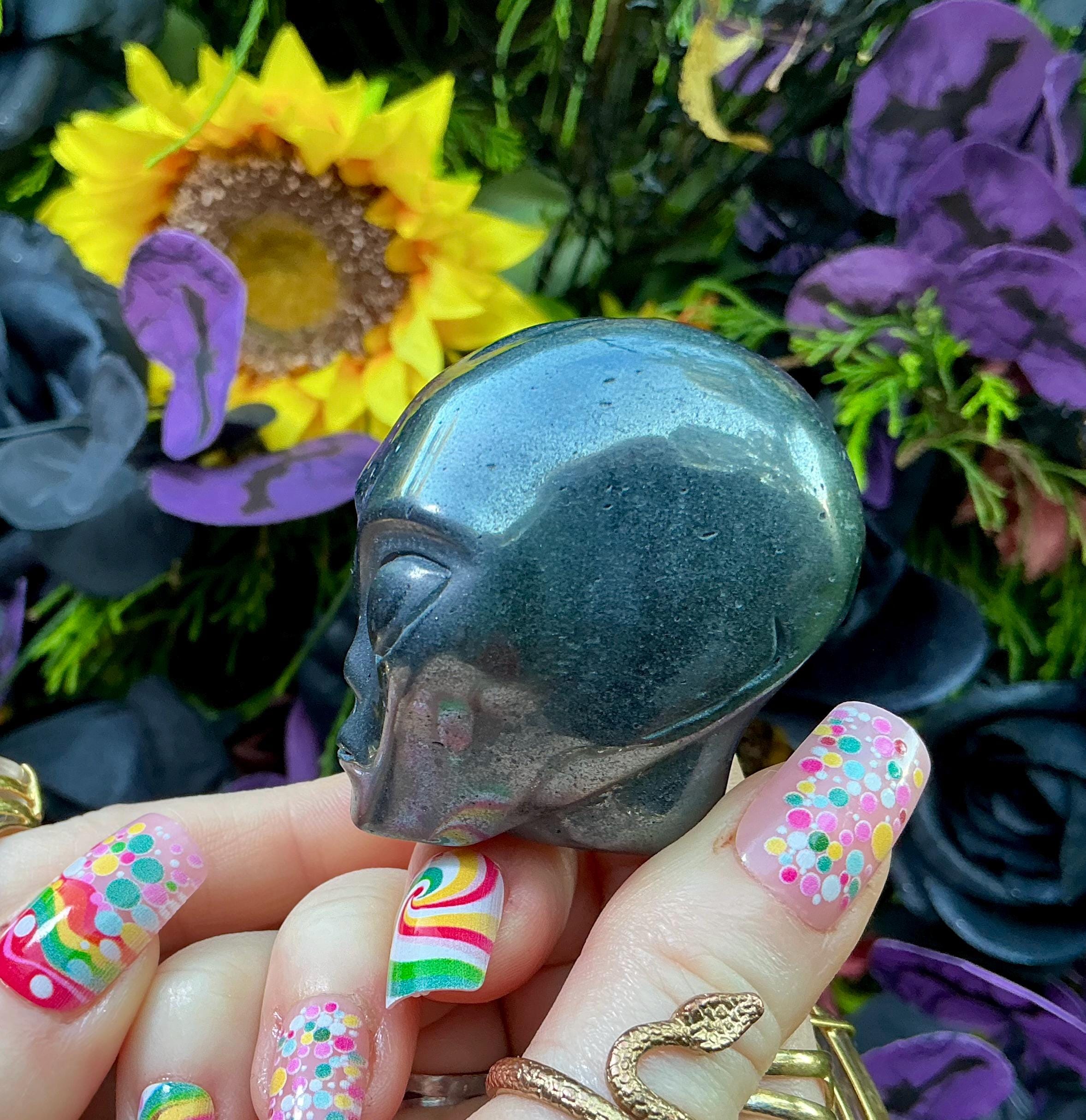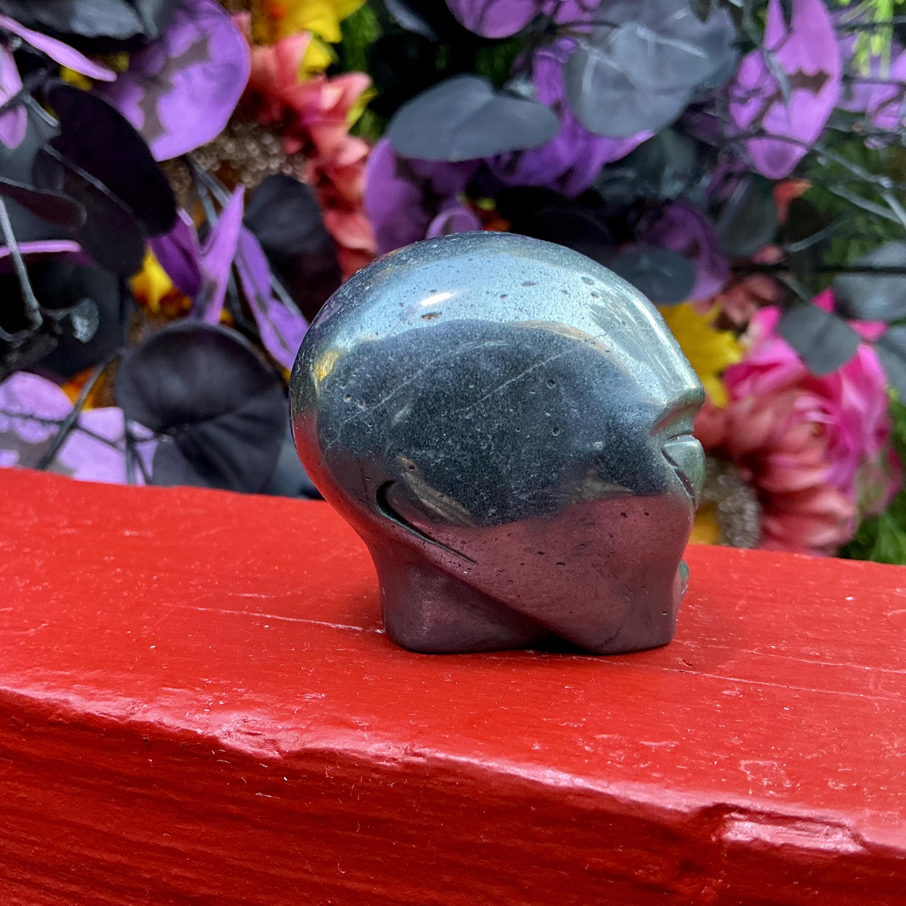 Hematite Alien Skull Crystal Mini Skull ~ 9 oz. ~ 2" Long ~ Black Metallic Luster Gemstone ~ Hand-Carved Sculpture ~ Fast & Free Shipping