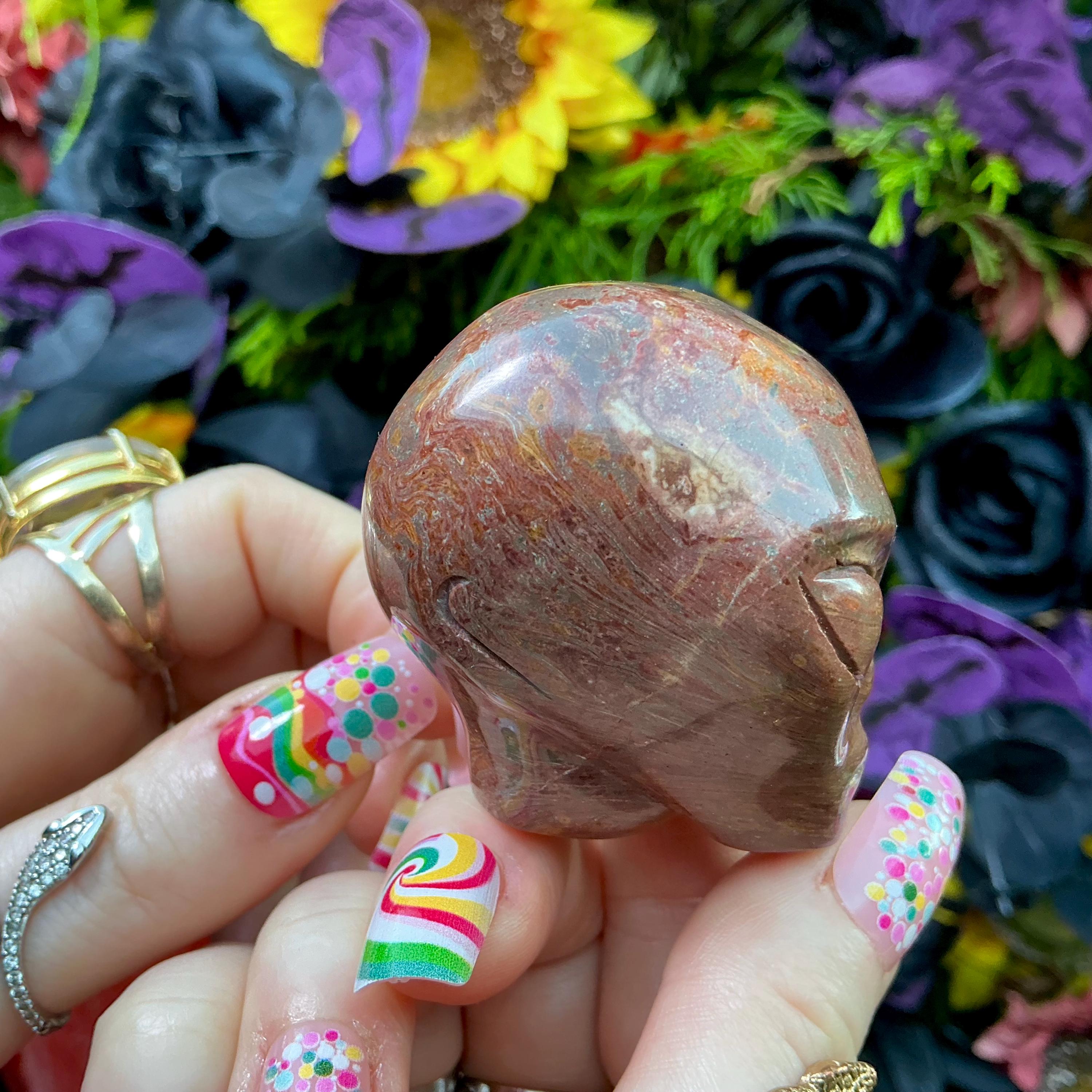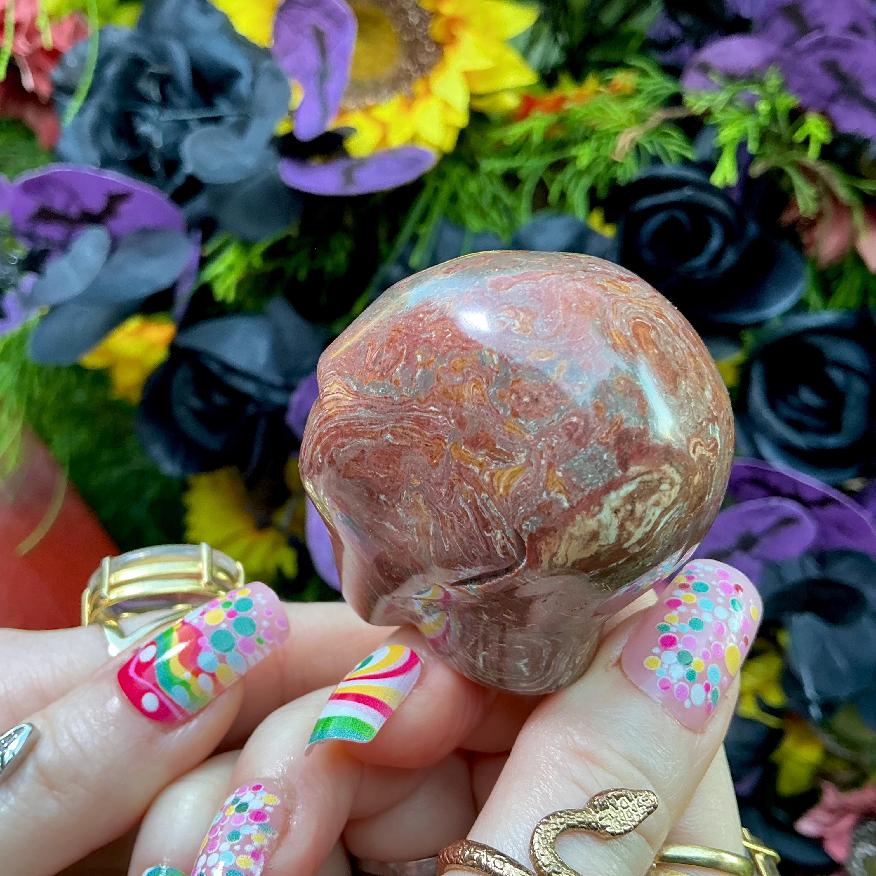I just love this Red Lace Agate Mini Skull, and the glowing red and yellow colorful swirls combine so naturally into the millions of years old mineral.