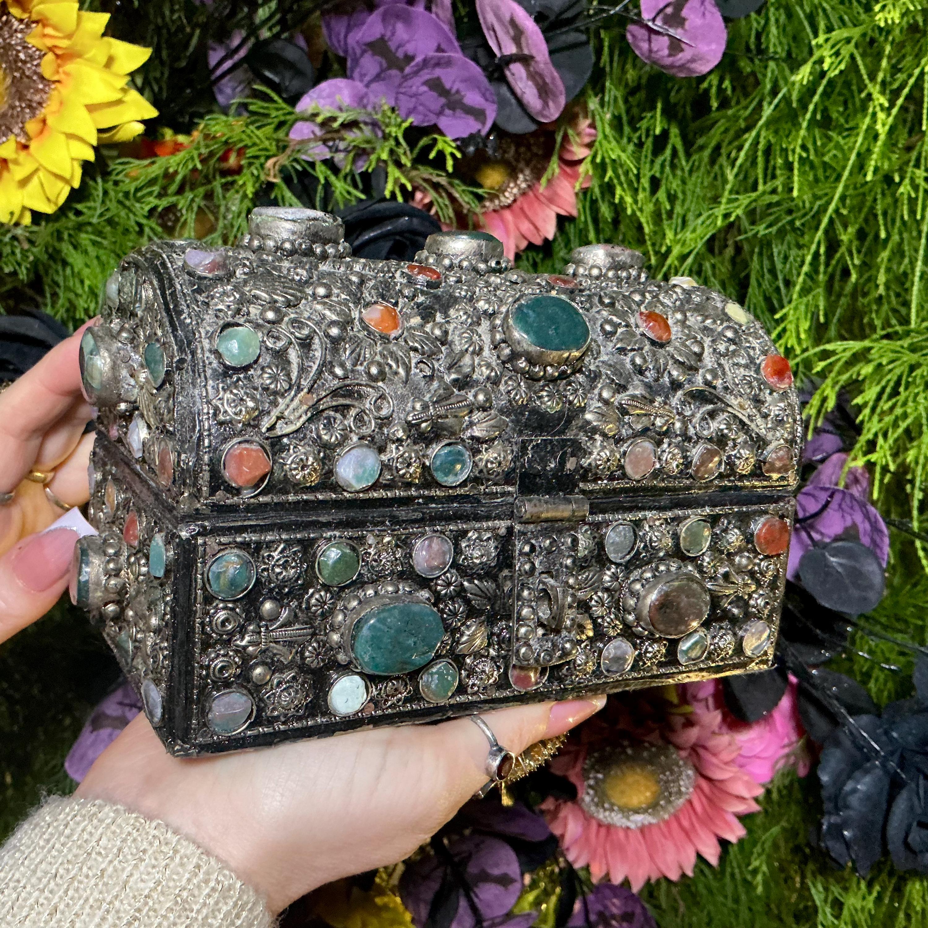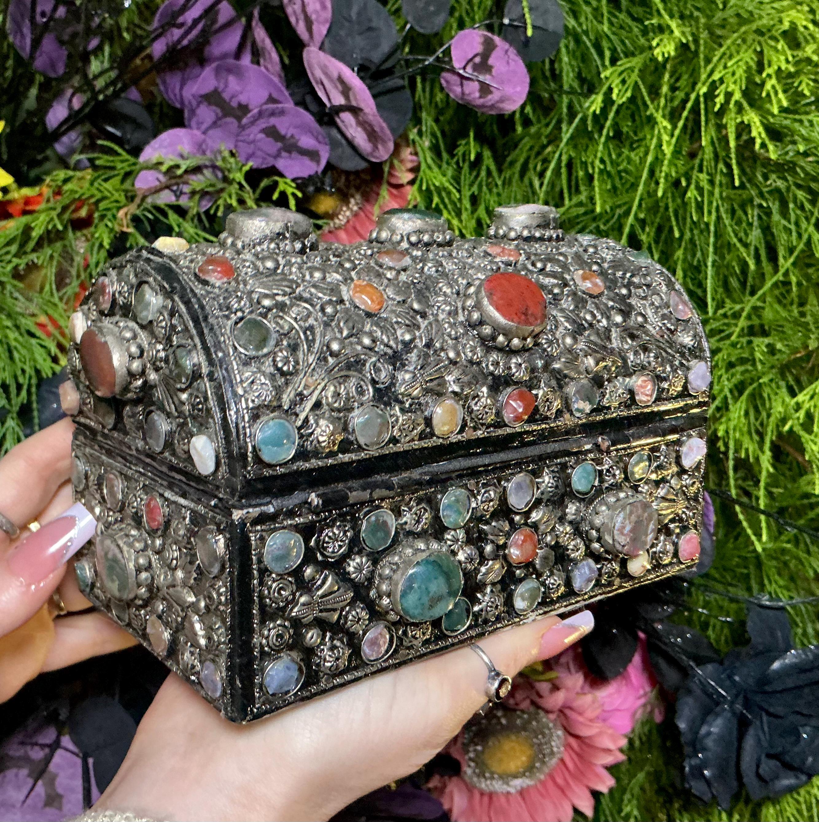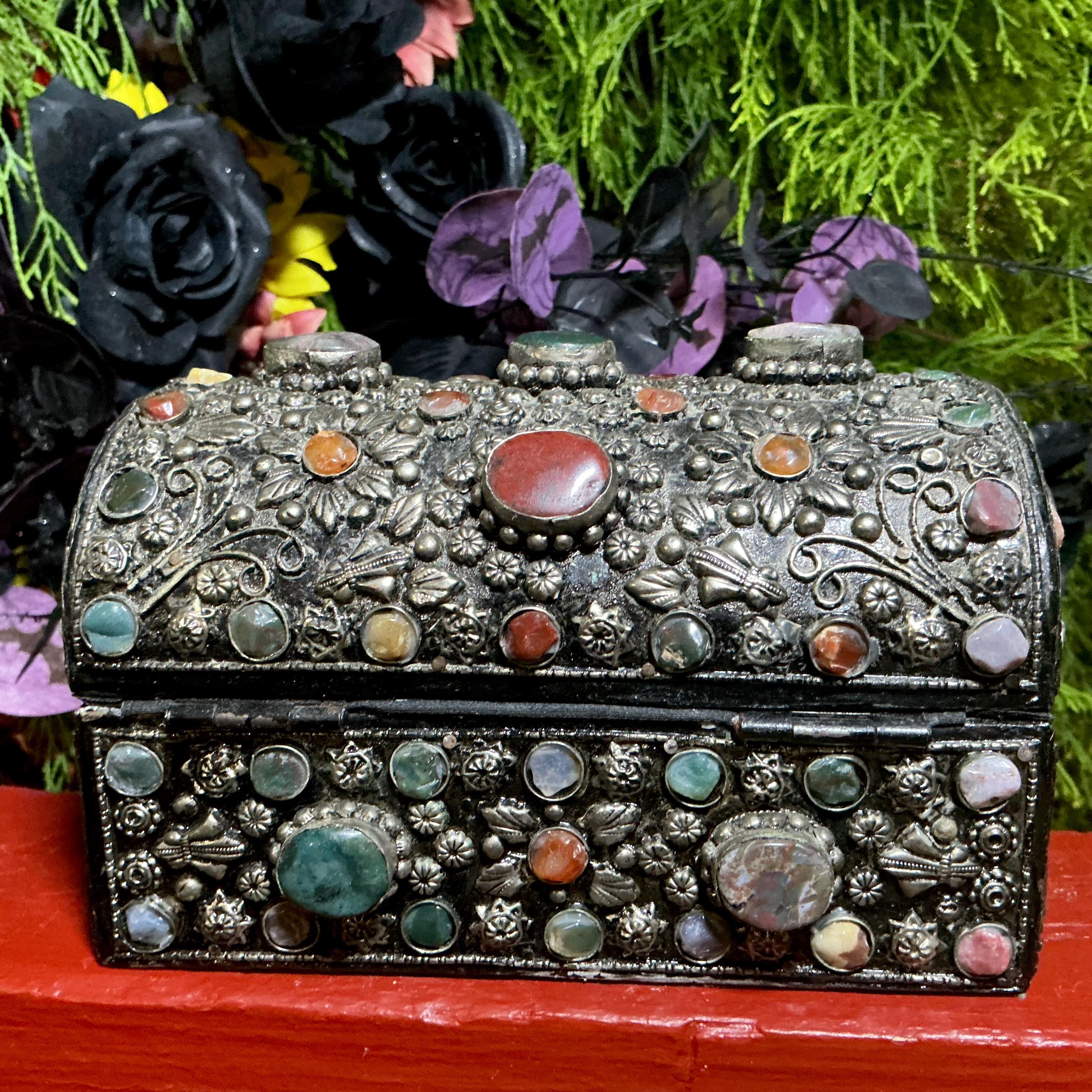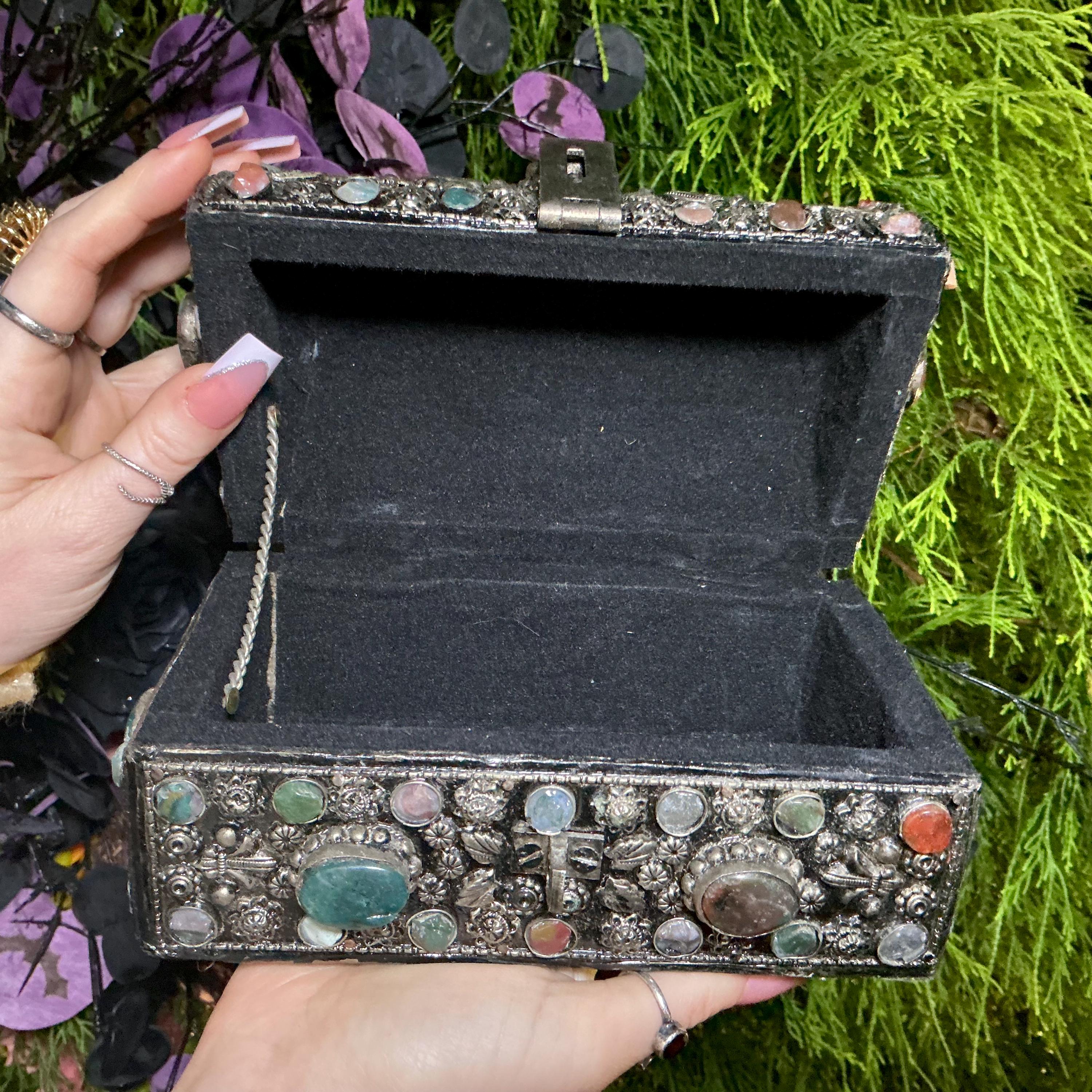 The Vintage Moroccan jewelry box is inlaid with semi-precious agate stones and covered with silvered metal filigree.