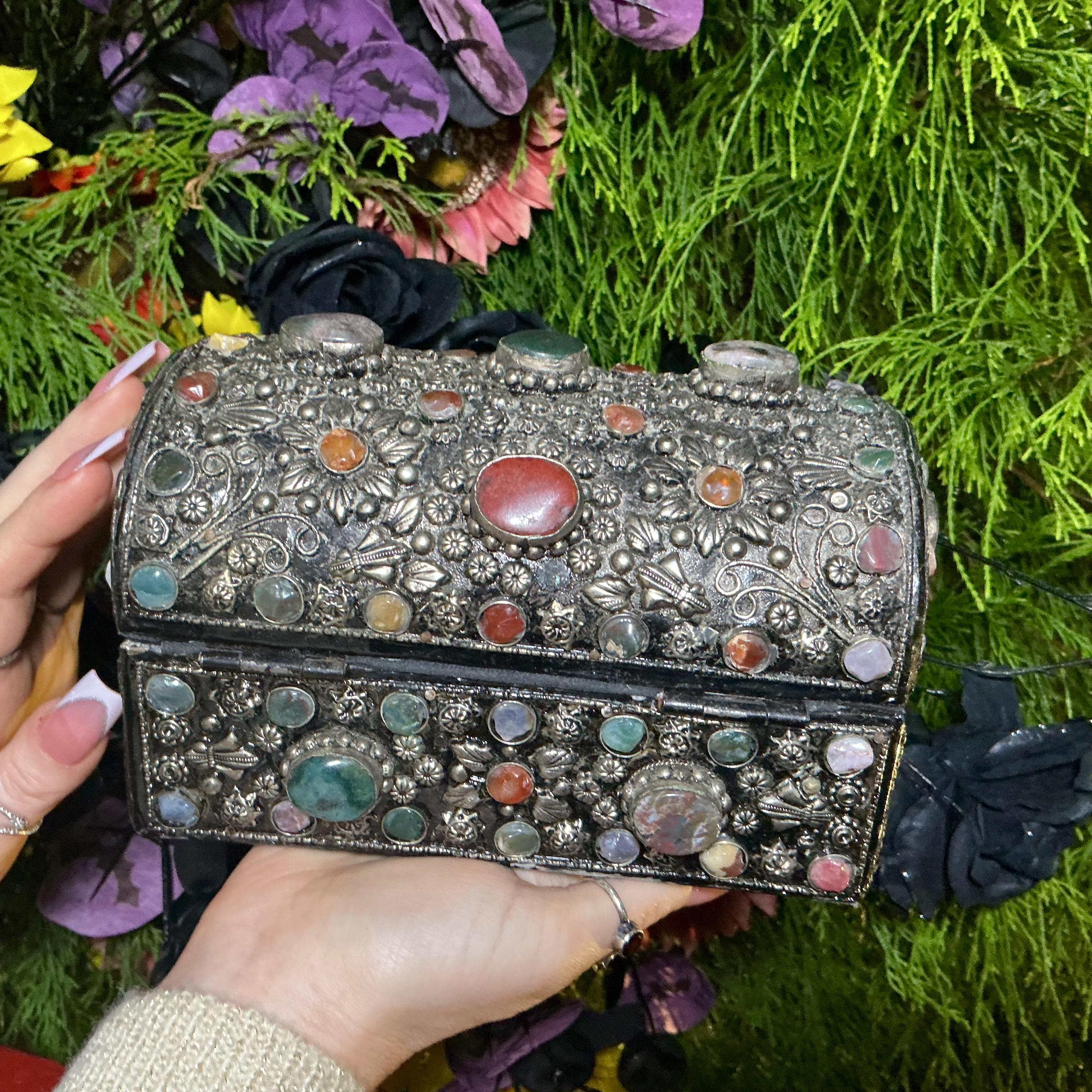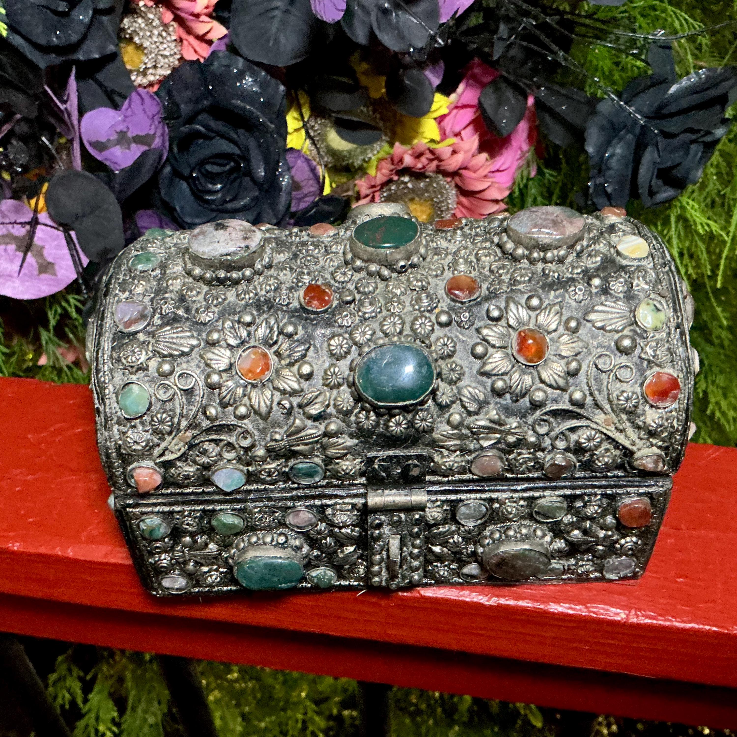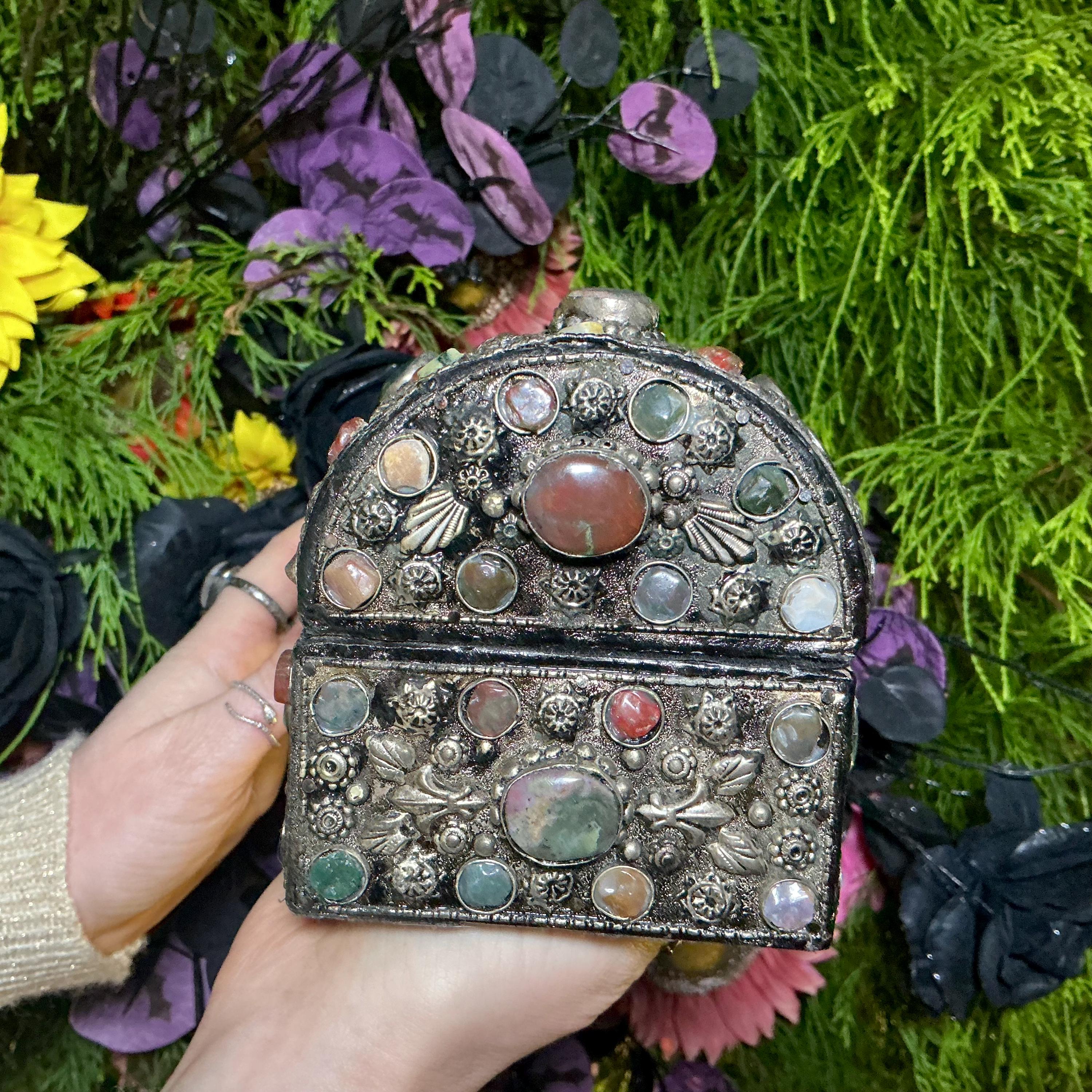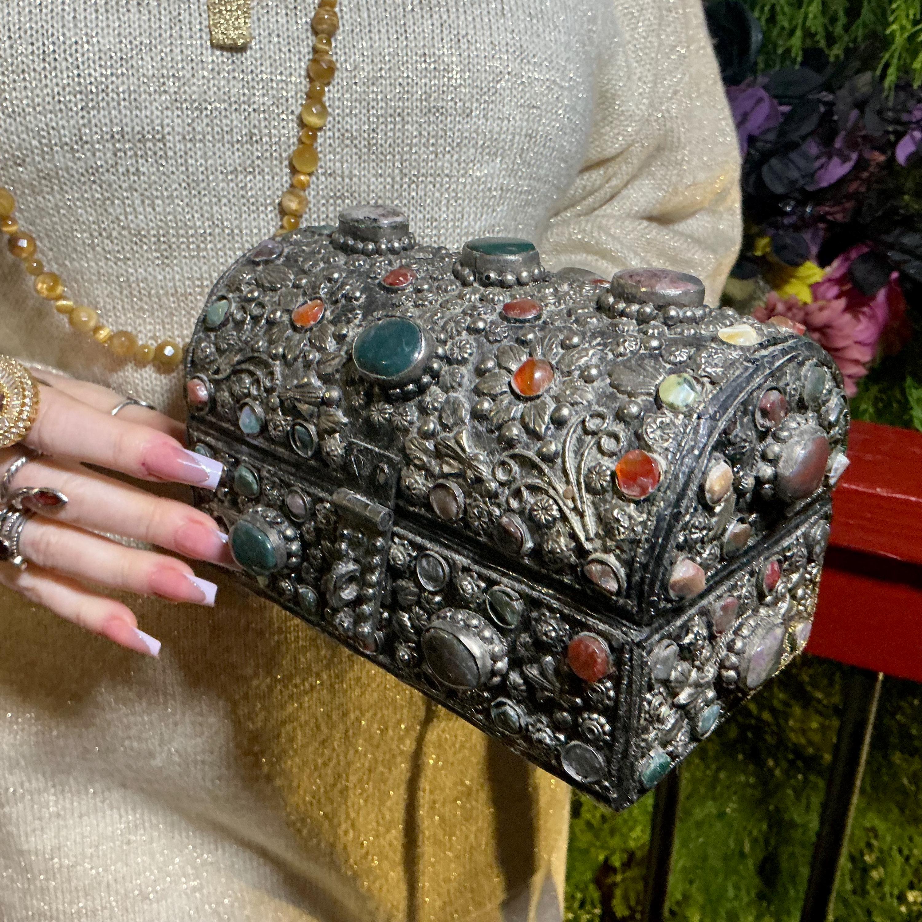 The Vintage Moroccan jewelry box is inlaid with semi-precious agate stones and covered with silvered metal filigree.