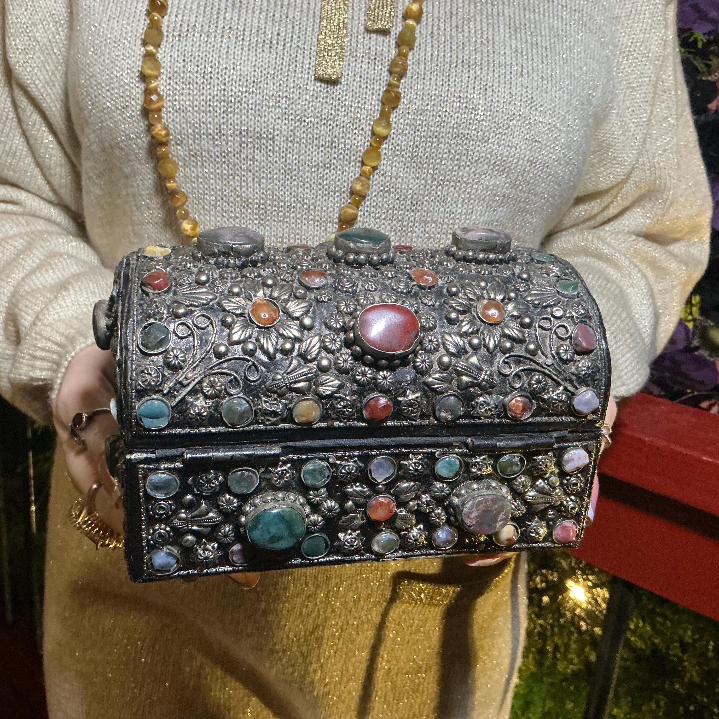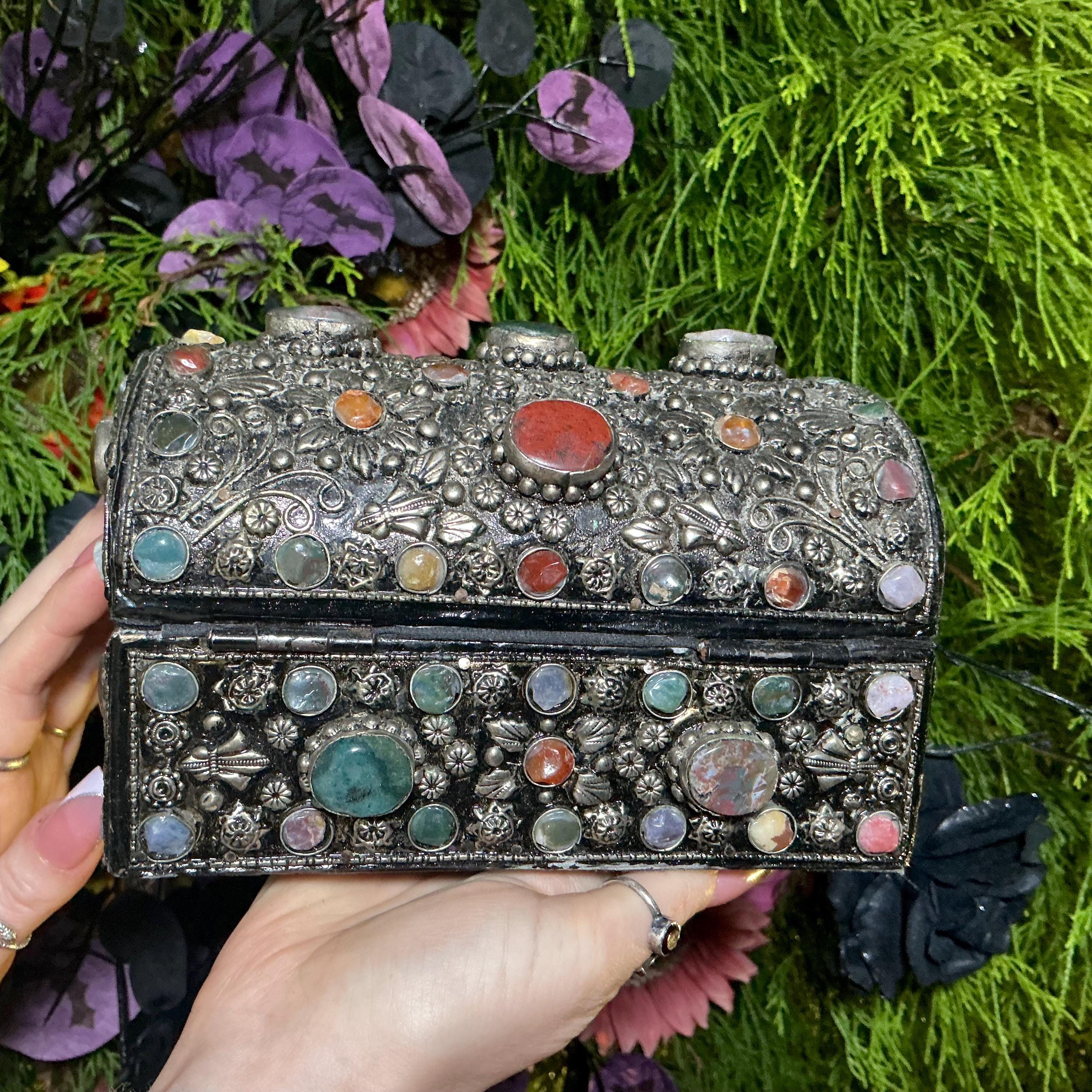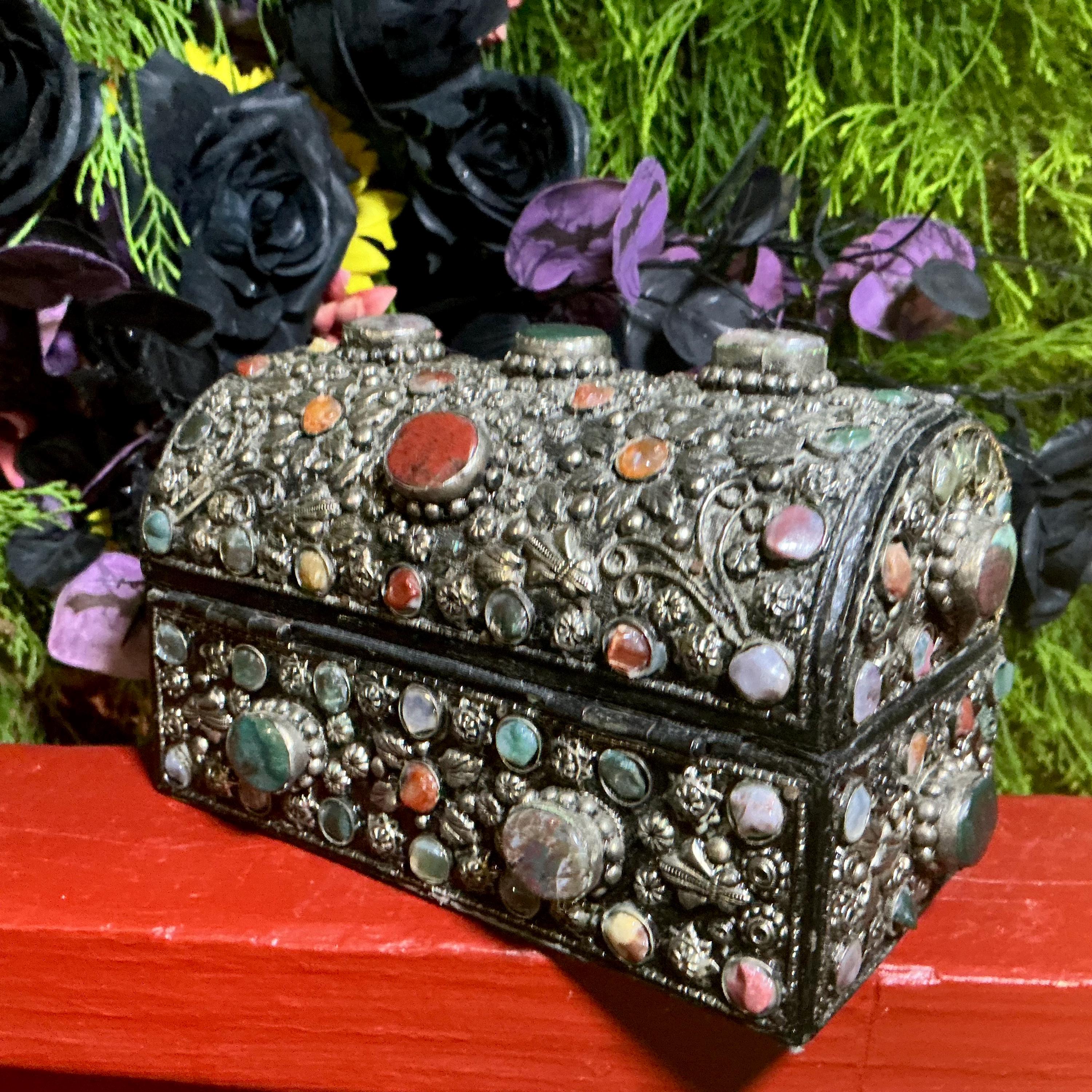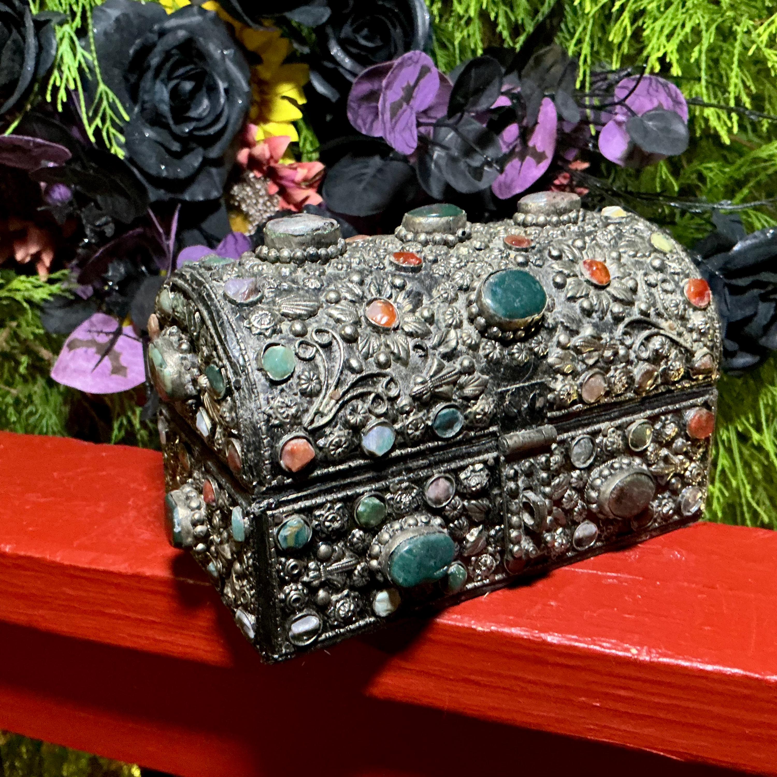 The Vintage Moroccan jewelry box is inlaid with semi-precious agate stones and covered with silvered metal filigree.