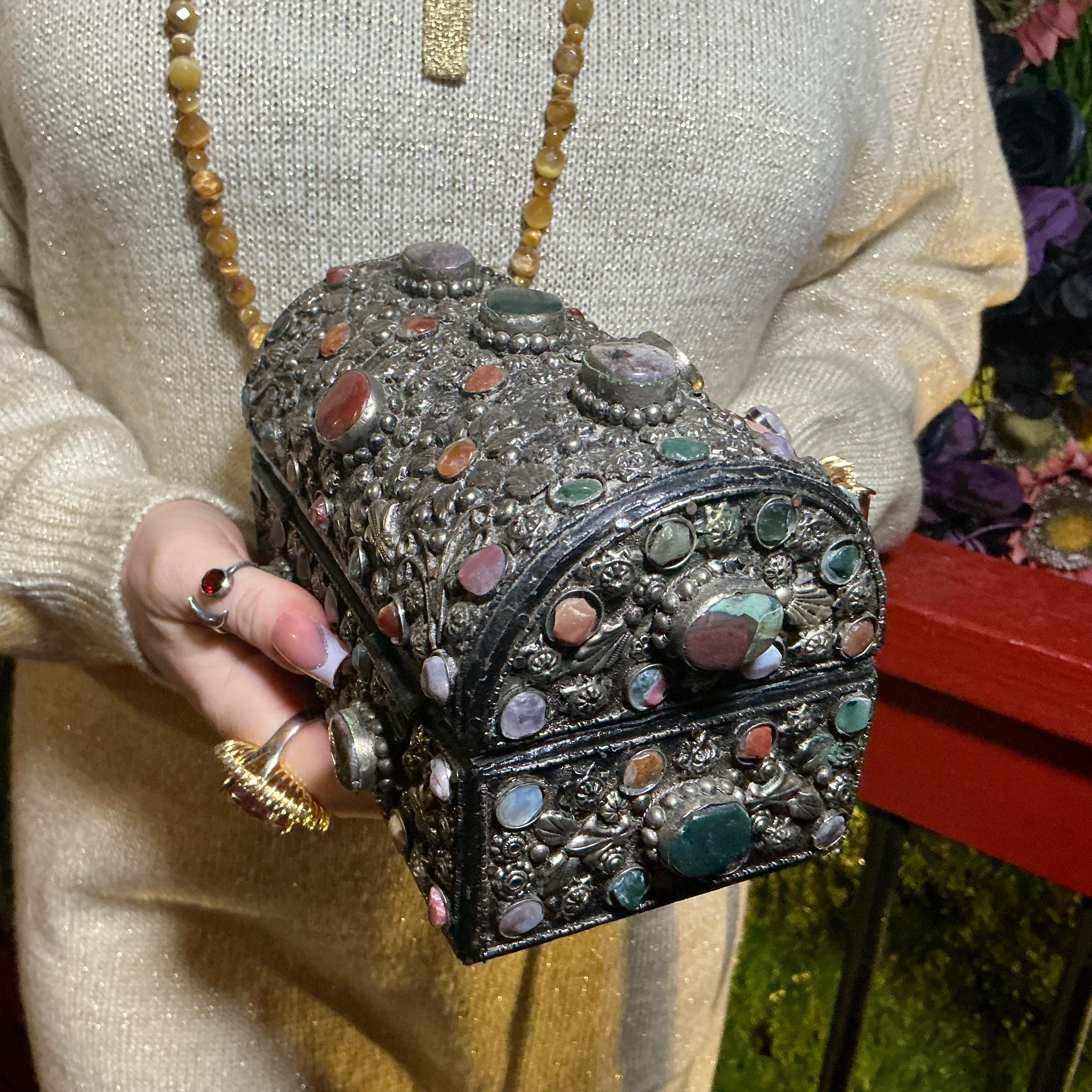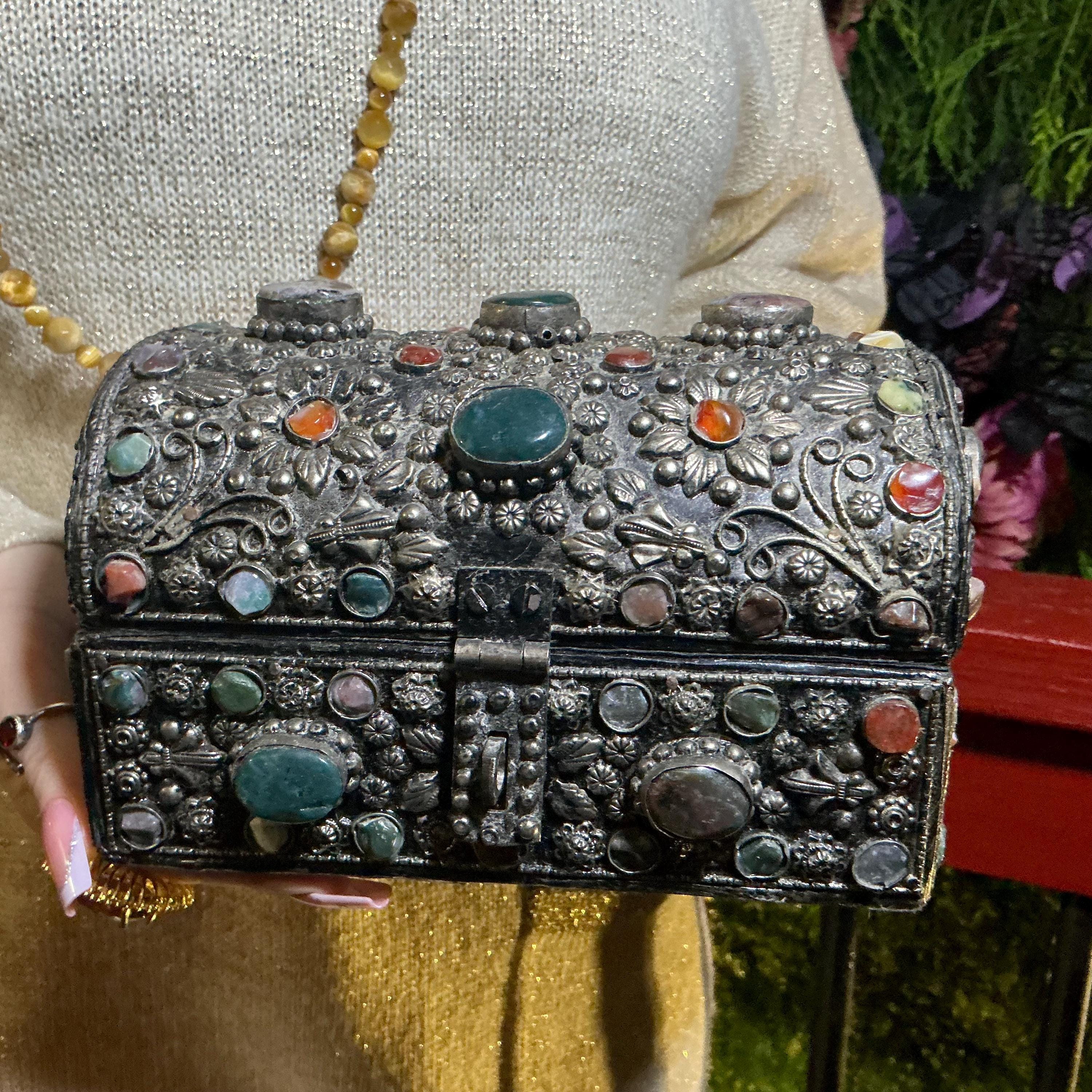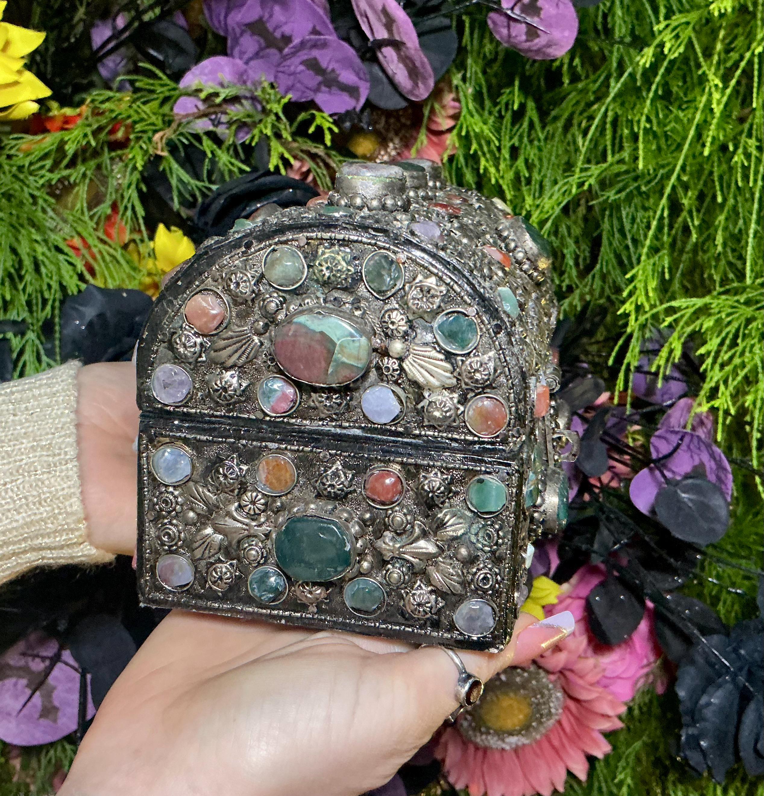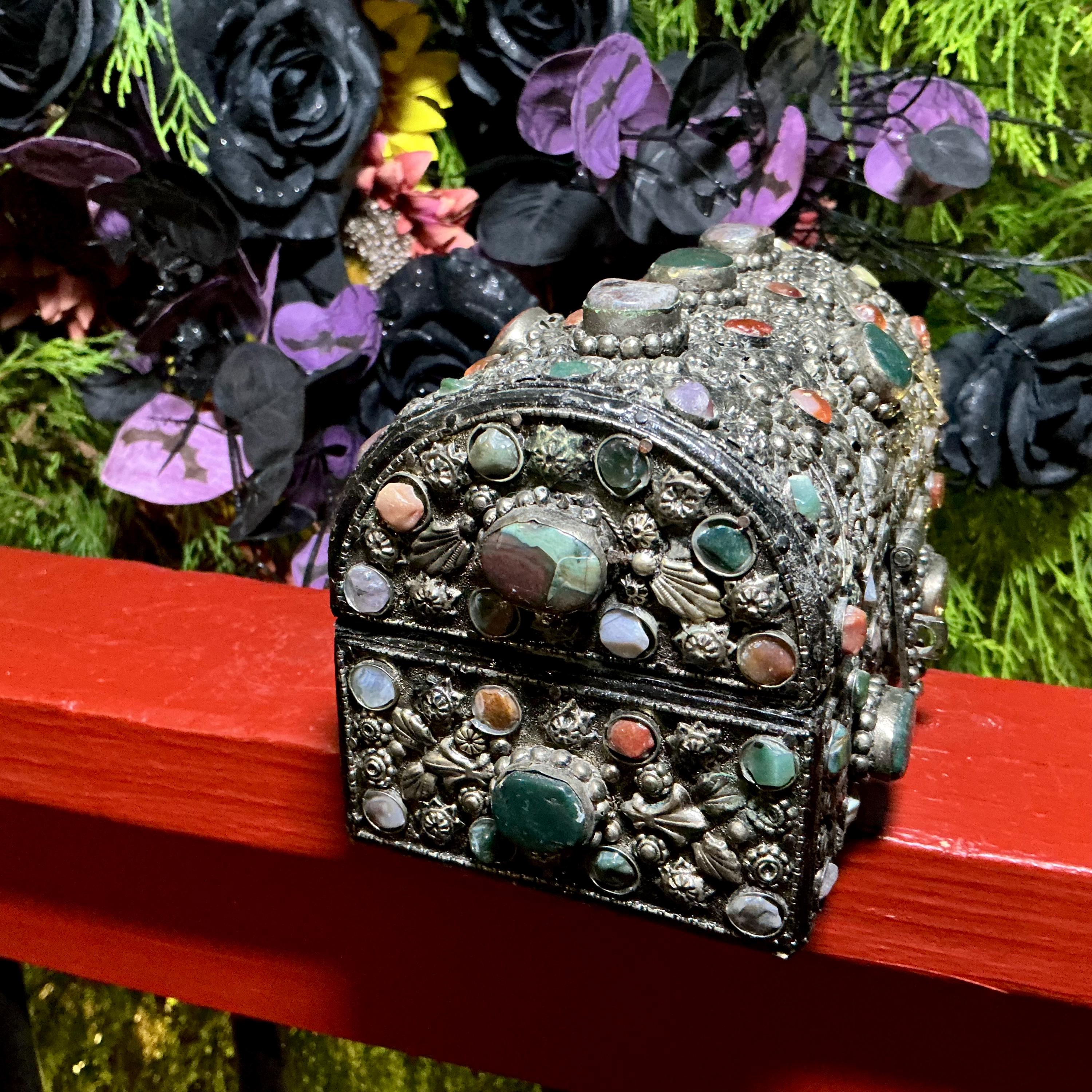 The Vintage Moroccan jewelry box is inlaid with semi-precious agate stones and covered with silvered metal filigree.