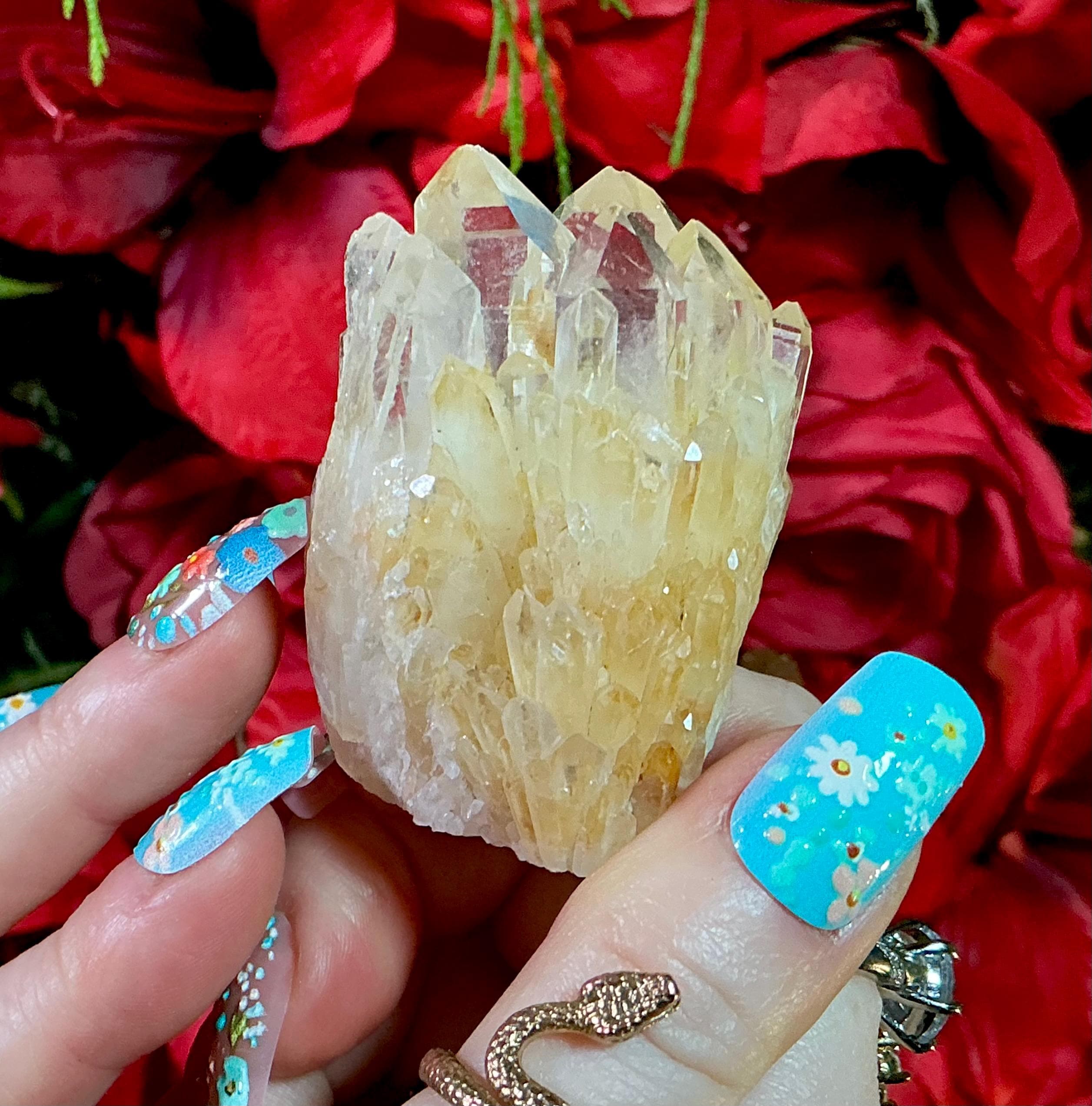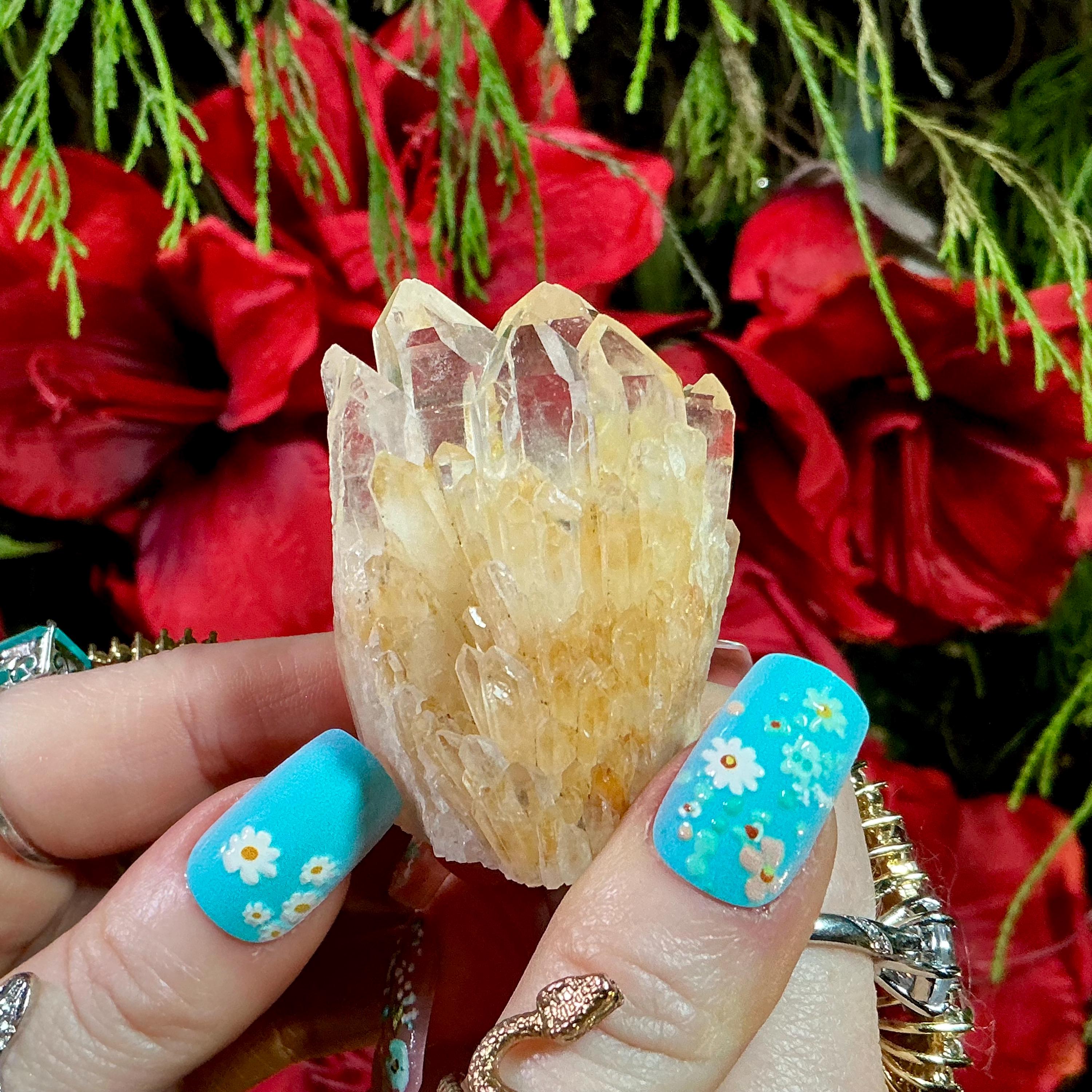 This rare Tibetan cluster is going to be the high light of your collection, and it is a perfect handheld size or perfect for your altar display.