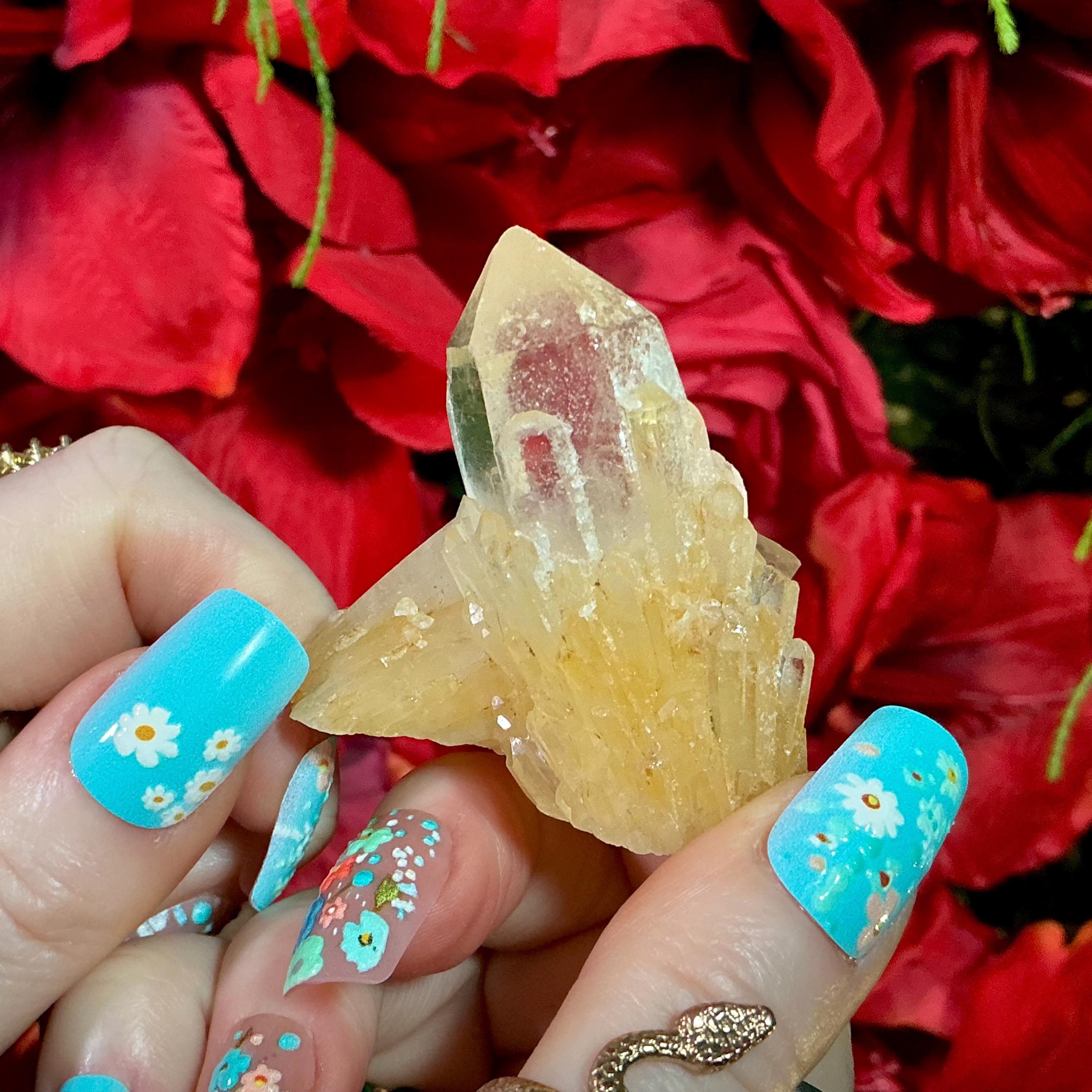 This rare Tibetan cluster is going to be the high light of your collection, and it is a perfect handheld size or perfect for your altar display.