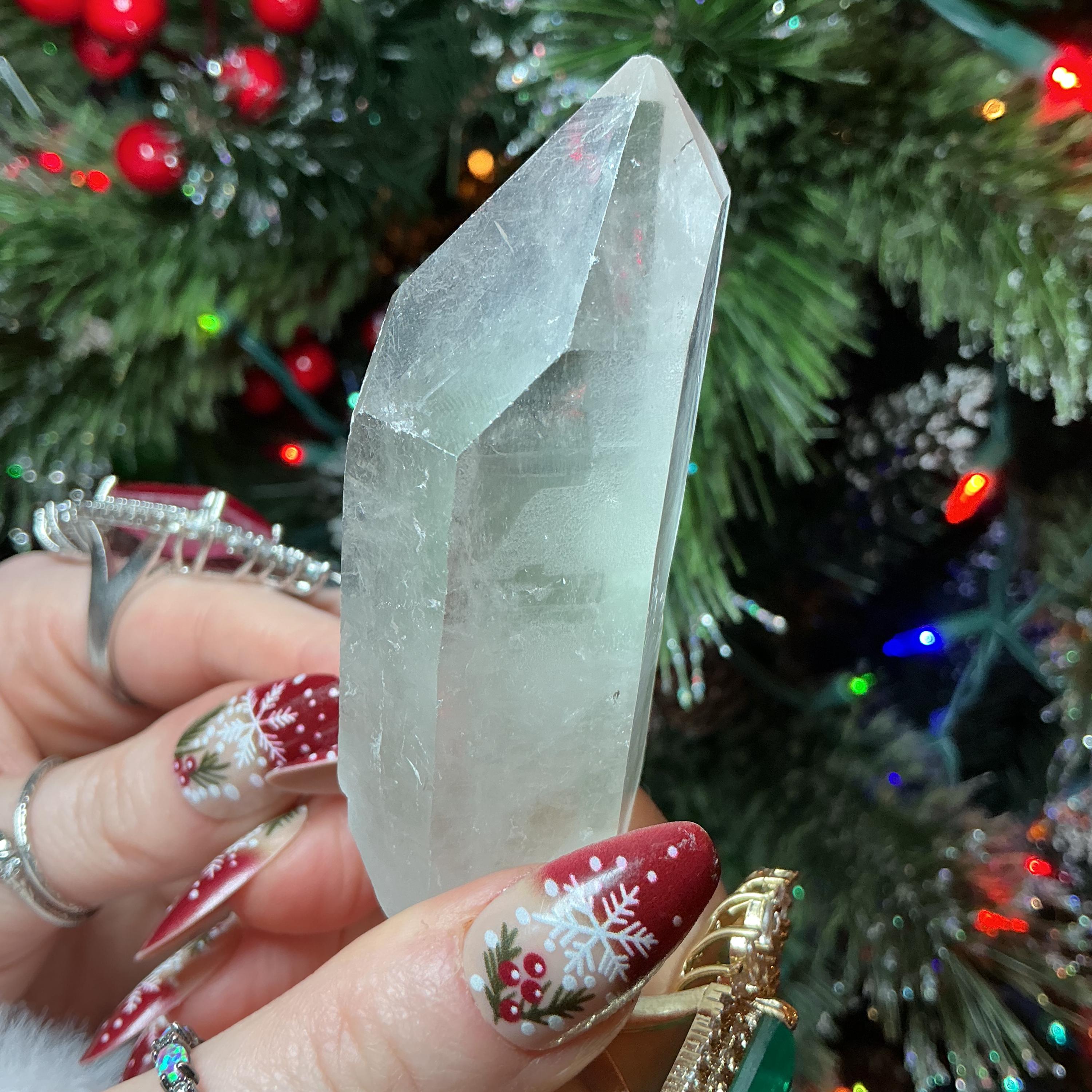 Clear Quartz Crystal Cluster ~ Natural Gem Cut Point ~ 3 1/2" Long ~ Big 3.4 oz. ~ Green Chlorite Inclusions, Silver phantoms