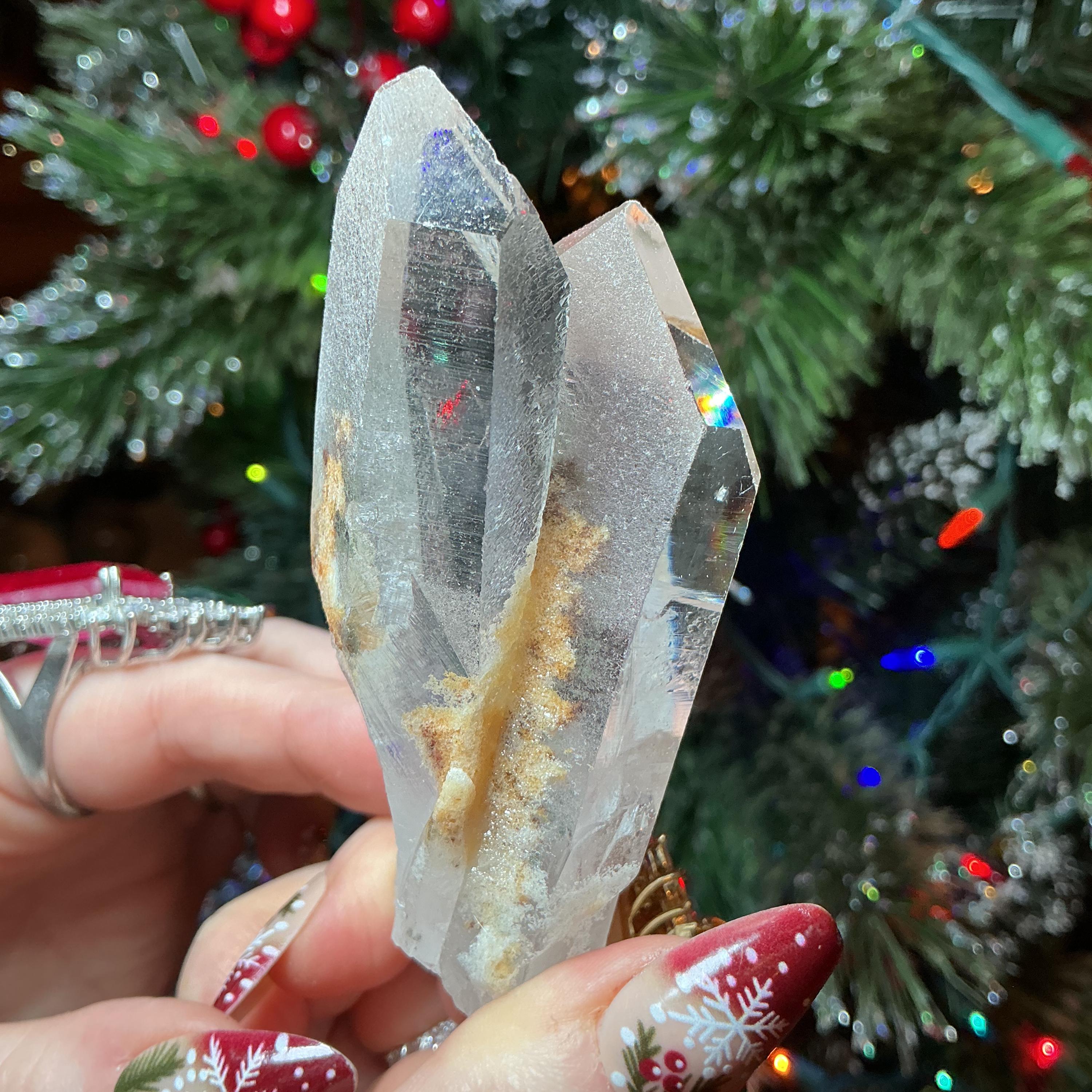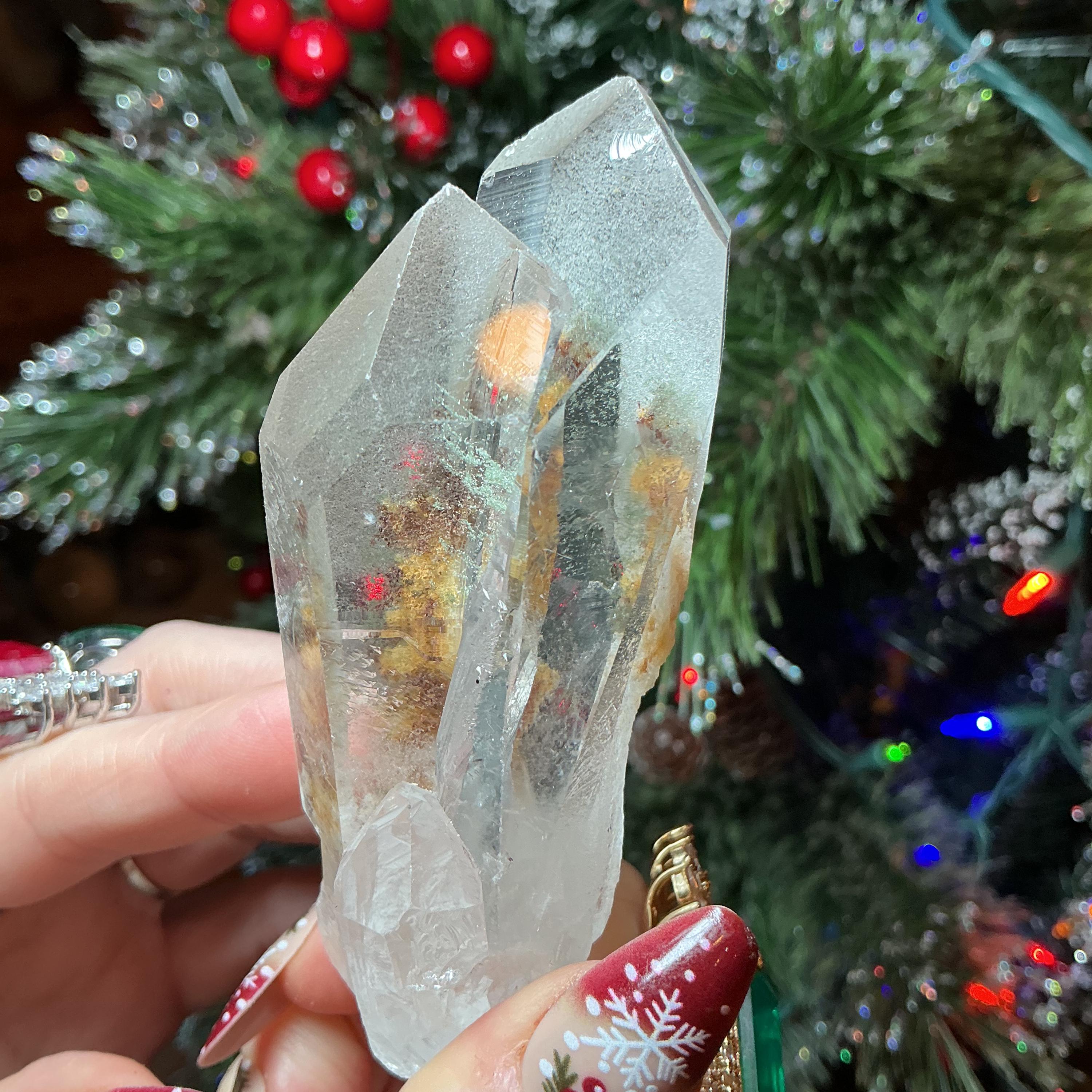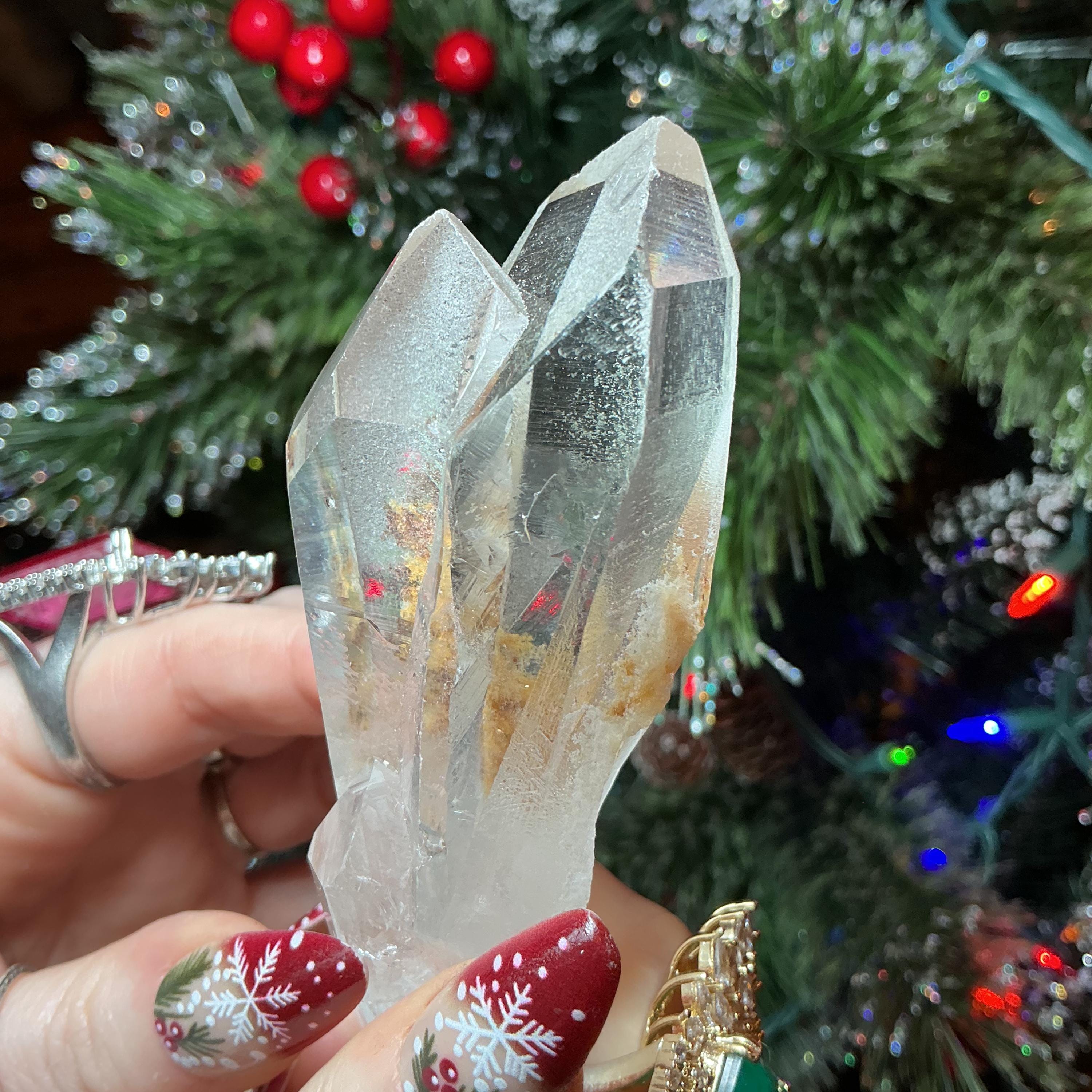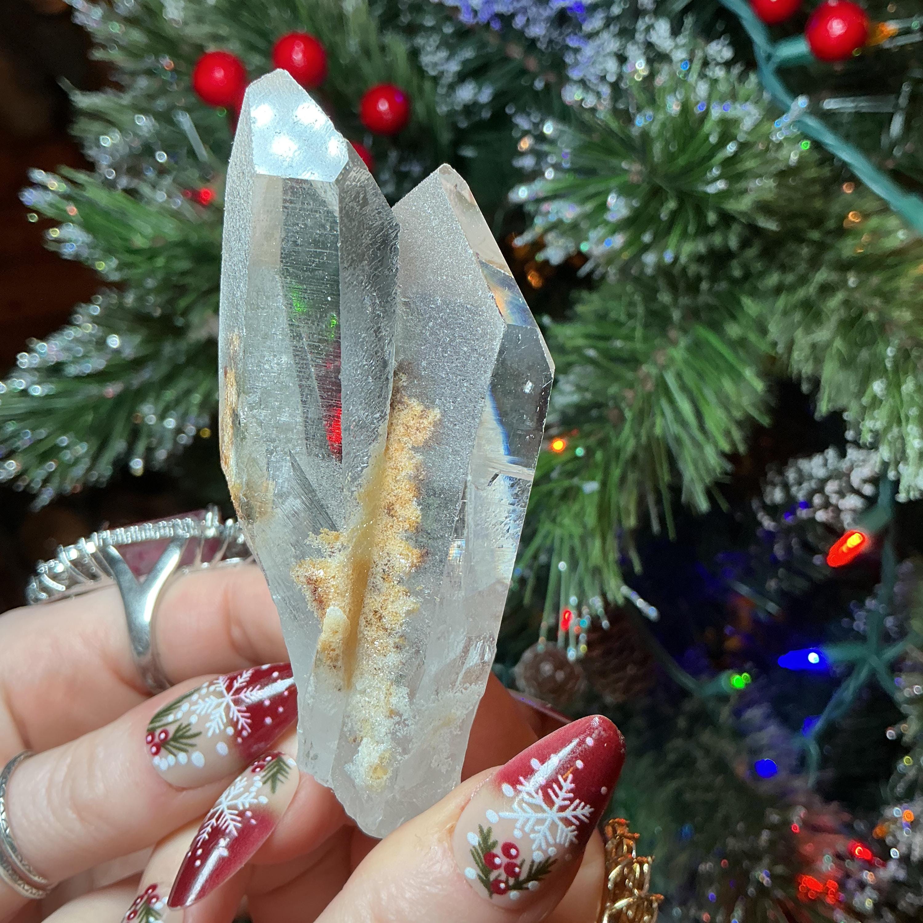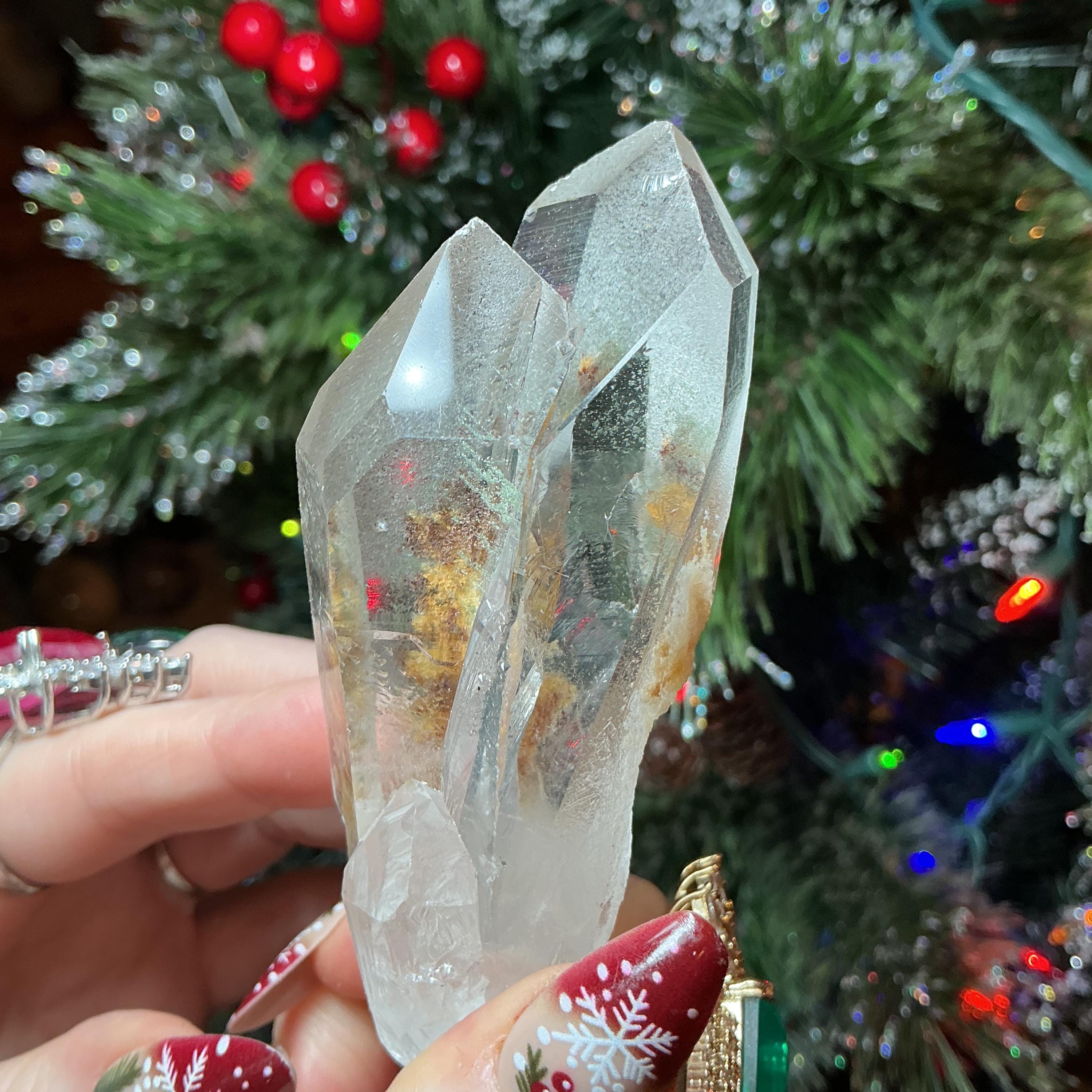 Clear Quartz Crystal Cluster ~ 4.4 oz. ~ 4" Long ~ Green Chlorite, Golden Healer Inclusions, Twin Points