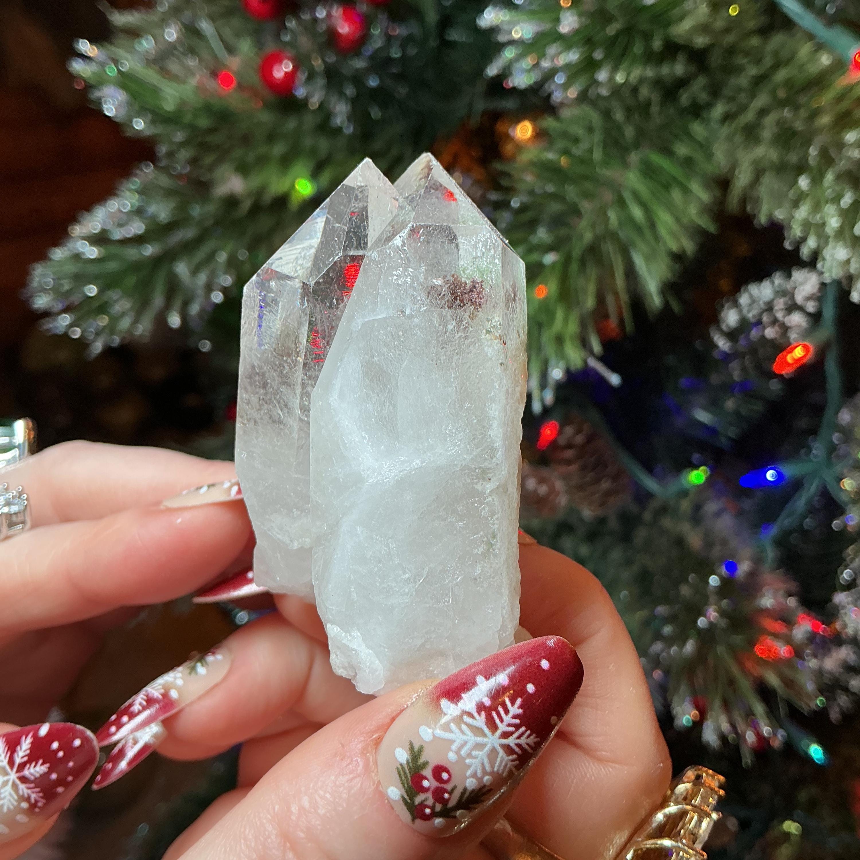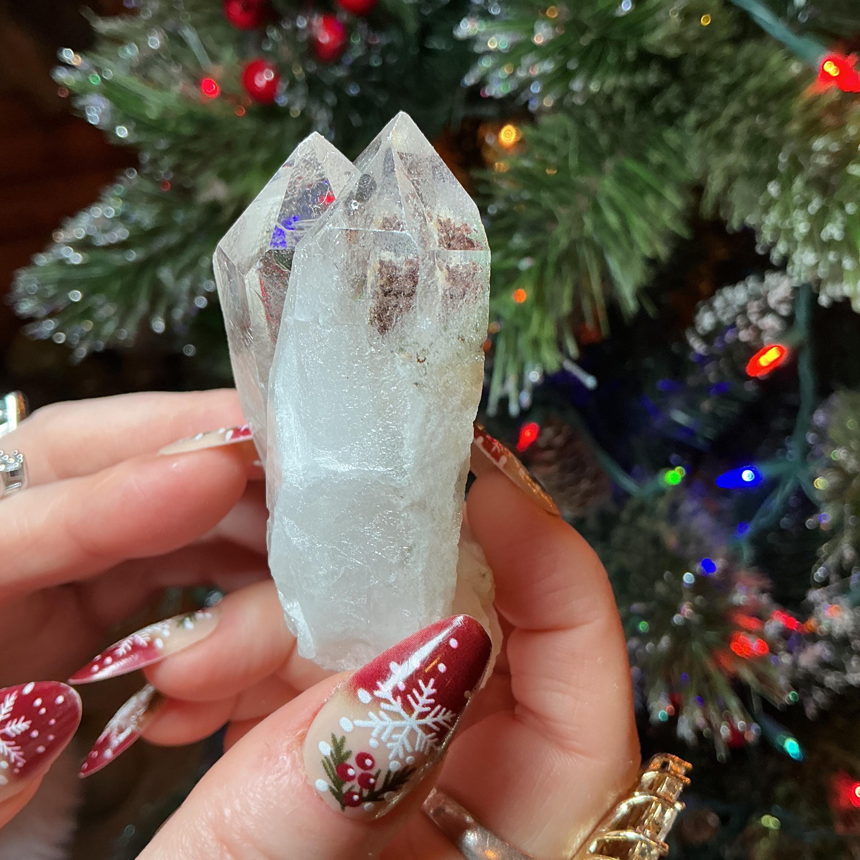 Clear Quartz Crystal Cluster ~ Gem Cut Twin Points ~ 3" Long ~ Big 3 oz. ~ Green Chlorite Inclusions, Silver phantoms, Free Standing