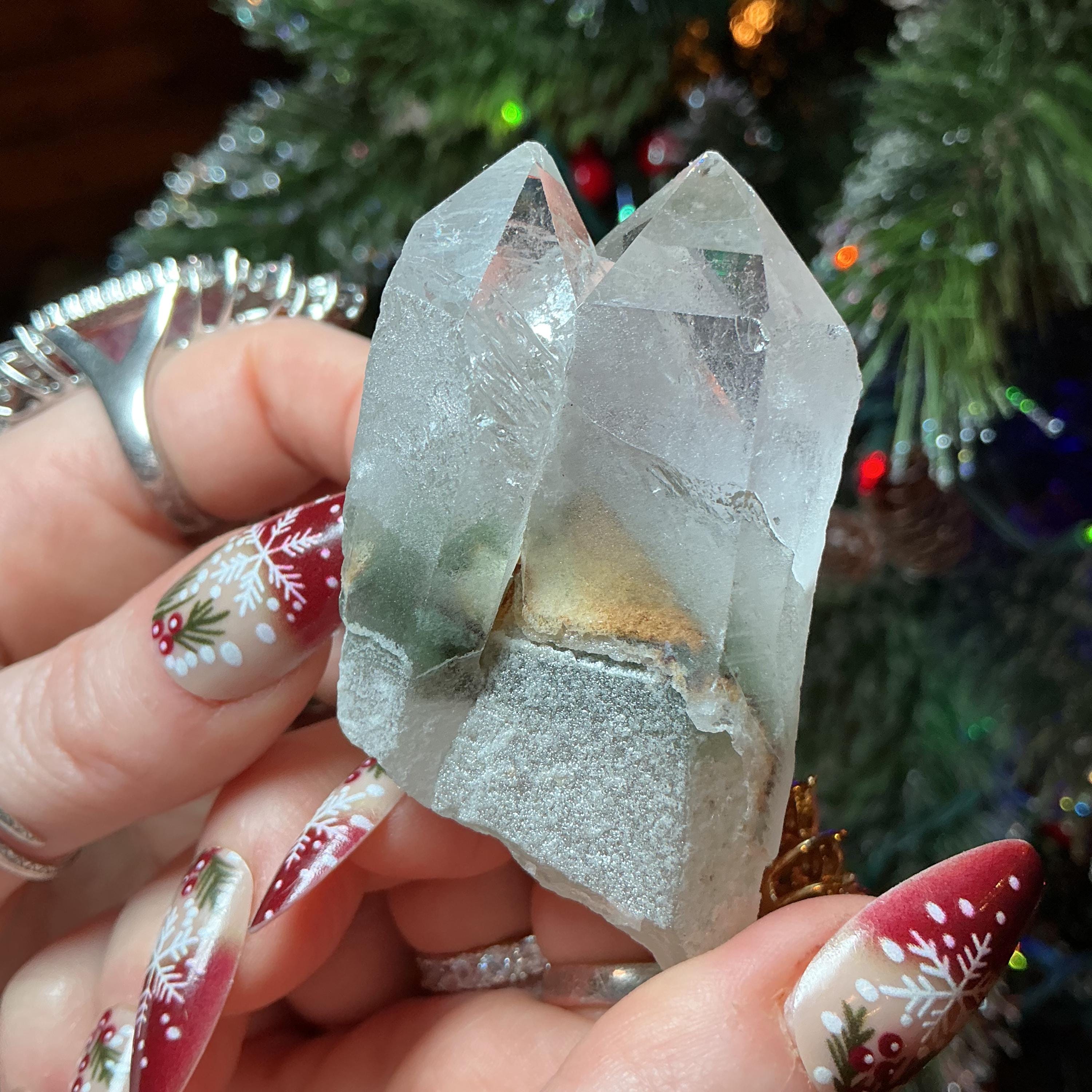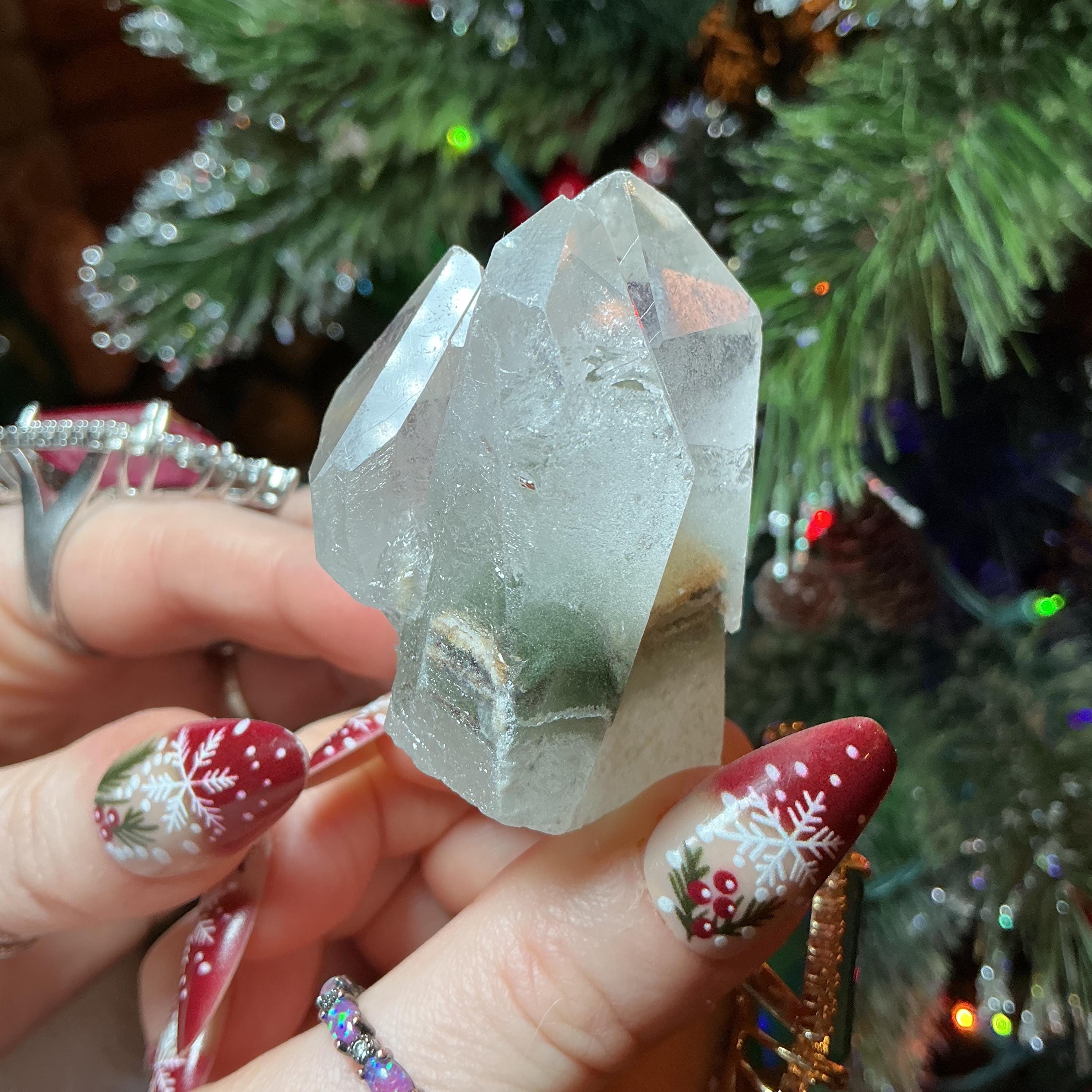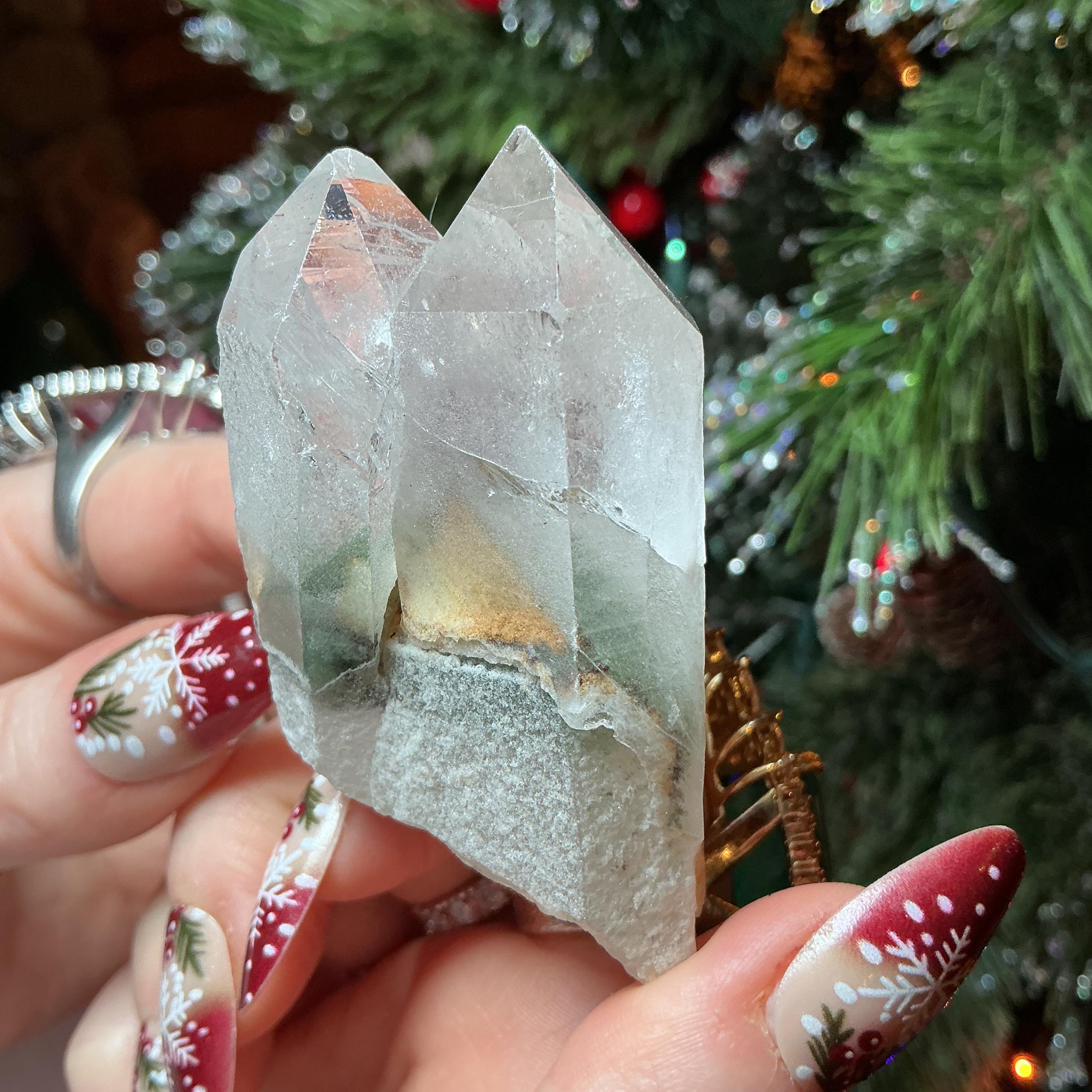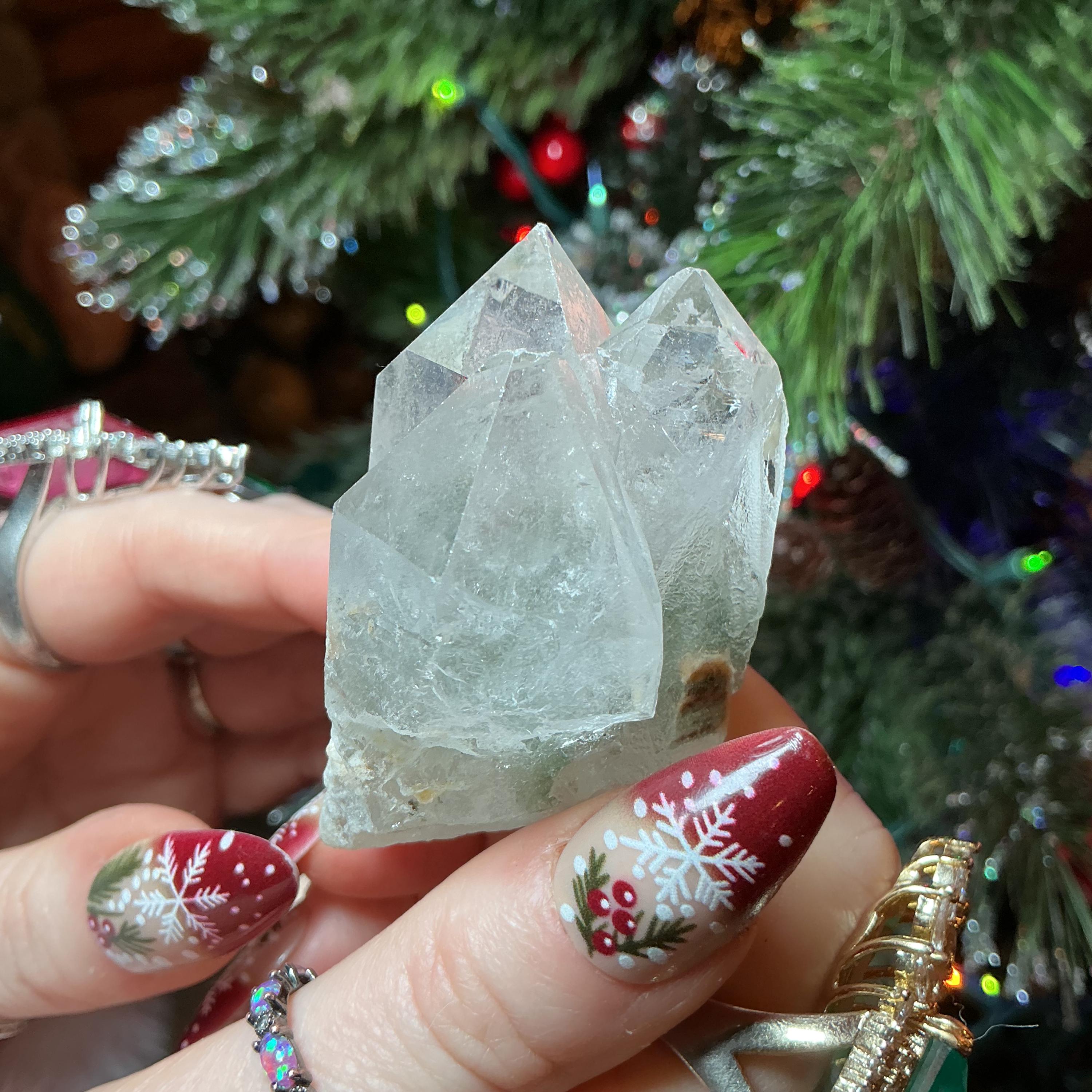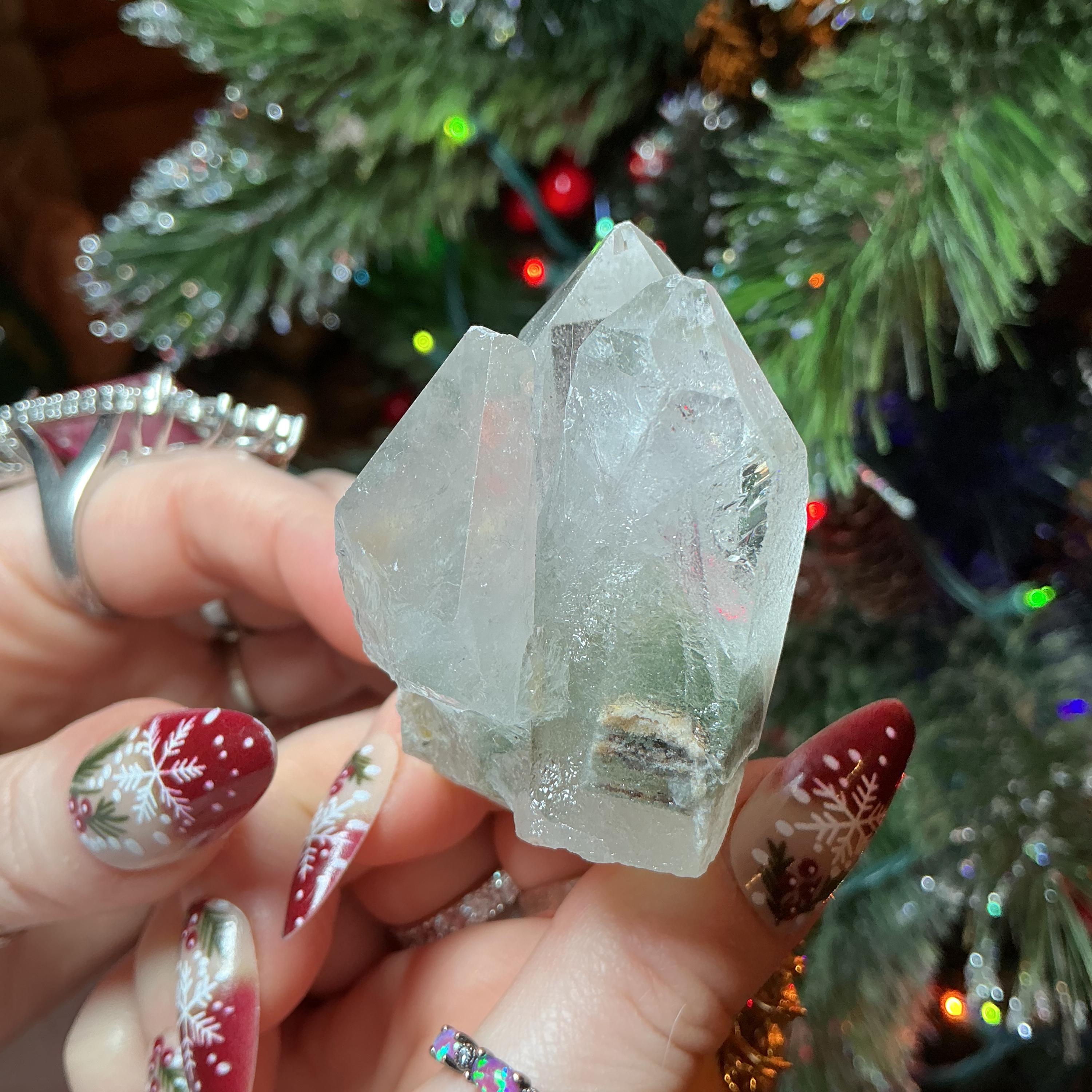 Clear Quartz Crystal Cluster ~ Gem Cut Triple Points ~ 2 1/2" Long ~ Big 3.5 oz. ~ Green Chlorite Inclusions, Silver phantoms, Free Standing