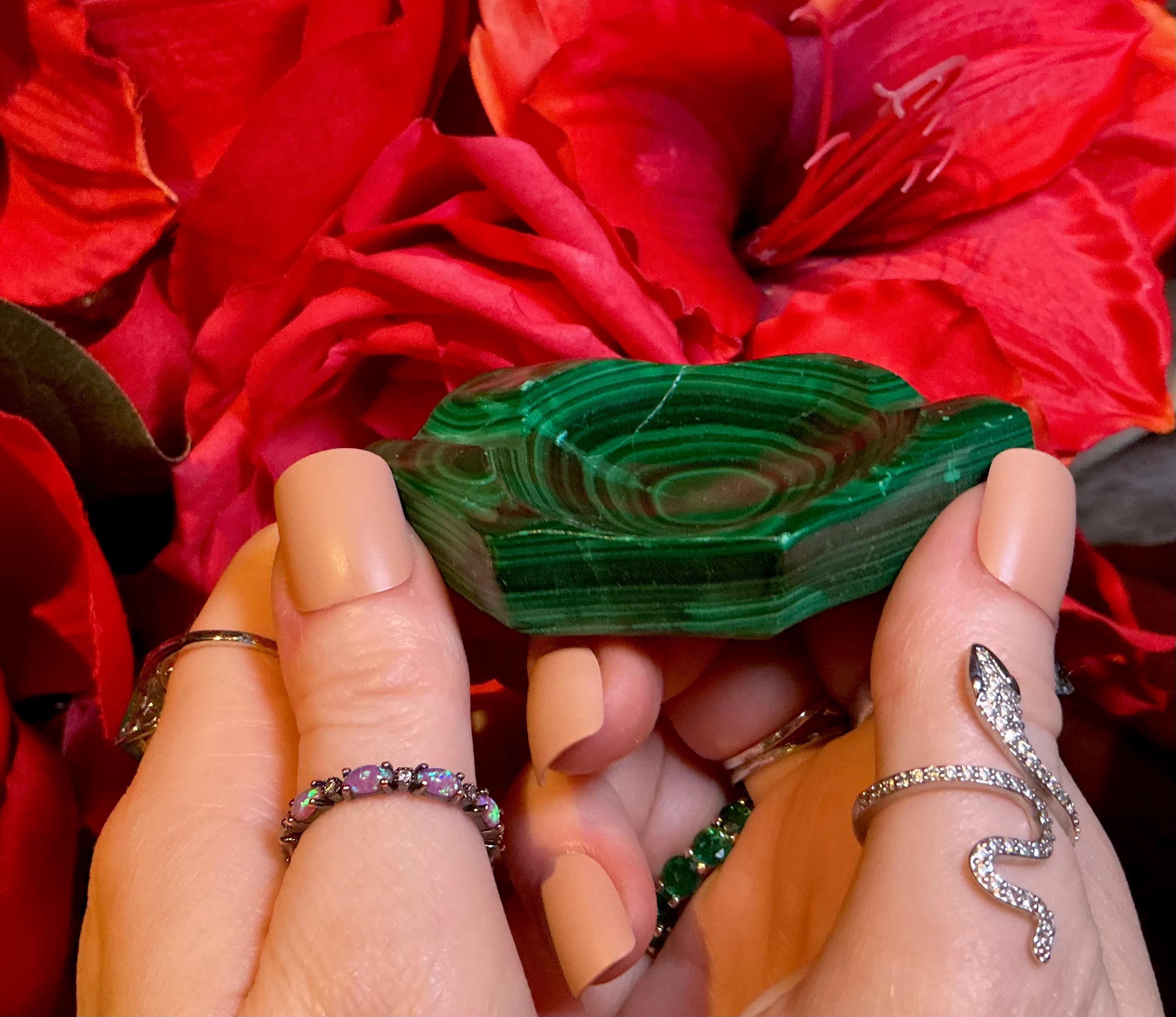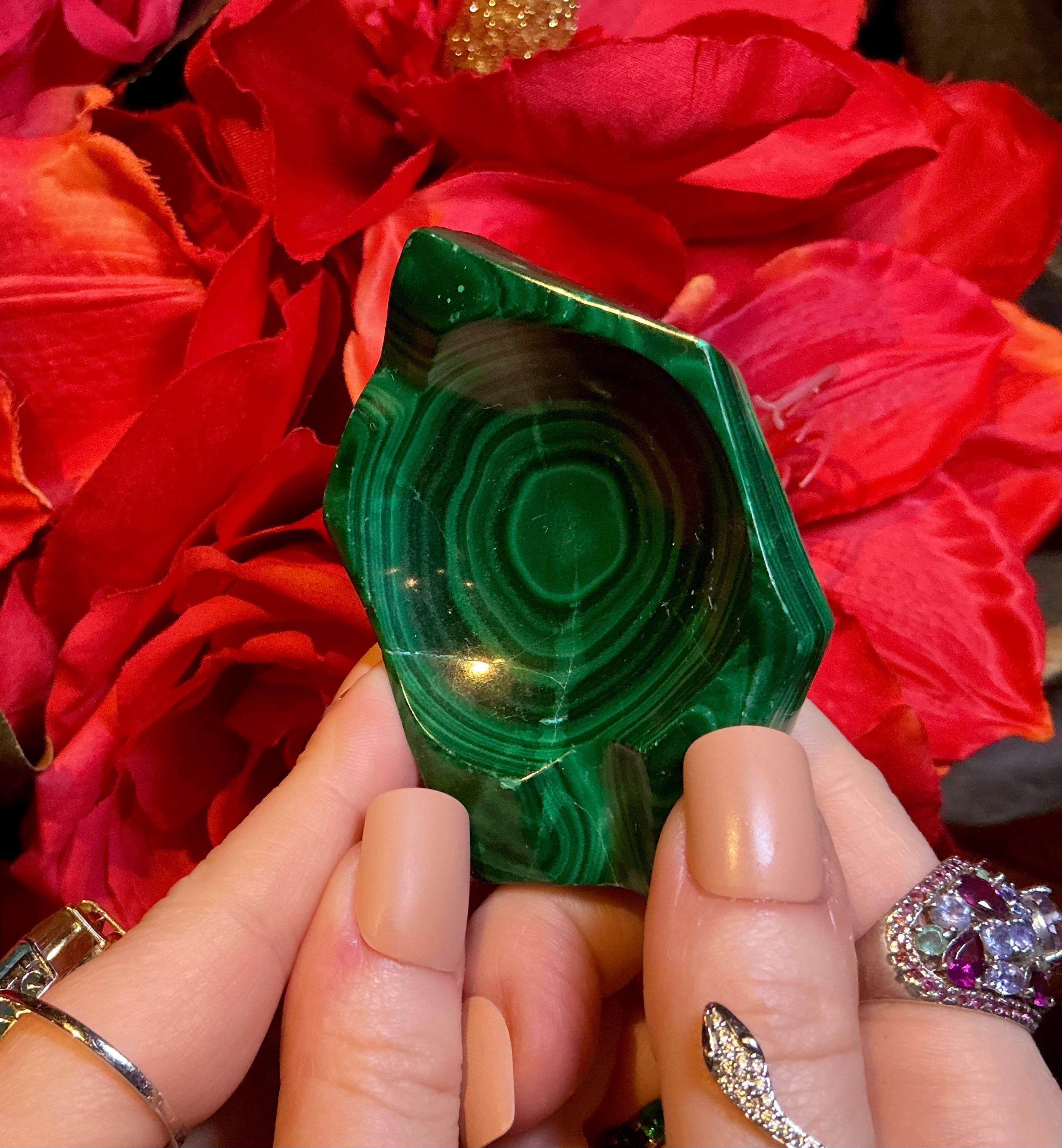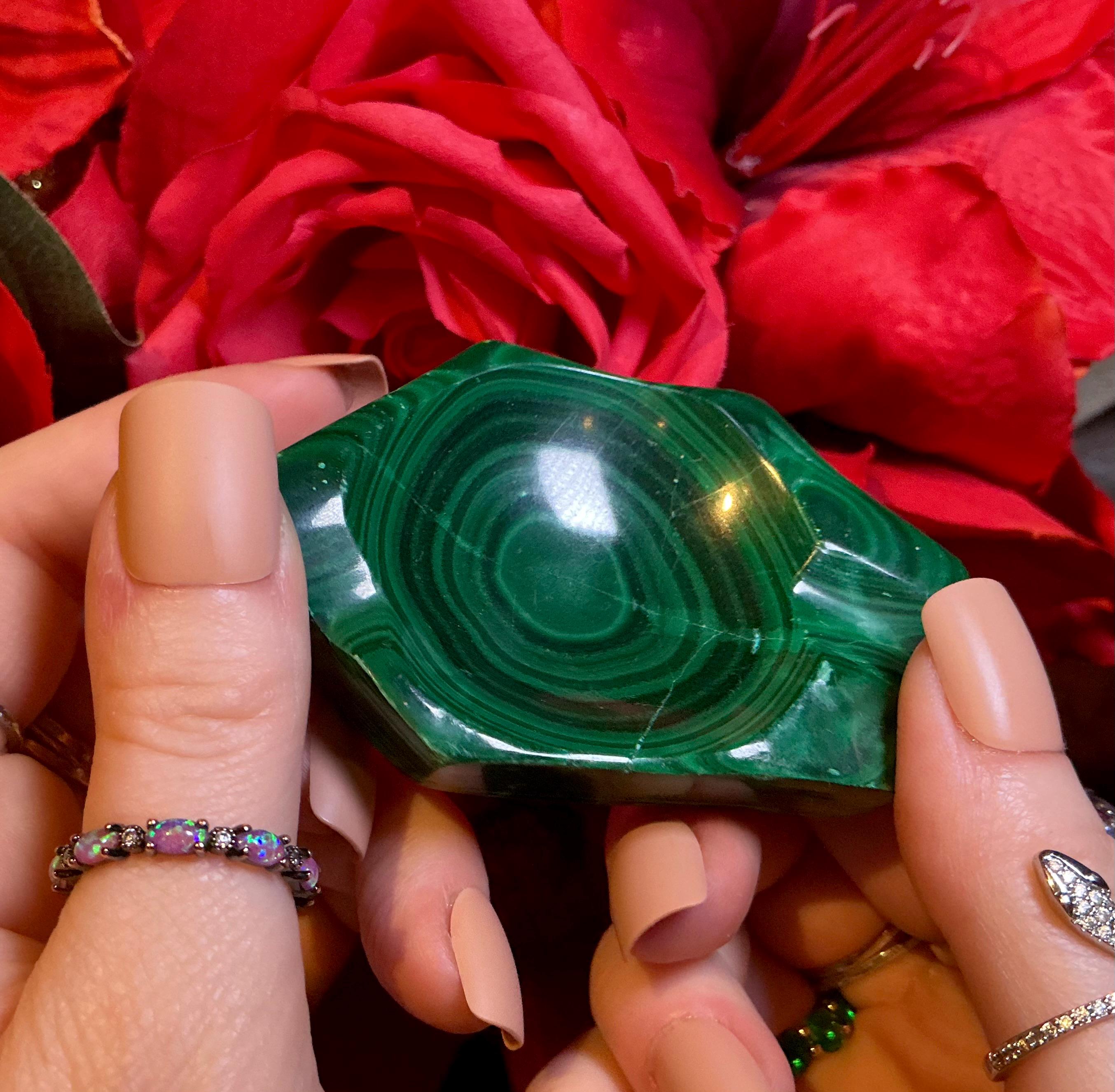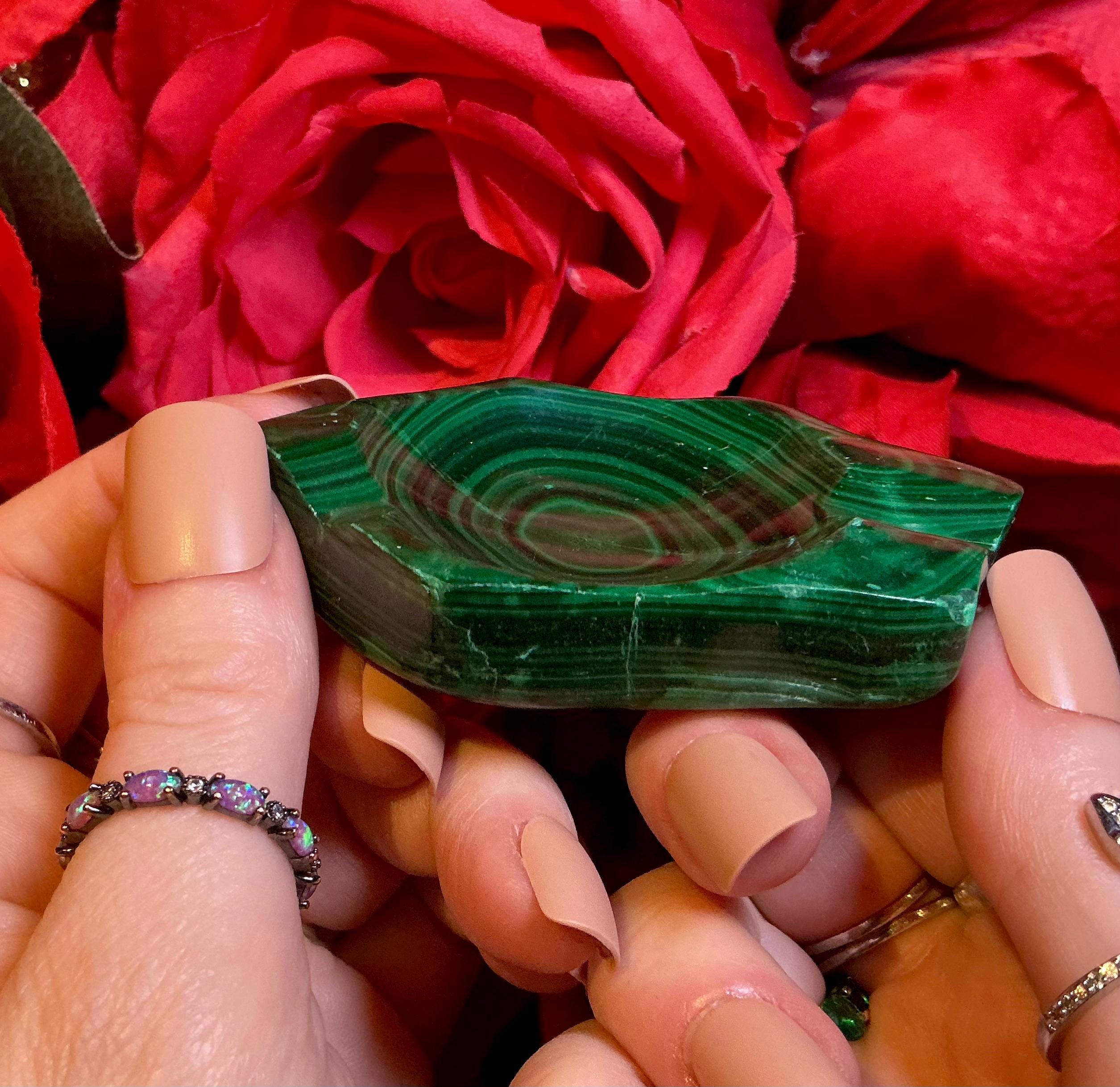This gorgeous malachite free form stone dish is perfection the vibrant deep green colors swirling into beautiful patterns, is unique only to this mineral making it truly a remarkable piece for your collection.