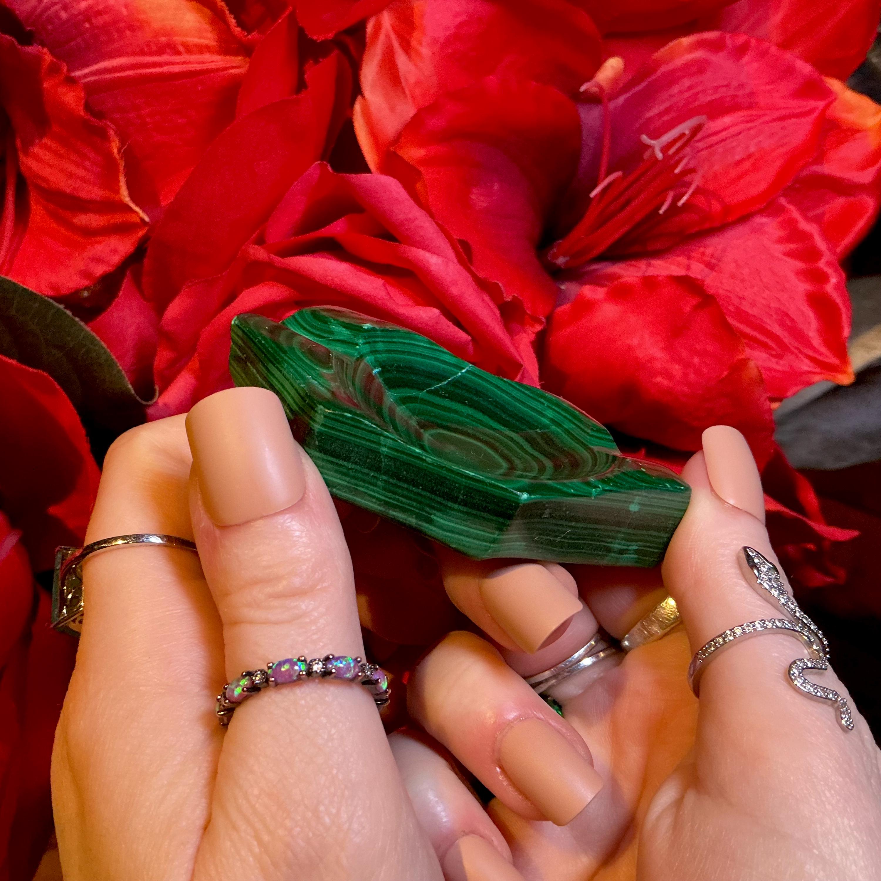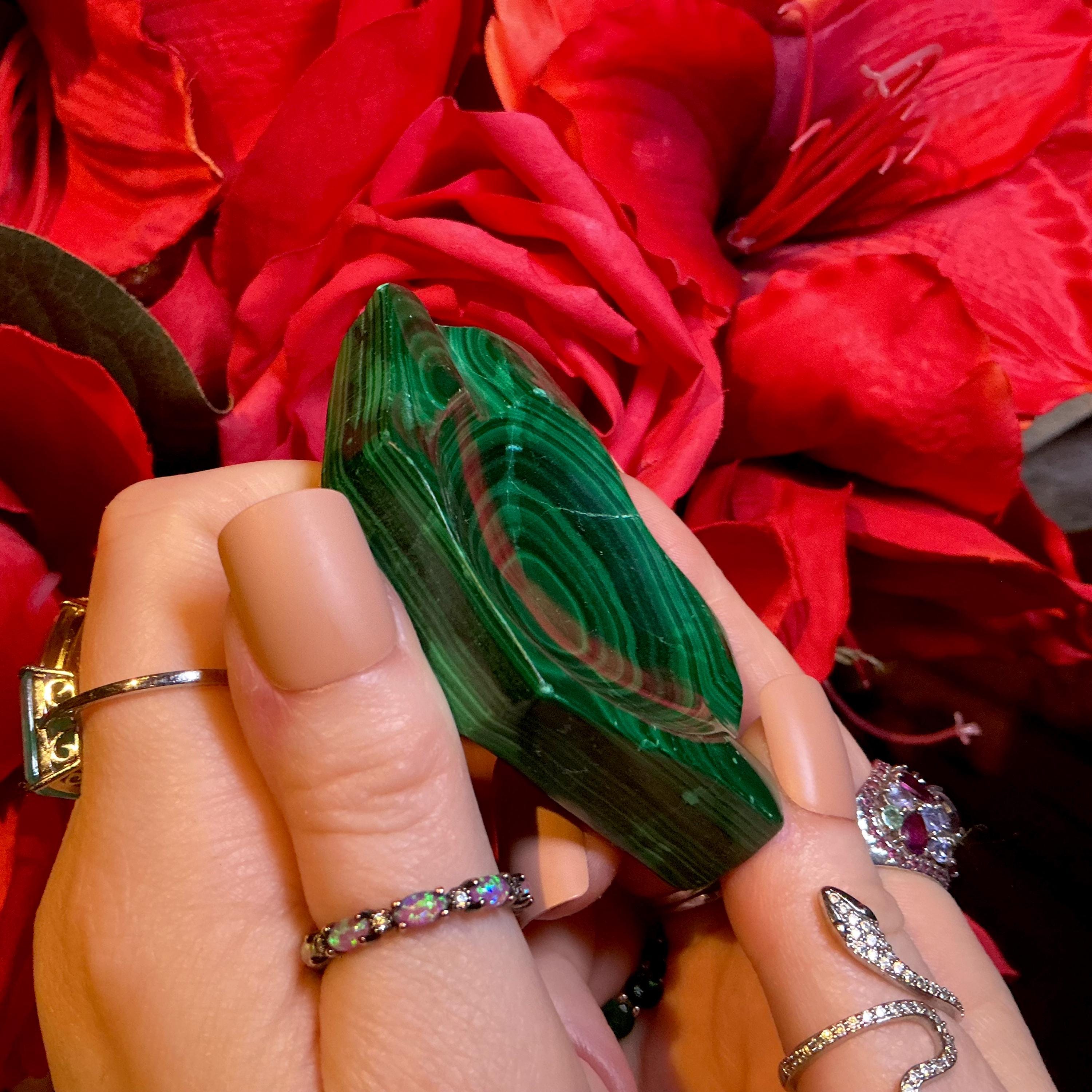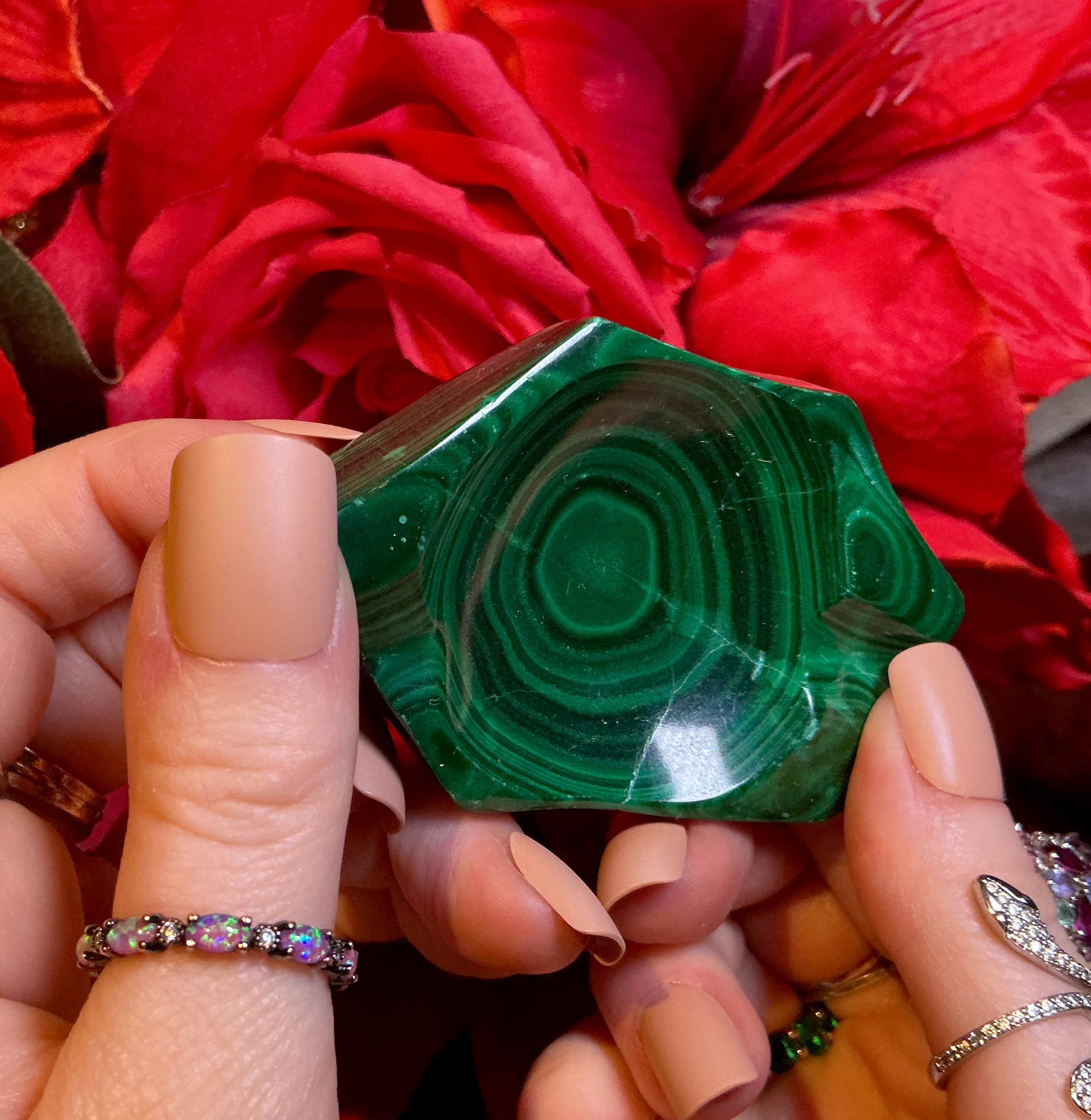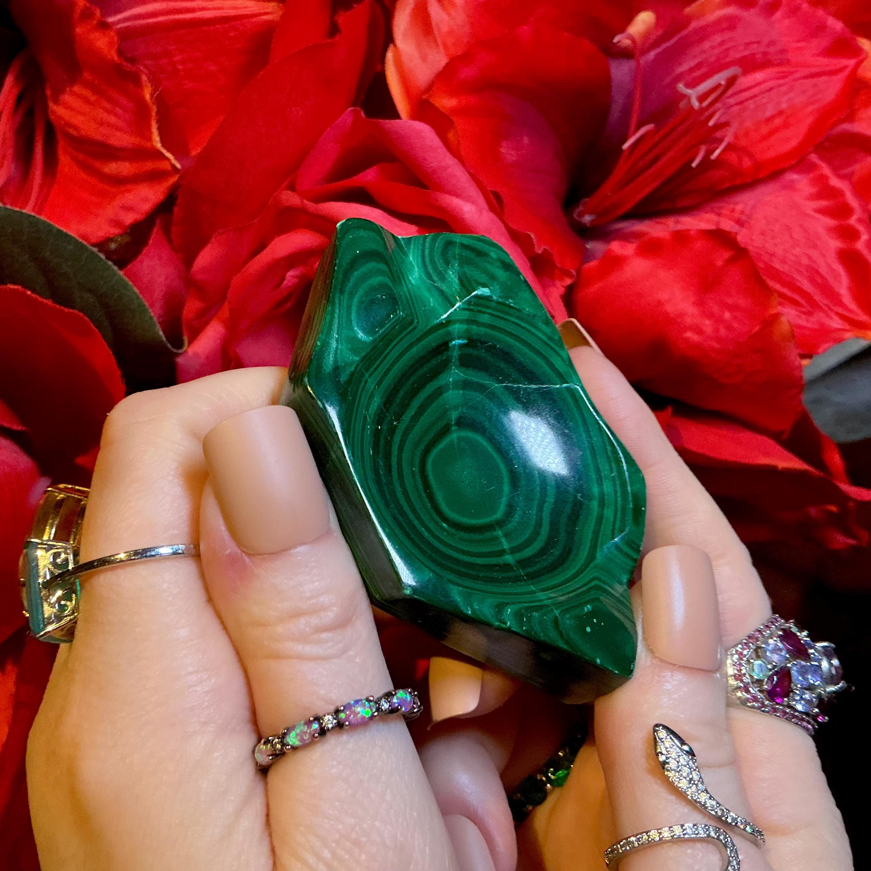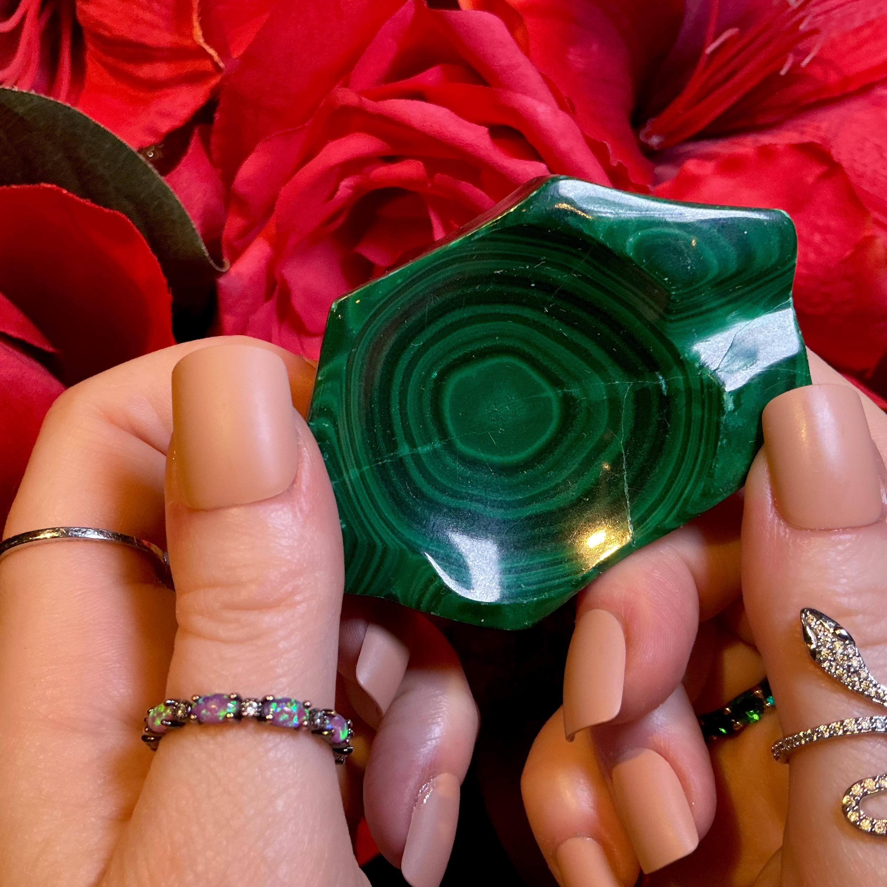 This gorgeous malachite free form stone dish is perfection the vibrant deep green colors swirling into beautiful patterns, is unique only to this mineral making it truly a remarkable piece for your collection.