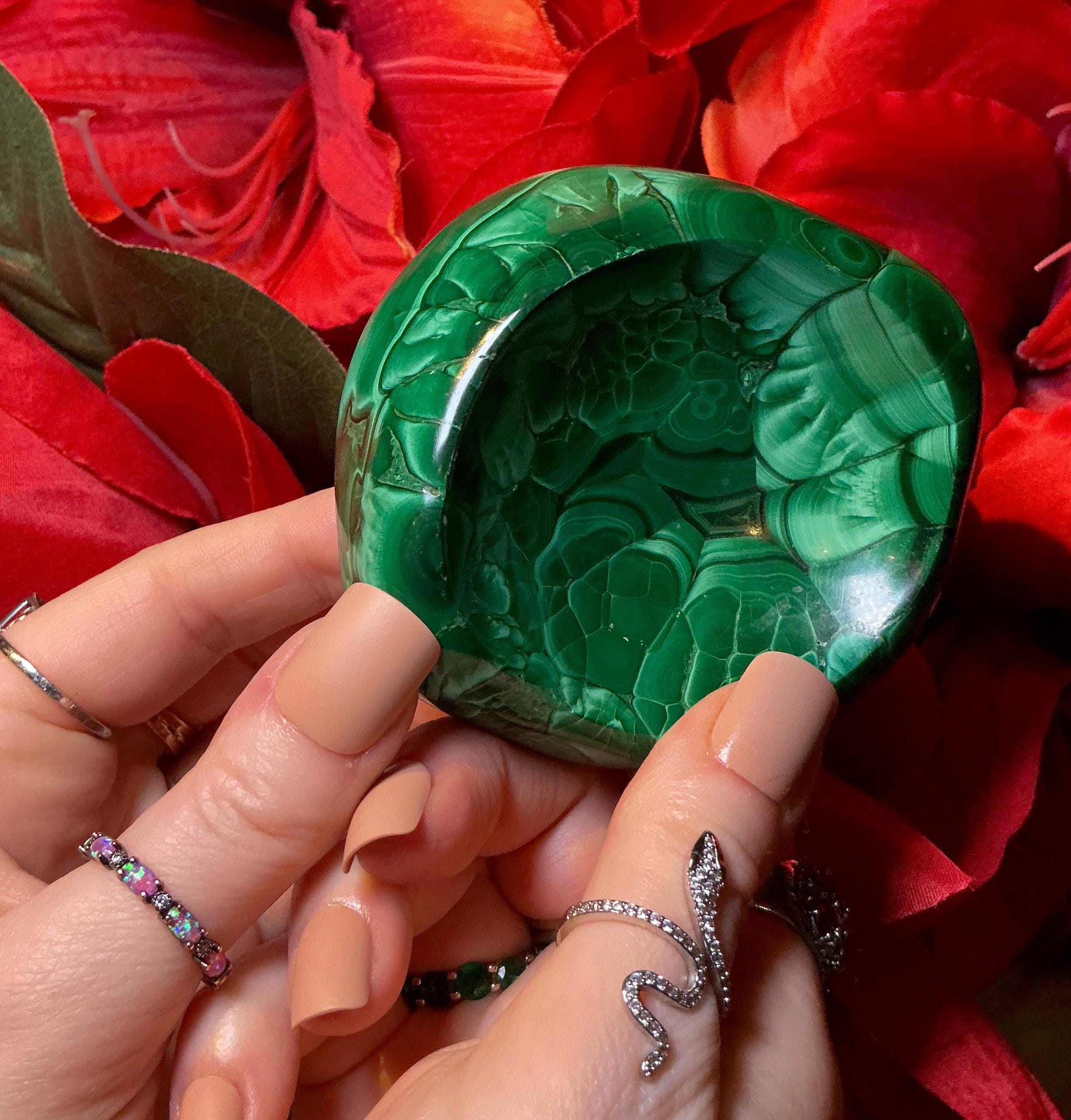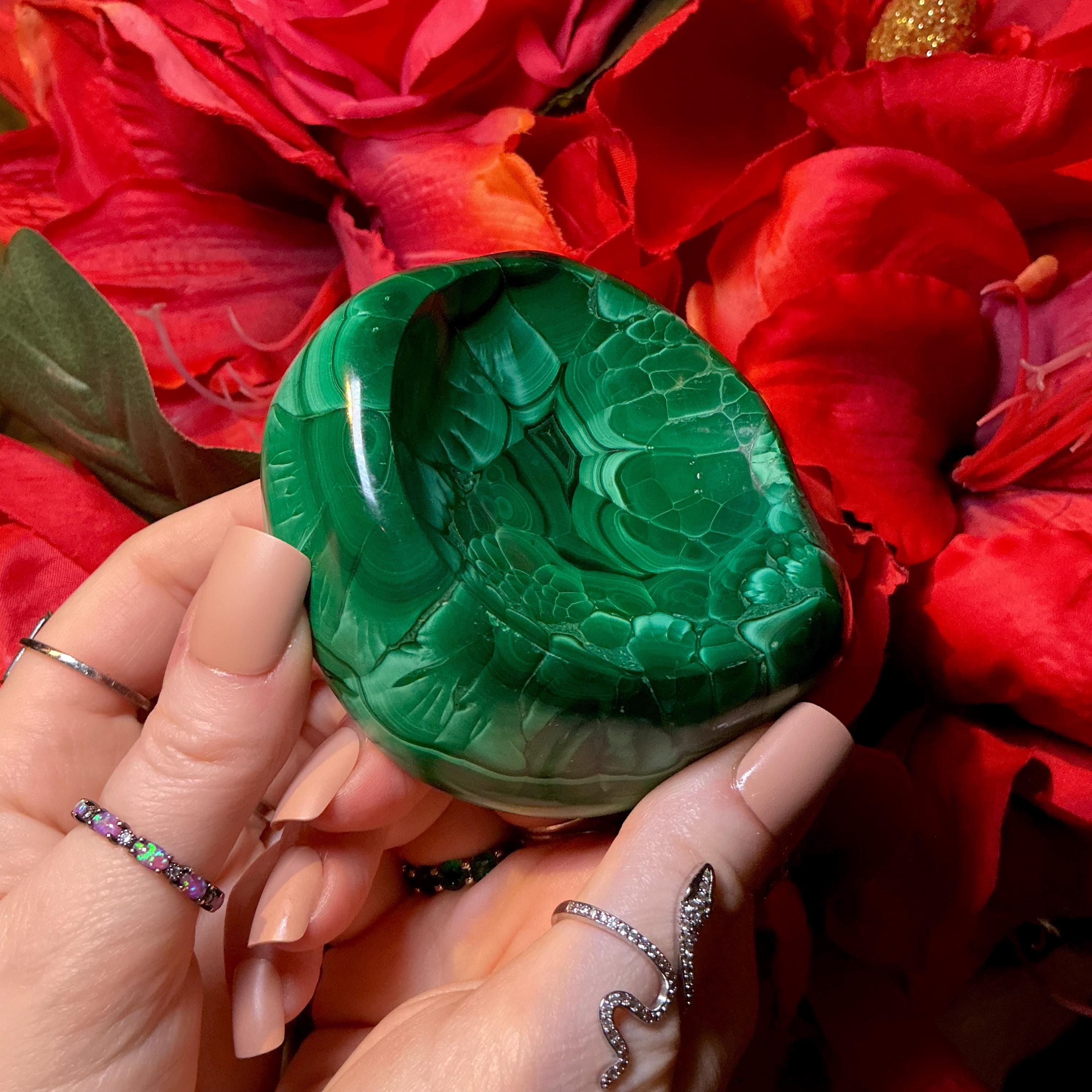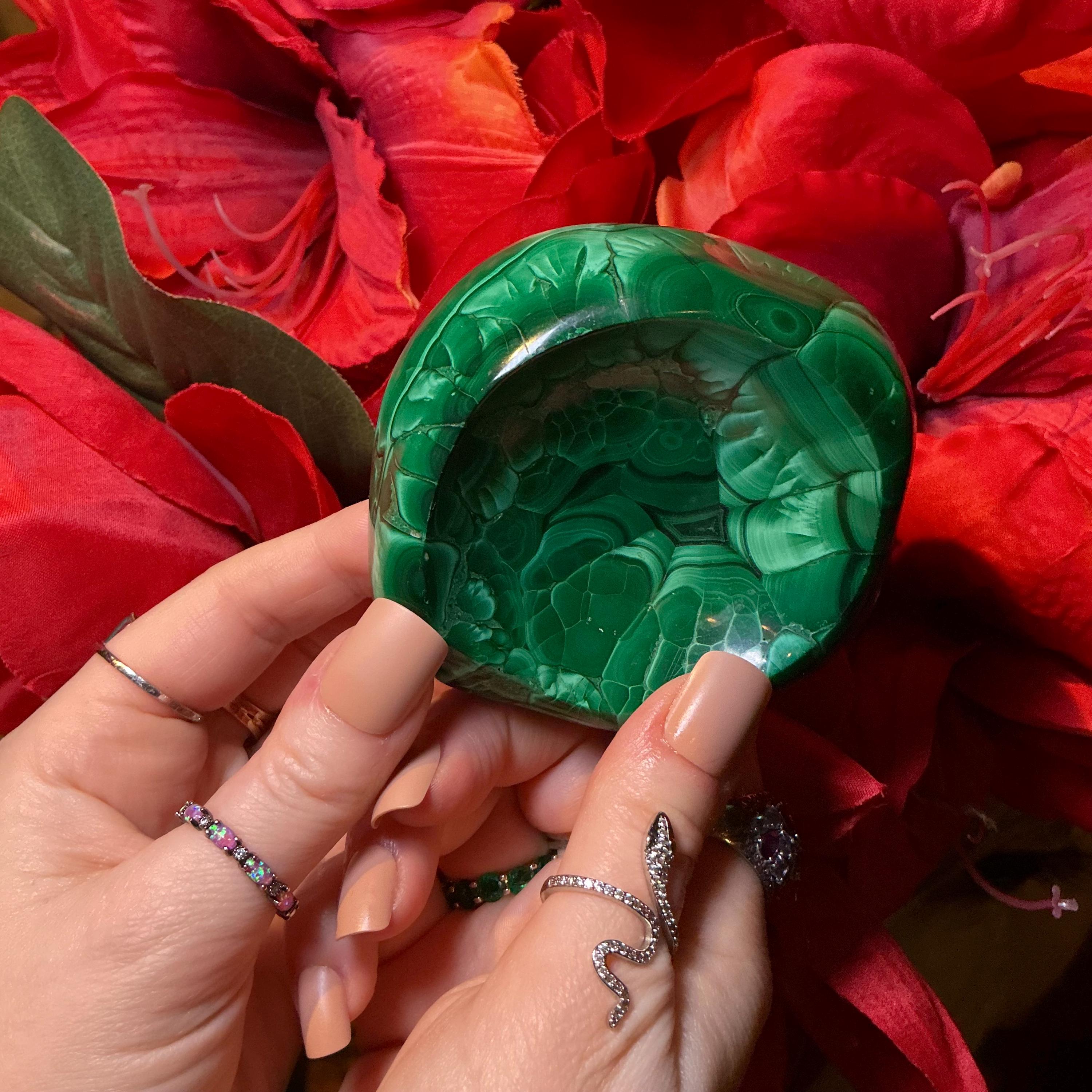 This gorgeous malachite display polished stone trinket jewelry dish/ bowl is perfection the vibrant deep green colors swirling into beautiful patterns, is unique only to this mineral making it truly a remarkable piece for your collection.