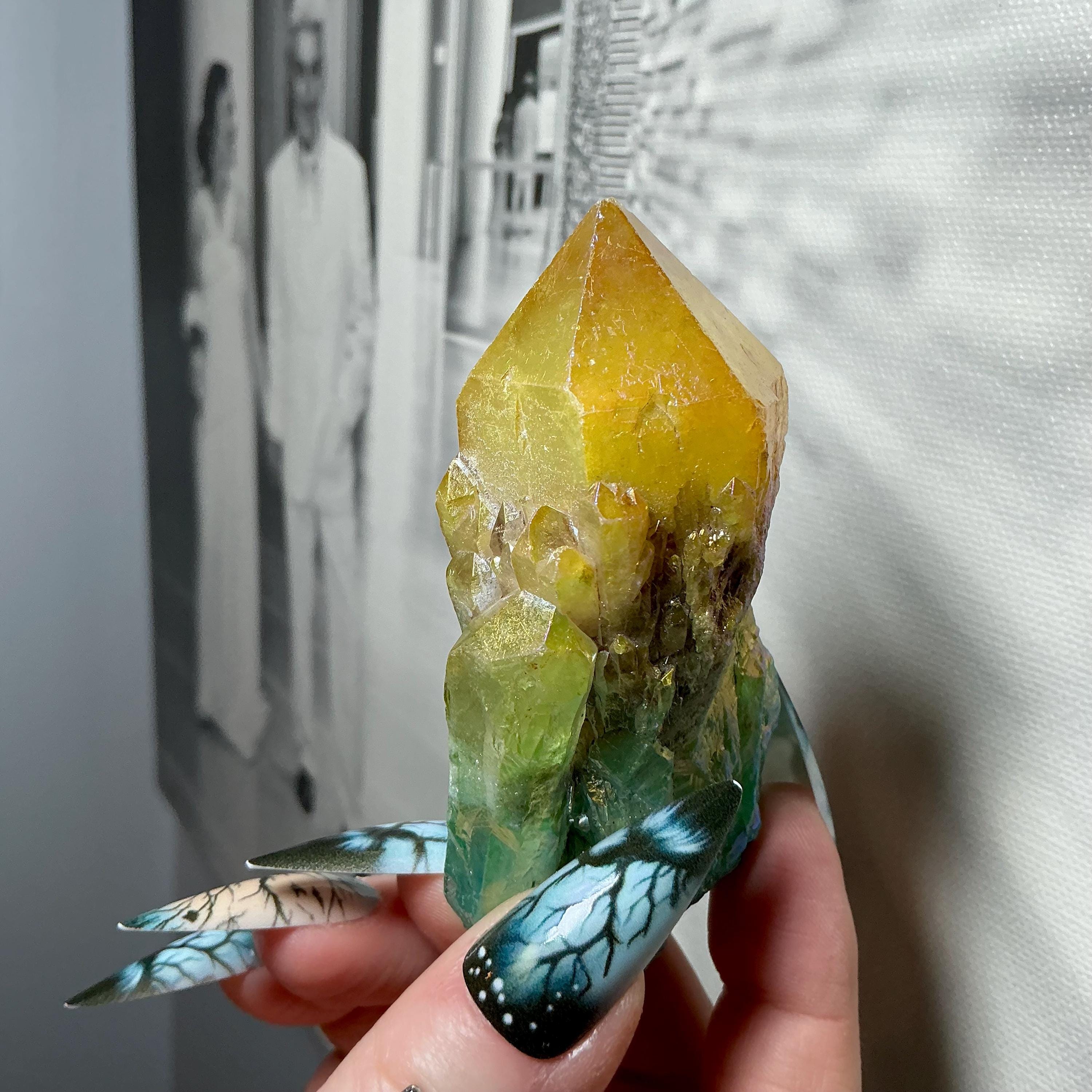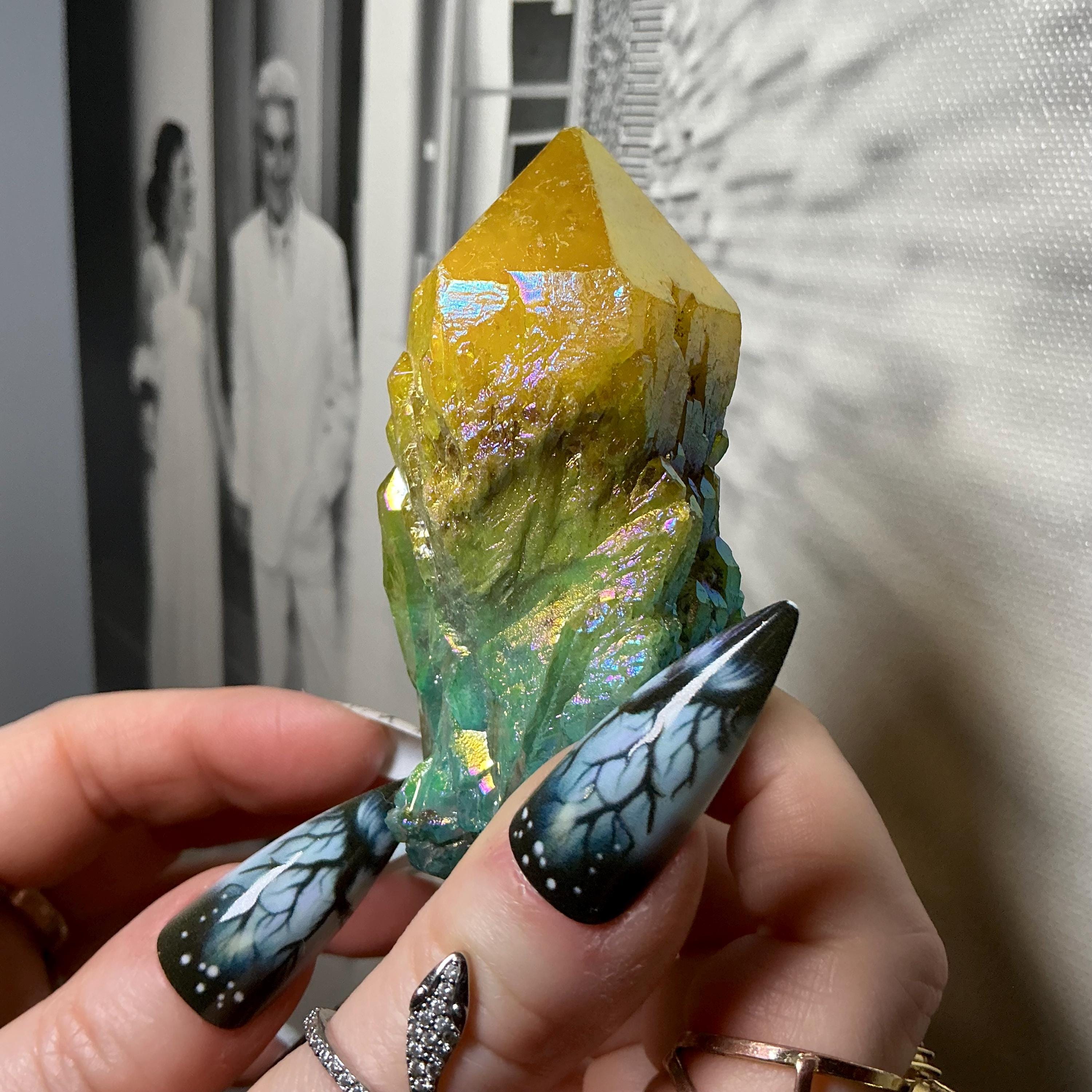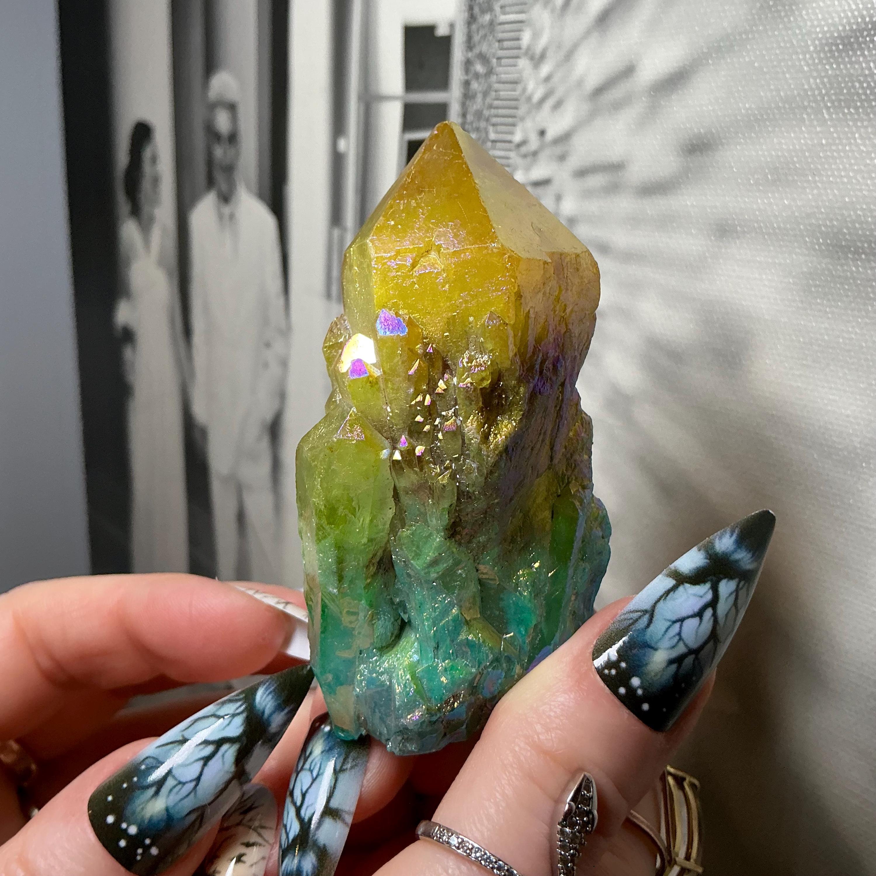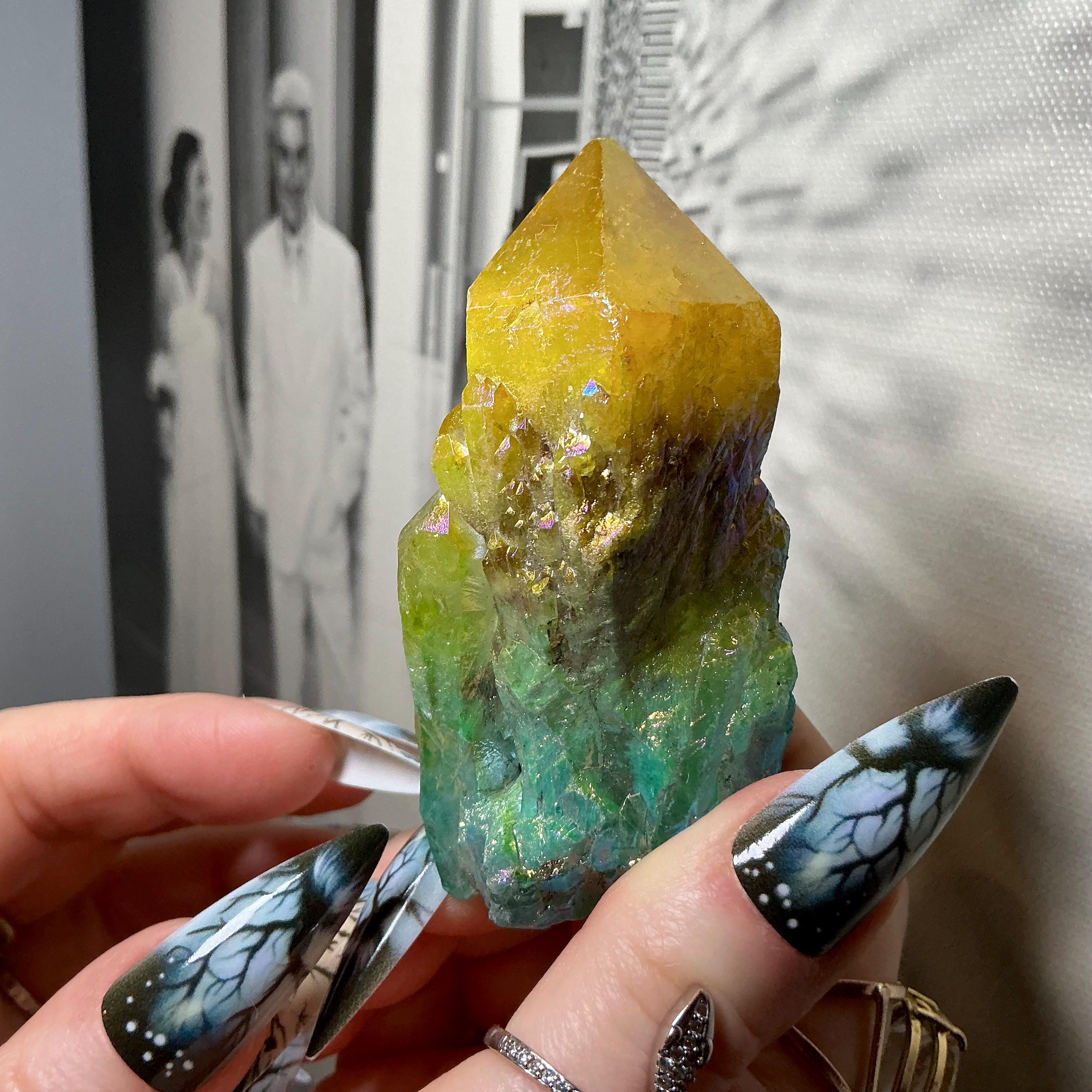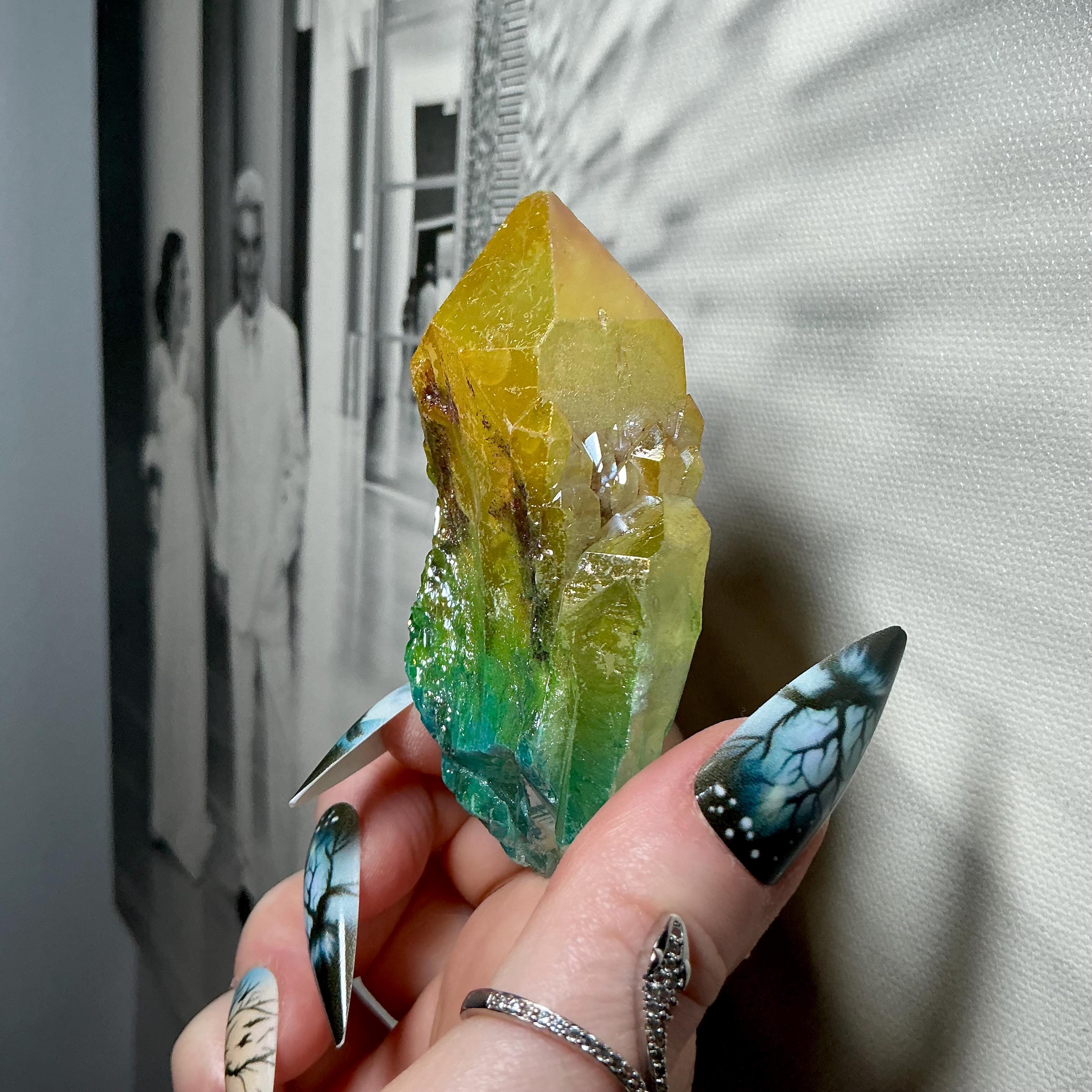 Yellow & Blue Aura Quartz Elestial Crystal ~ Large 3 1/2 oz. ~ 3" Long ~ Rainbow Iridescent Electric Points