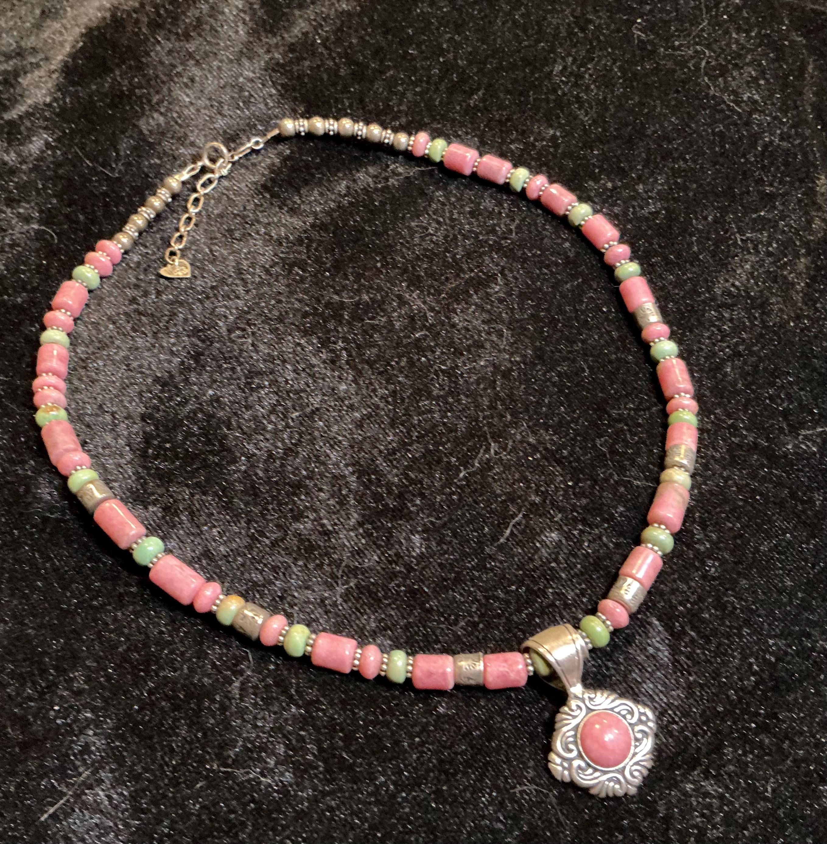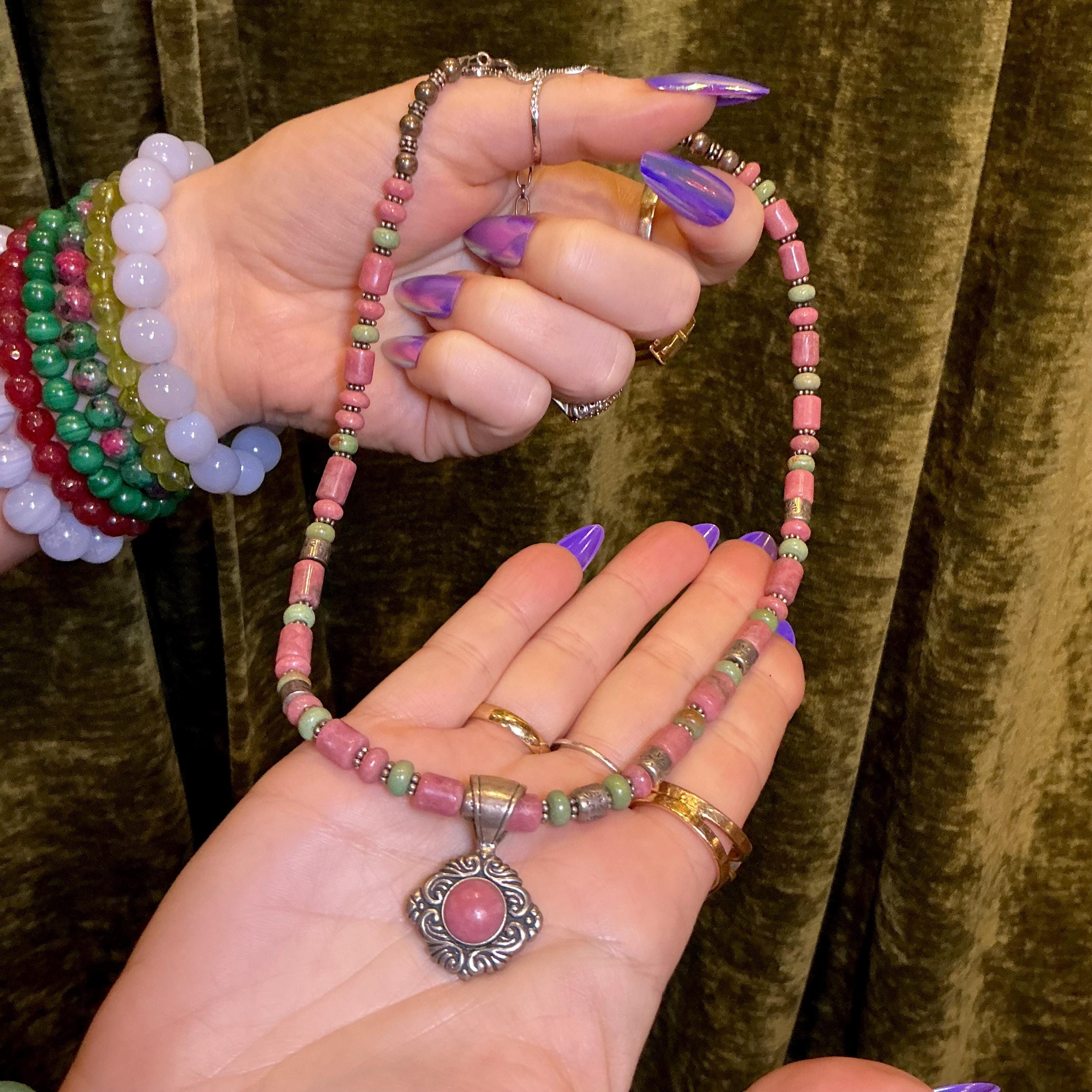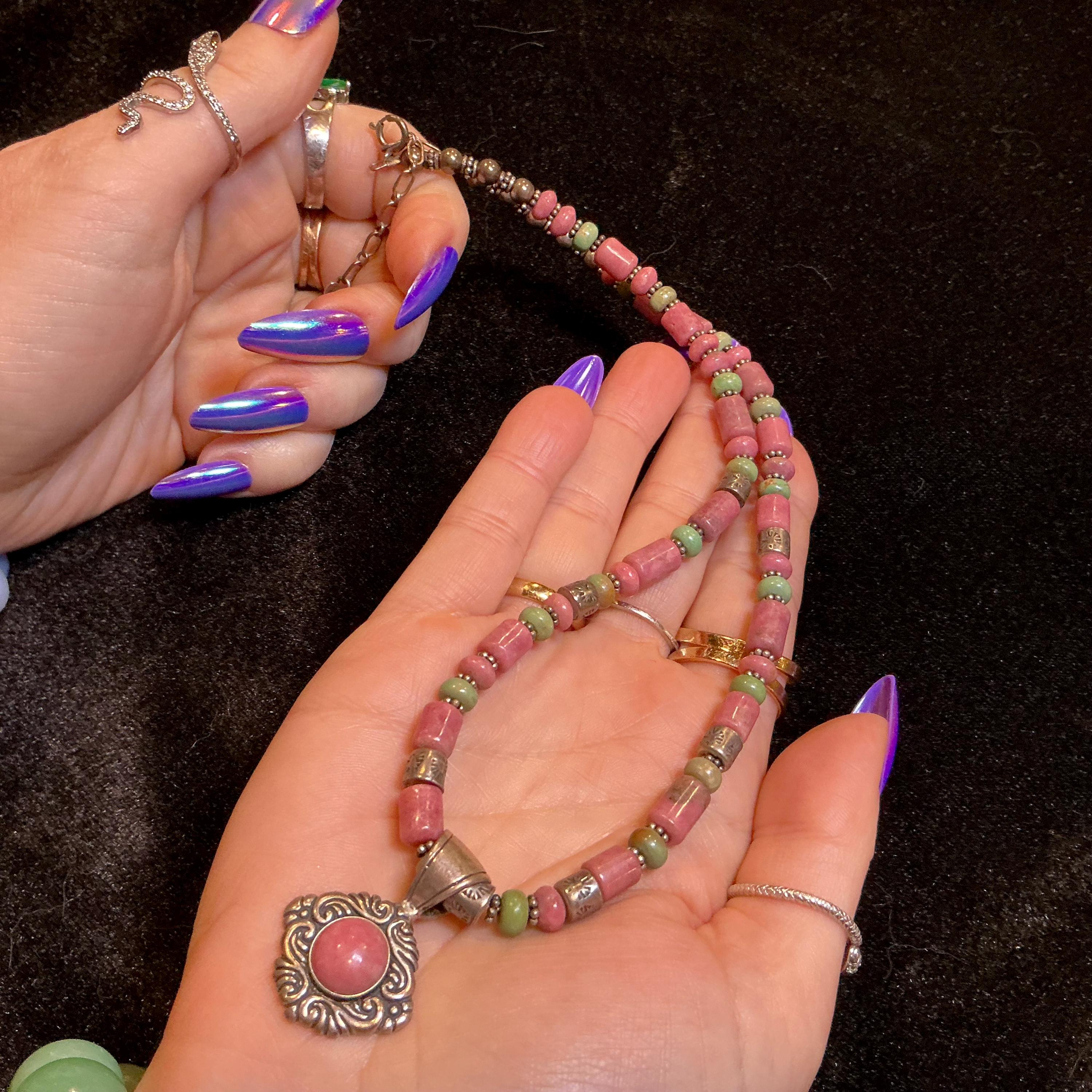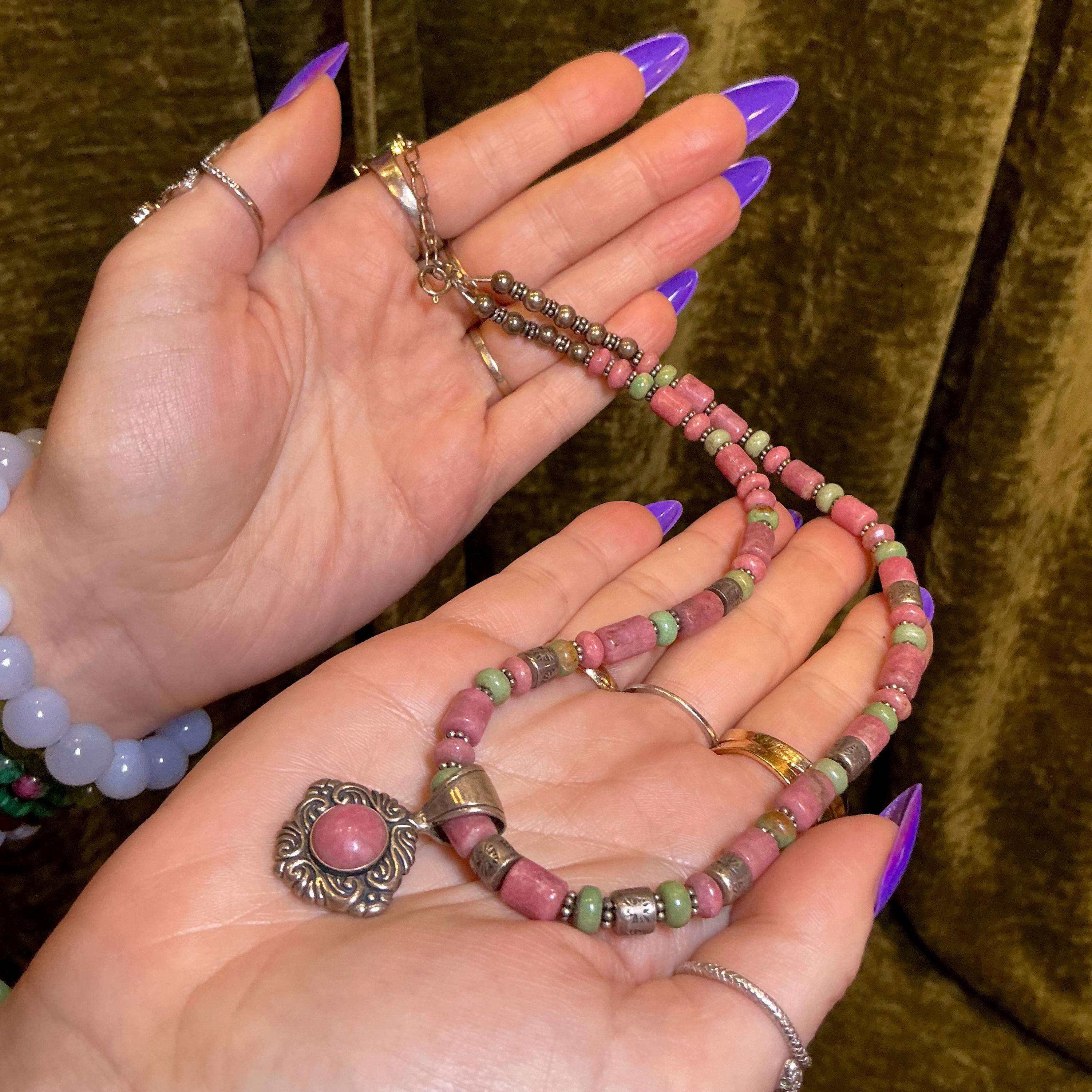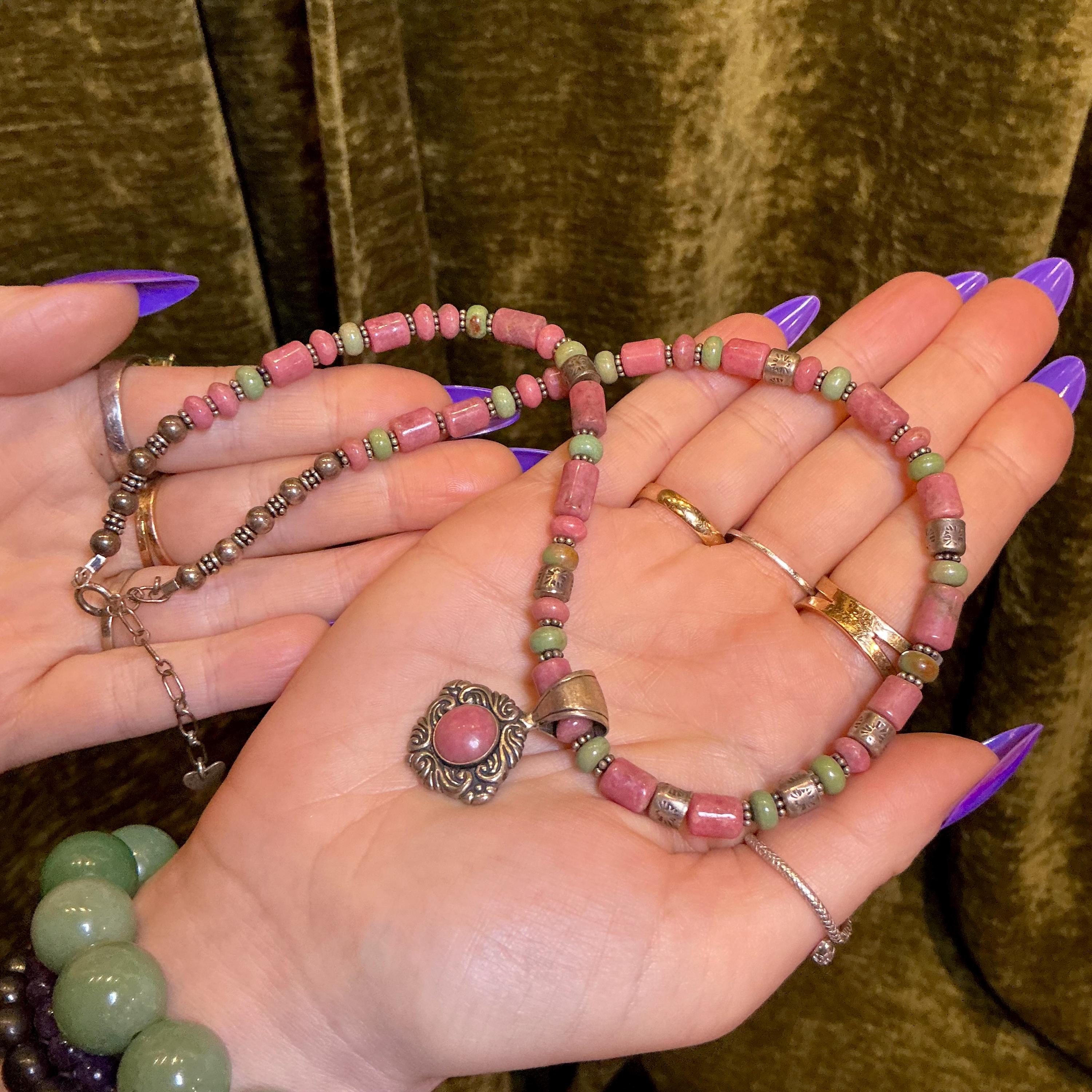 Vintage Rhodonite 18" Necklace ~ Silver & Gemstone Beads ~ Sacred Pendant Adornment