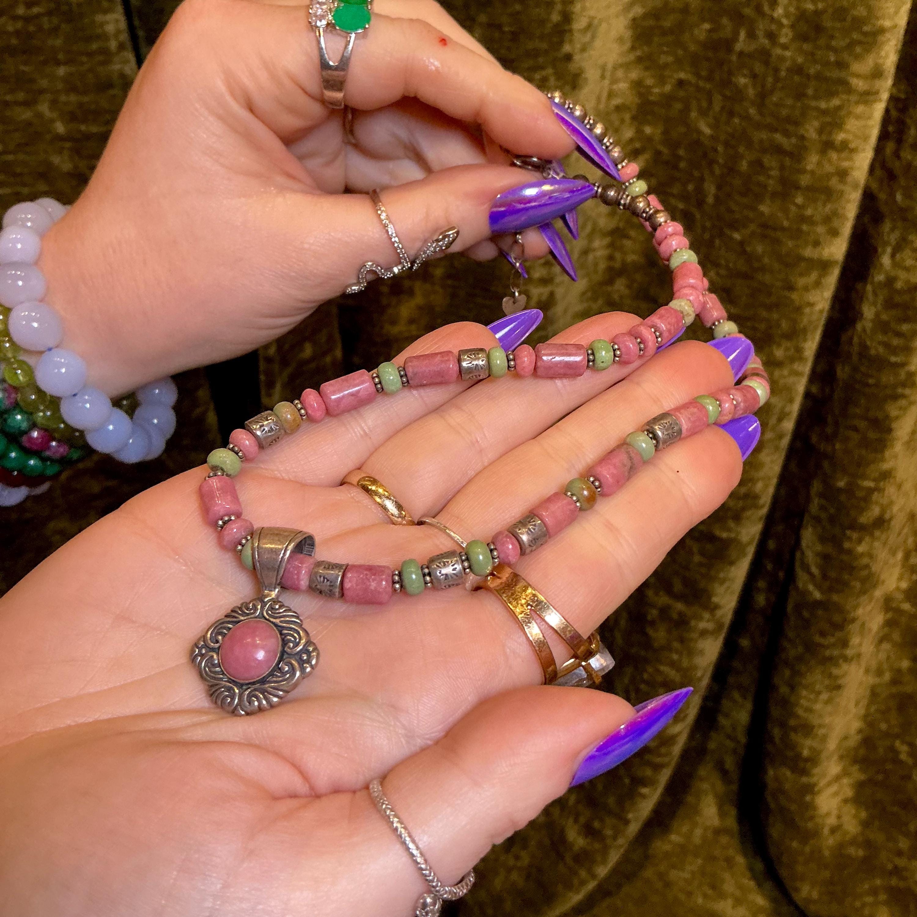 Vintage Rhodonite Necklace ~ Genuine Silver & Gemstone Beads~ Crystal Goddess Sacred Adornment ~ 15 inches.