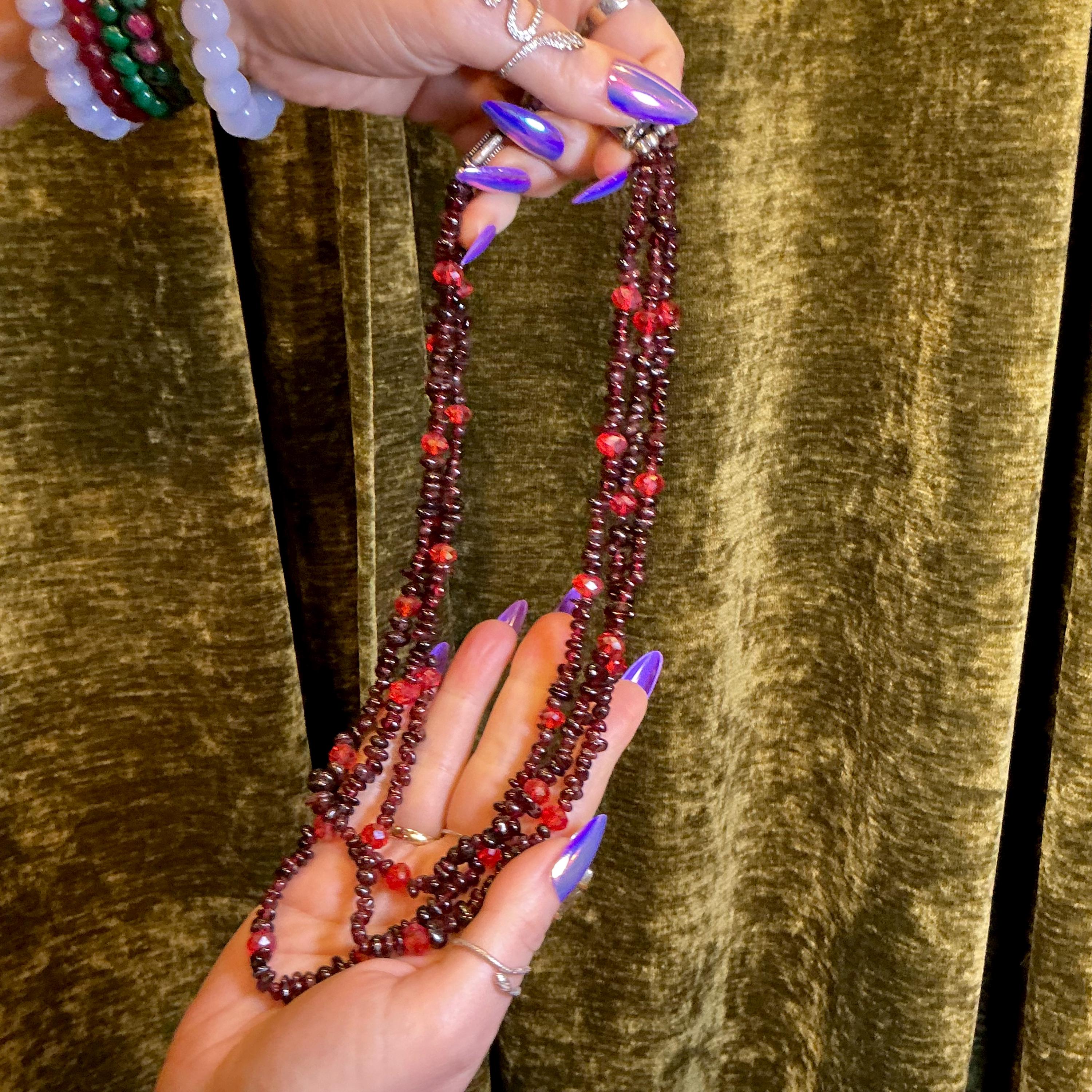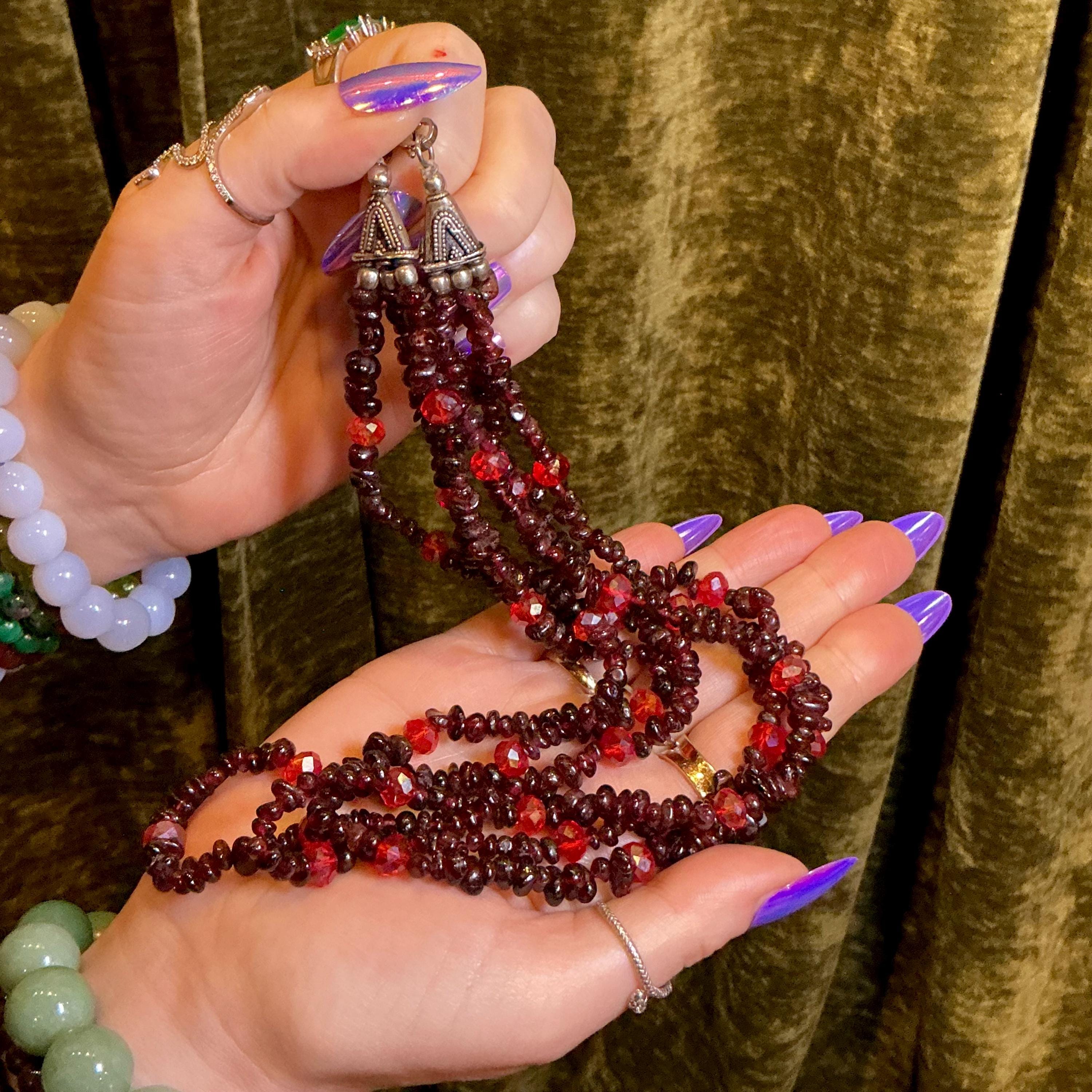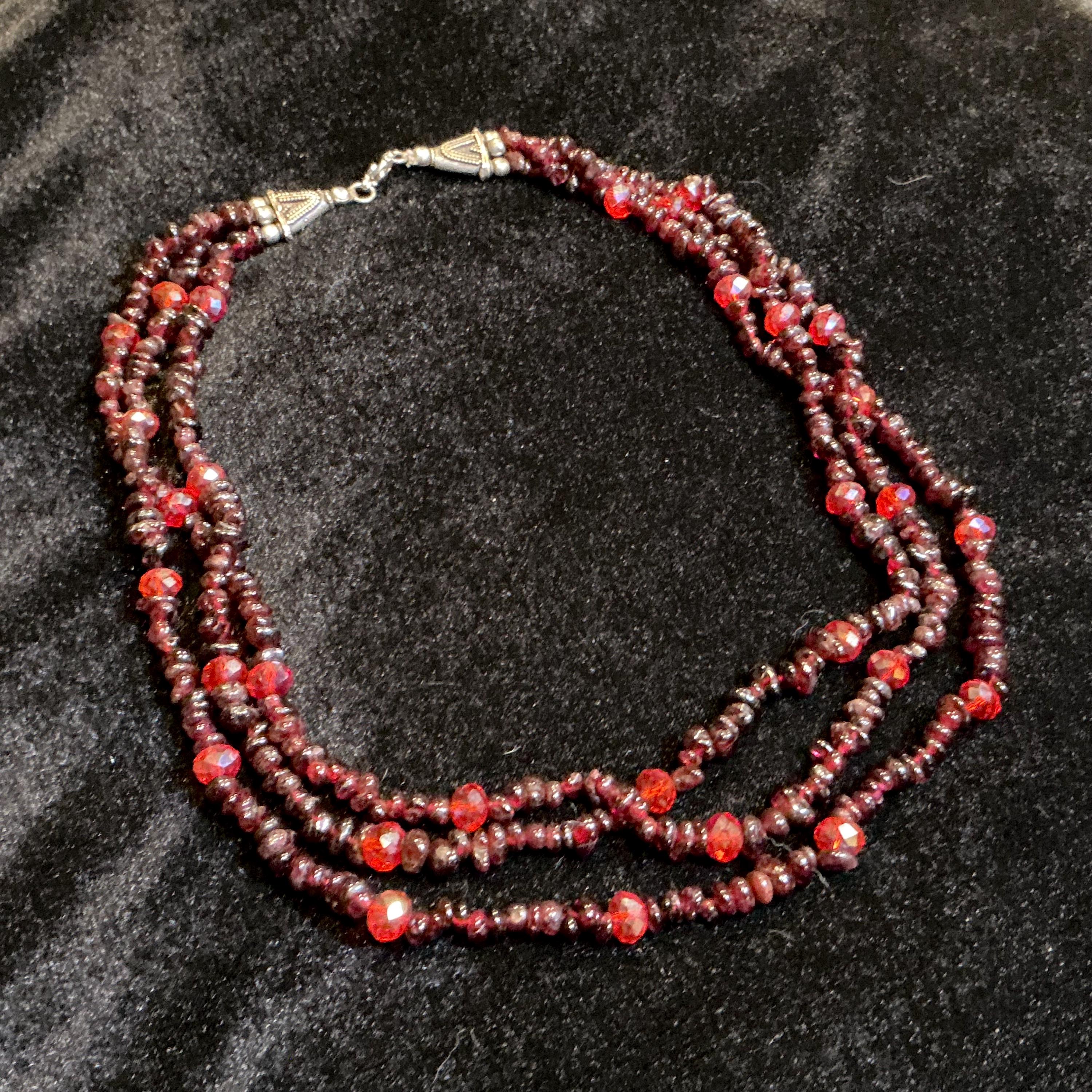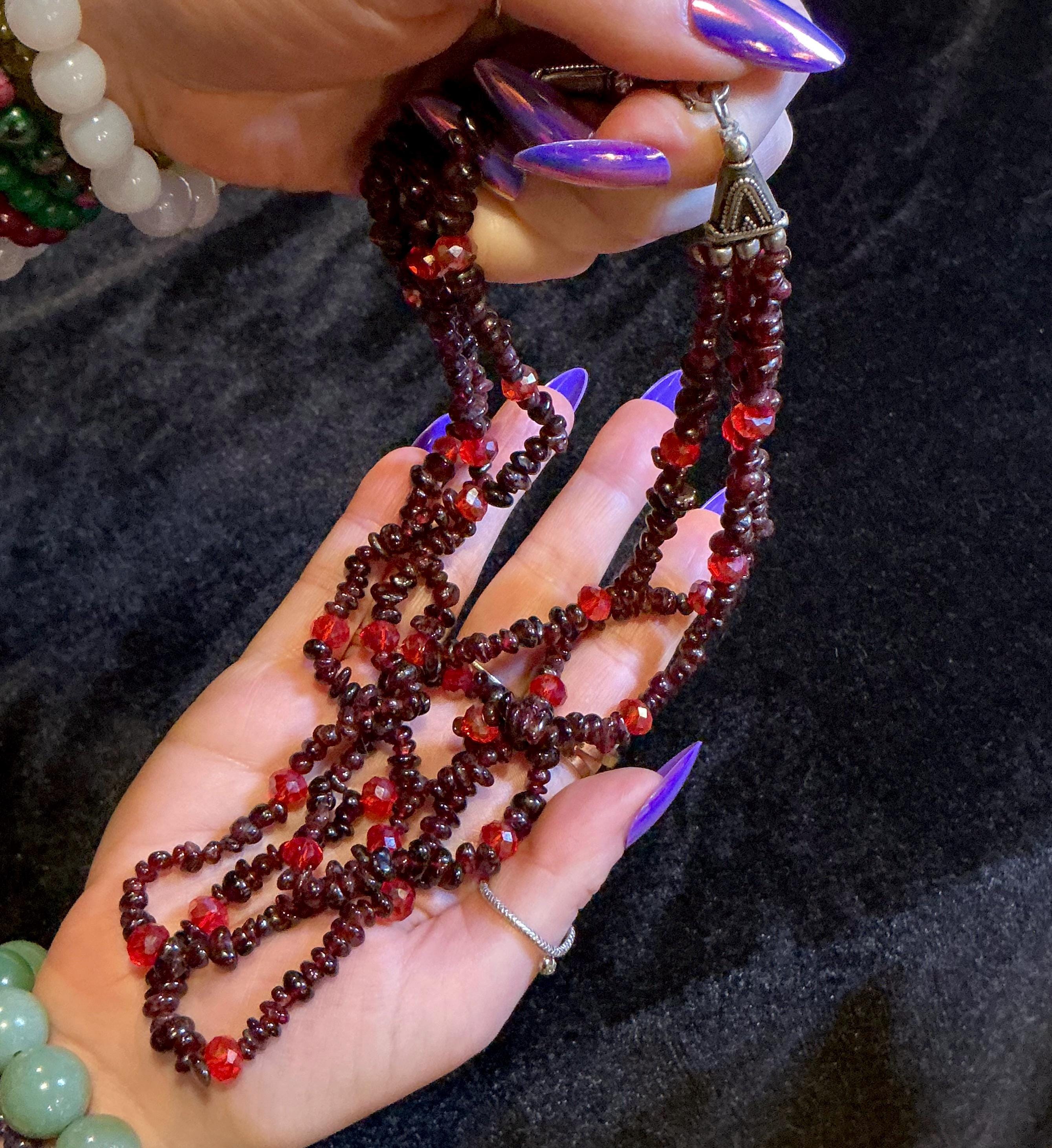 Vintage Garnet Necklace ~ Triple Stranded Gemstone Beads ~ Crystal Goddess Sacred Adornment ~ 20 inches.