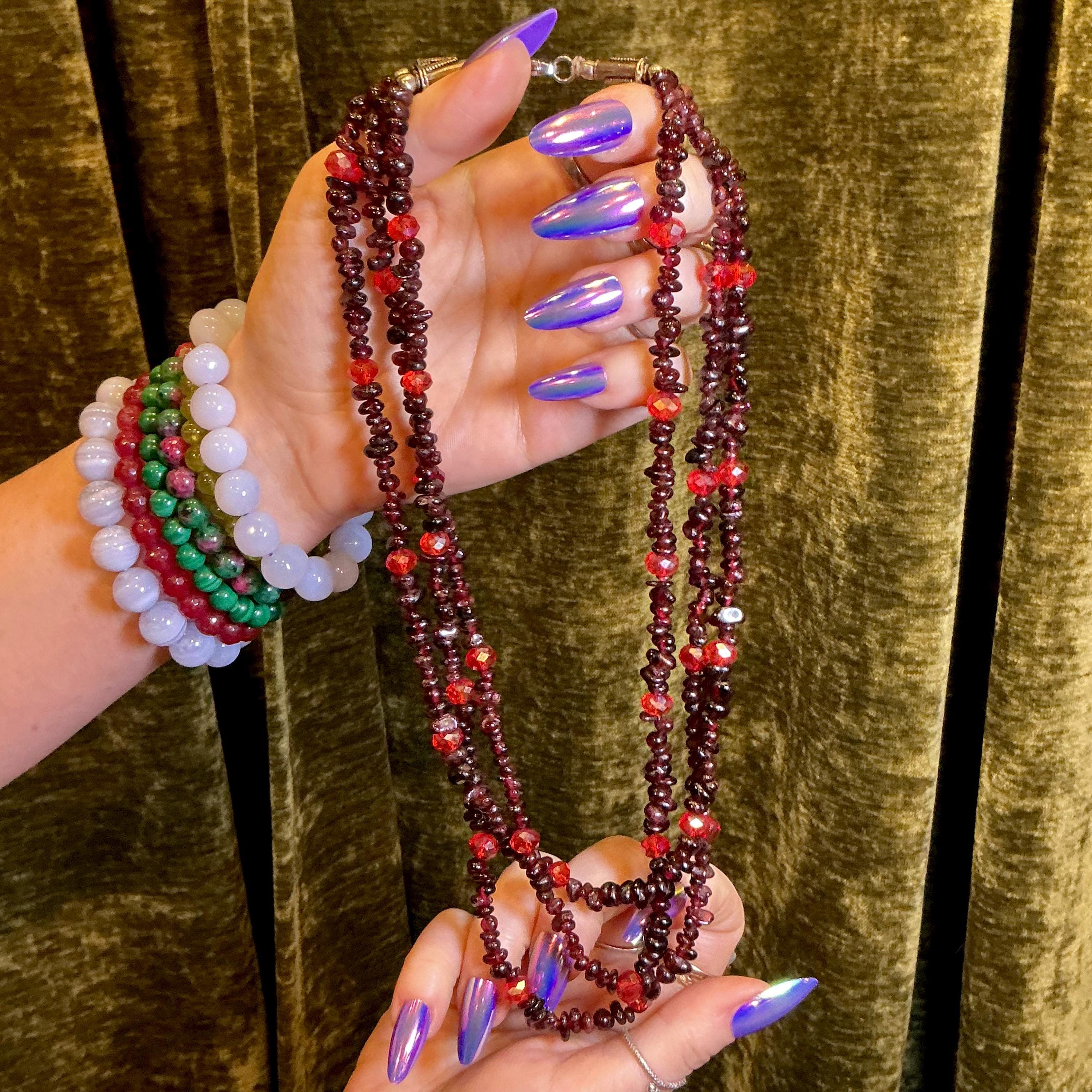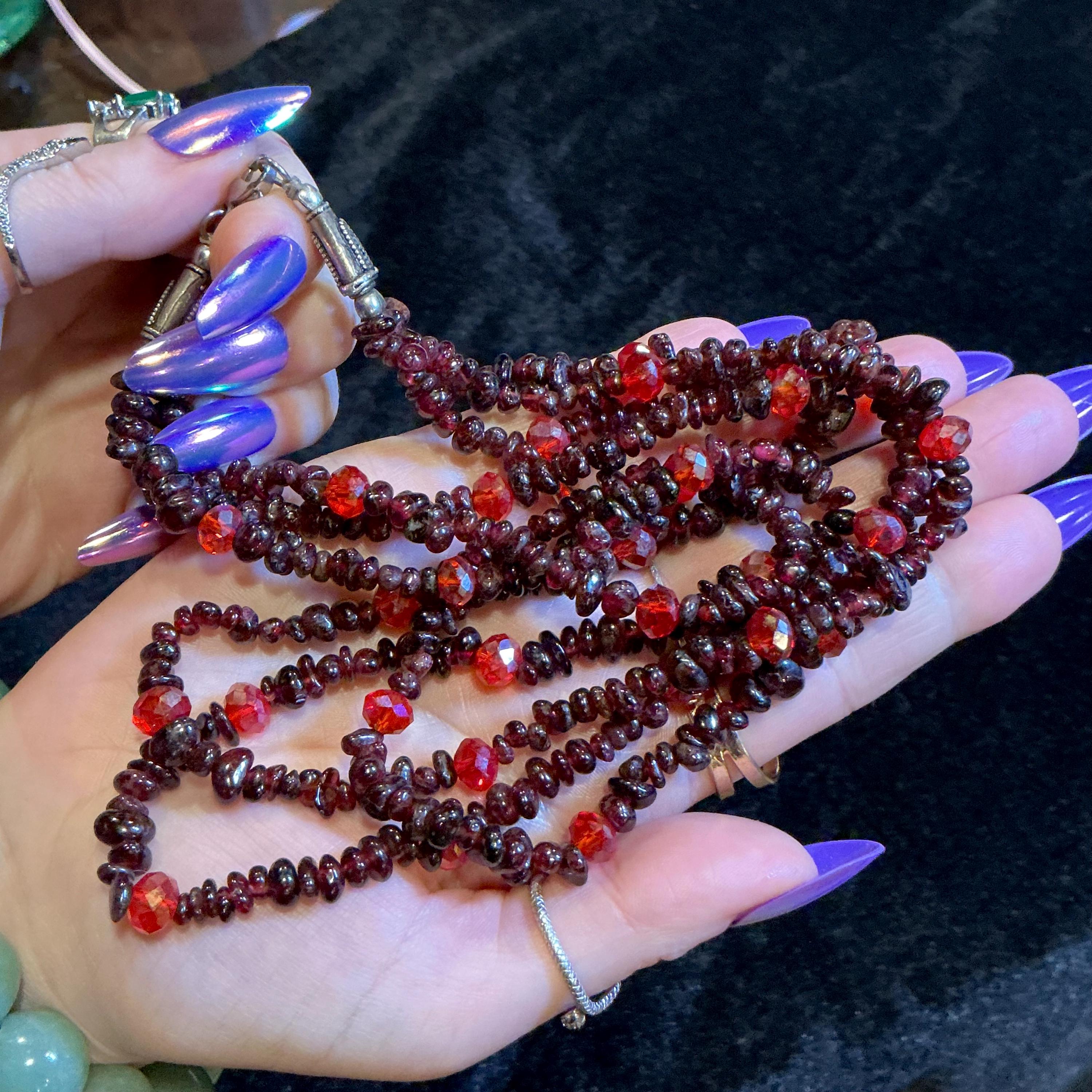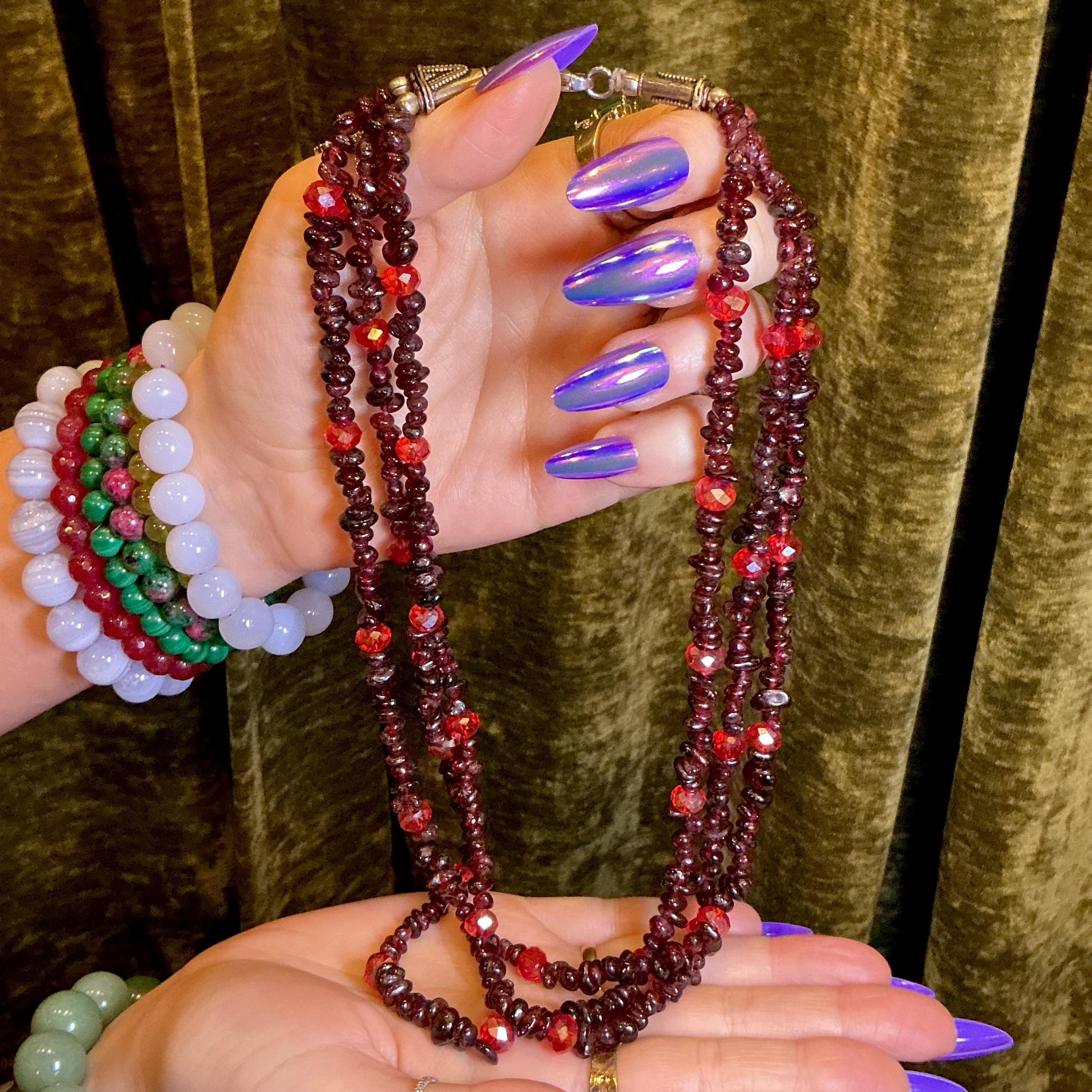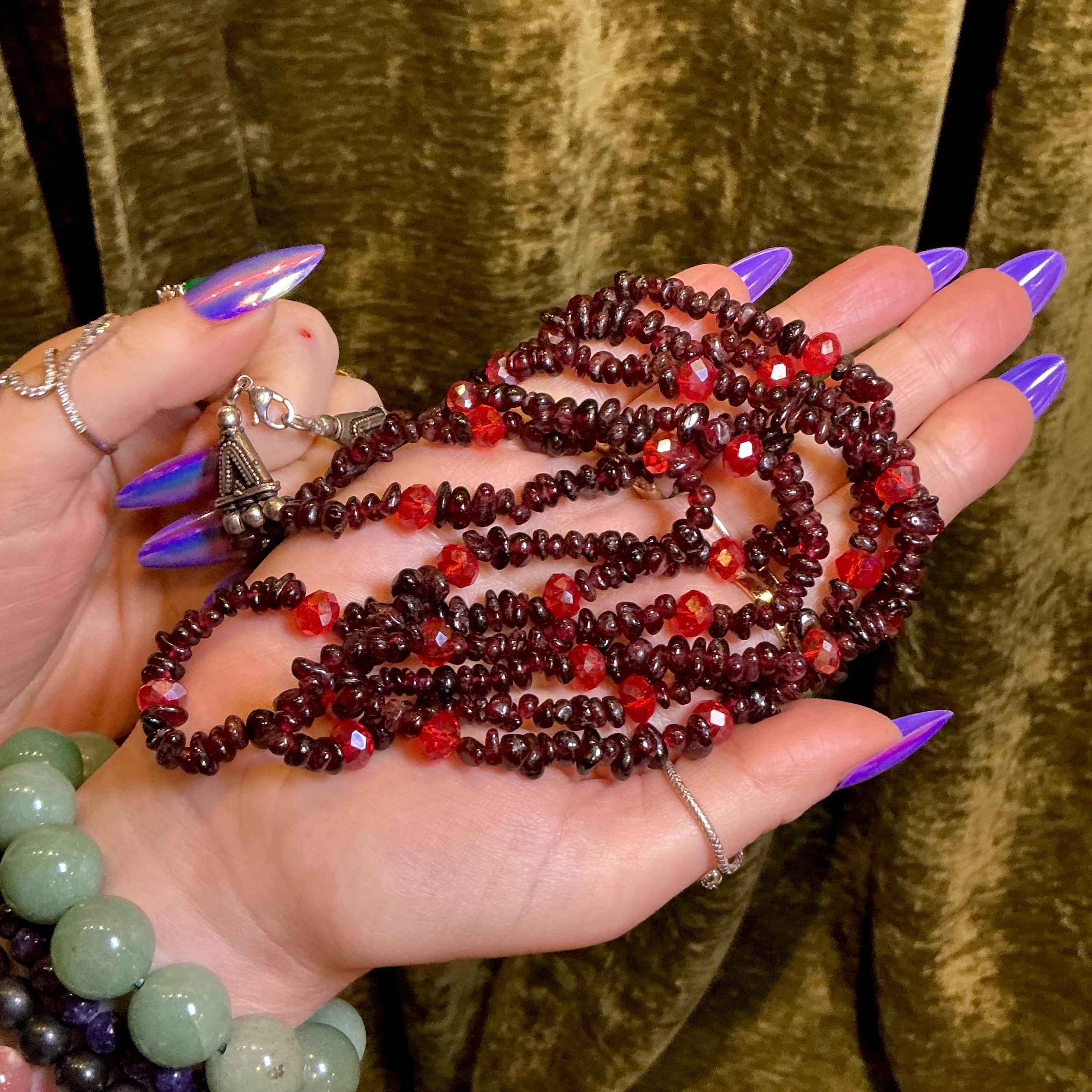 Vintage Garnet Necklace ~ Triple Stranded Gemstone Beads ~ Crystal Goddess Sacred Adornment ~ 20 inches.