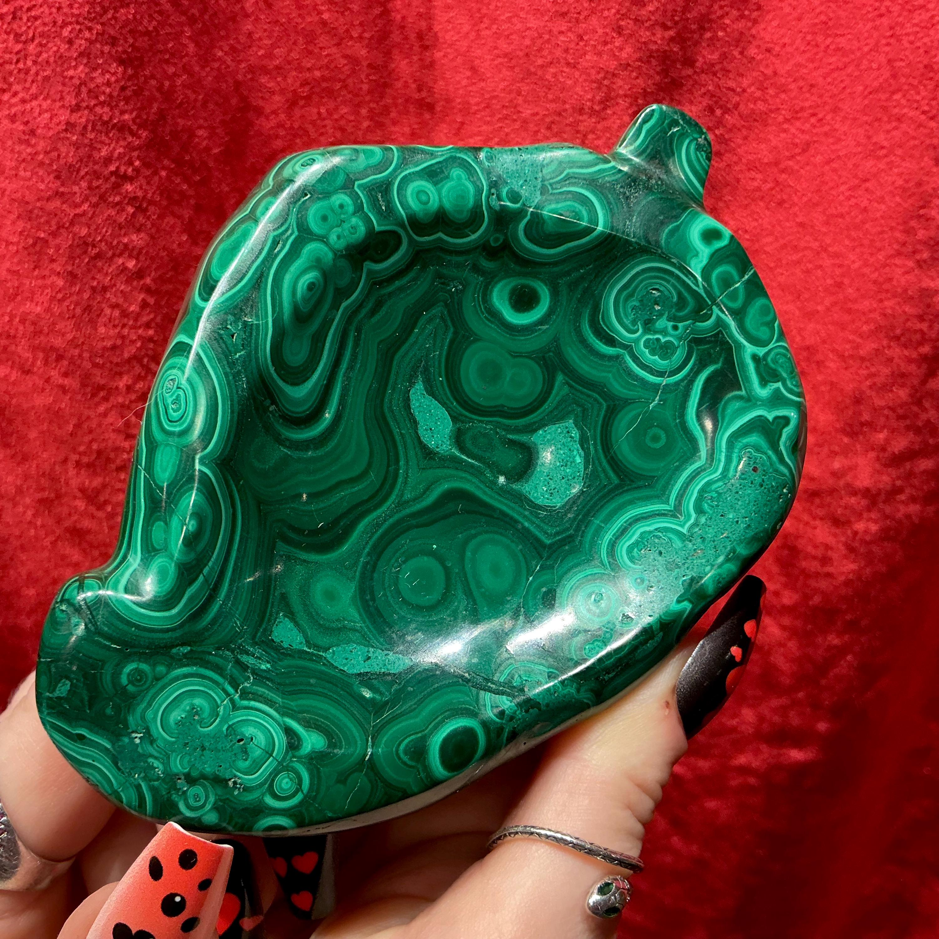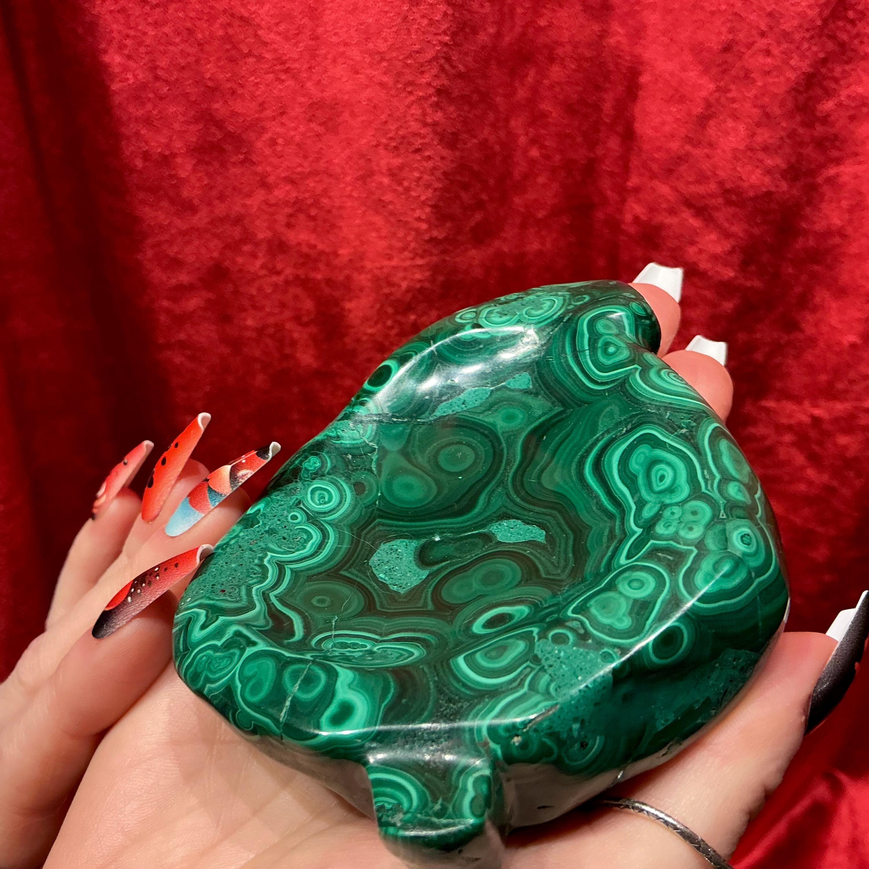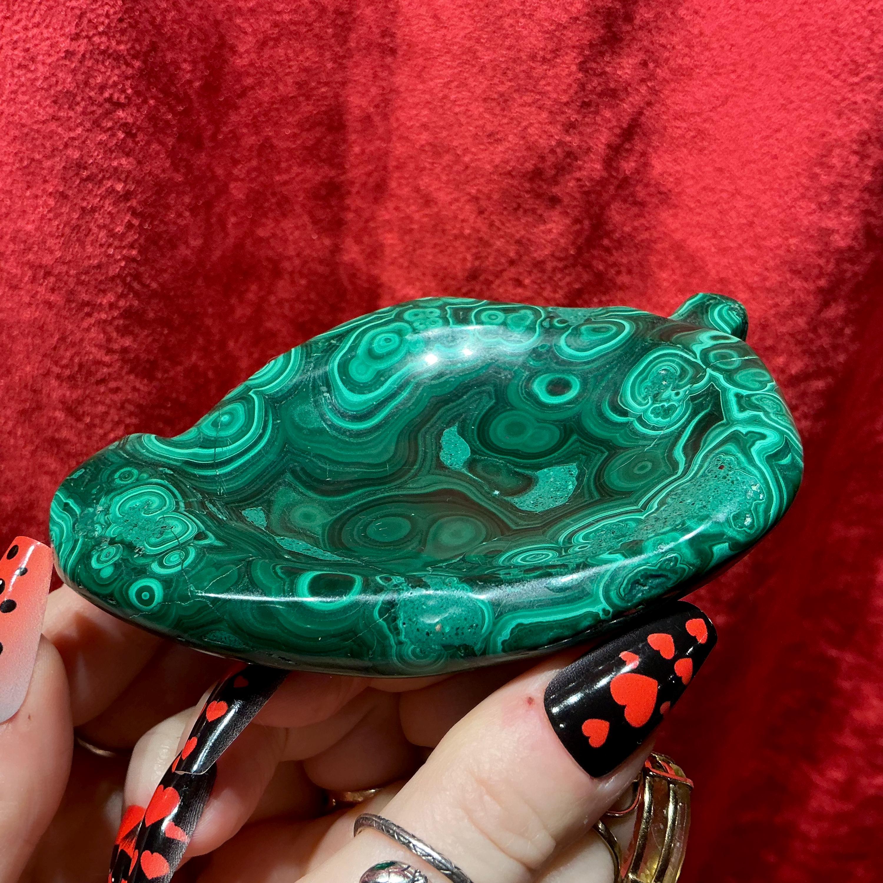 This gorgeous malachite display polished stone trinket jewelry dish/ bowl is perfection the vibrant deep green colors swirling into beautiful patterns, is unique only to this mineral making it truly a remarkable piece for your collection.