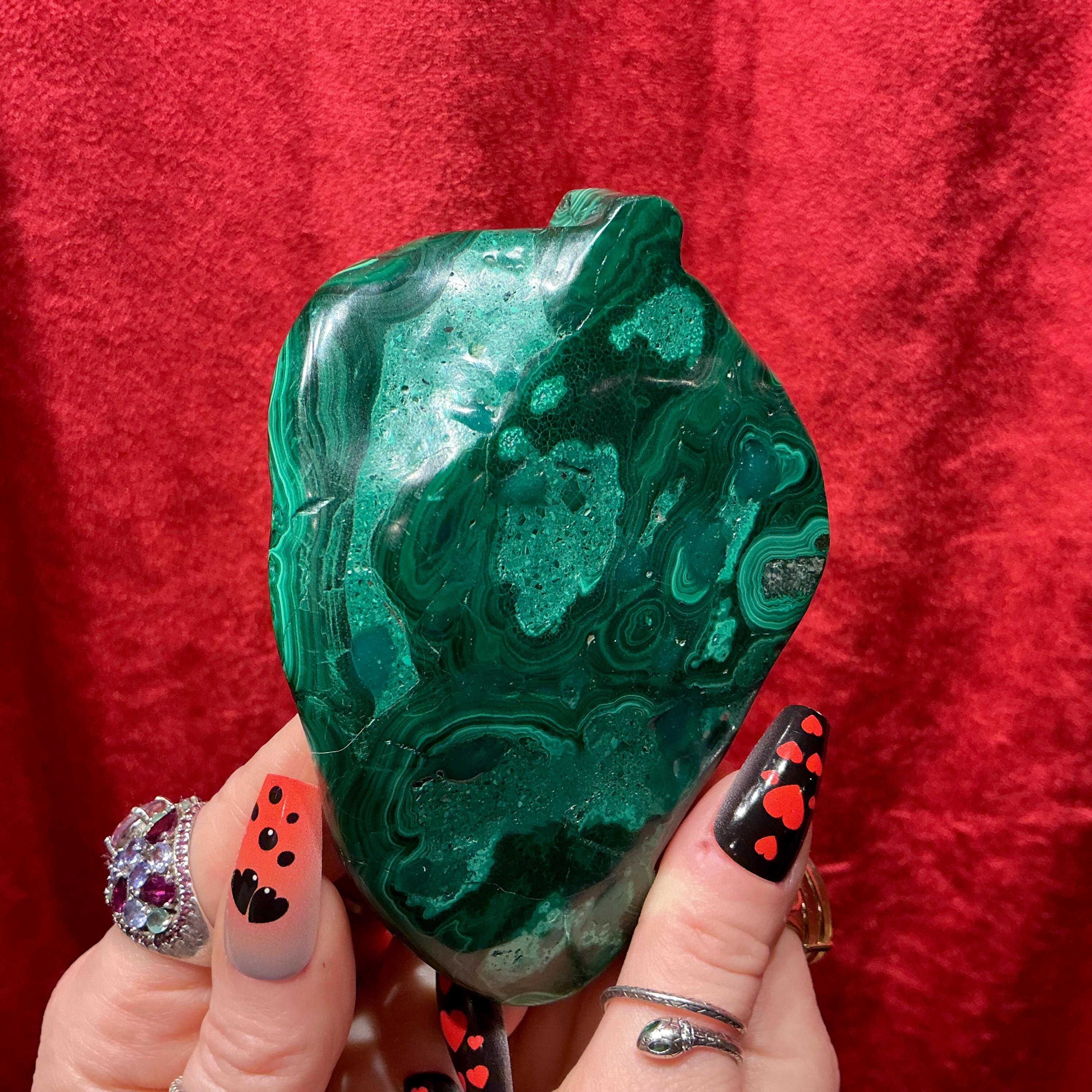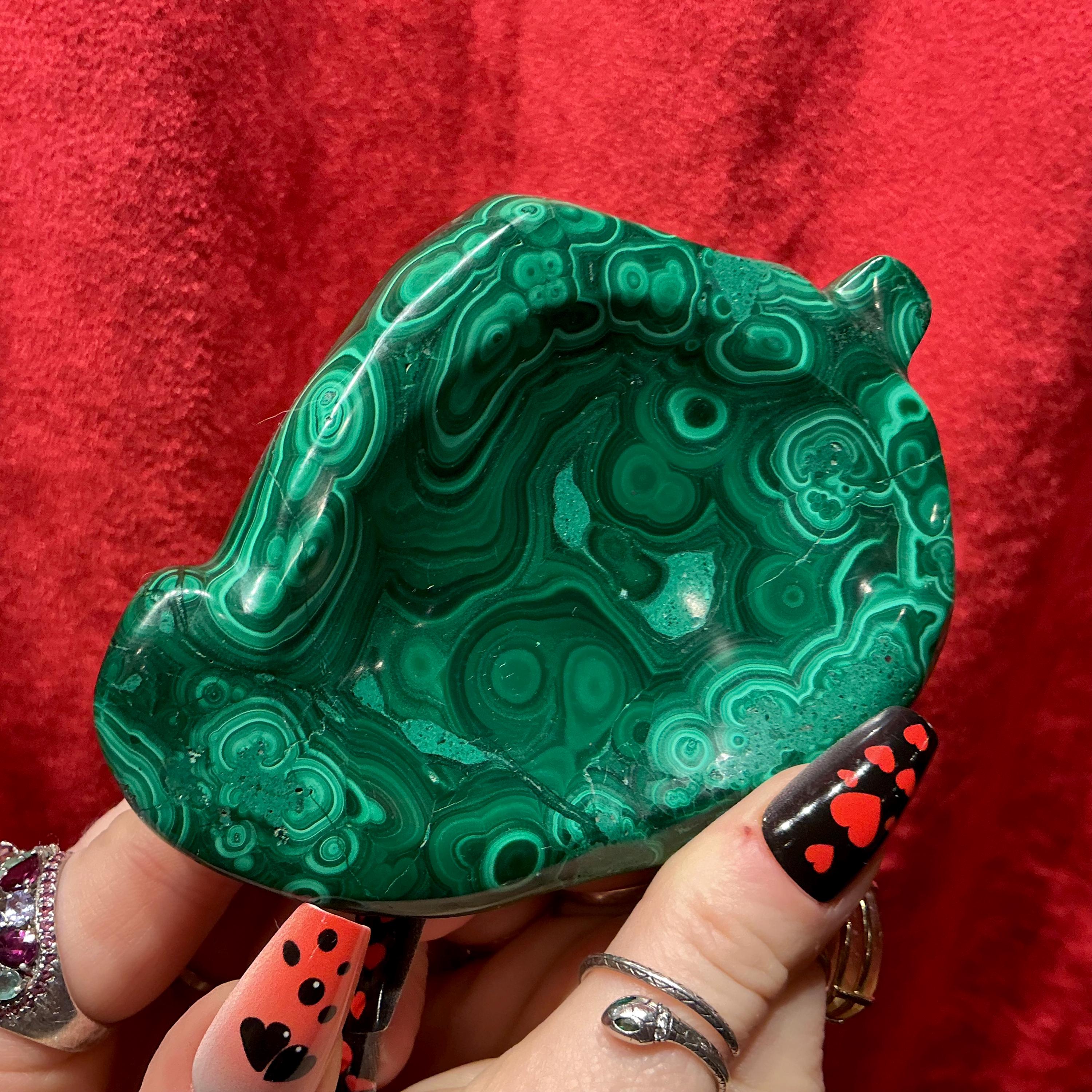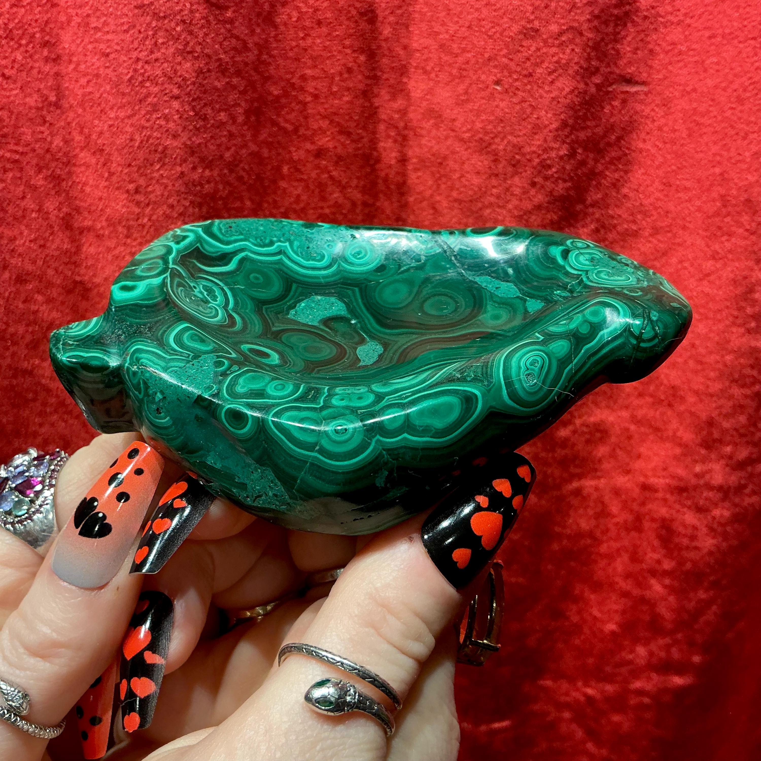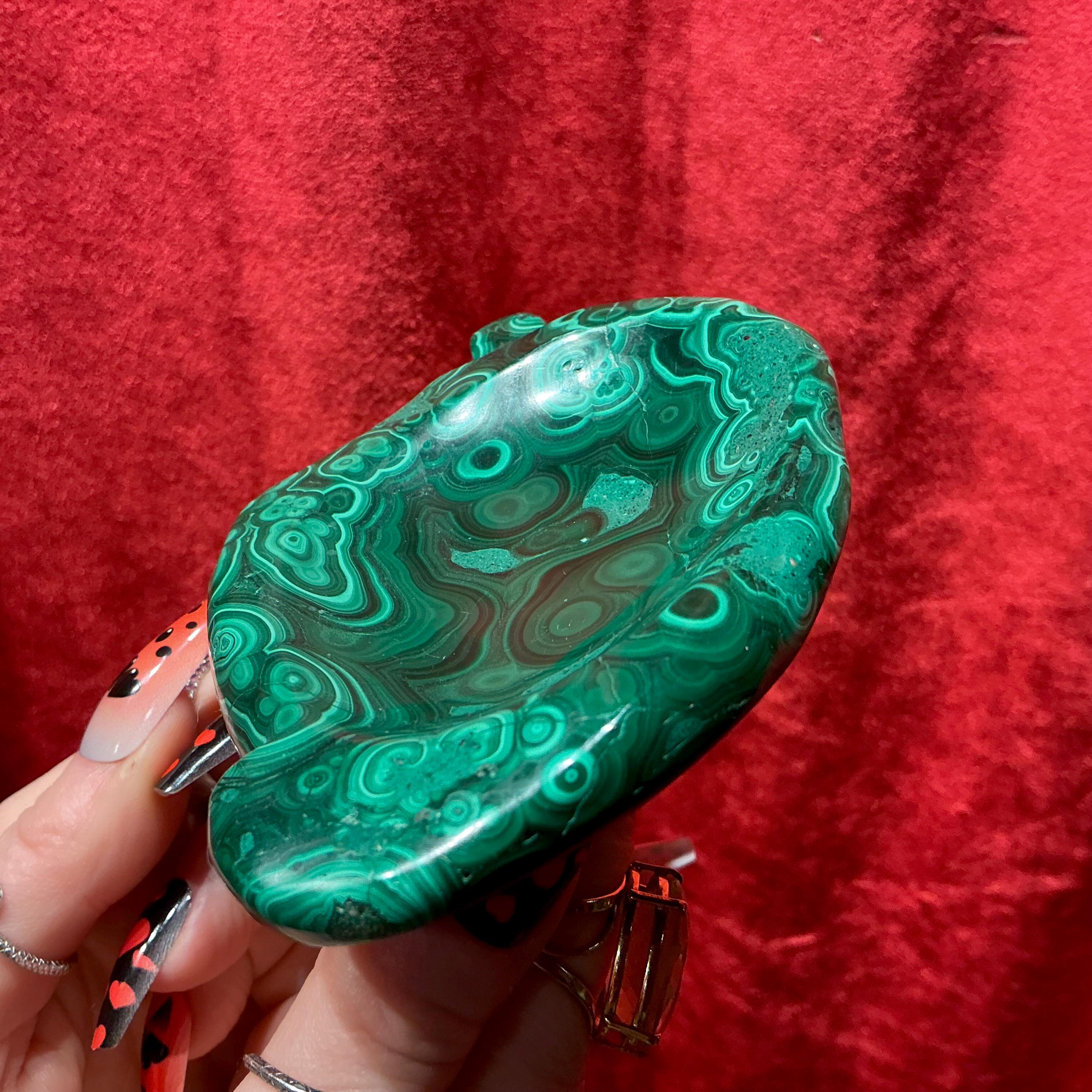 This gorgeous malachite display polished stone trinket jewelry dish/ bowl is perfection the vibrant deep green colors swirling into beautiful patterns, is unique only to this mineral making it truly a remarkable piece for your collection.